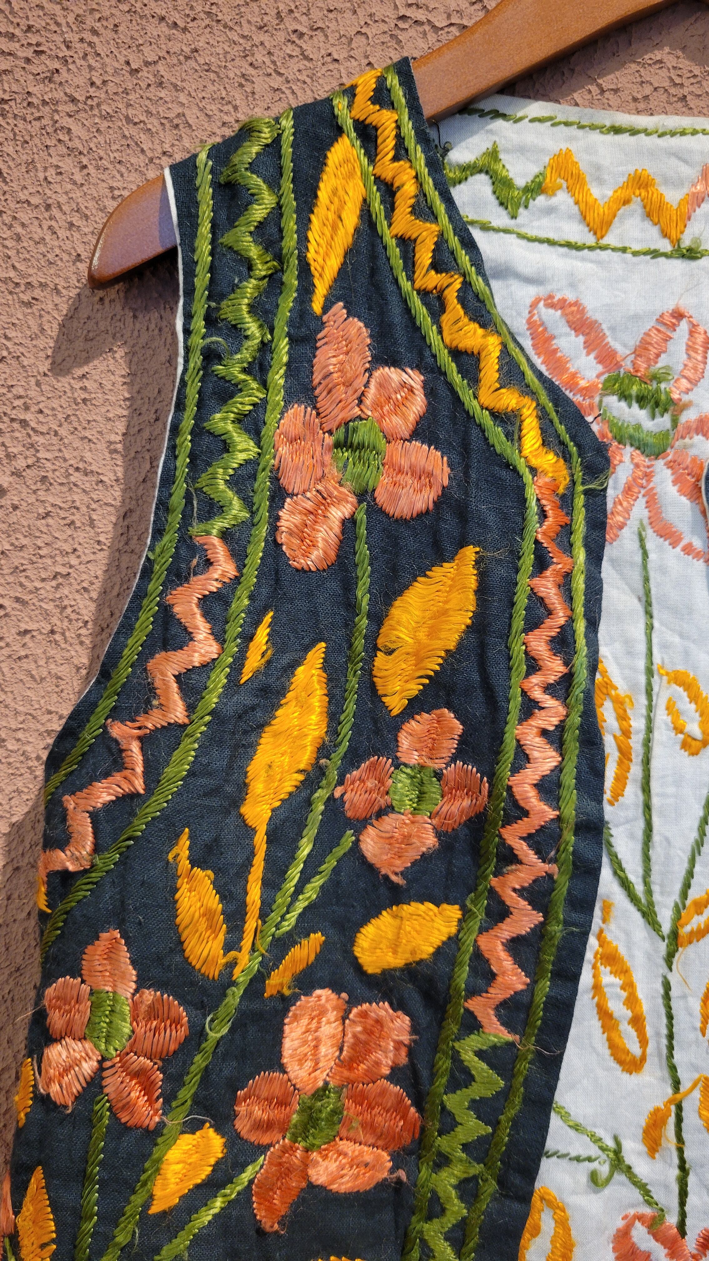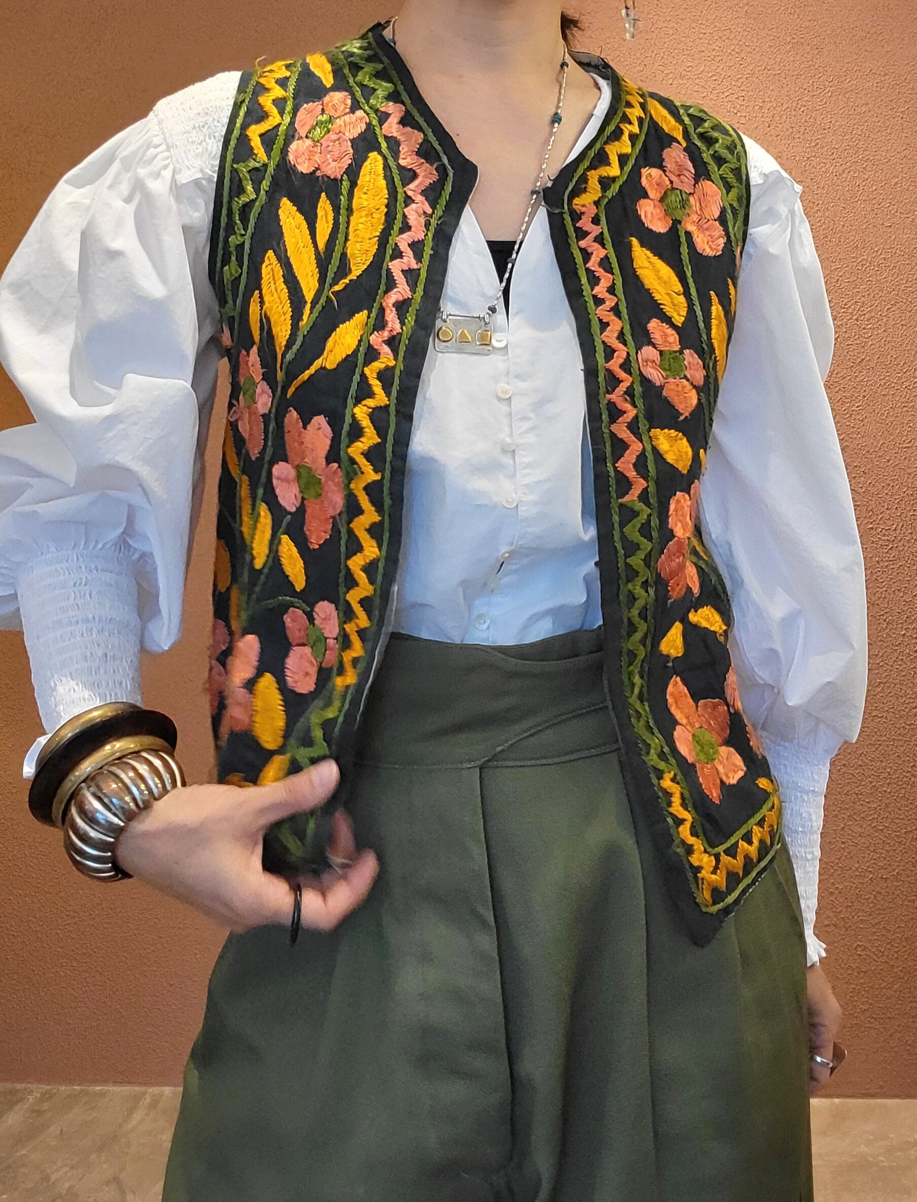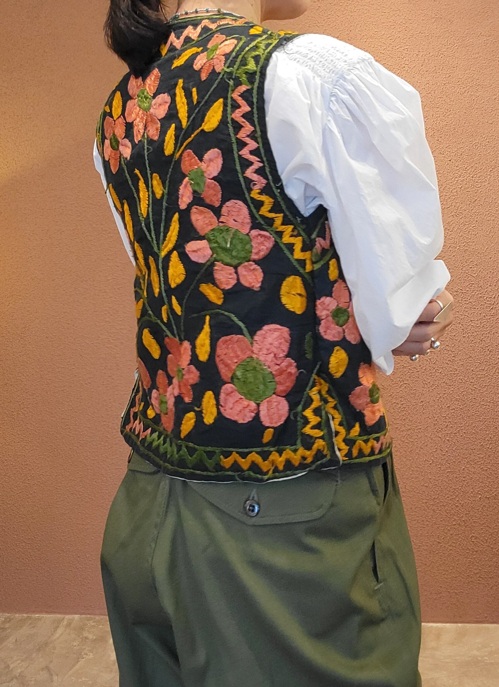 インドの古い刺繍のヴィンテージベスト。素材表記はありませんがコットンのようです。ヴィンテージならではの刺繍の立体感と深みのある味わいを存分にお楽しみいただける1着です。特筆するダメージはありませんが、古いお品のため経年による風合いを味わいとしてお楽しみいただける方へおすすめいたします。