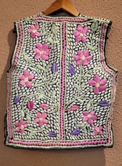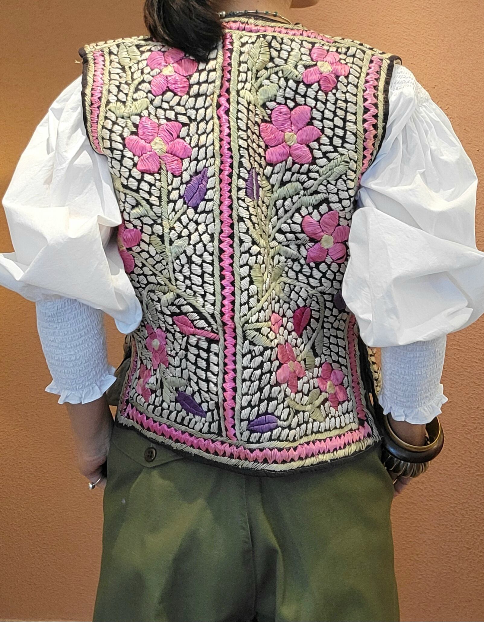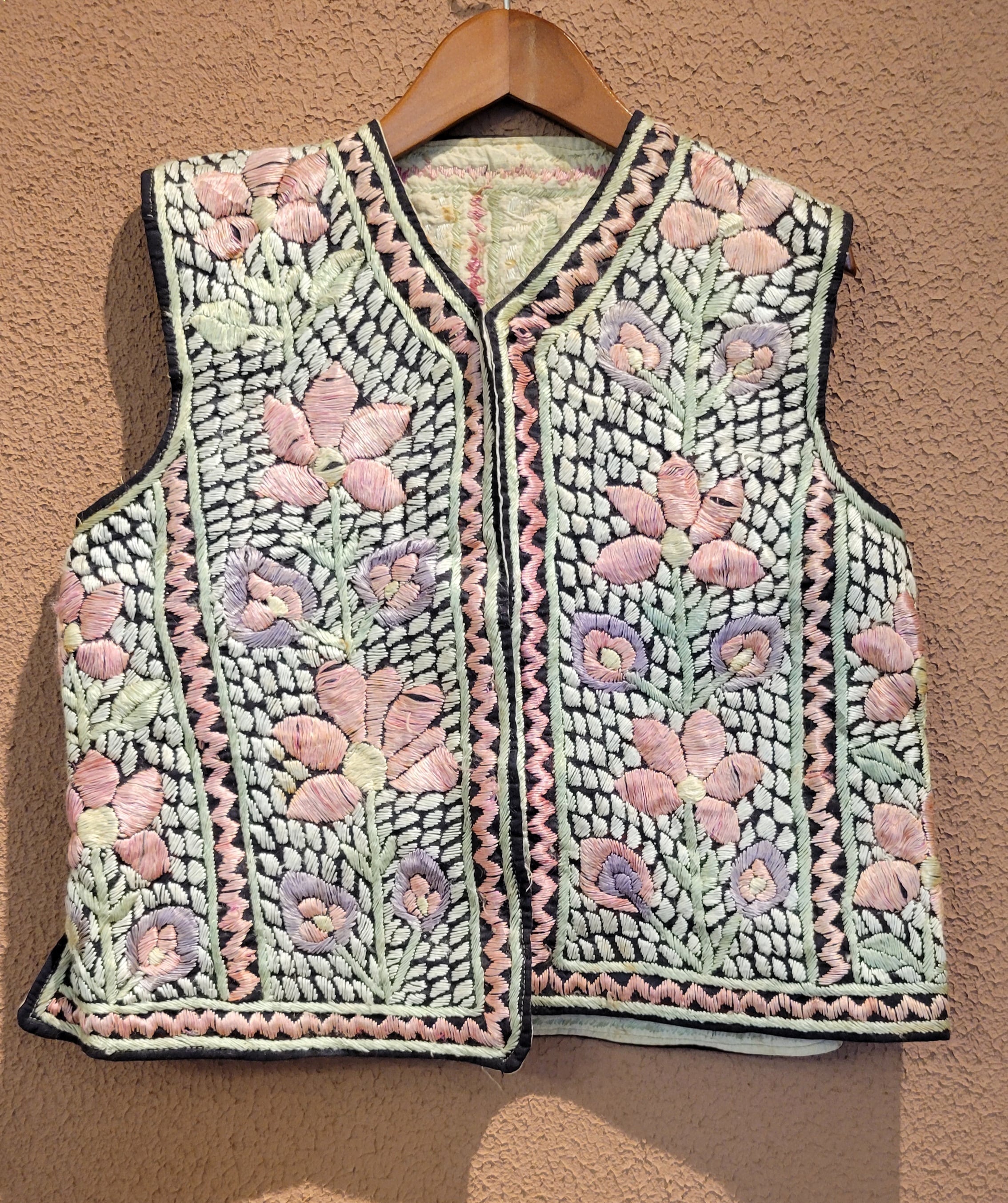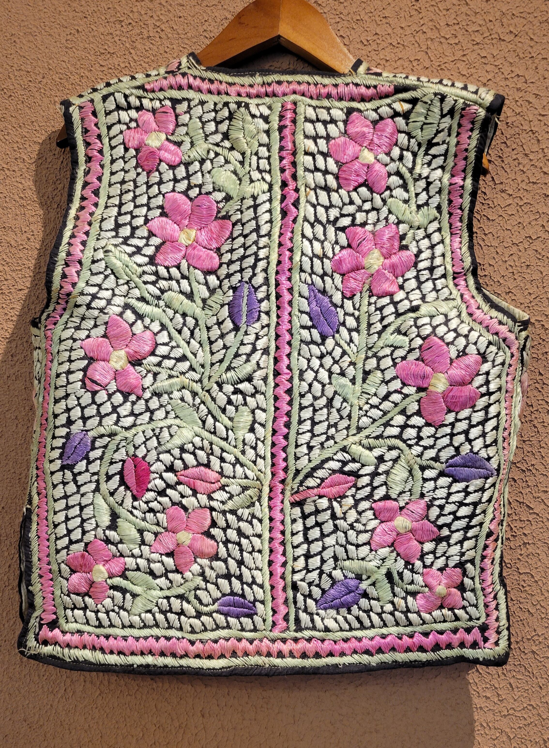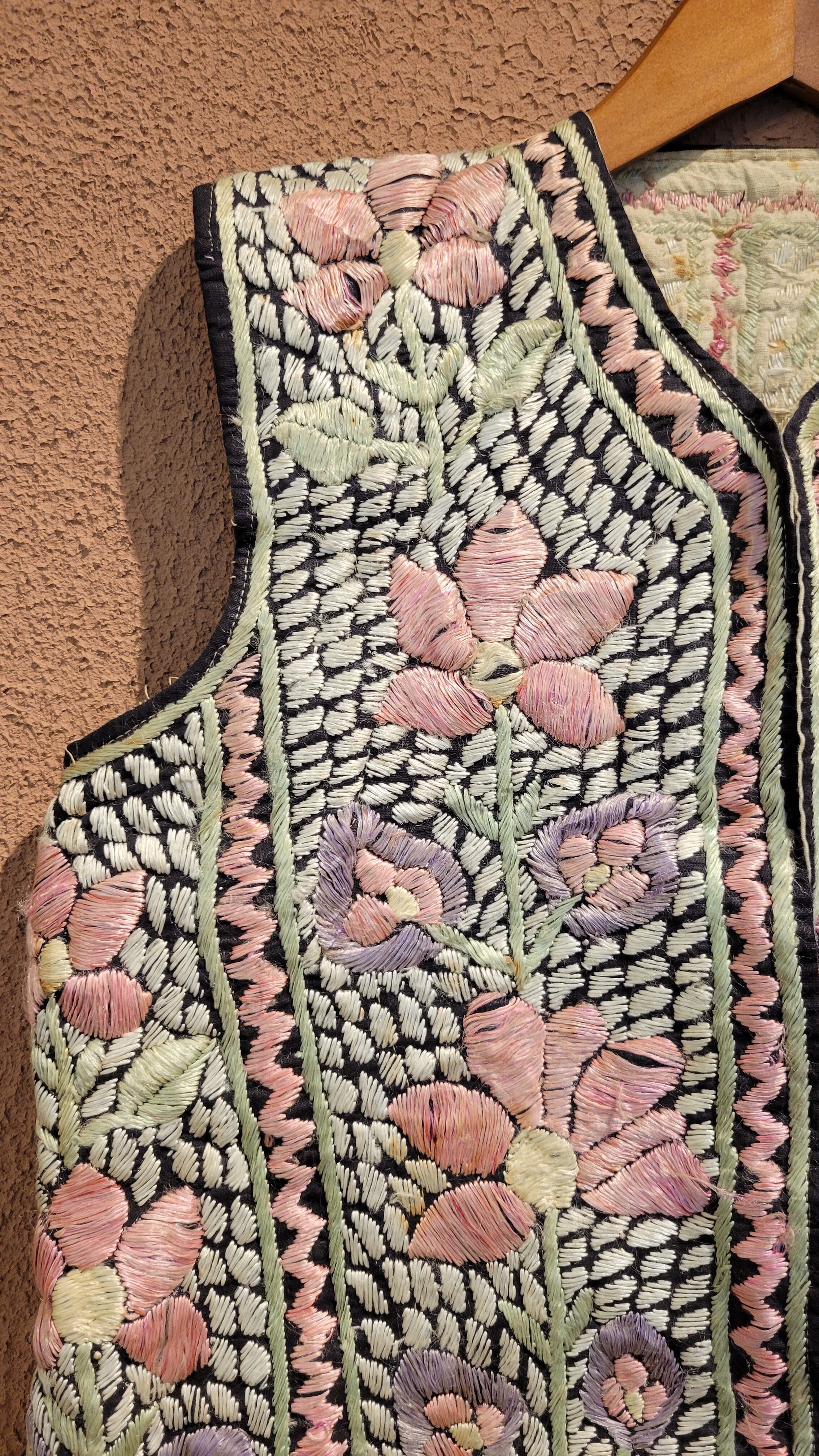 インドの古い刺繍のヴィンテージベスト。素材表記はありませんが厚みと張り感のあるしっかりした素材です。光沢のある刺繍糸が美しいです。前身ごろの刺繍は色が抜けたように全体的に薄めの色合い、後ろ身ごろはわりとはっきりした濃い色の刺繍となっており、前後で表情が変わるのもヴィンテージならでは。着用に支障のあるほどの特筆するダメージはありませんが、古いお品のため経年による風合いを味わいとしてお楽しみいただける方へおすすめいたします。