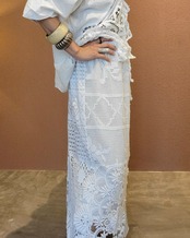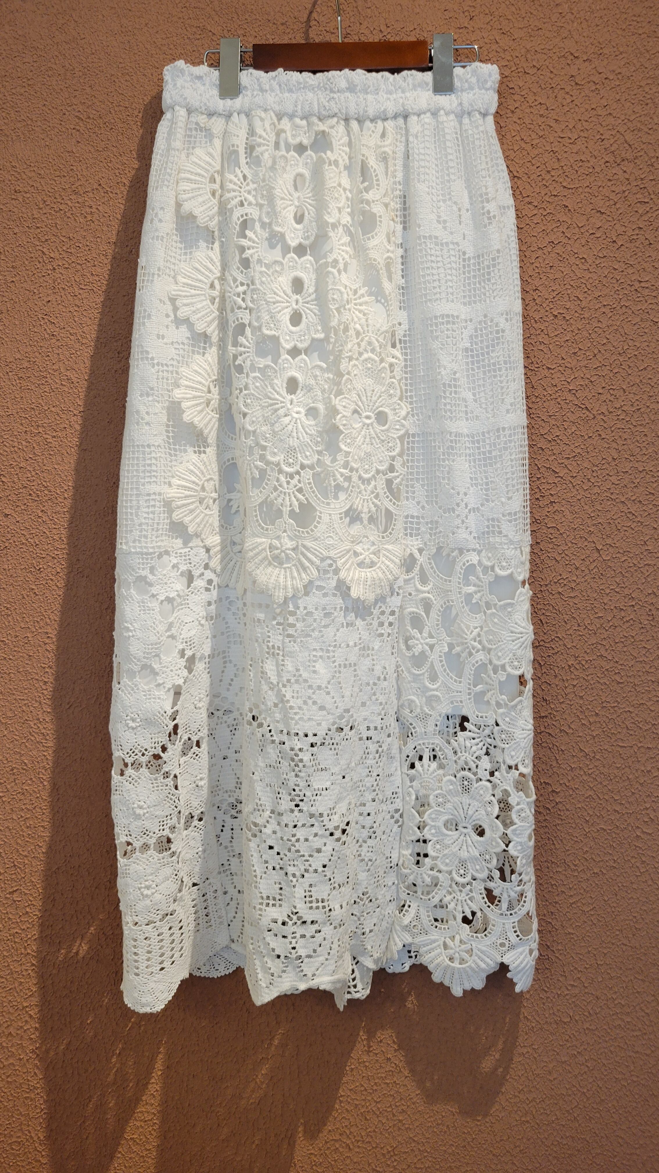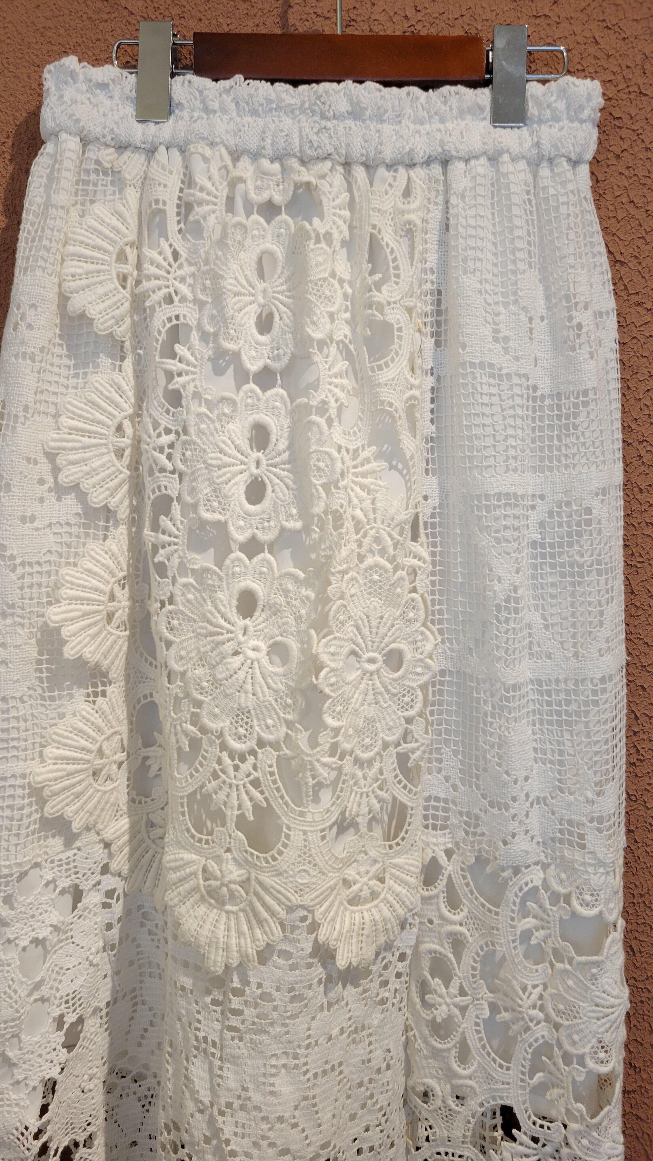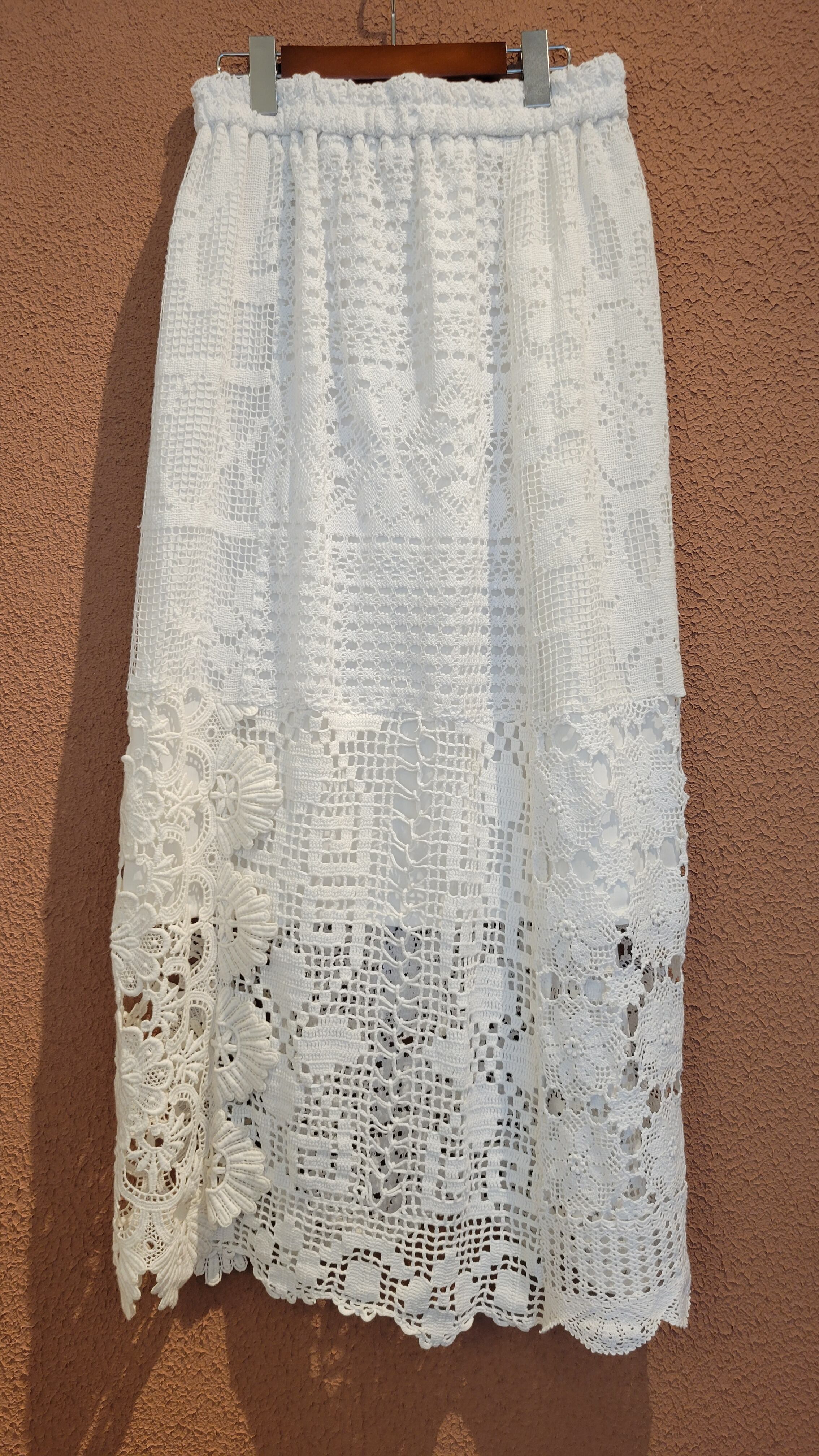 ヴィンテージレースを何枚も繋ぎ合わせたリメイクスカート。ウエストゴム。ひざ丈の裏地付きで1枚で着用できます。カジュアルにもきれいめにも使える1枚です。