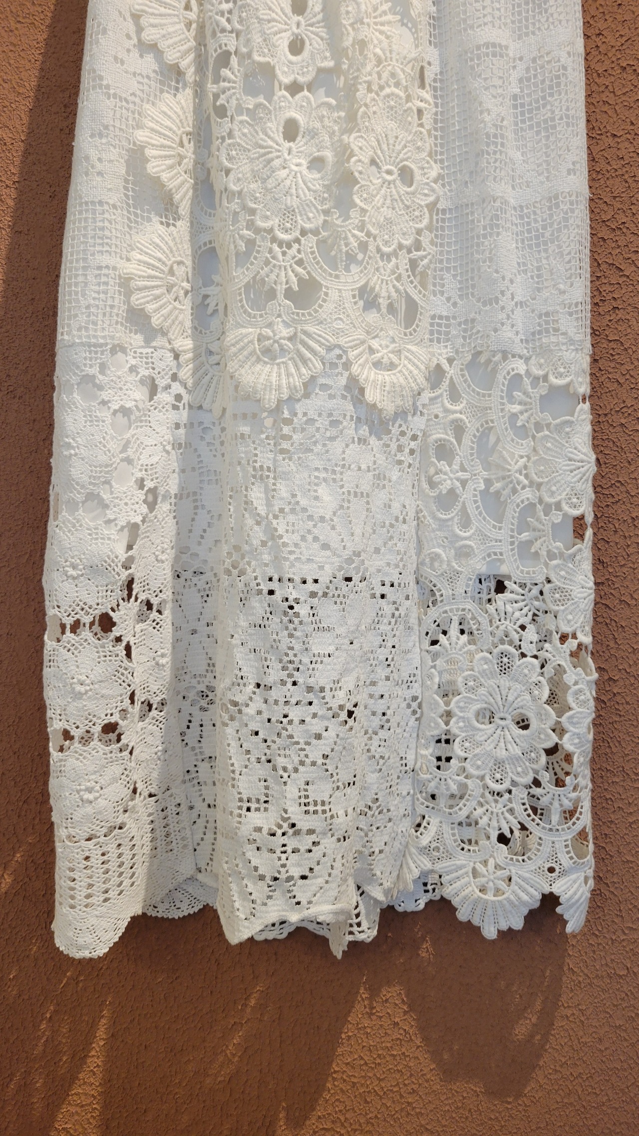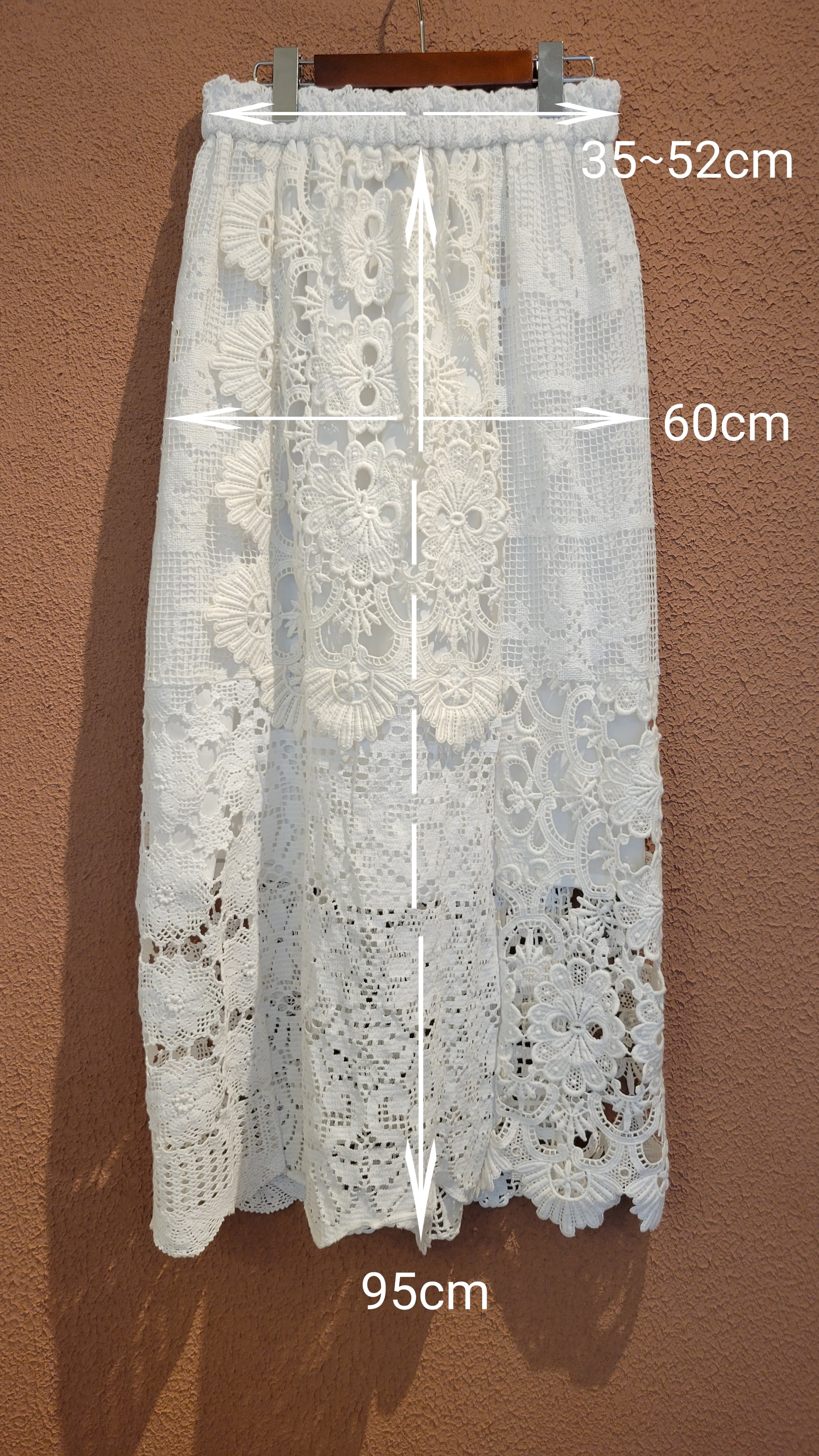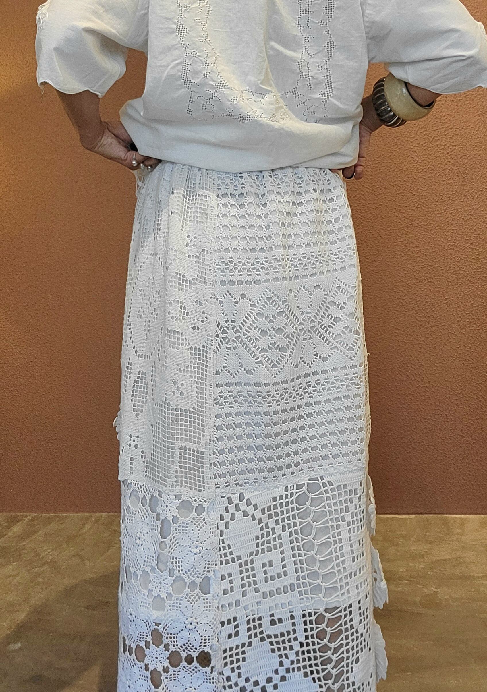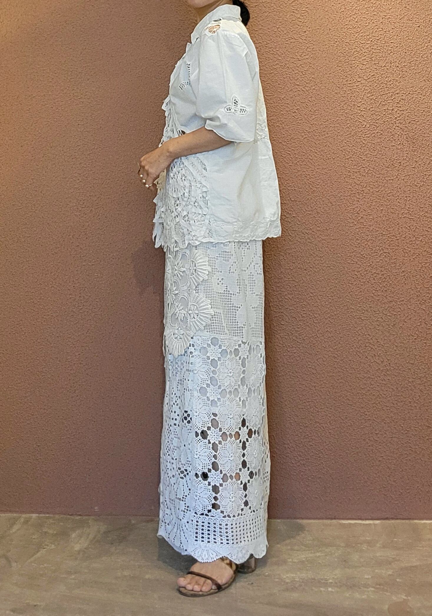 ヴィンテージレースを何枚も繋ぎ合わせたリメイクスカート。ウエストゴム。ひざ丈の裏地付きで1枚で着用できます。カジュアルにもきれいめにも使える1枚です。