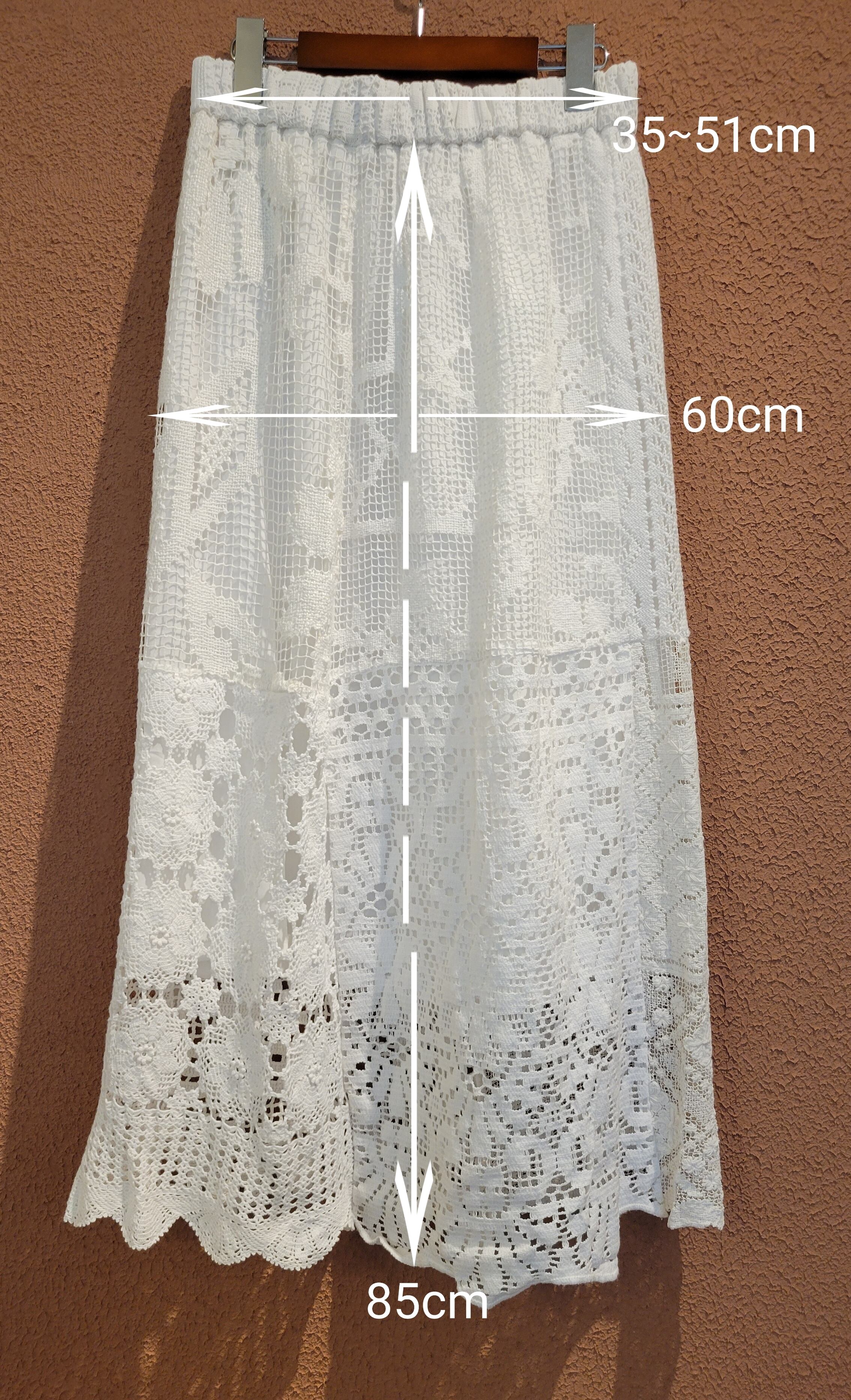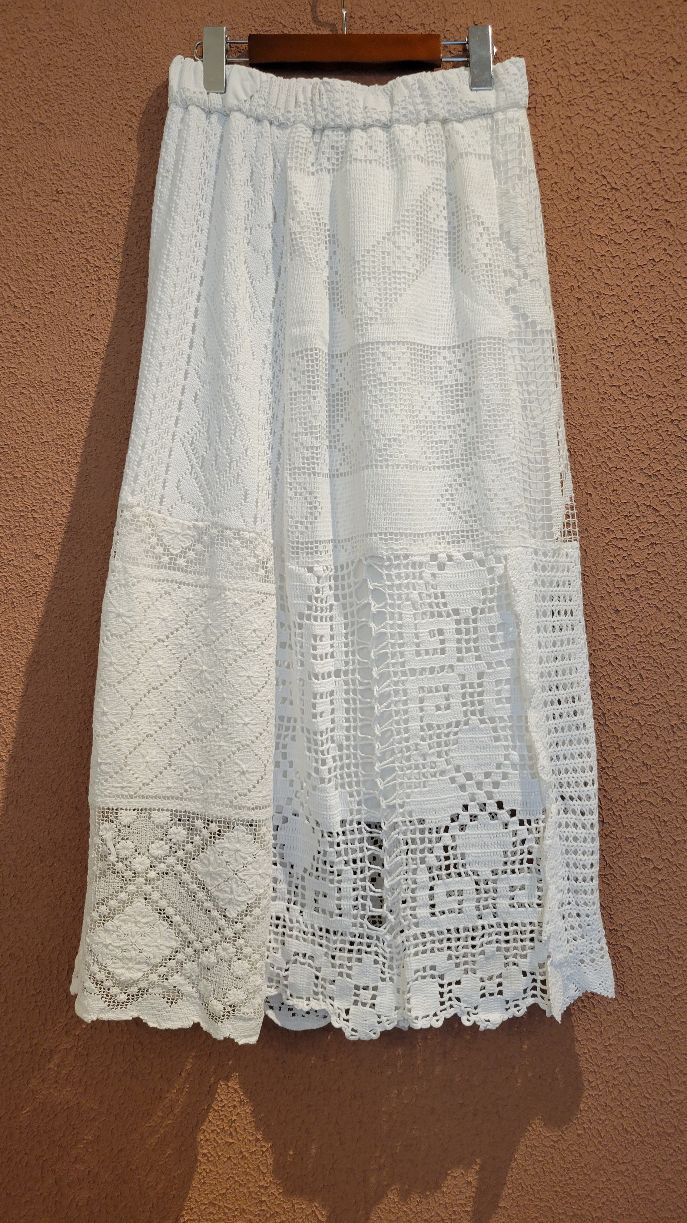 ヴィンテージレースを何枚も繋ぎ合わせたリメイクスカート。ウエストゴム。ひざ丈の裏地付きで1枚で着用できます。カジュアルにもきれいめにも使える1枚です。