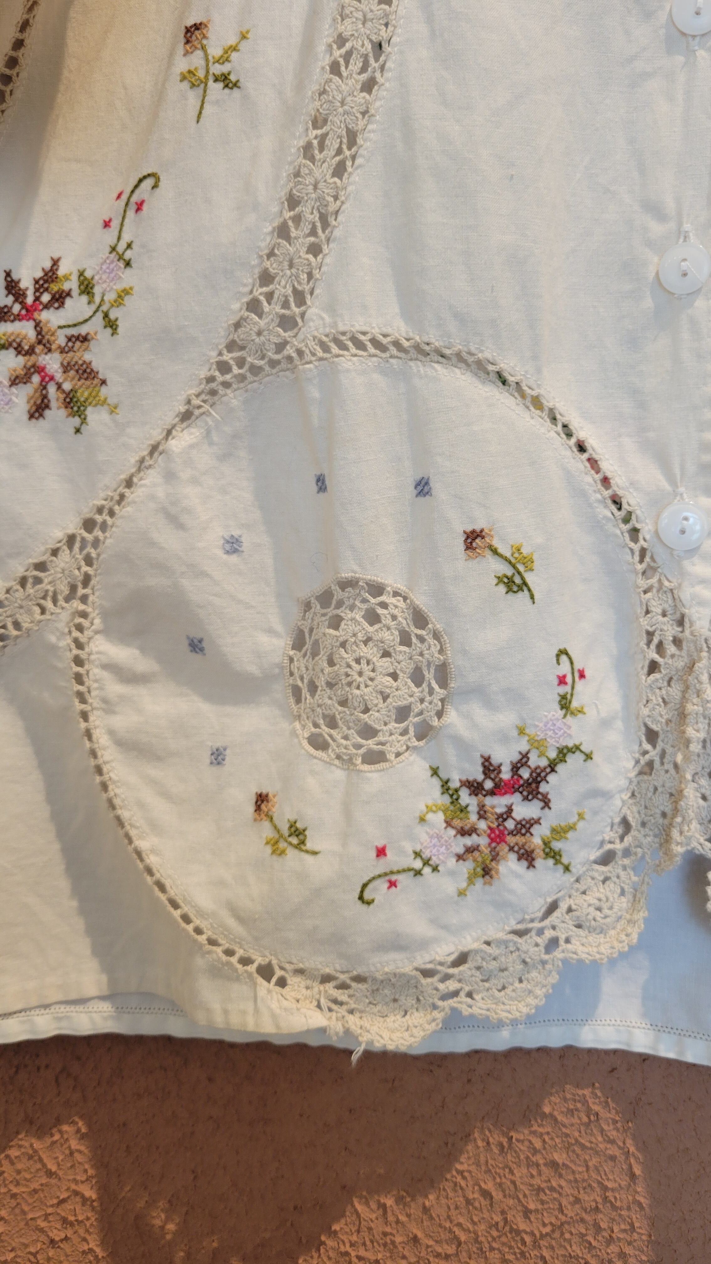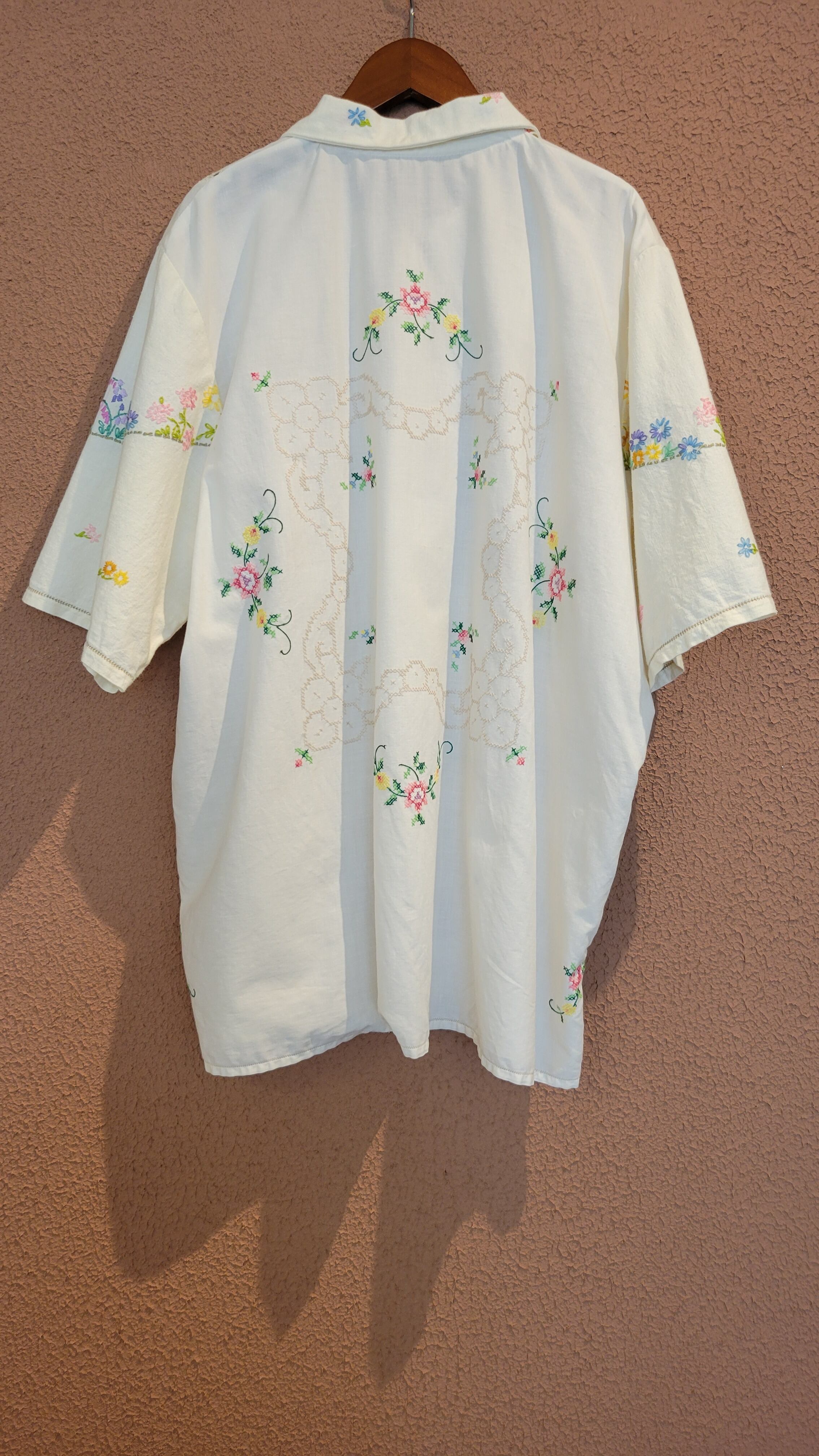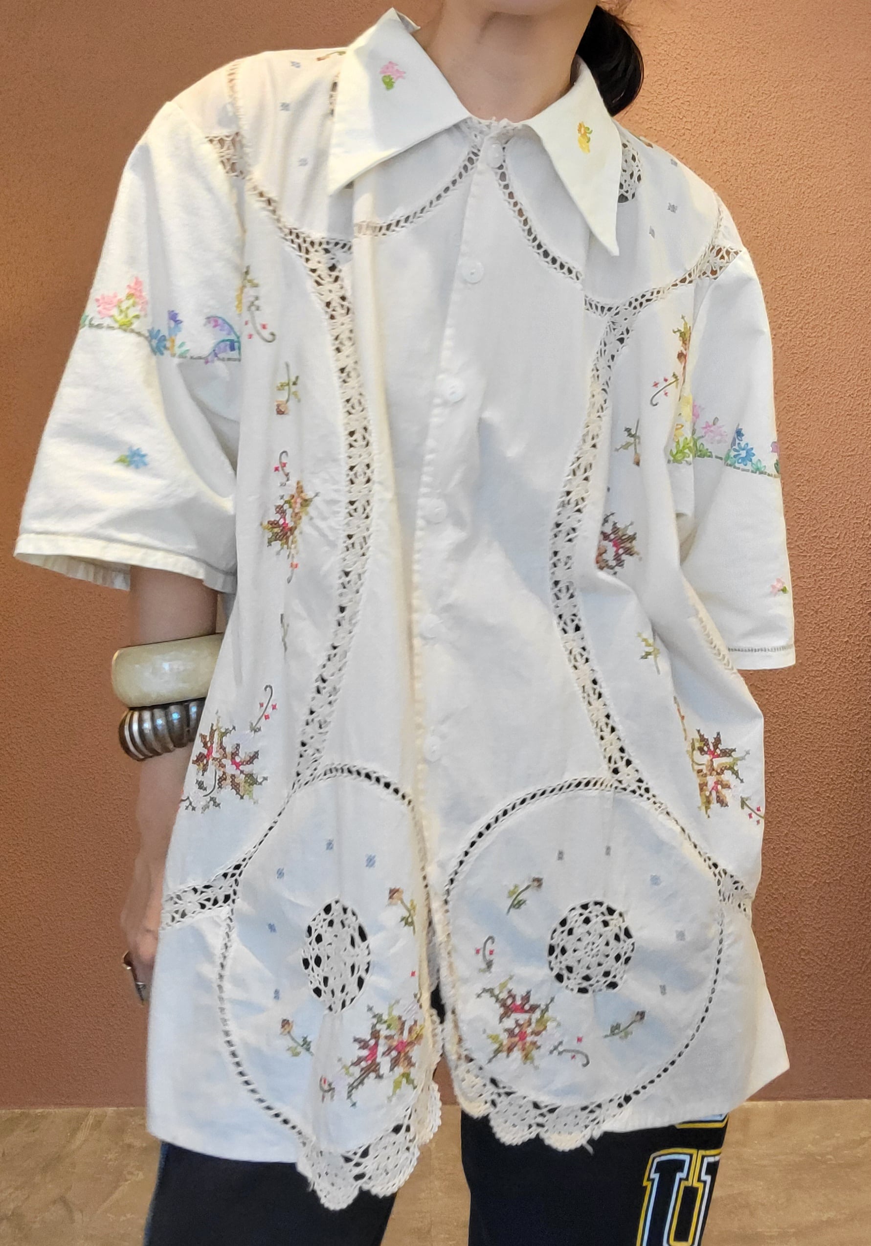 ヴィンテージの刺繍クロスを使用したリメイクシャツ。素材表記はありませんがコットンです。刺繍は全て手刺繍によるものでとても繊細です。ゆったりしたサイジングで男女兼用で着用できるサイズ感。男性にも着ていただきたい1着です。