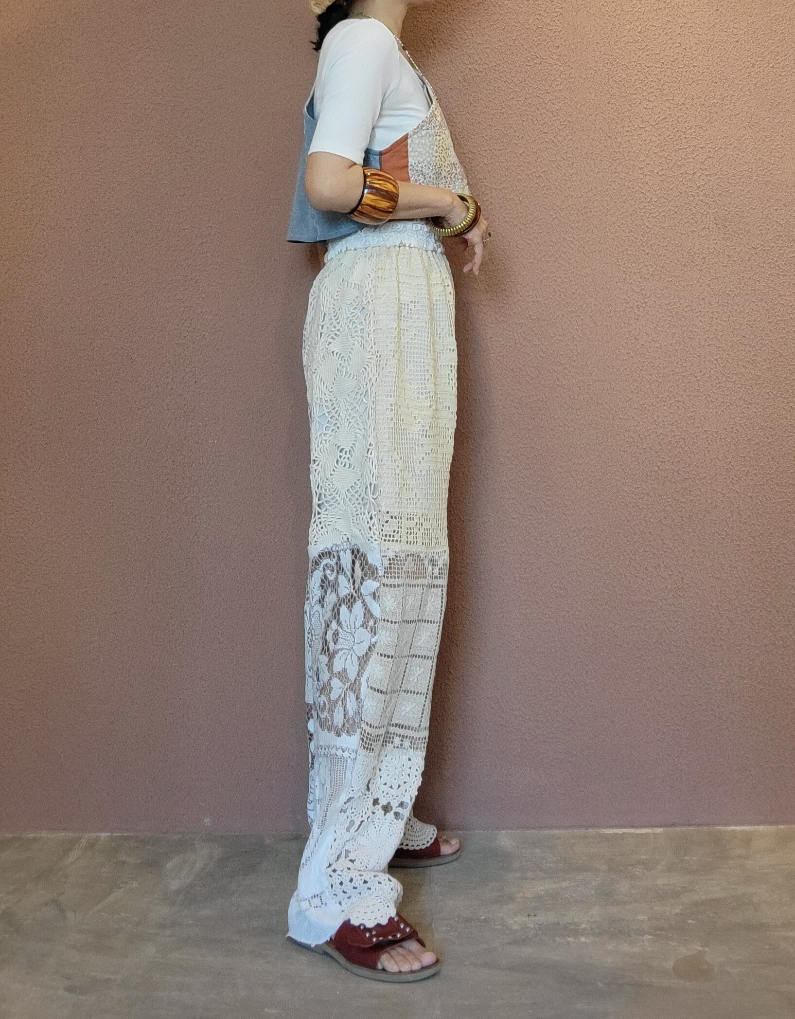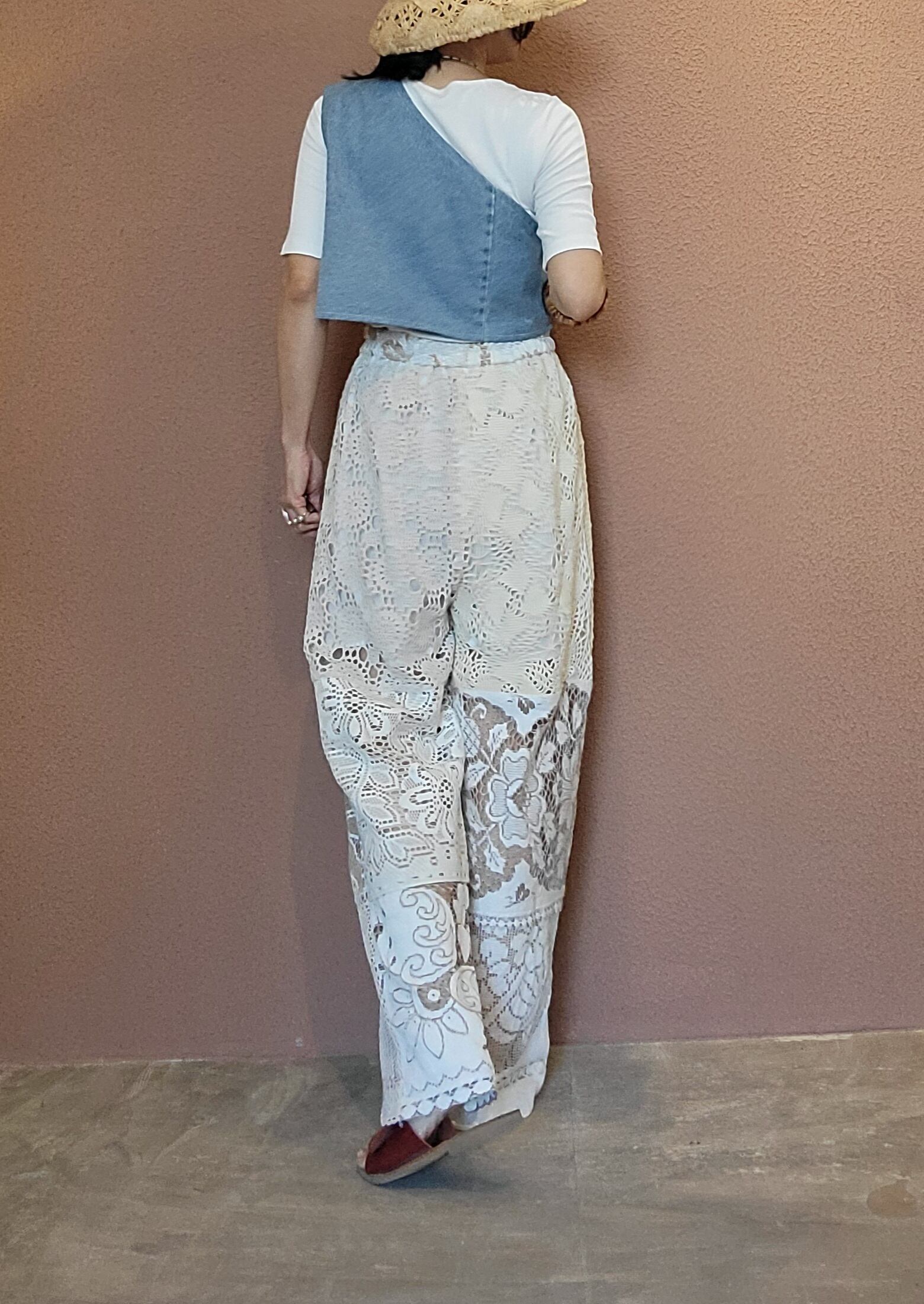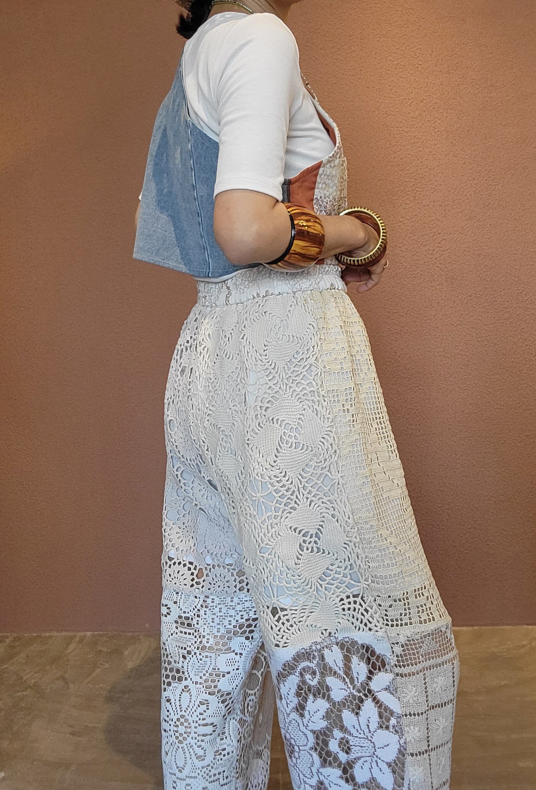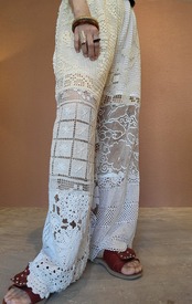 ヴィンテージレースを使用したリメイクイージーパンツ。ウエストゴム、ポケットは付いていません。膝上丈の裏地付きなので1枚で着用できます。異なる種類のレースを何枚も繋ぎ合わせているためどこから見ても表情豊か。ストレスフリーのゆったりしたサイジングでこなれ感のある着こなしが叶います。