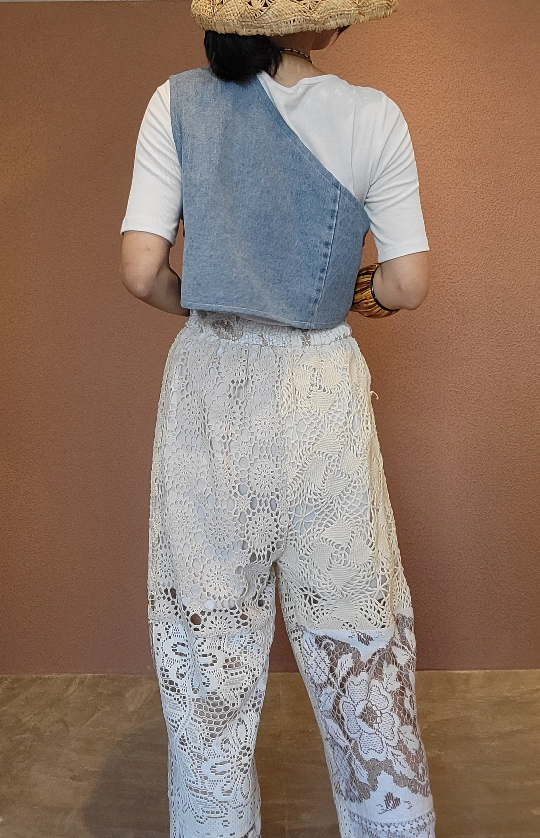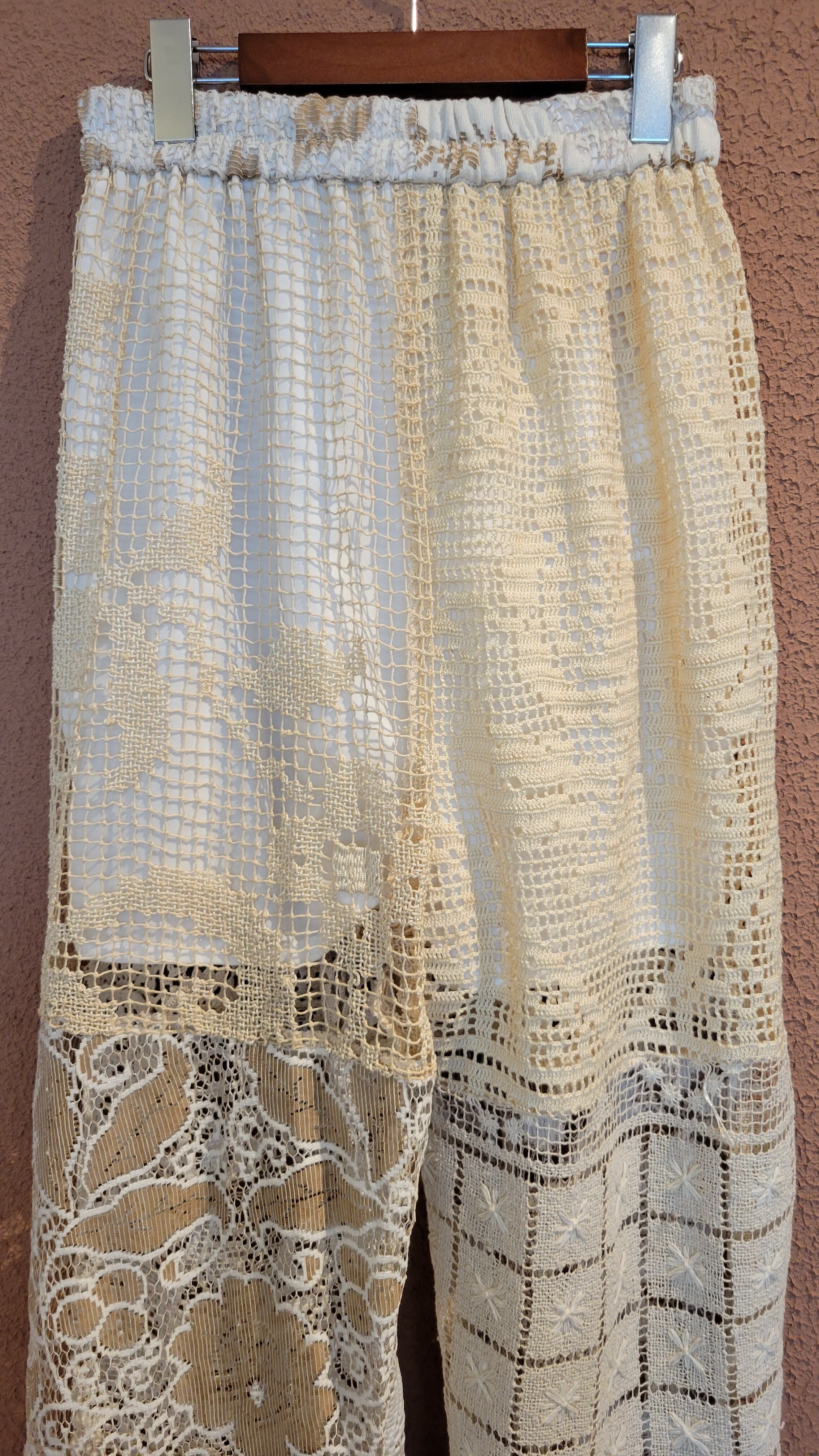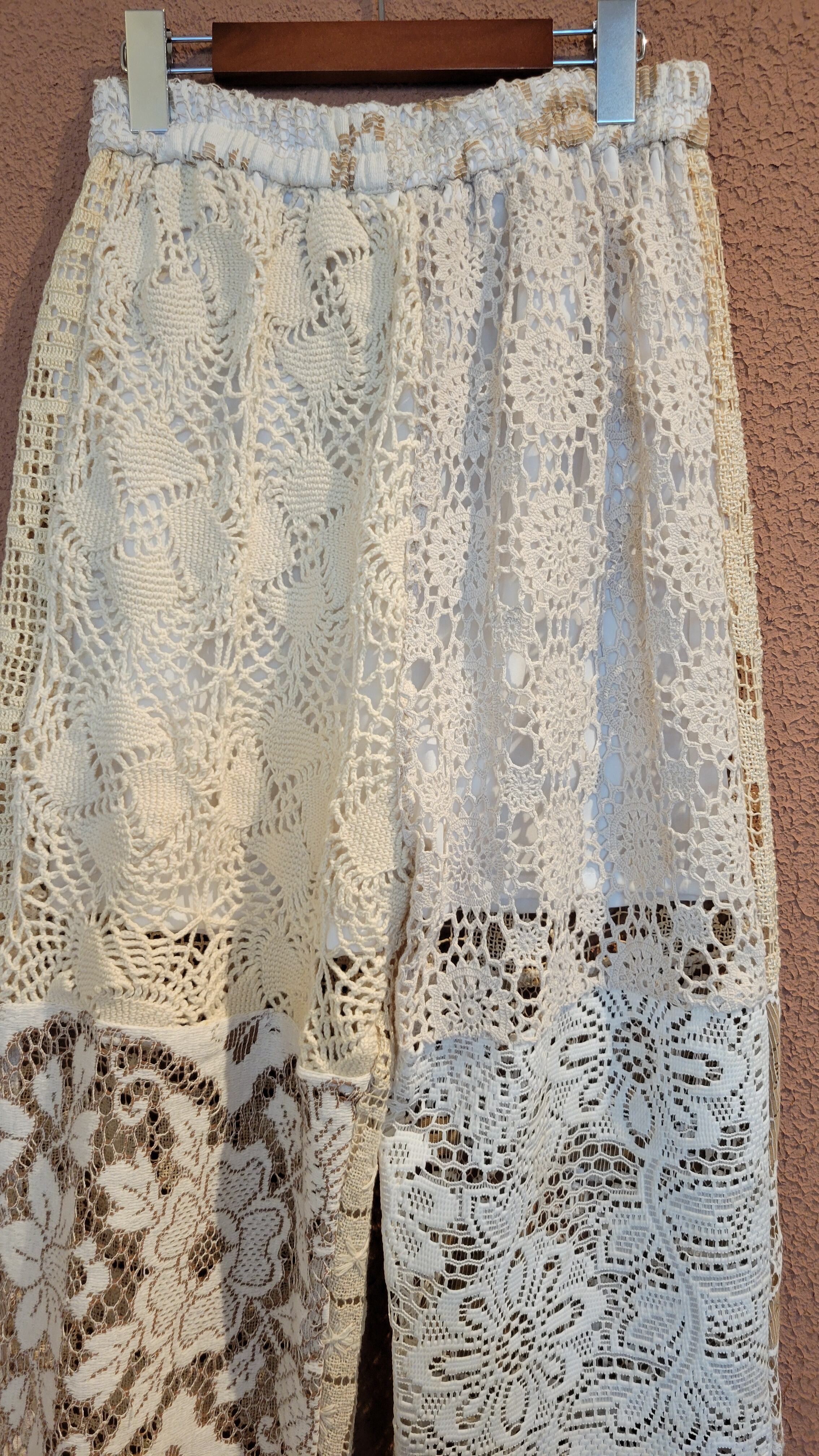 ヴィンテージレースを使用したリメイクイージーパンツ。ウエストゴム、ポケットは付いていません。膝上丈の裏地付きなので1枚で着用できます。異なる種類のレースを何枚も繋ぎ合わせているためどこから見ても表情豊か。ストレスフリーのゆったりしたサイジングでこなれ感のある着こなしが叶います。