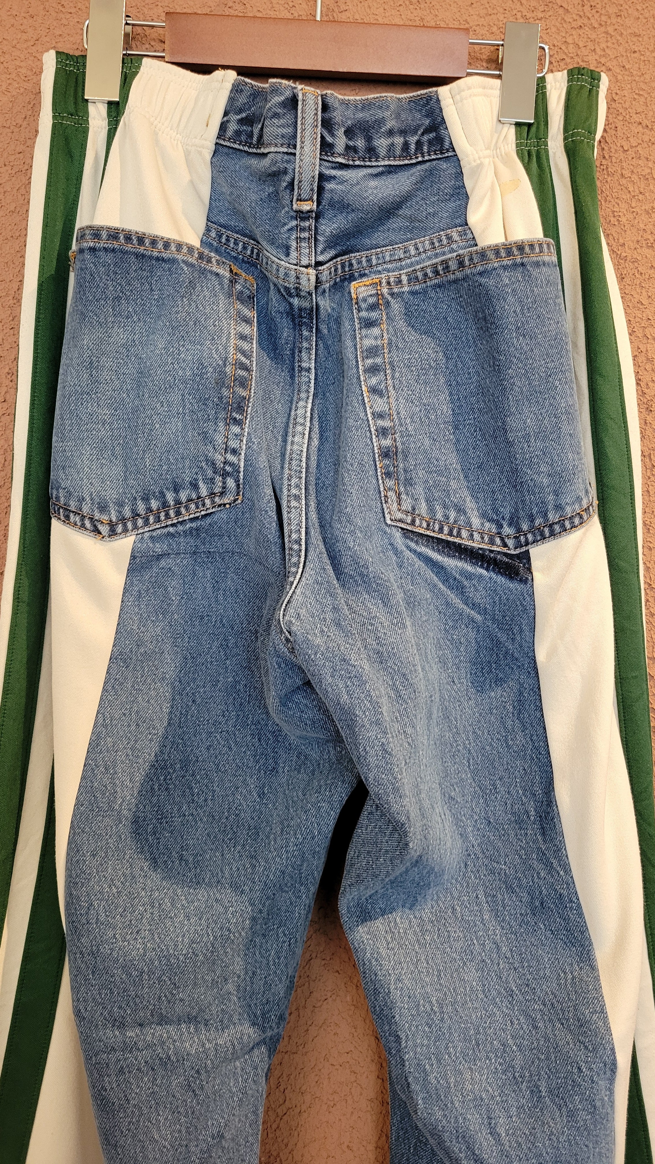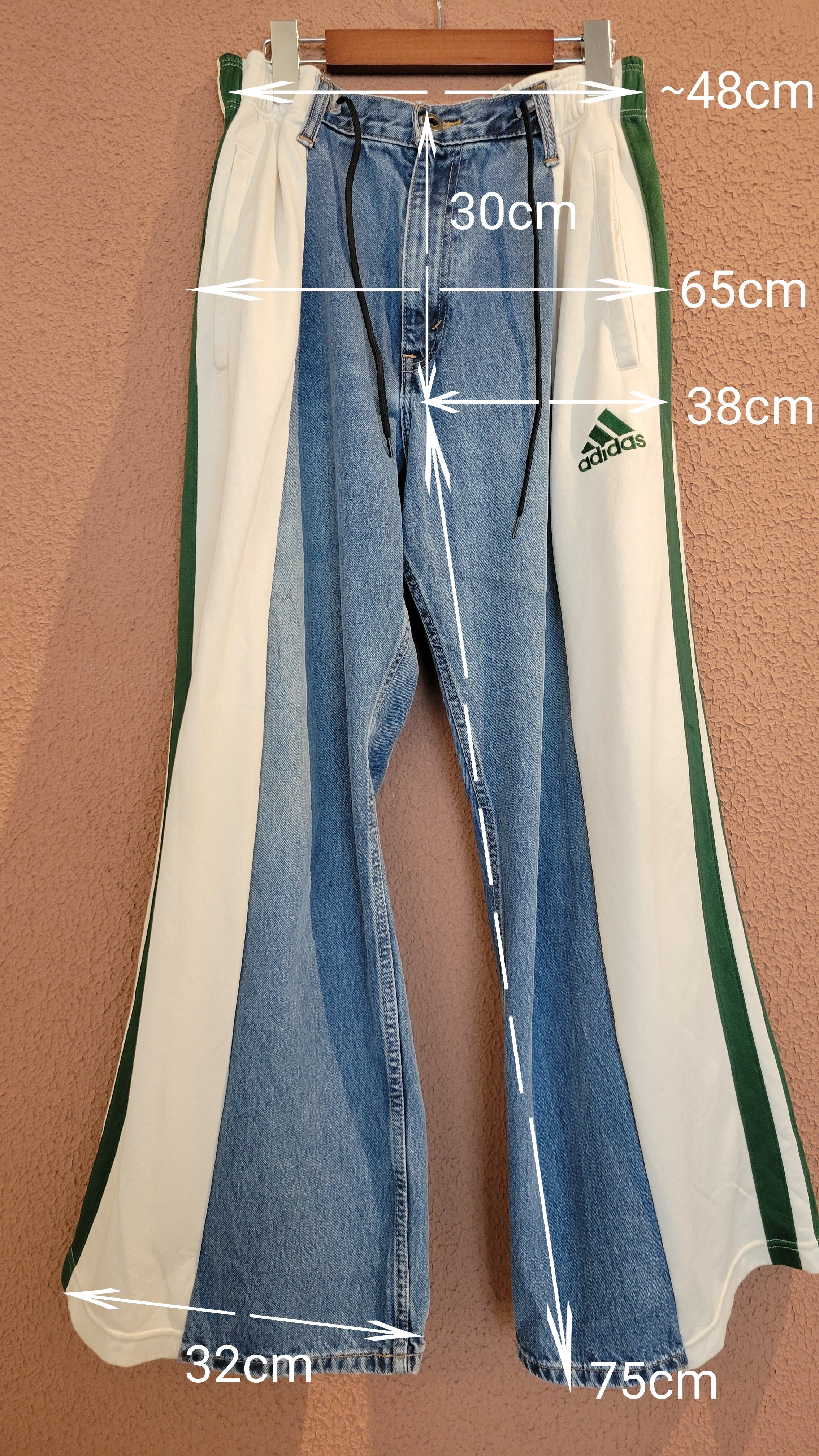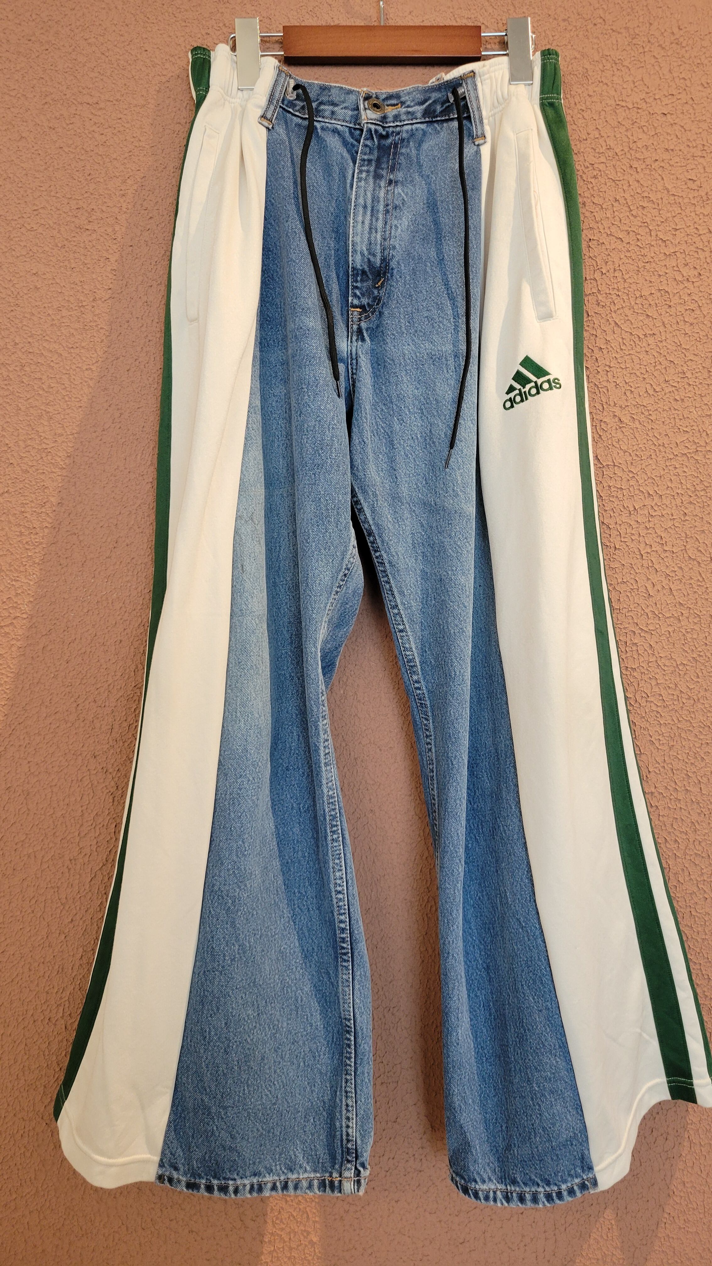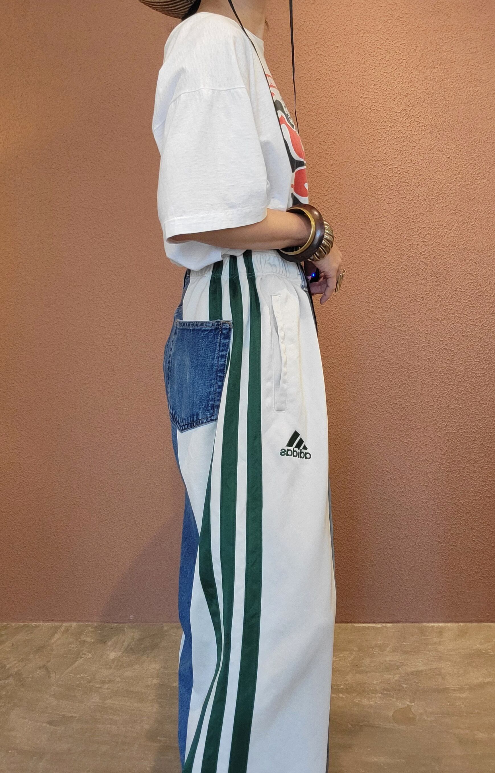 UsedデニムとUsedトラックパンツを掛け合わせたリメイクパンツ。ウエストはドローストリングでサイズ調節可能です。