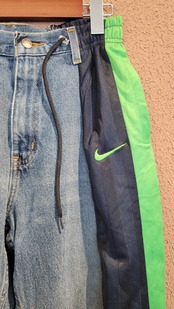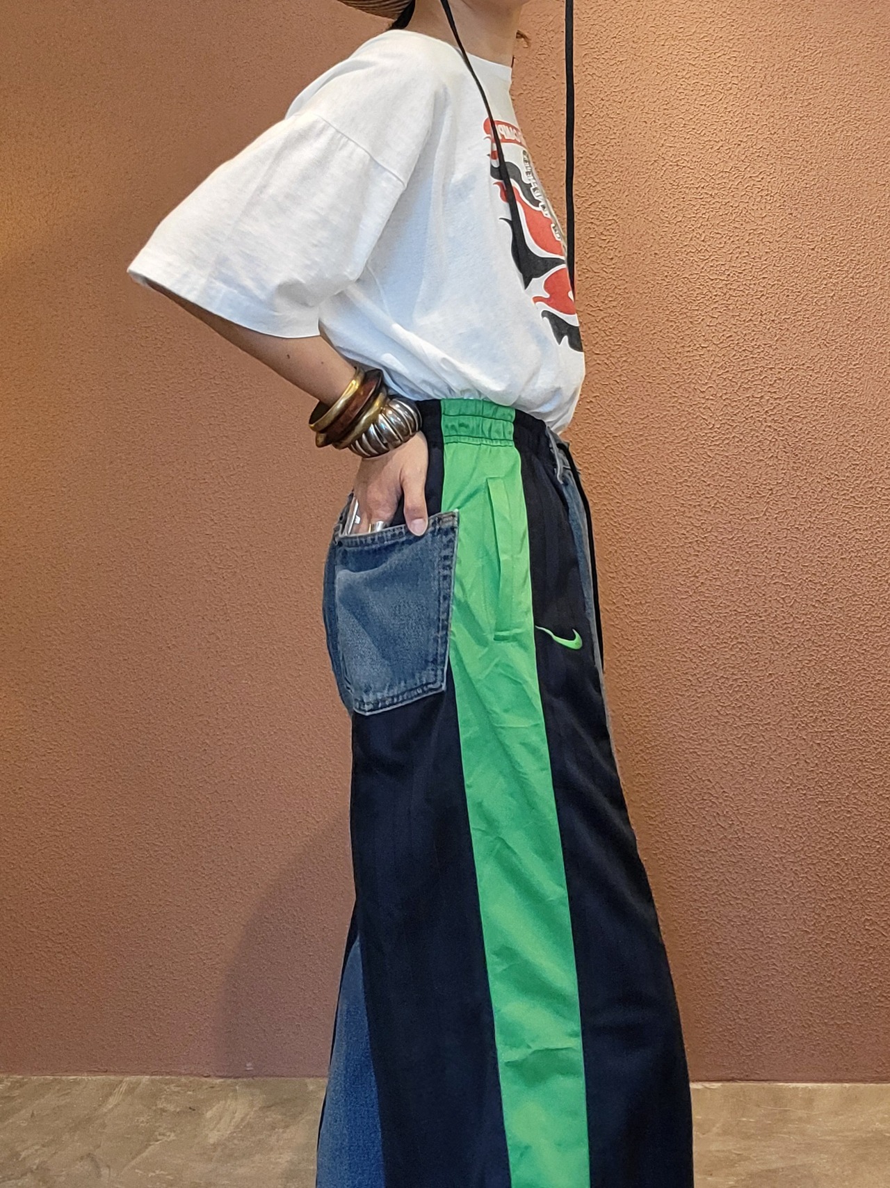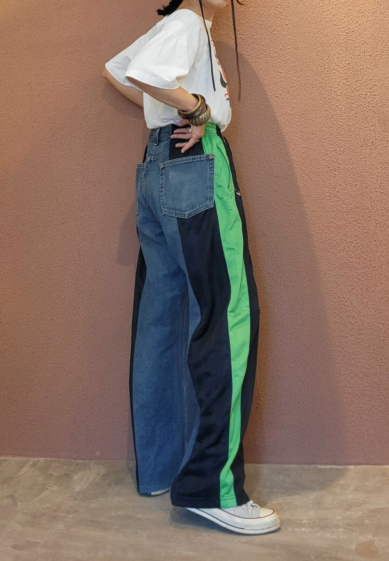 UsedデニムとUsedトラックパンツを掛け合わせたリメイクパンツ。ウエストはドローストリングでサイズ調節可能です。
