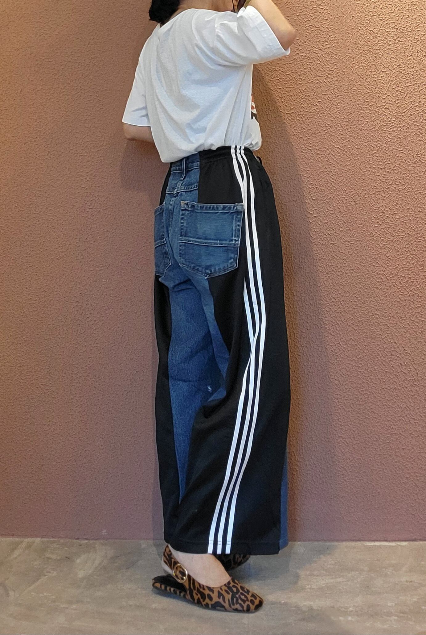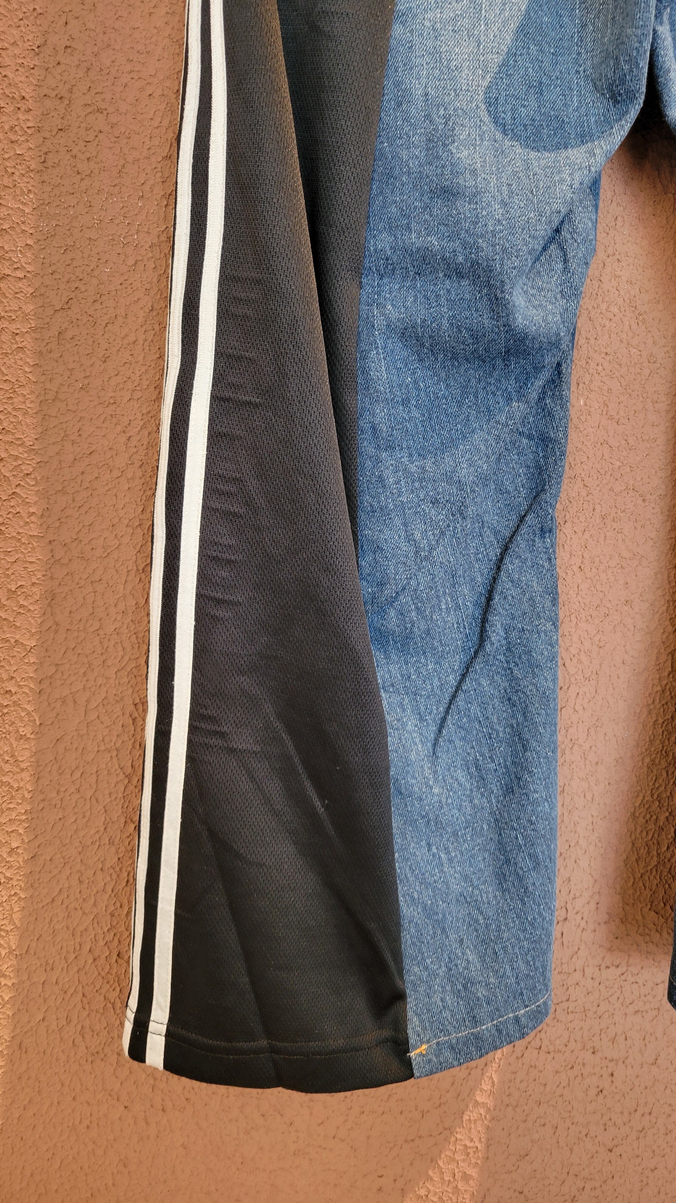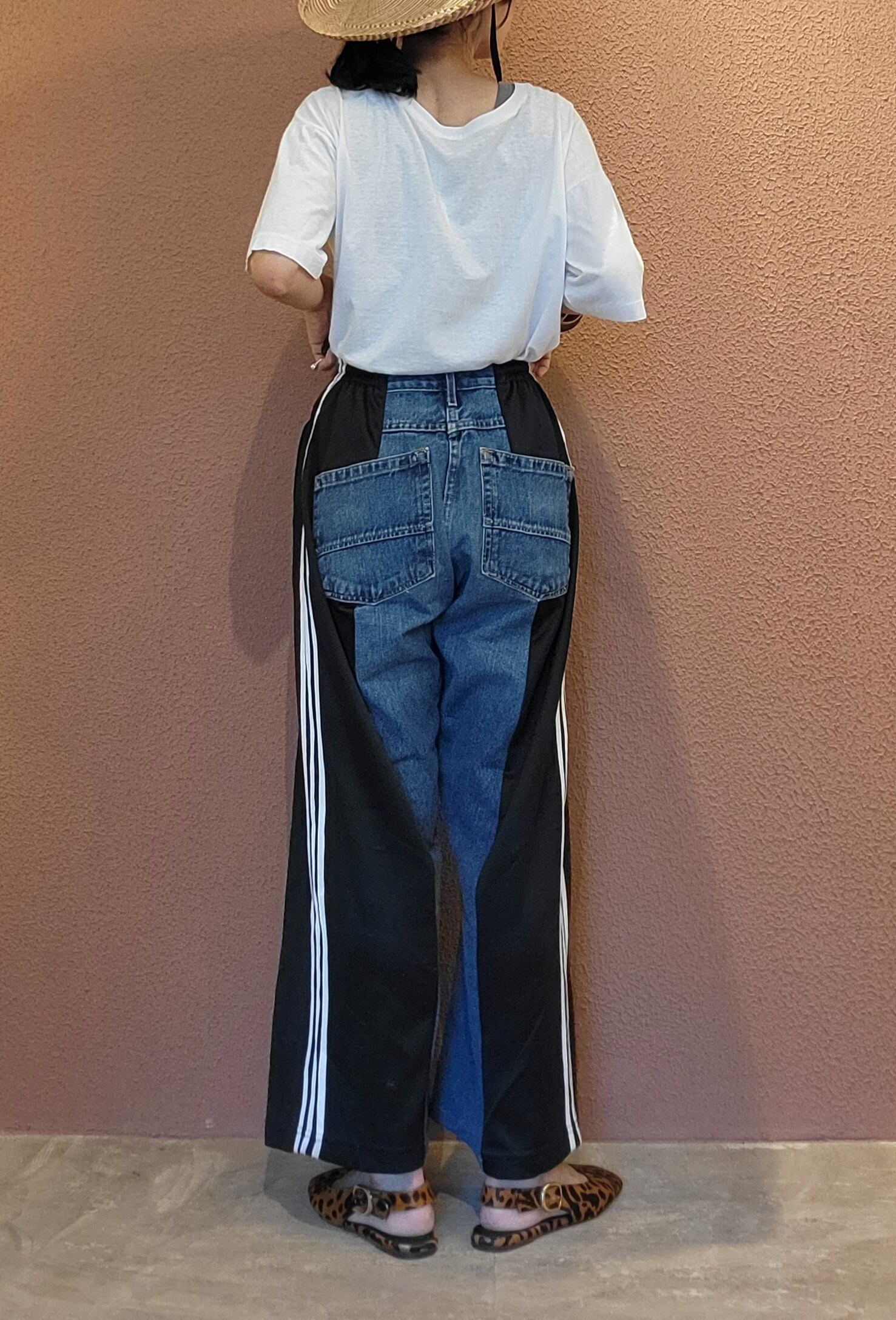 UsedデニムとUsedトラックパンツを掛け合わせたリメイクパンツ。ウエストはドローストリングでサイズ調節可能です。