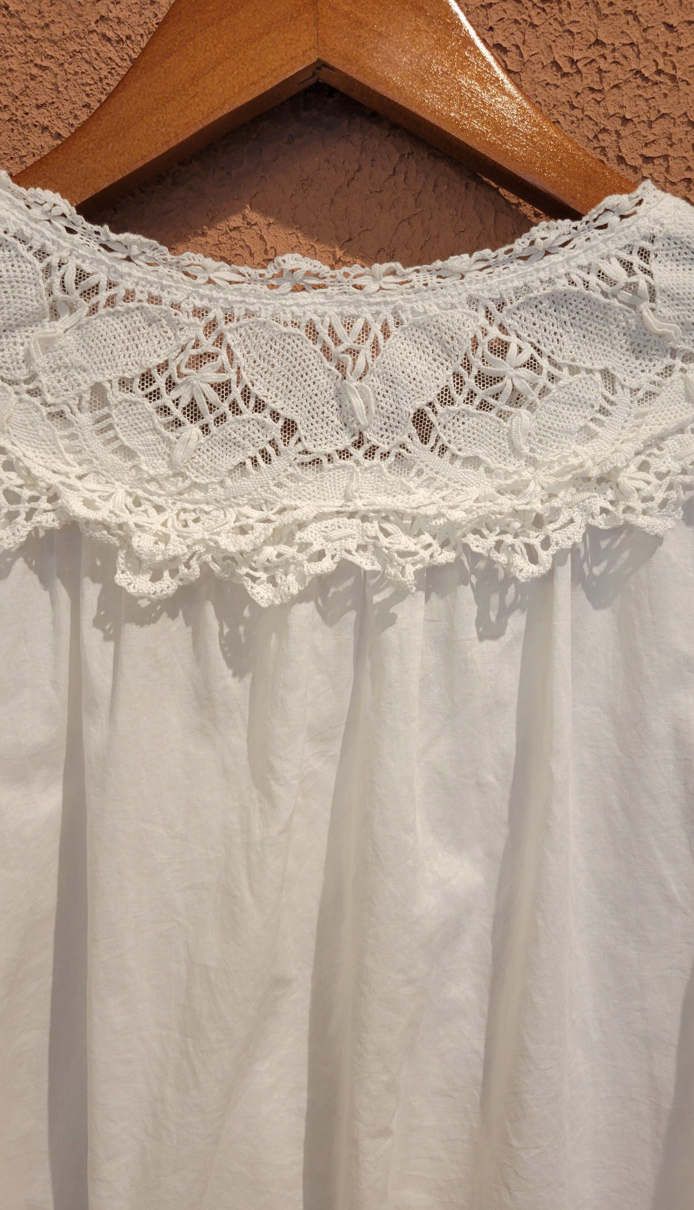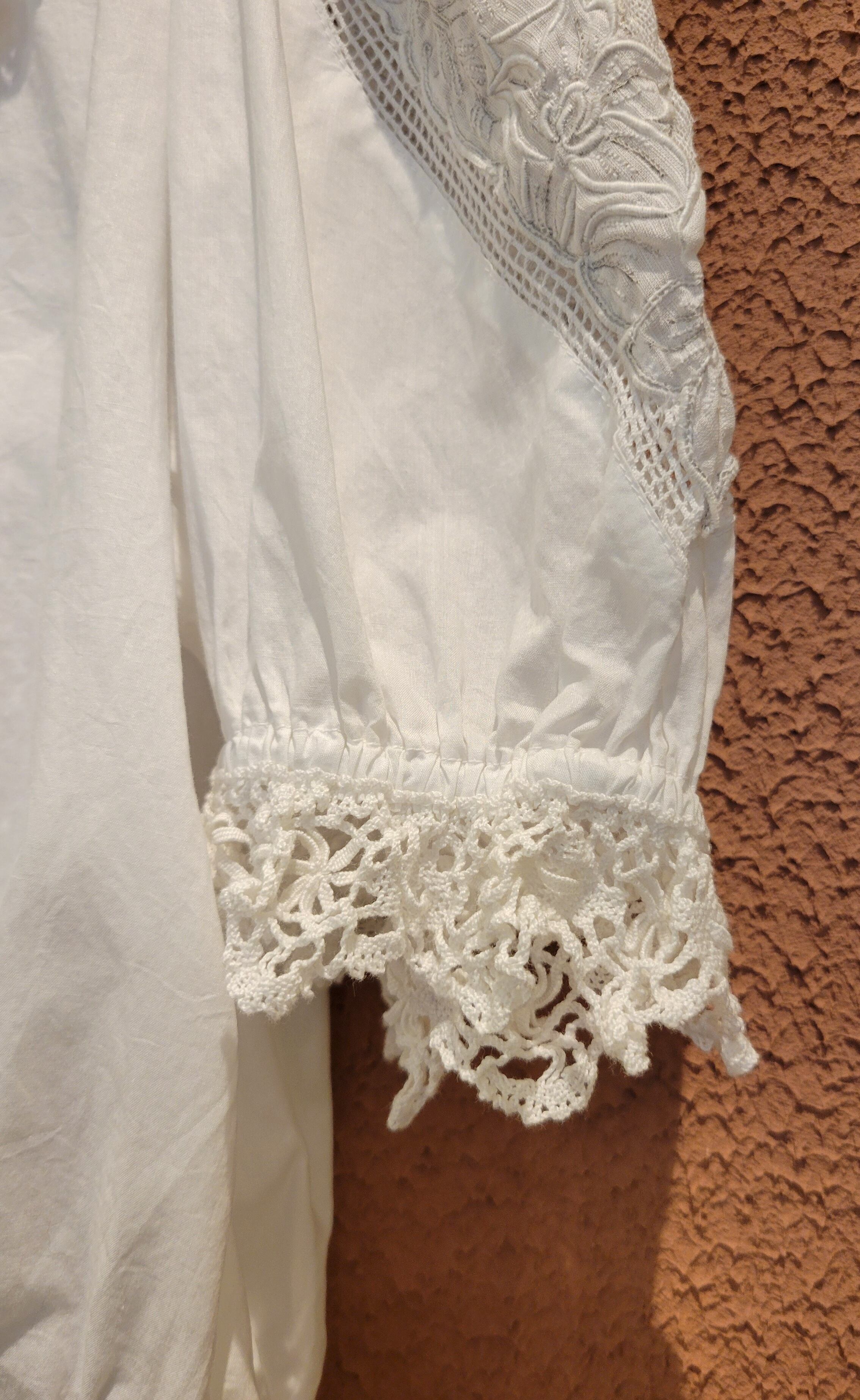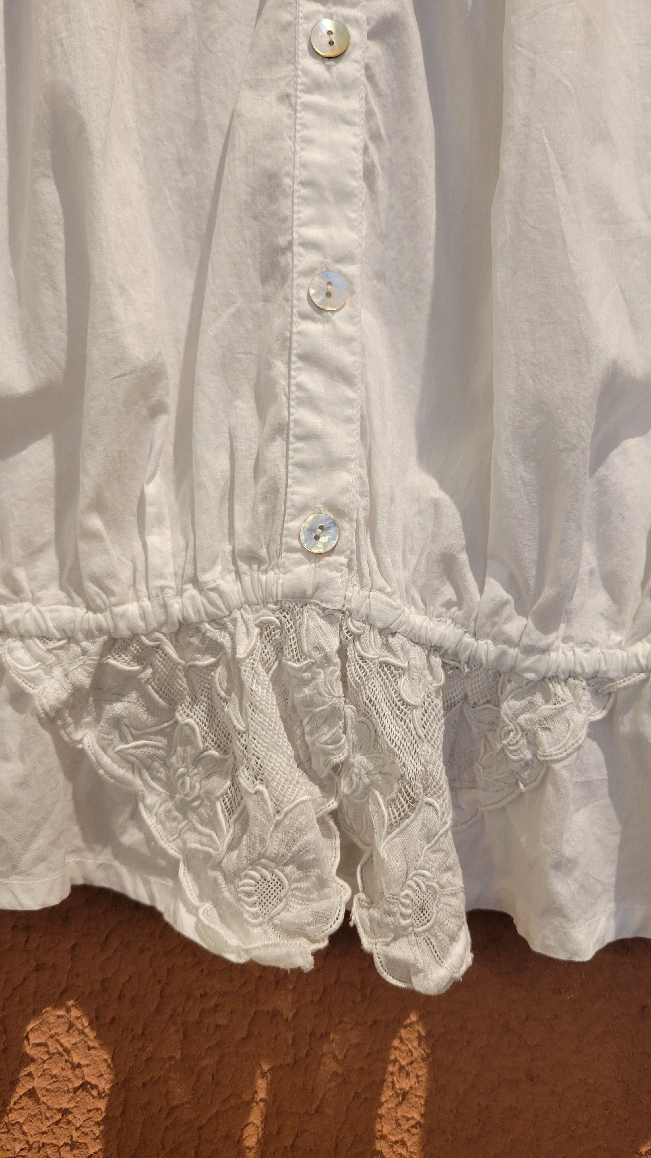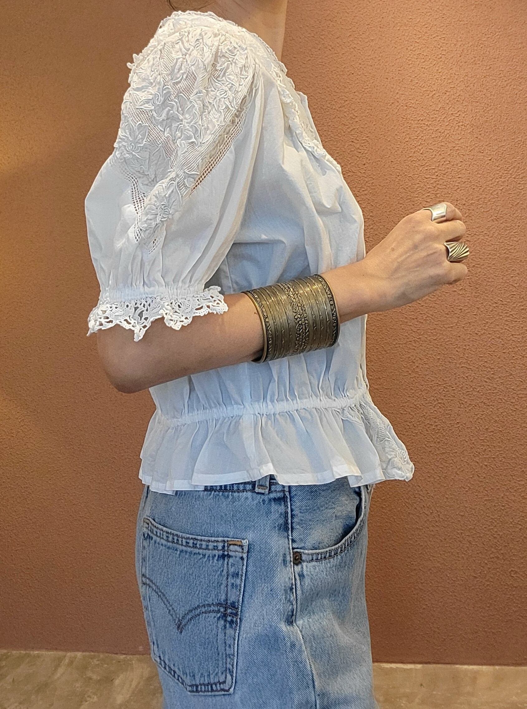 ヴィンテージのホワイトレースブラウス。素材はコットンです。ウエストゴム入りこペプラムデザイン。前後左右、どこから見ても繊細なレースが目に留まります。胸元はVネックですっきりとした印象で甘くなりすぎないのがポイントです。