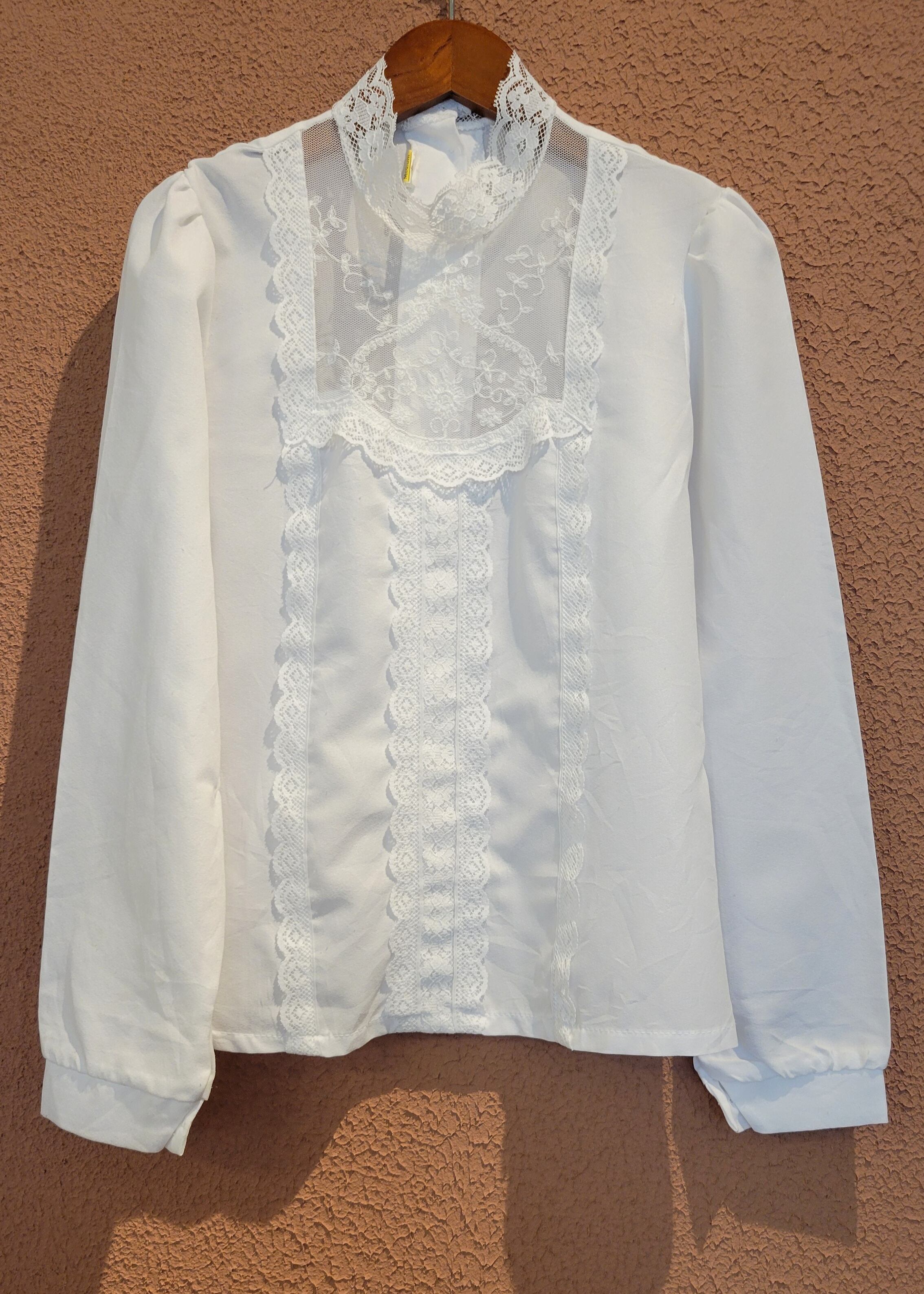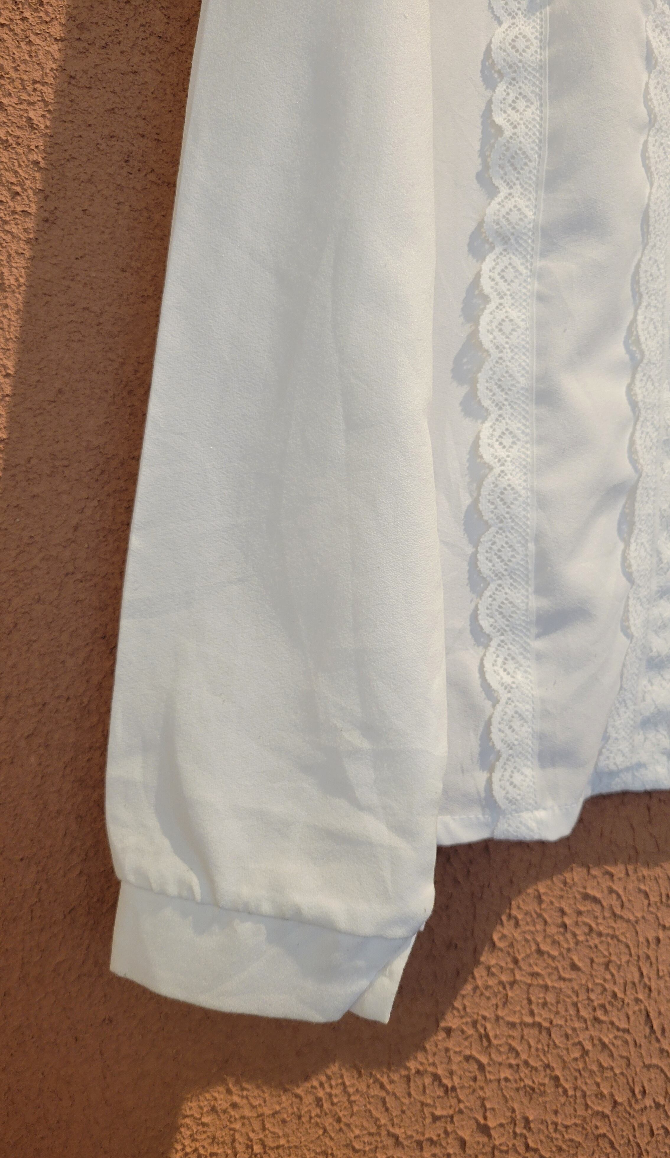 ヴィンテージのホワイトレースブラウス。素材表記はありませんがポリエステルのようです。レースのハイネックとデコルテは品のある透け感があり、軽やかな印象に。クラシカルなデザインはデニム等無骨なボトムとの相性ばっちりです。