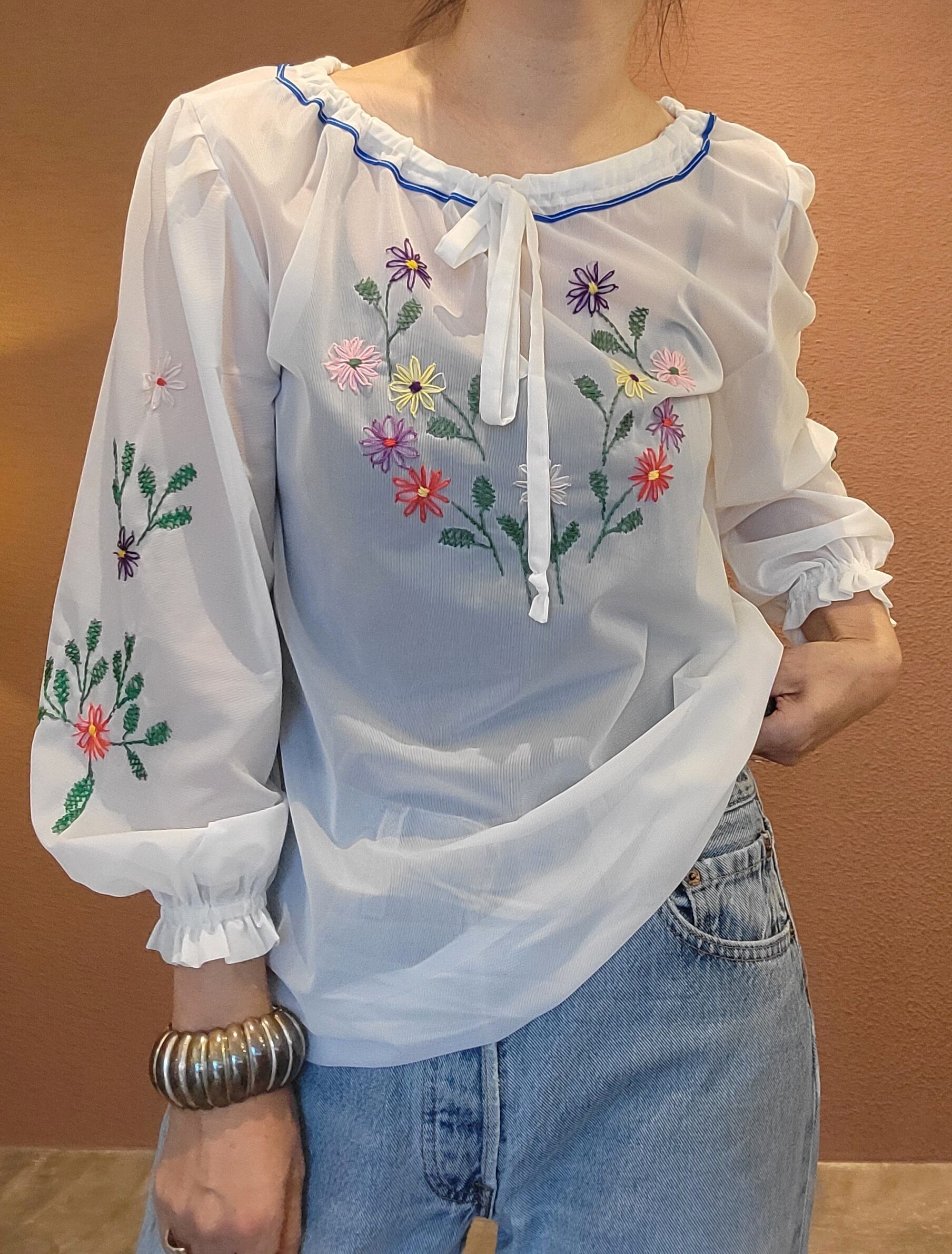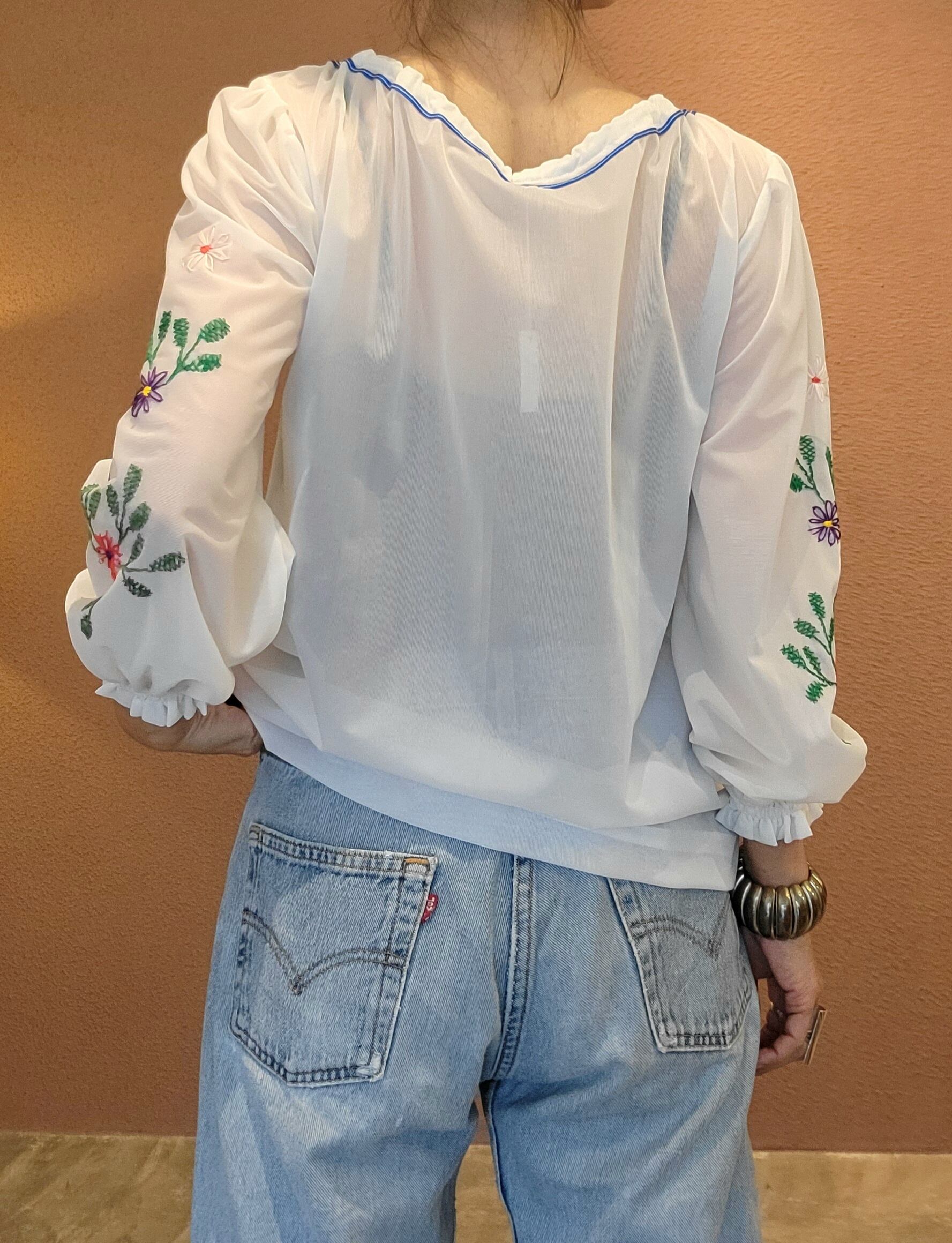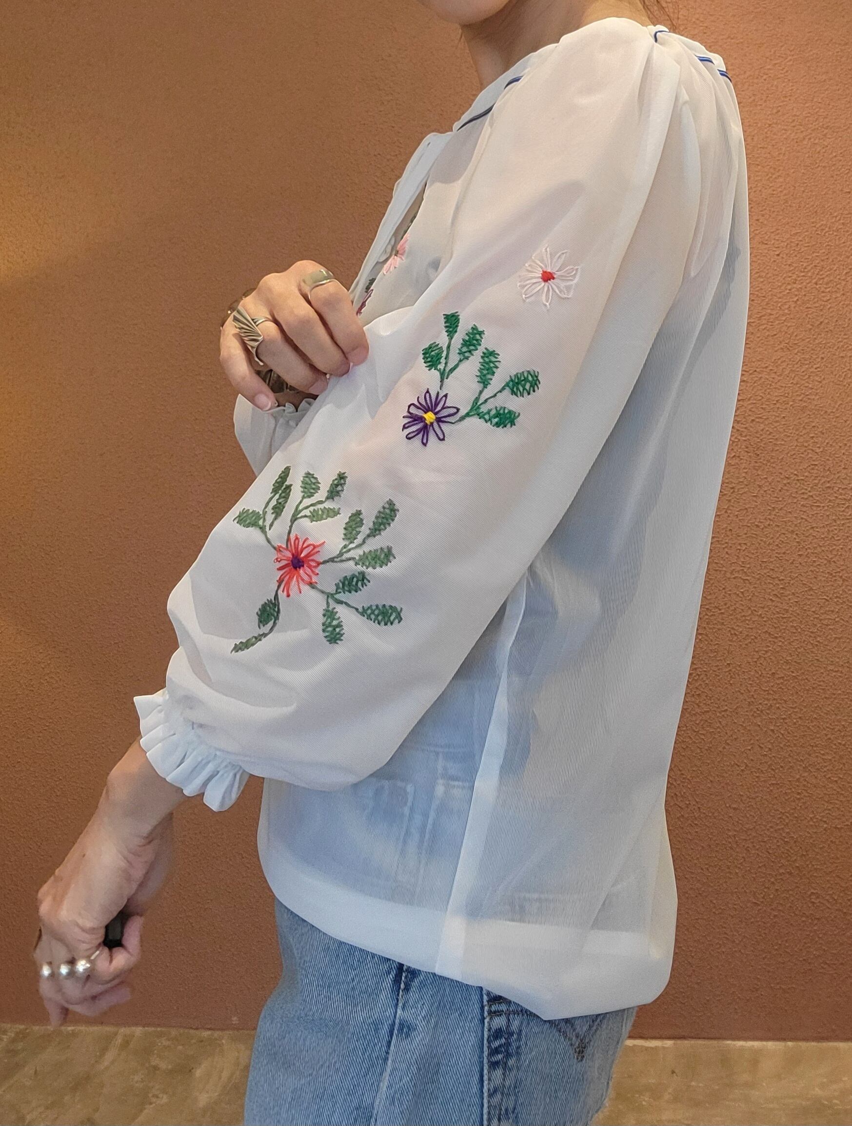 ヴィンテージの手刺繍入りプルオーバートップス。素材表記はありませんがポリエステルのようです。透け感があります。このタイプのトップスには珍しいシアー素材。デコルテ周りには紐が通っており開き具合をお好みで調節できます。