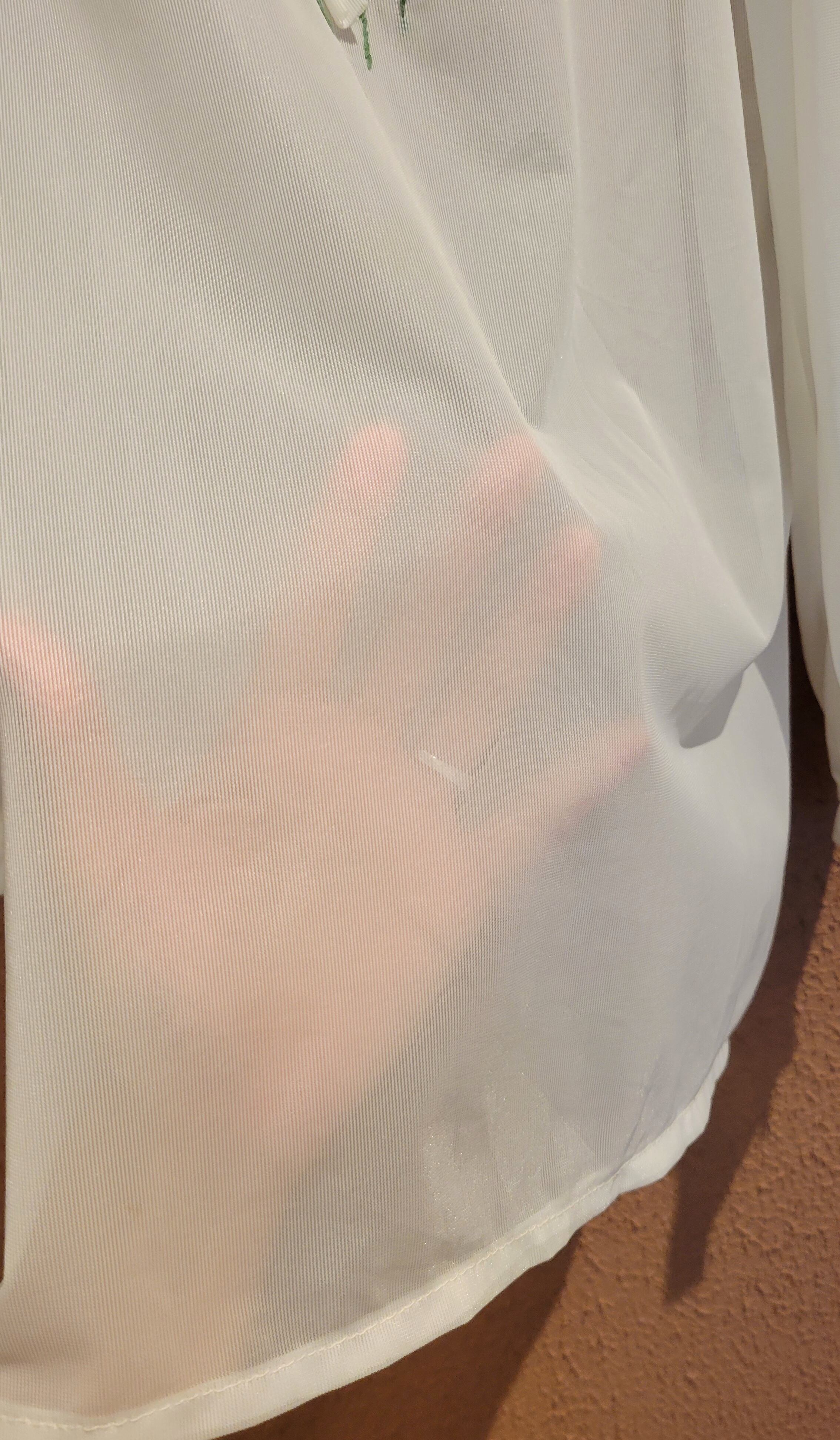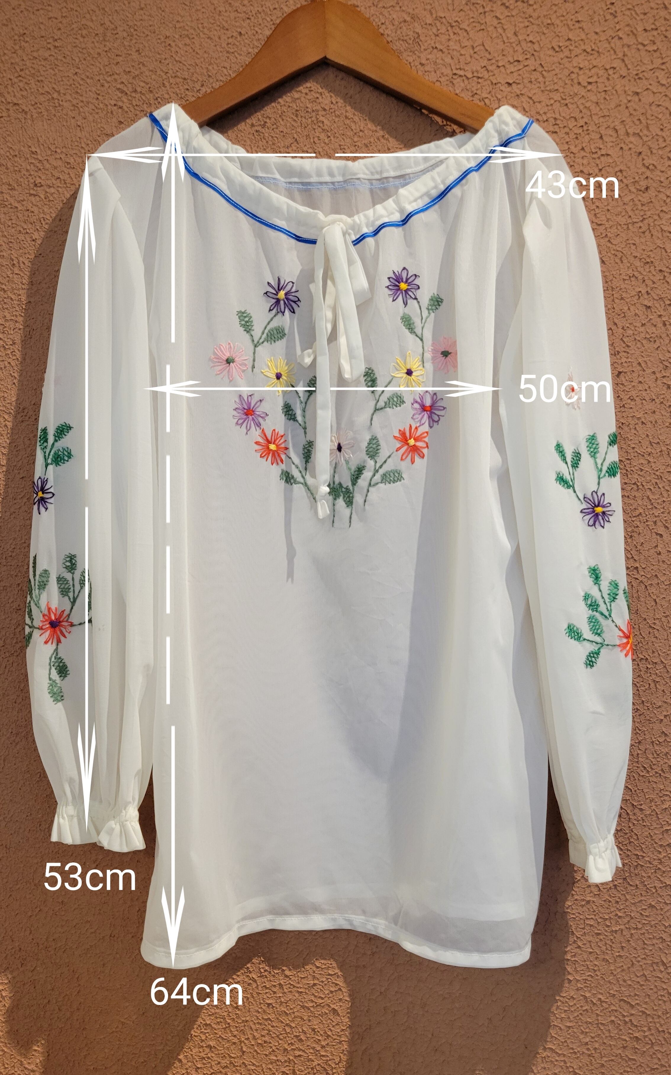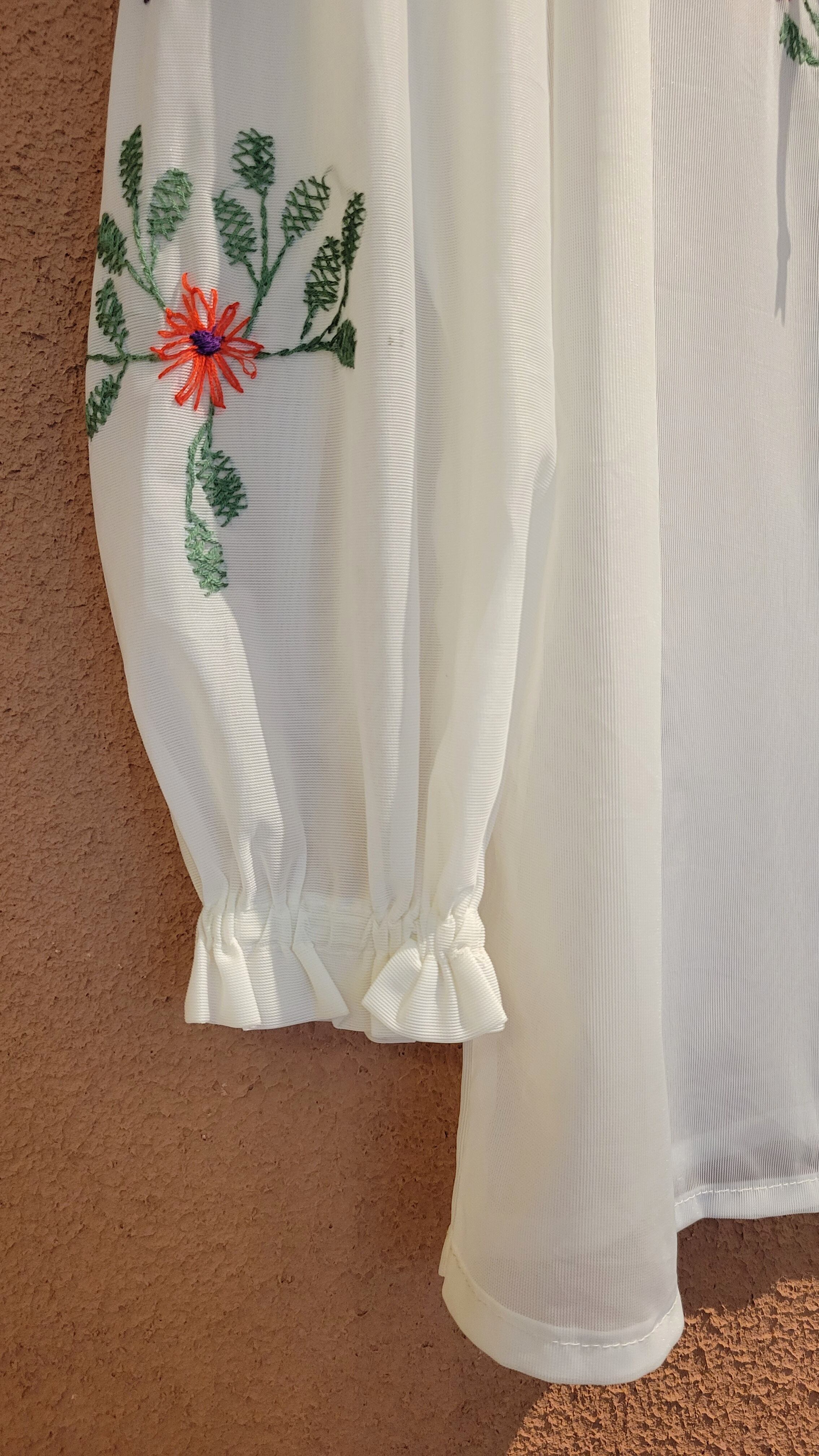 ヴィンテージの手刺繍入りプルオーバートップス。素材表記はありませんがポリエステルのようです。透け感があります。このタイプのトップスには珍しいシアー素材。デコルテ周りには紐が通っており開き具合をお好みで調節できます。
