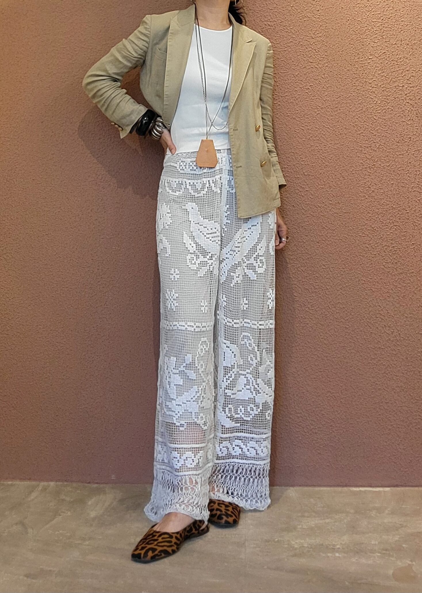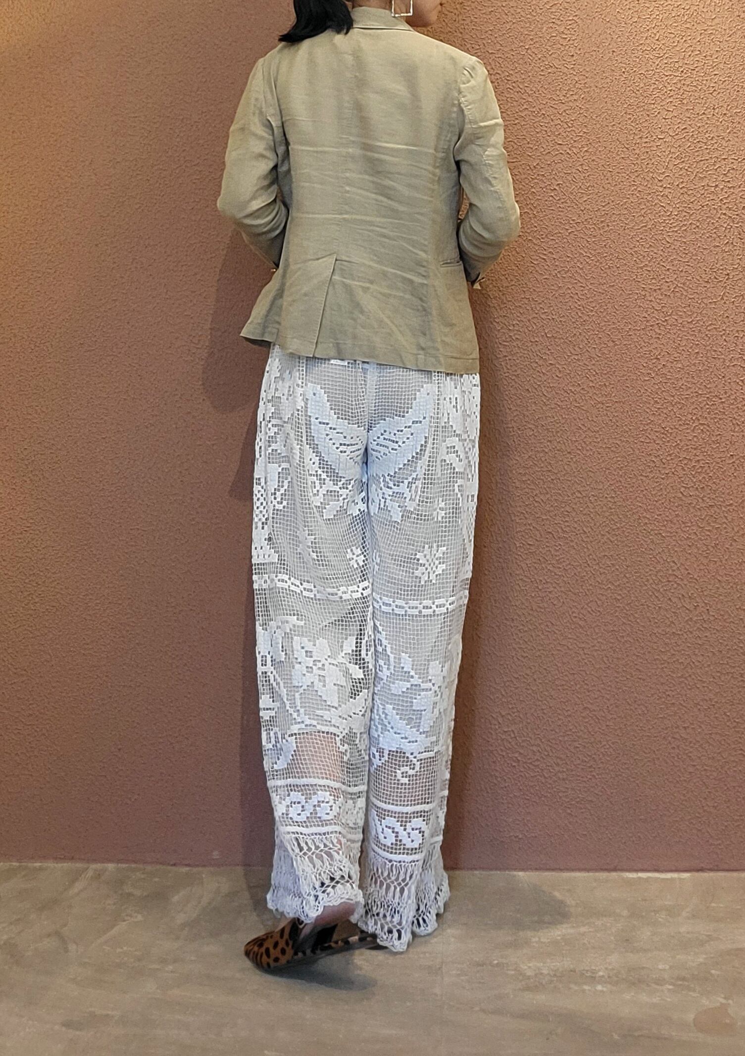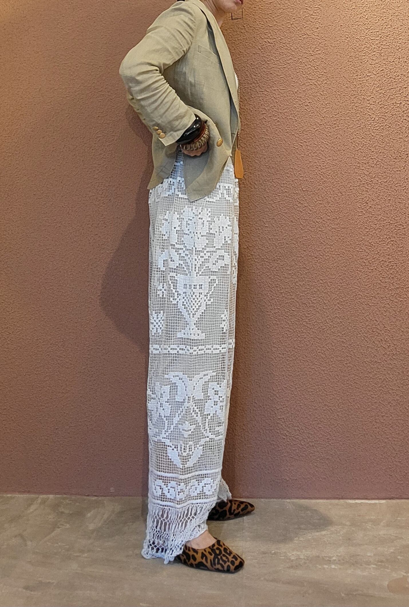 ヴィンテージレースを使用したリメイクイージーパンツ。ウエストゴムです。裏地は付いていません(着用画像ではペチコートパンツを着用)。繊細な総レースの美しい柄が魅力です。ワンピースやスカートに合わせて裾からレースを覗かせるのも素敵です。