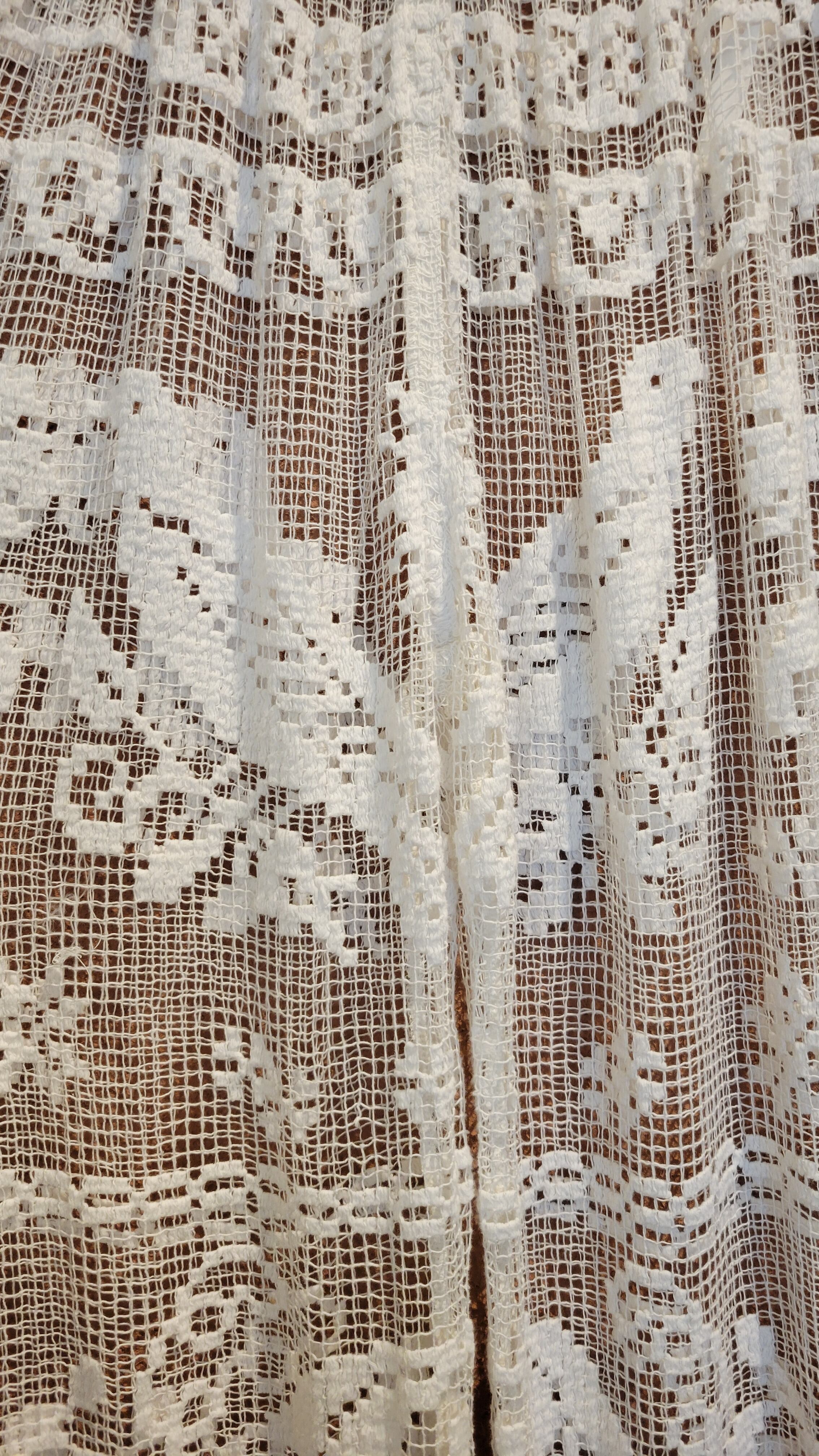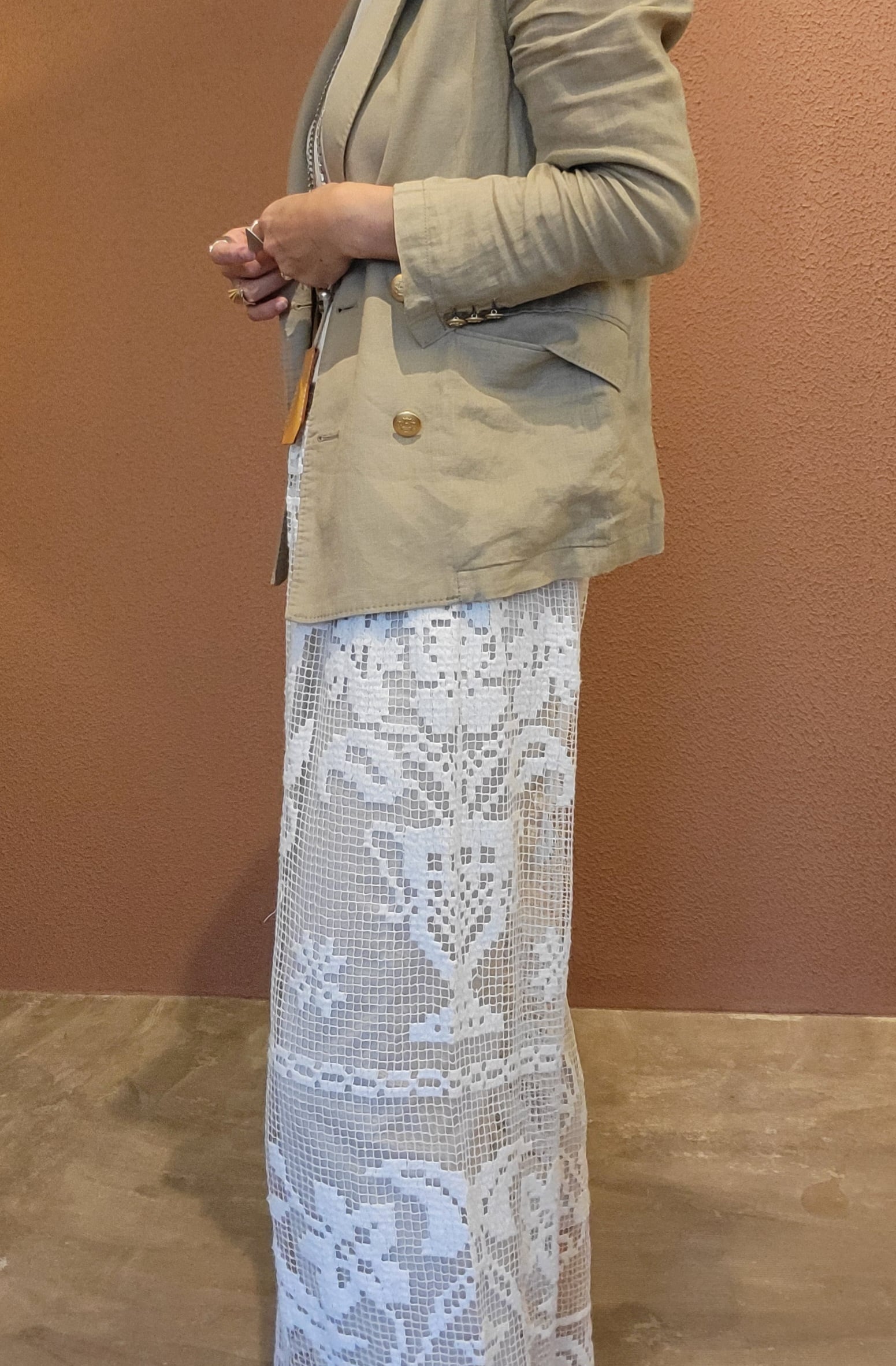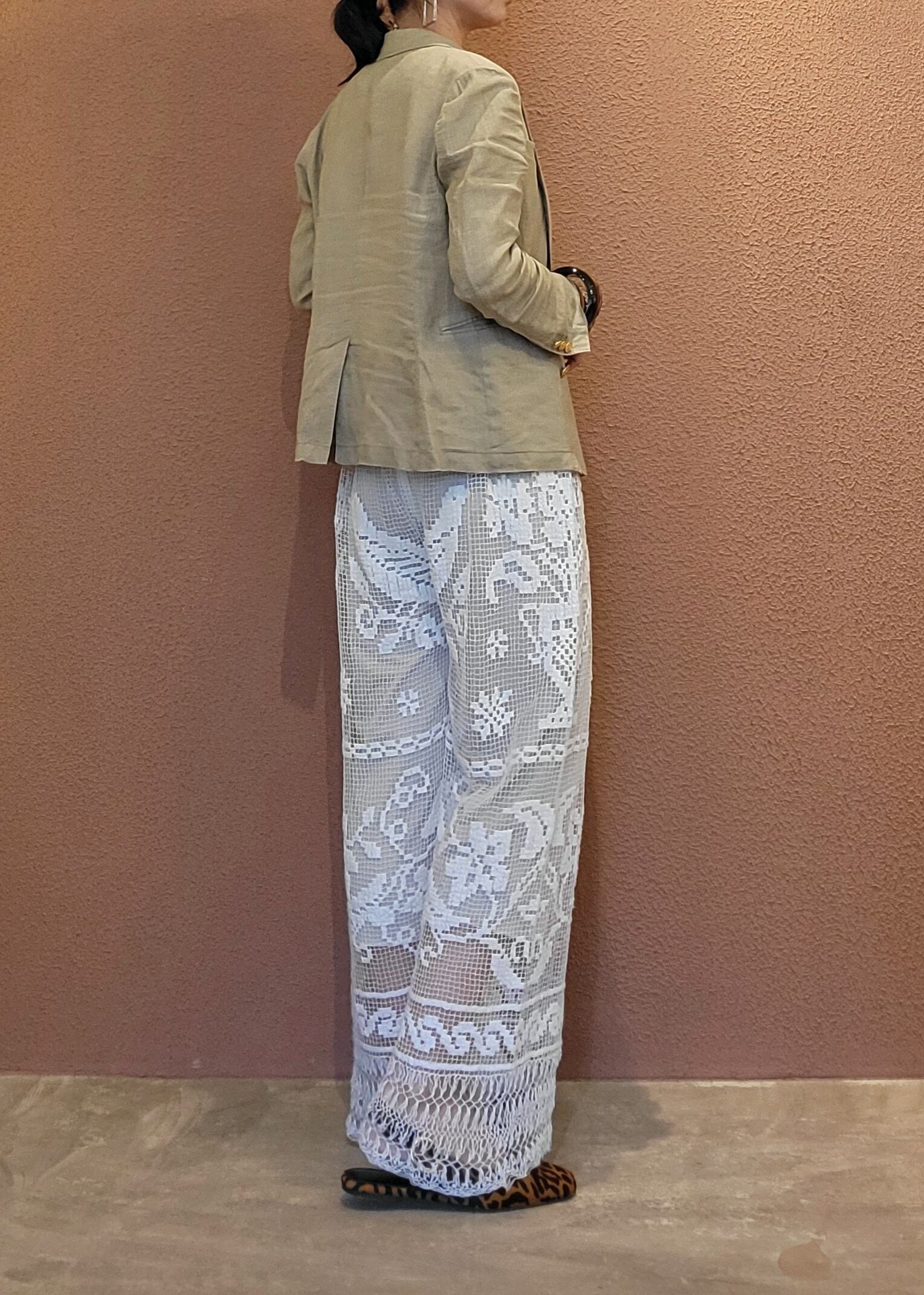 ヴィンテージレースを使用したリメイクイージーパンツ。ウエストゴムです。裏地は付いていません(着用画像ではペチコートパンツを着用)。繊細な総レースの美しい柄が魅力です。ワンピースやスカートに合わせて裾からレースを覗かせるのも素敵です。