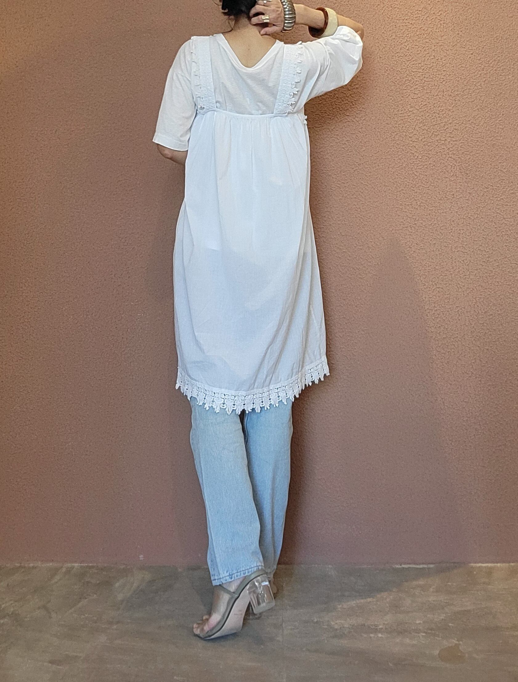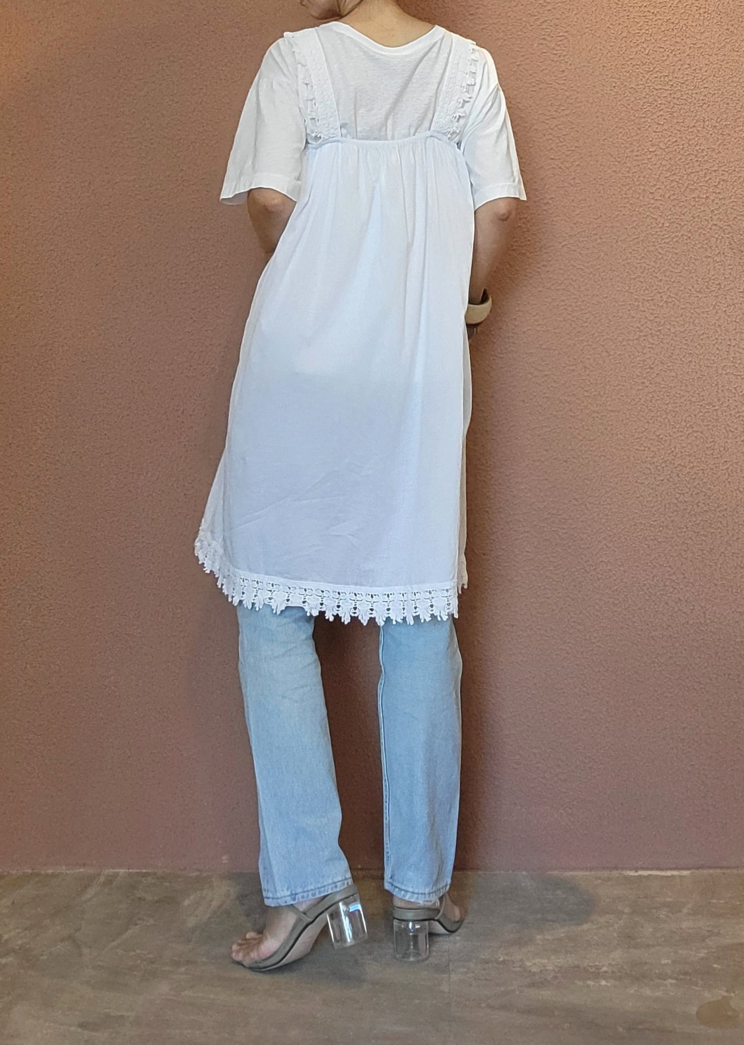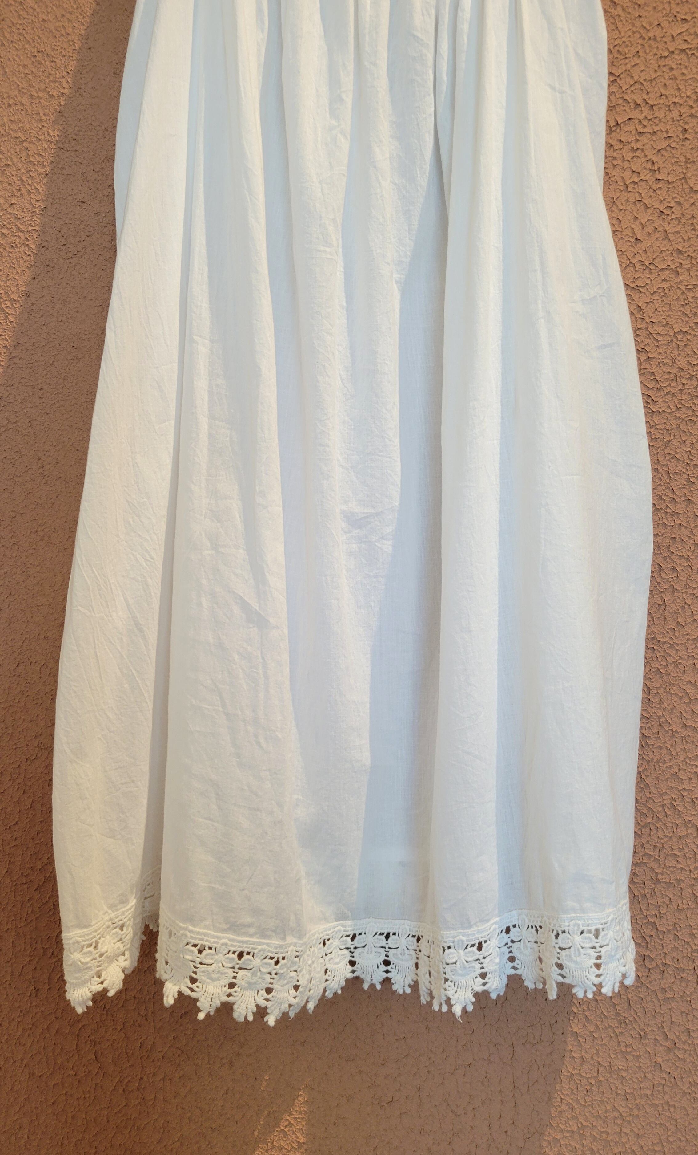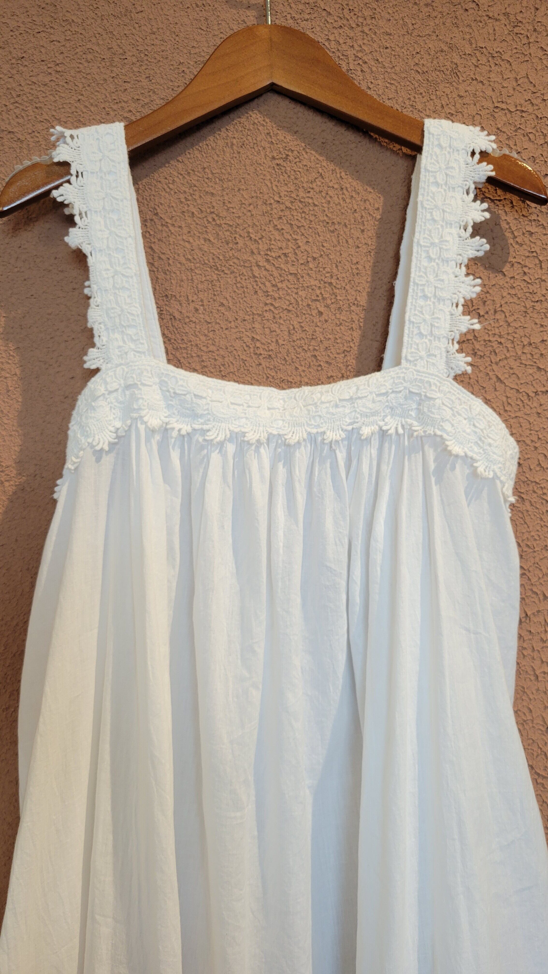 USED ホワイトコットンワンピース。身幅周り後ろにのみゴムが入っており、胸元のフィット感に優れます。さらりとしたコットン素材で夏場も涼しく着られます。Tシャツ&デニムにプラスワンアイテムとしてもおすすめです。