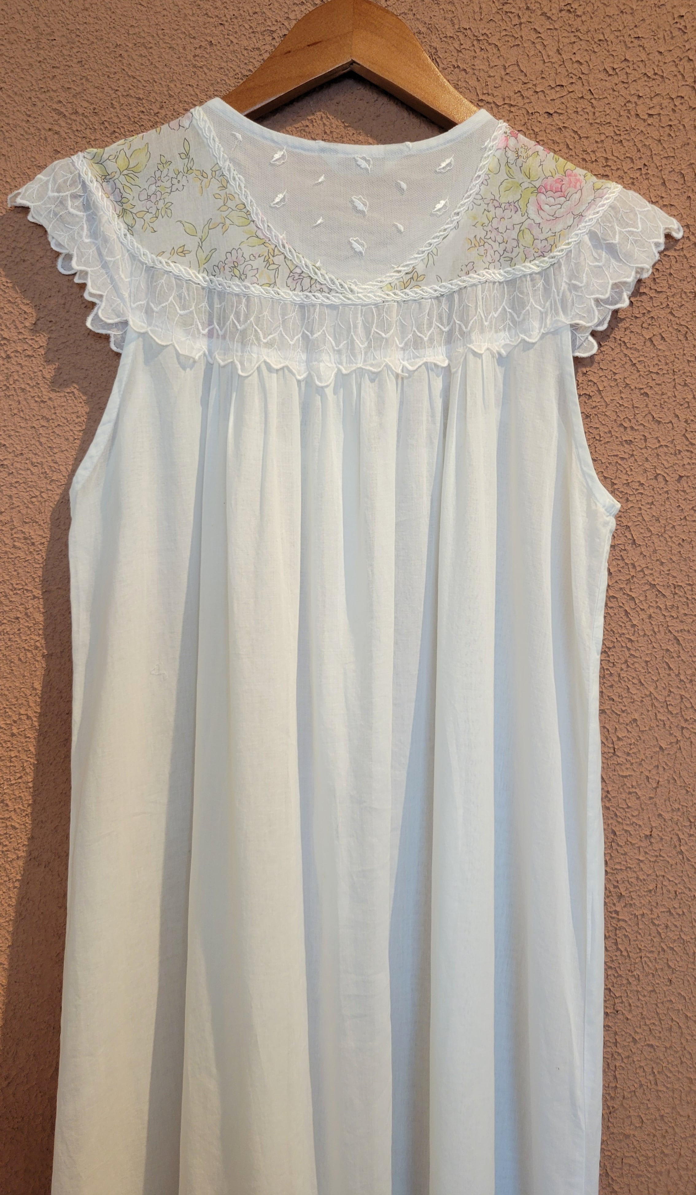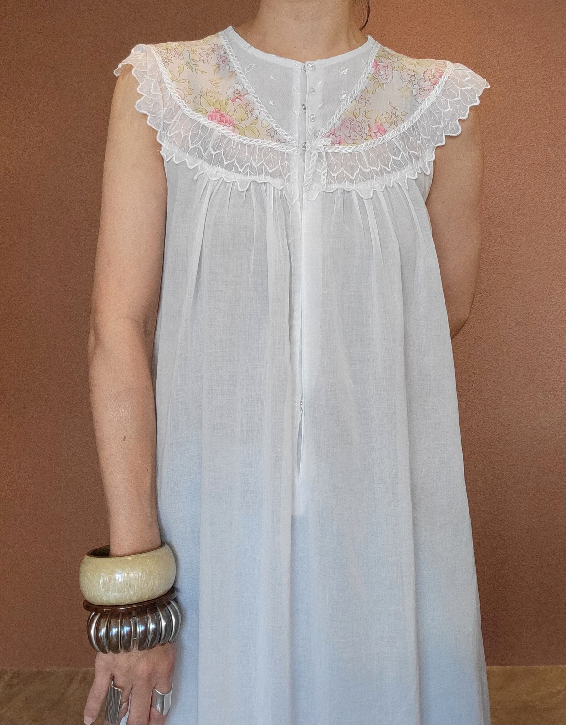 ヴィンテージのラウンジドレス。素材表記はありませんが薄手のコットンのようです。透け感があります。デコルテ周りのプリント生地とレースデザインがお顔周りを華やかに見せてくれます。軽くて涼しい素材感、締め付け感の無いストレスフリーなシルエットはお部屋でのくつろぎ用にもぴったりです。