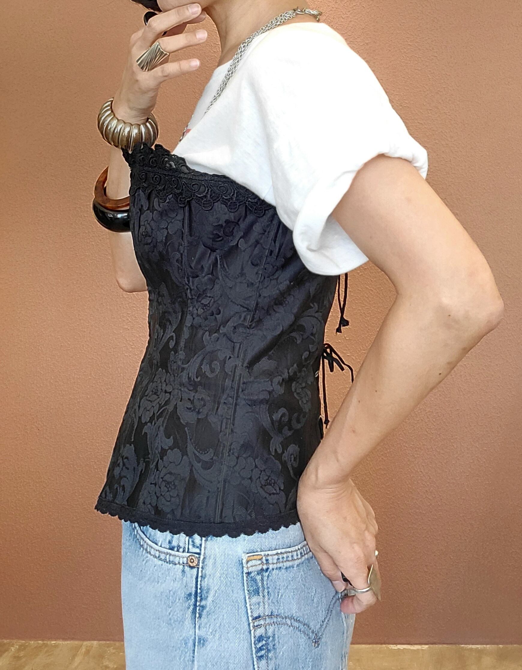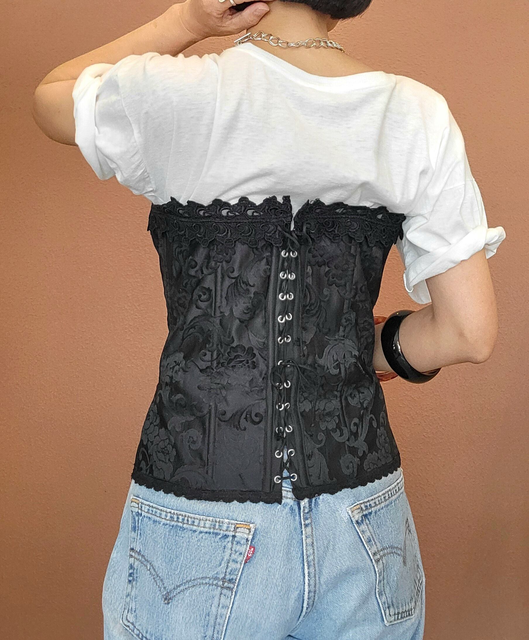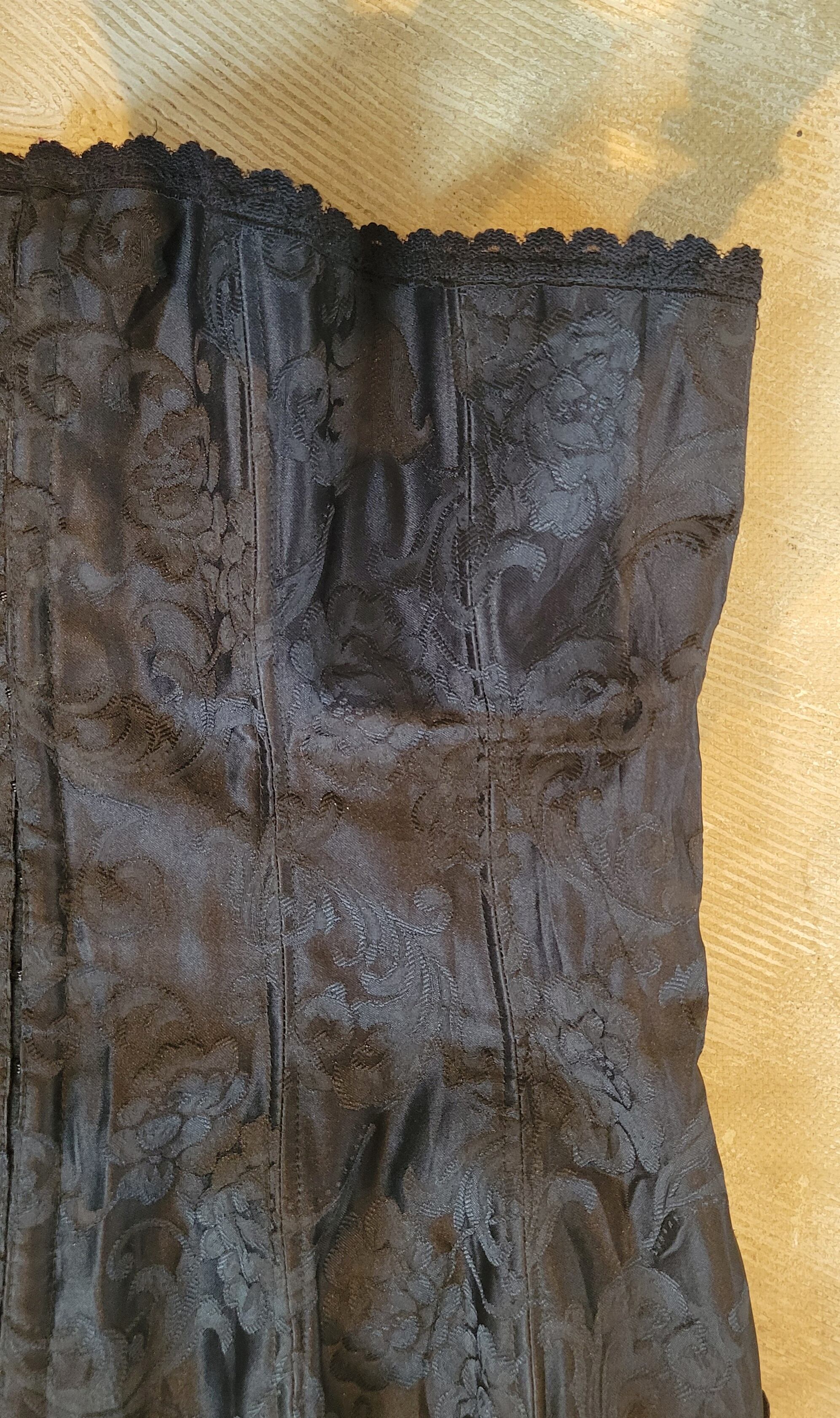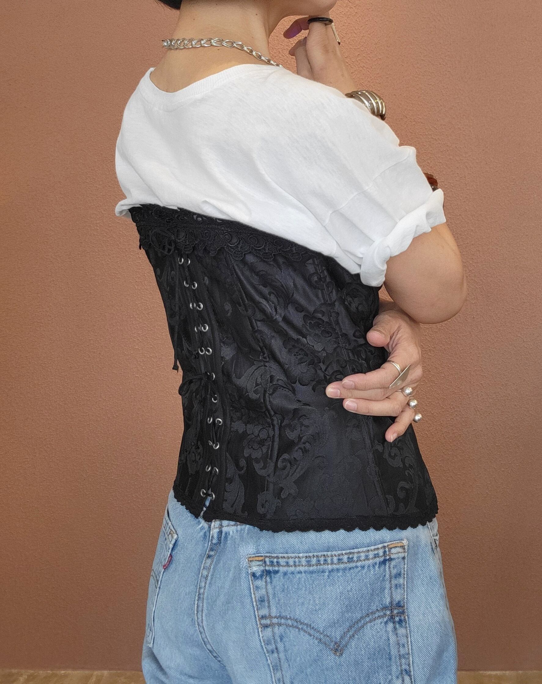 Used ワイヤー入りコルセット。美しいサテンのジャガード生地でフロントに15個のホックが付いています。バックはレースアップ仕様でサイズ調整が可能。ワイヤーが体に沿って綺麗なラインをキープ。Tシャツやブラウスにレイヤードしてカジュアルなスタイリングもおすすめです。