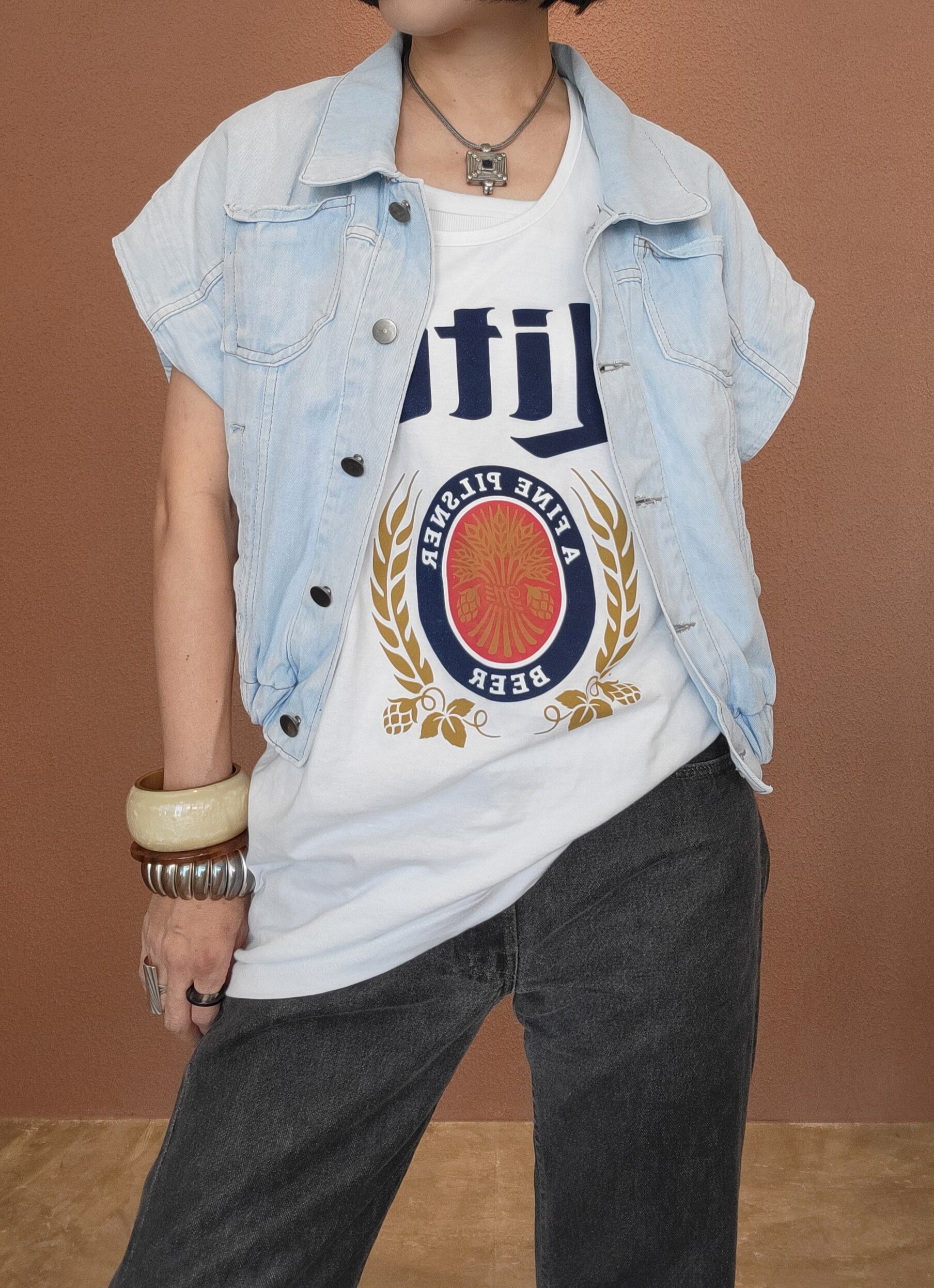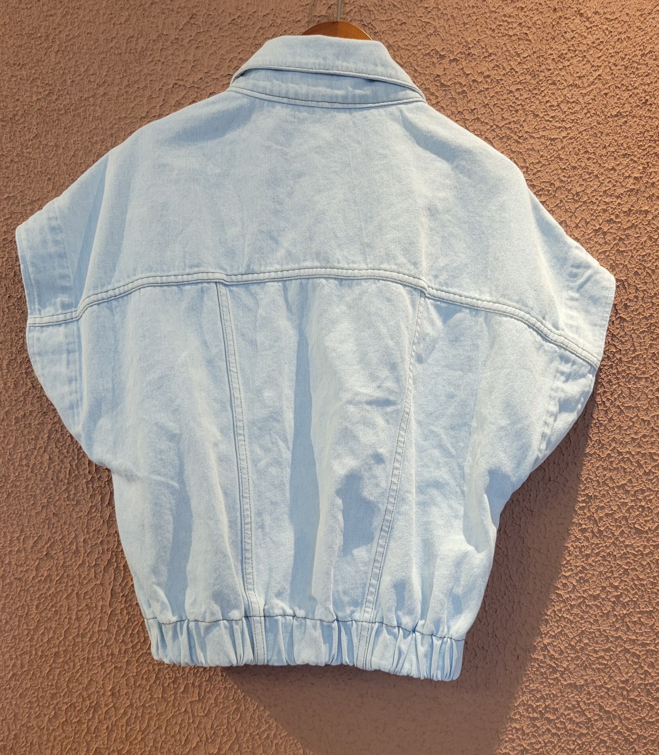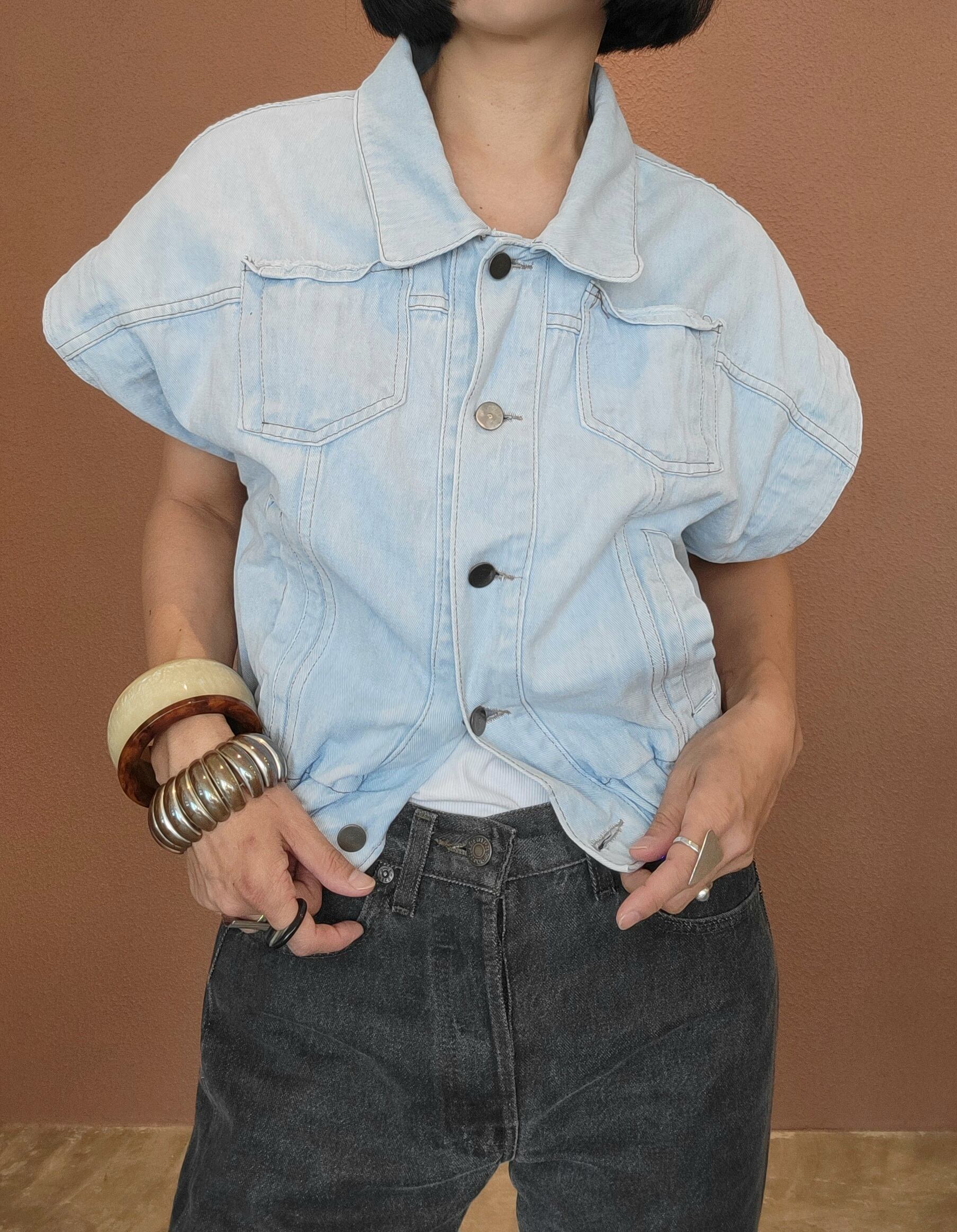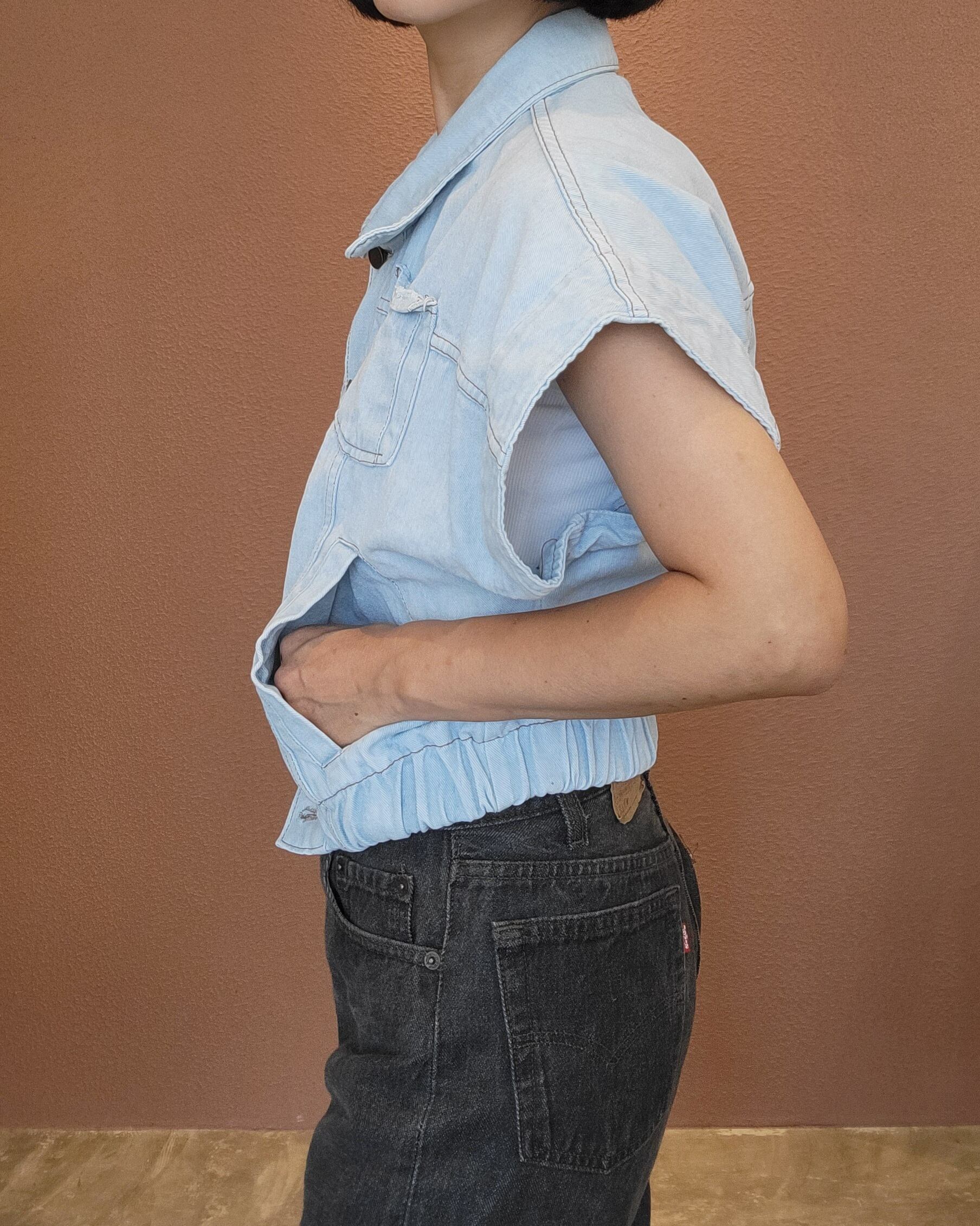 Used デニムベスト/ジャケット。しっかりしたデニムですが固くなくすでに着心地良く馴染んでいます。広めのアームホールとドルマンスリーブ、裾ゴムで着用時のシルエットはこなれた雰囲気に。ボタンを外せばベスト風に、留めればシャツ風に、スタイリングの幅が広がります。