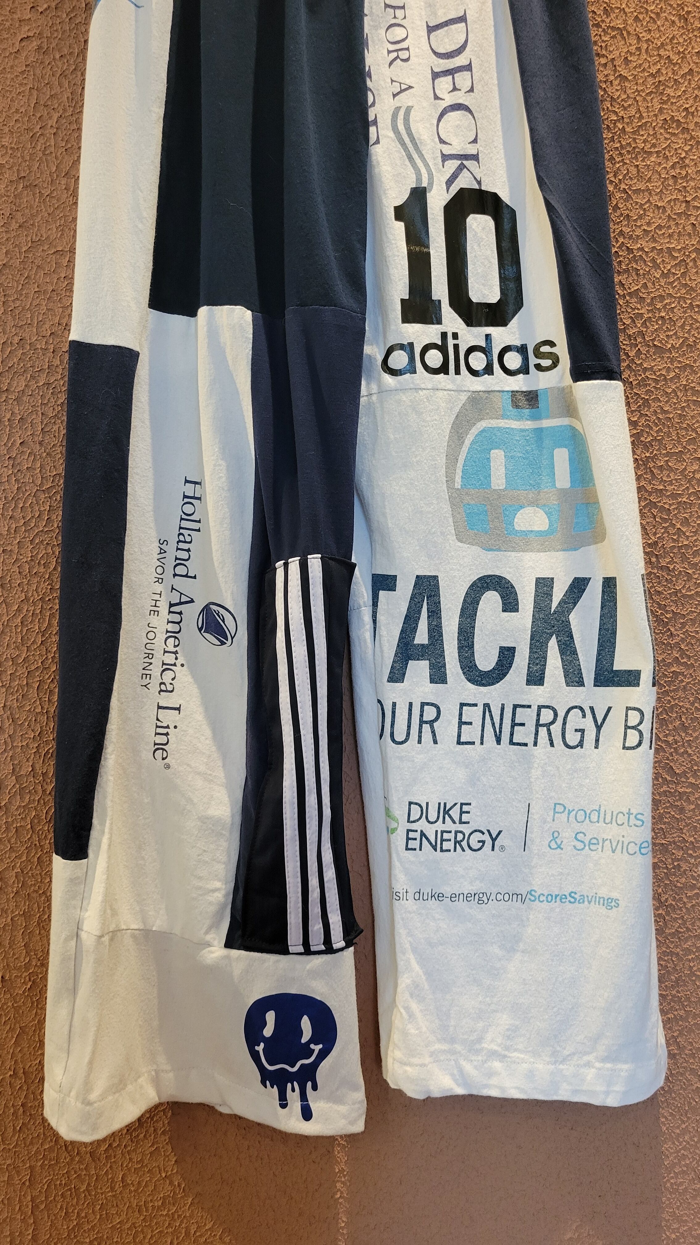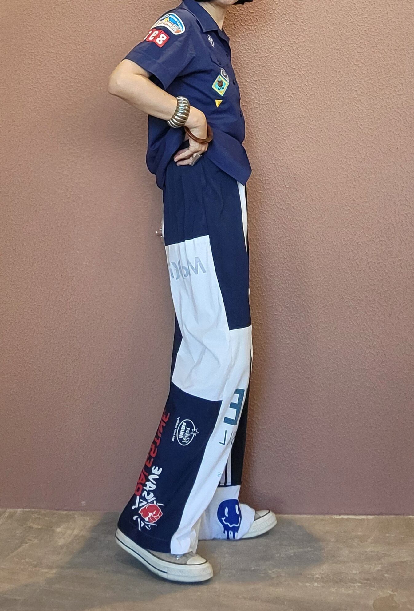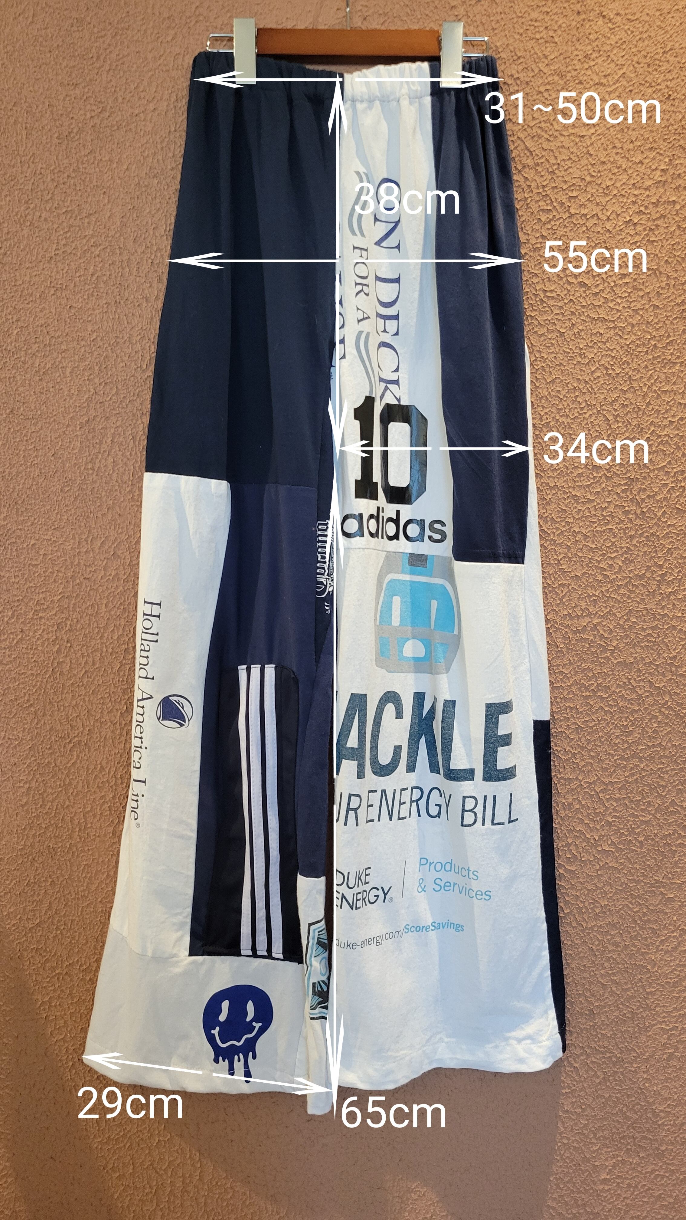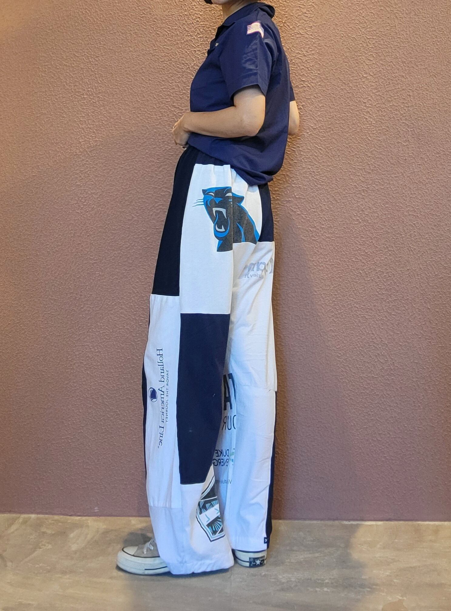 古着のTシャツを裁断したパーツを繋ぎ合わせたリメイクイージーパンツ。ウエストゴム、ポケット無しです。くたっと柔らかいコットン素材でリラクシングな着心地です。*右後ろふくらはぎ辺りに小さな白い点(色抜け)が数ヶ所あります。画像でご確認ください。