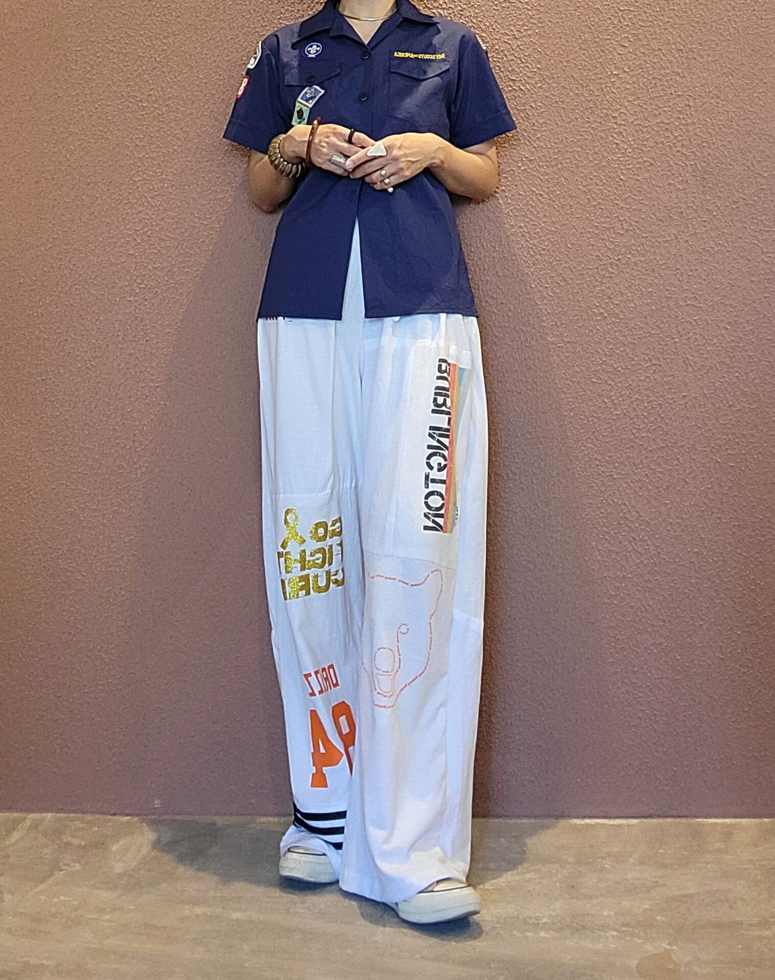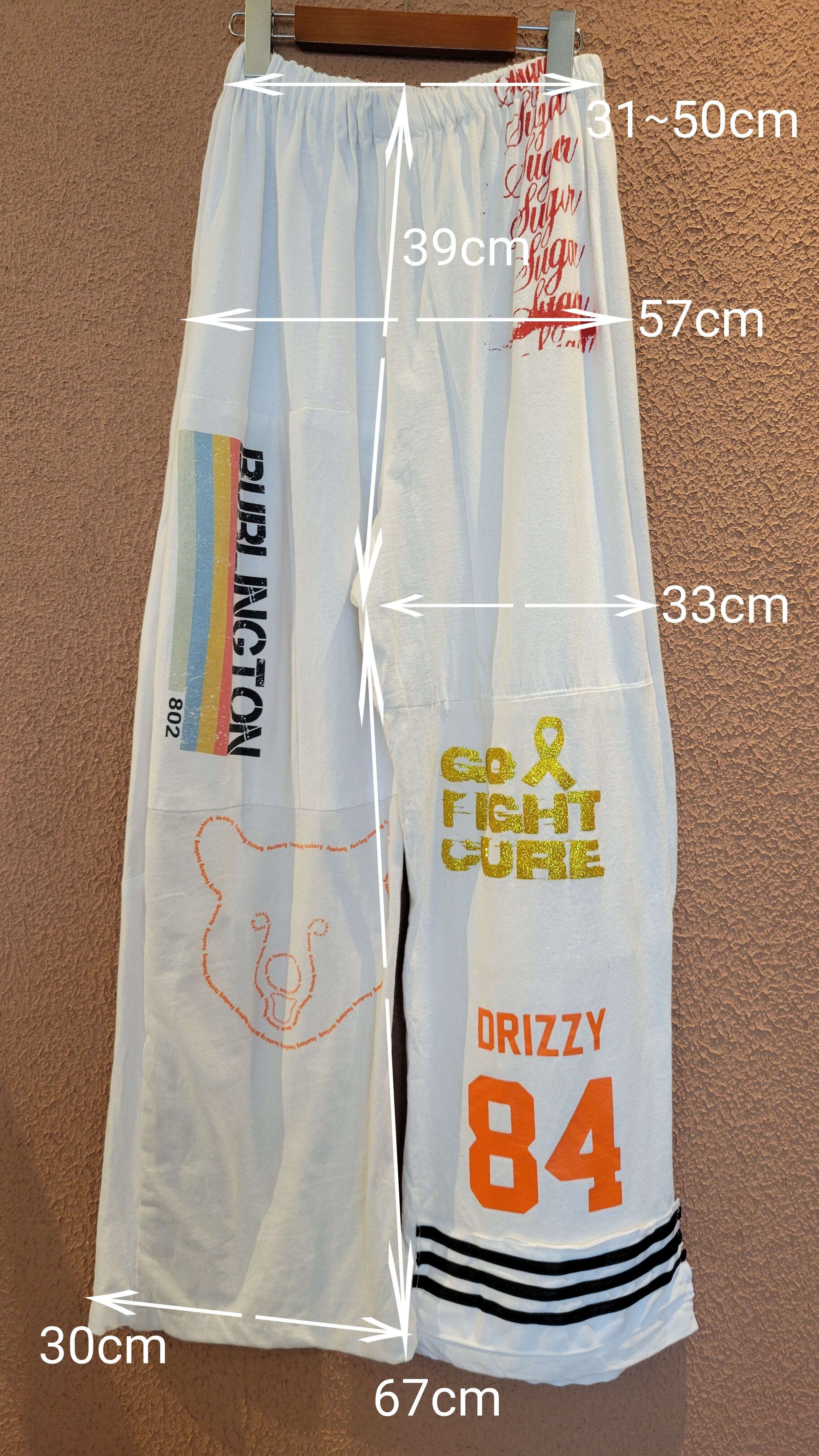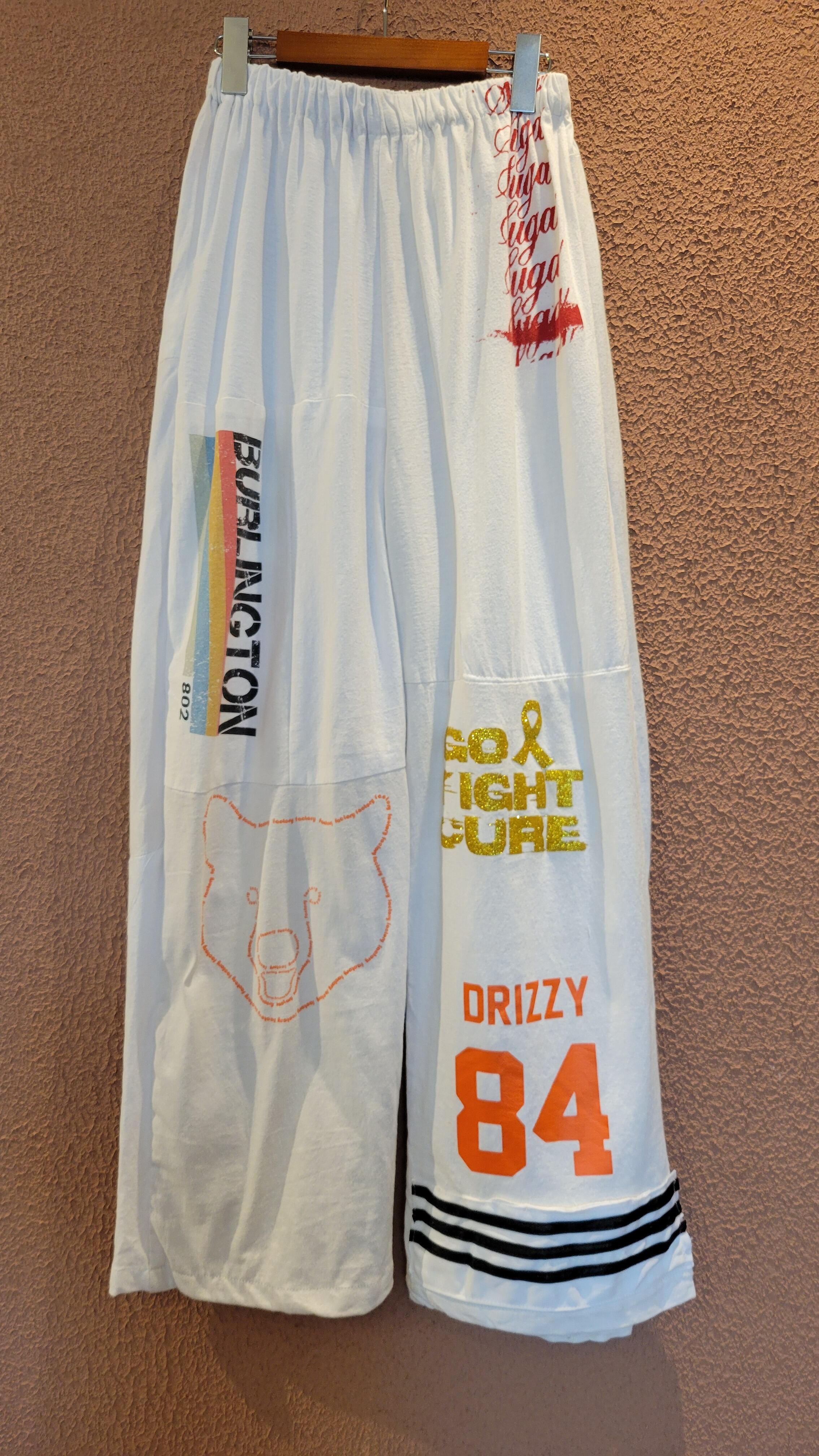 古着のTシャツを裁断したパーツを繋ぎ合わせたリメイクイージーパンツ。ウエストゴム、ポケット無しです。くたっと柔らかいコットン素材でリラクシングな着心地です。