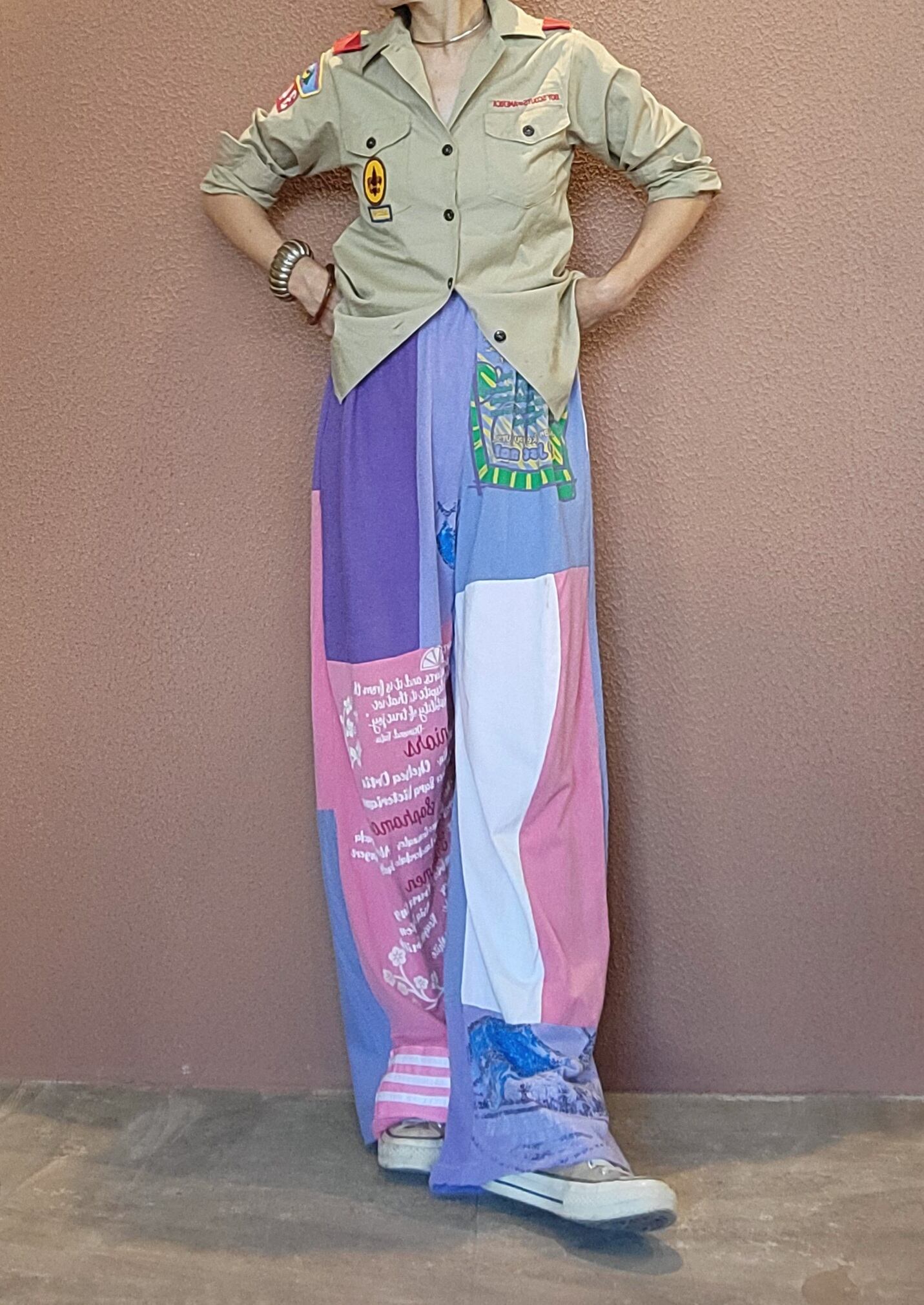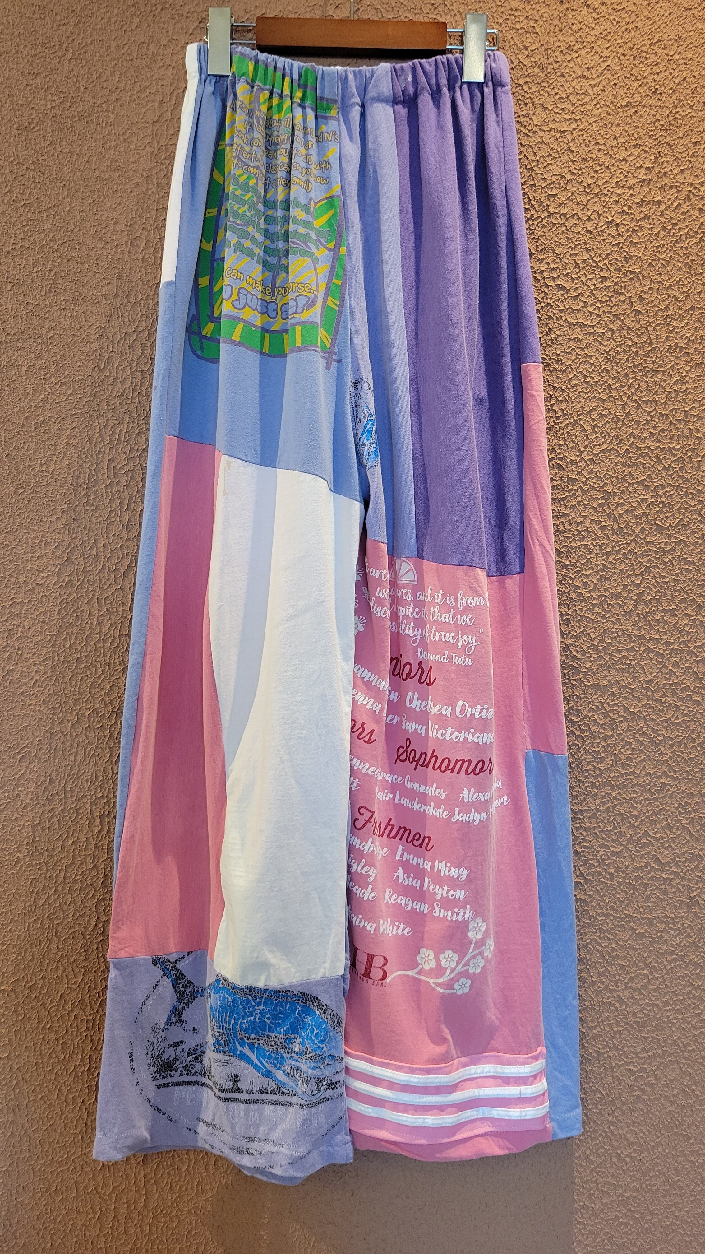 古着のTシャツを裁断したパーツを繋ぎ合わせたリメイクイージーパンツ。ウエストゴム、ポケット無しです。くたっと柔らかいコットン素材でリラクシングな着心地です。*右足後ろひざ裏辺りに生地ダメージがあります。画像でご確認ください。