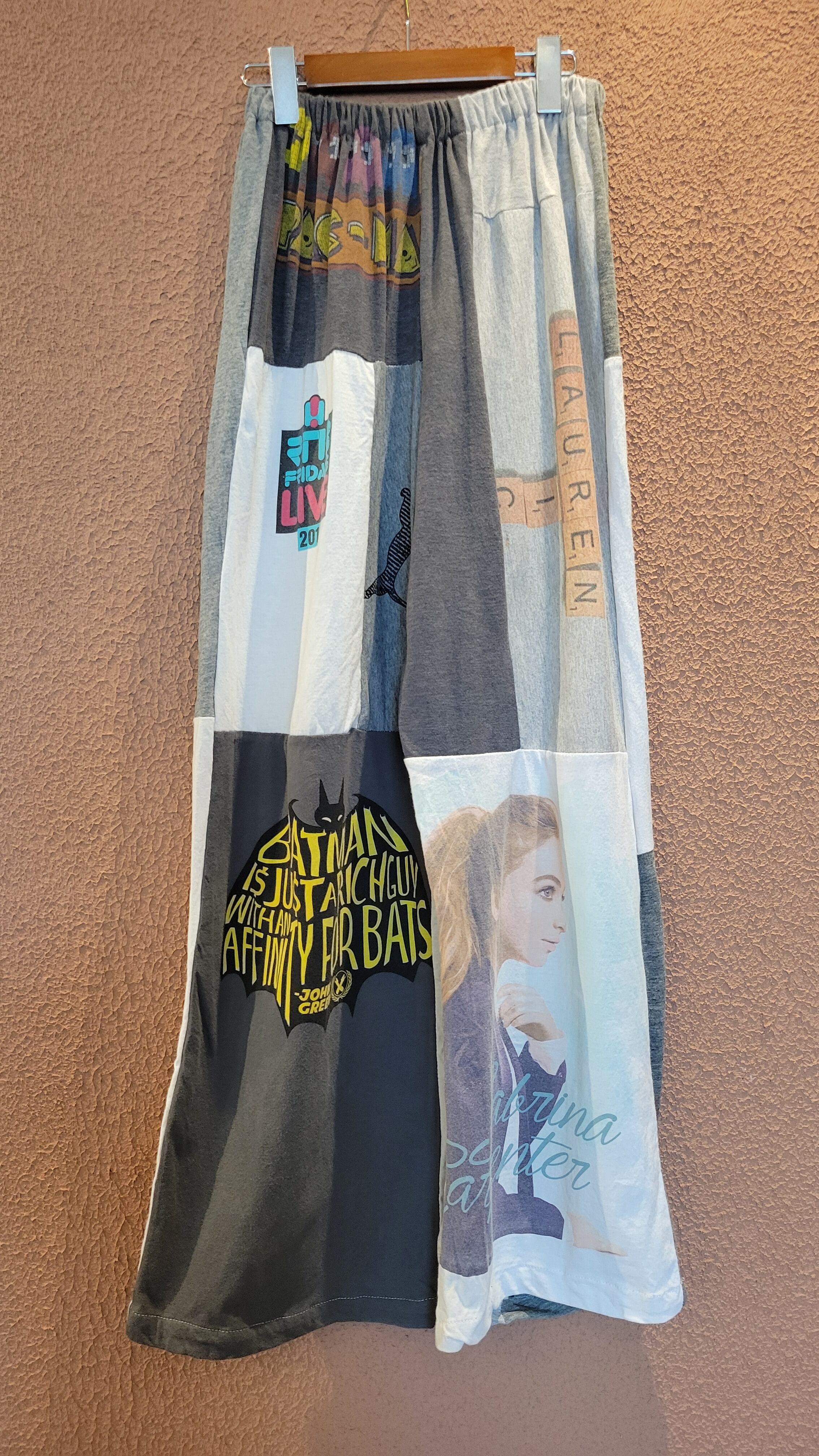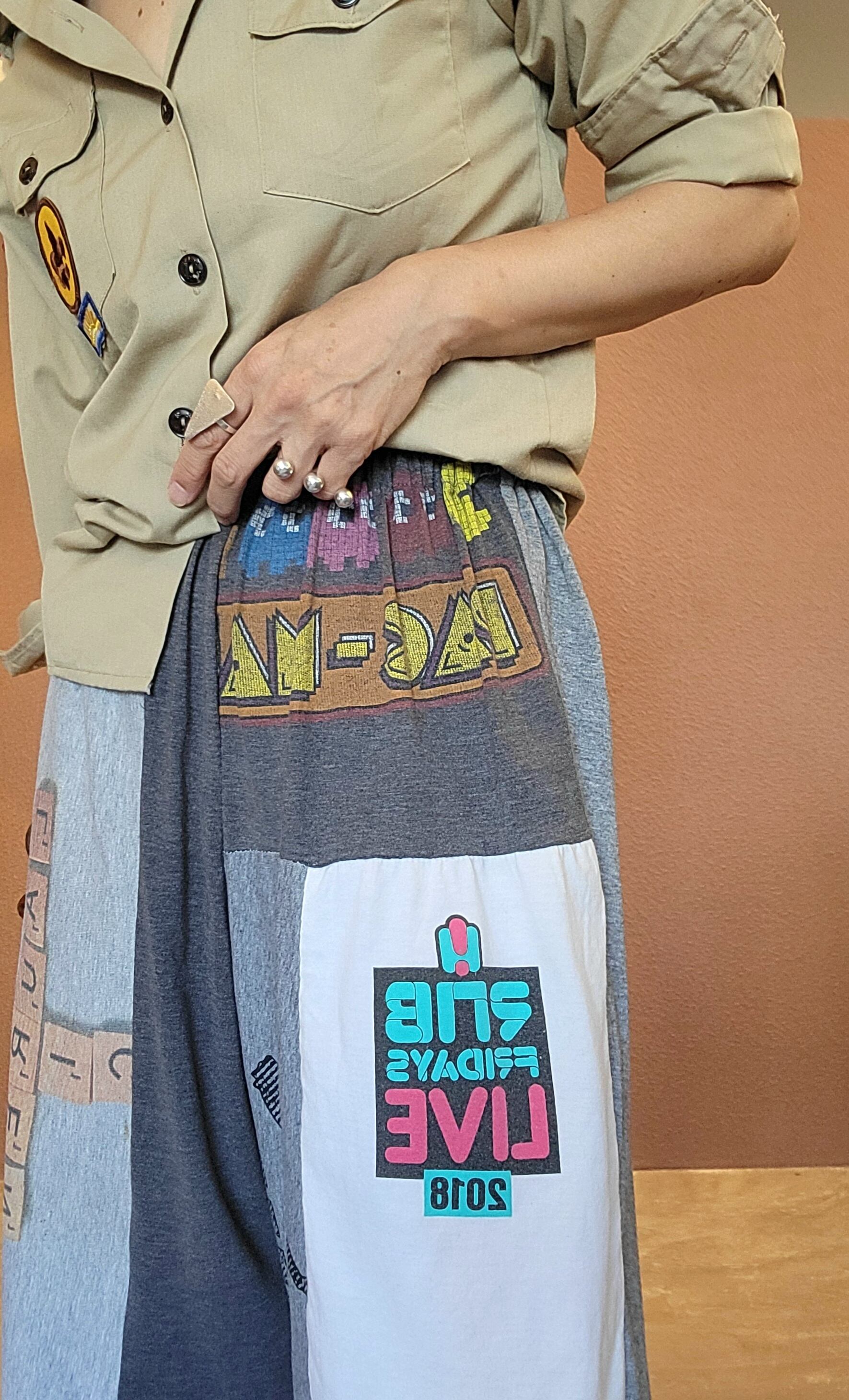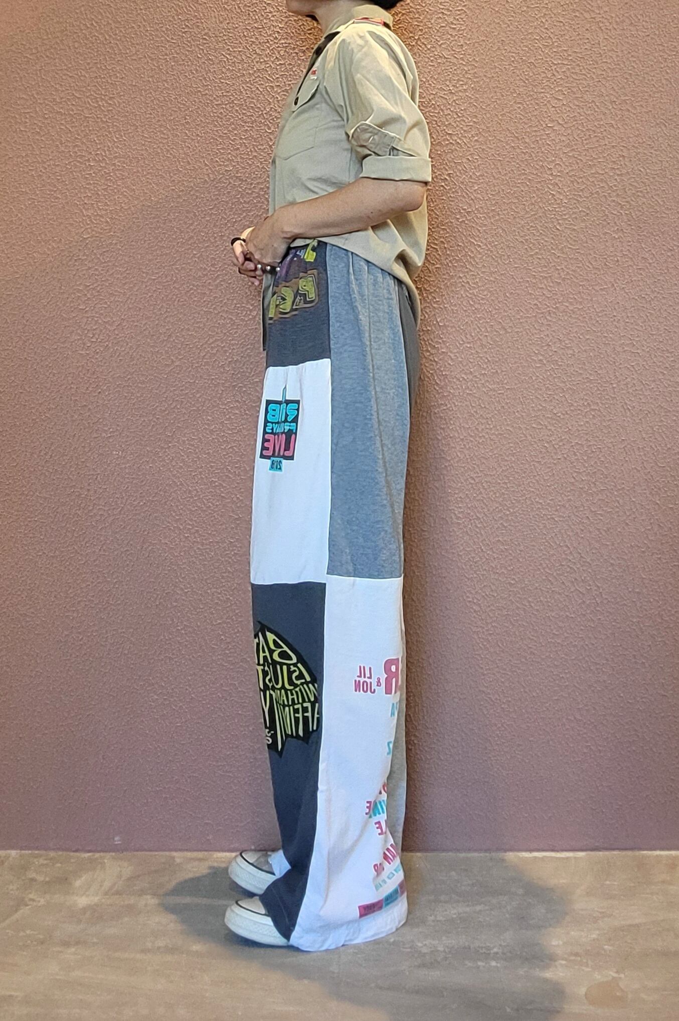 古着のTシャツを裁断したパーツを繋ぎ合わせたリメイクイージーパンツ。ウエストゴム、ポケット無しです。くたっと柔らかいコットン素材でリラクシングな着心地です。