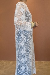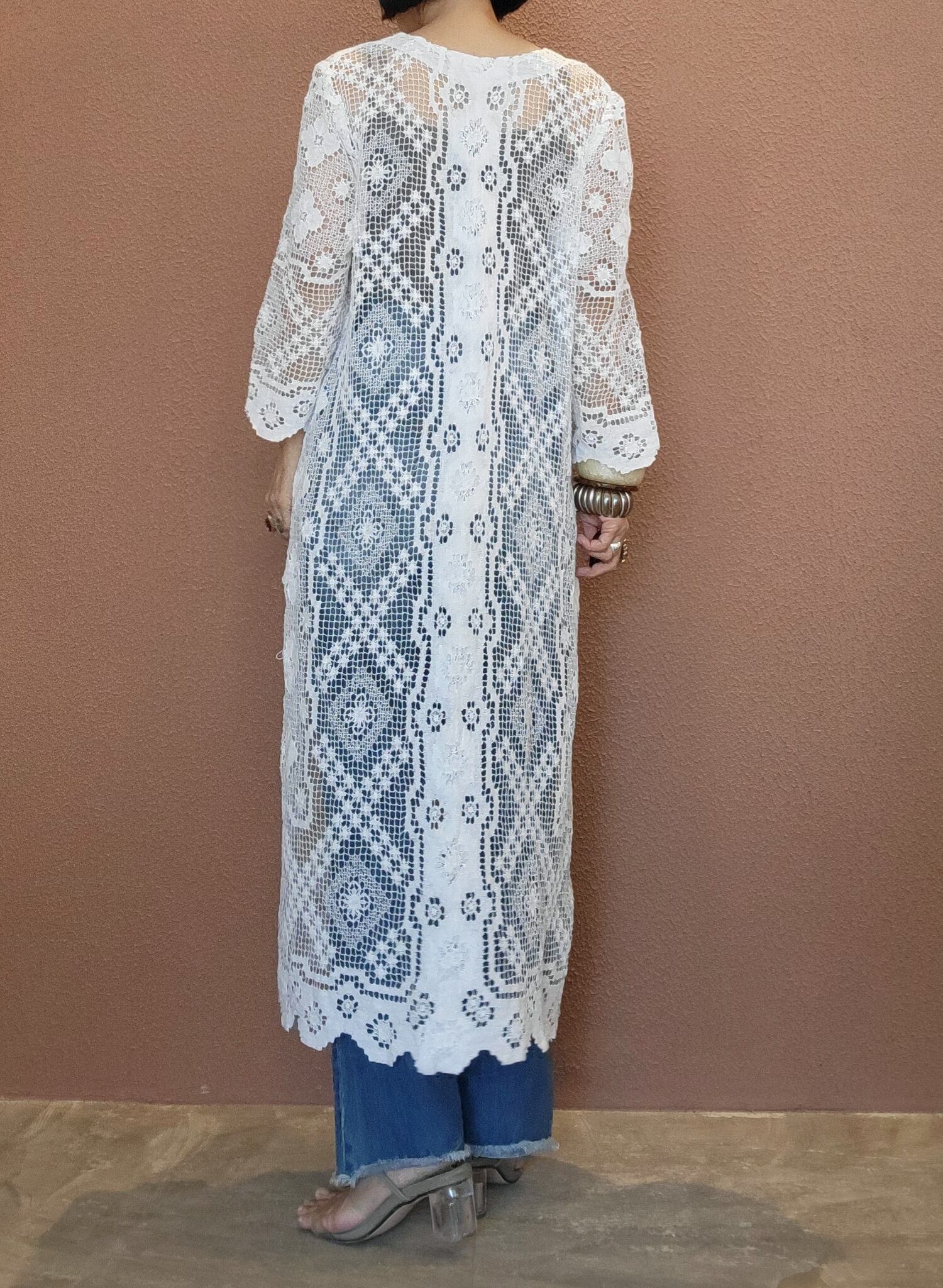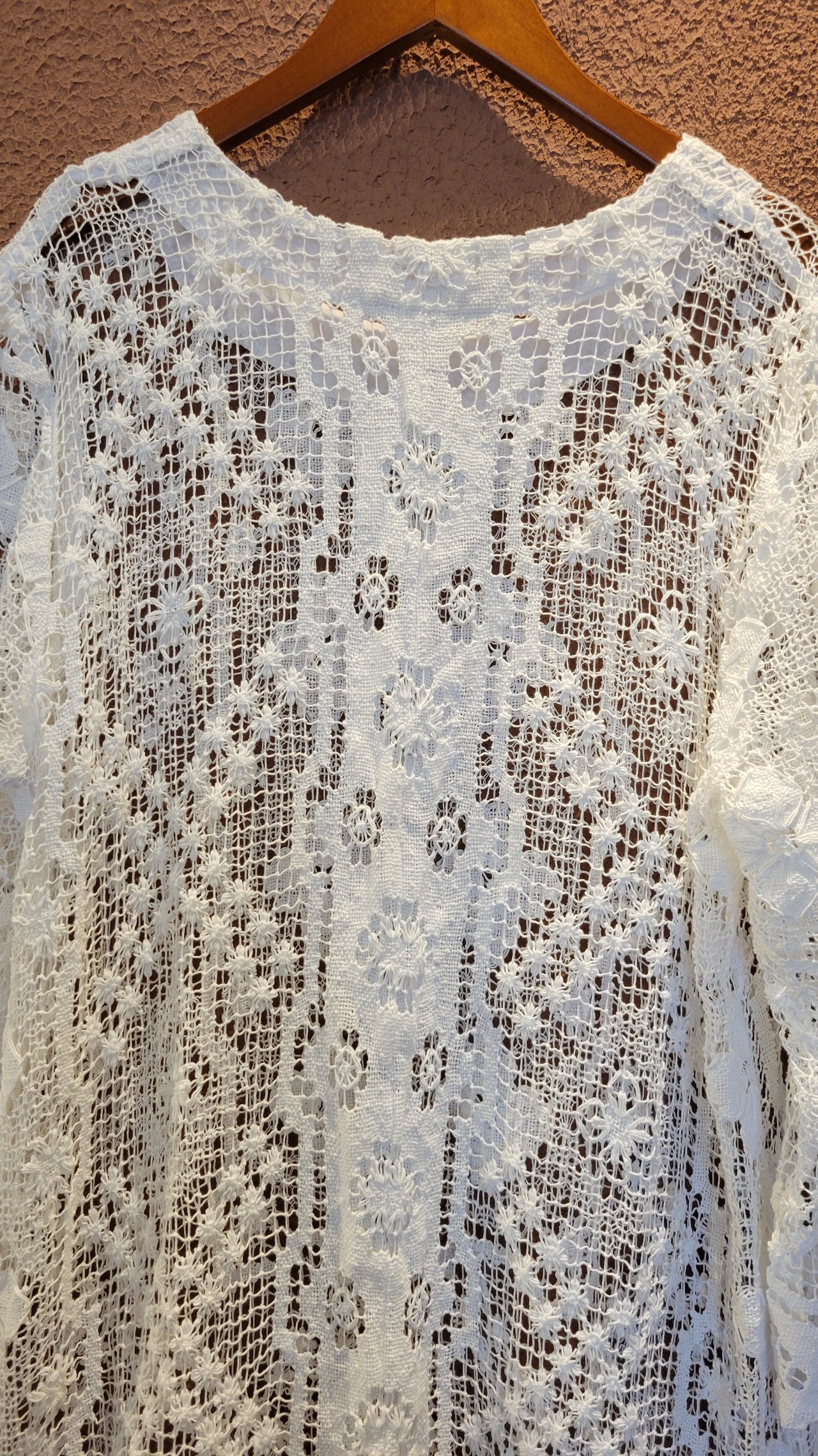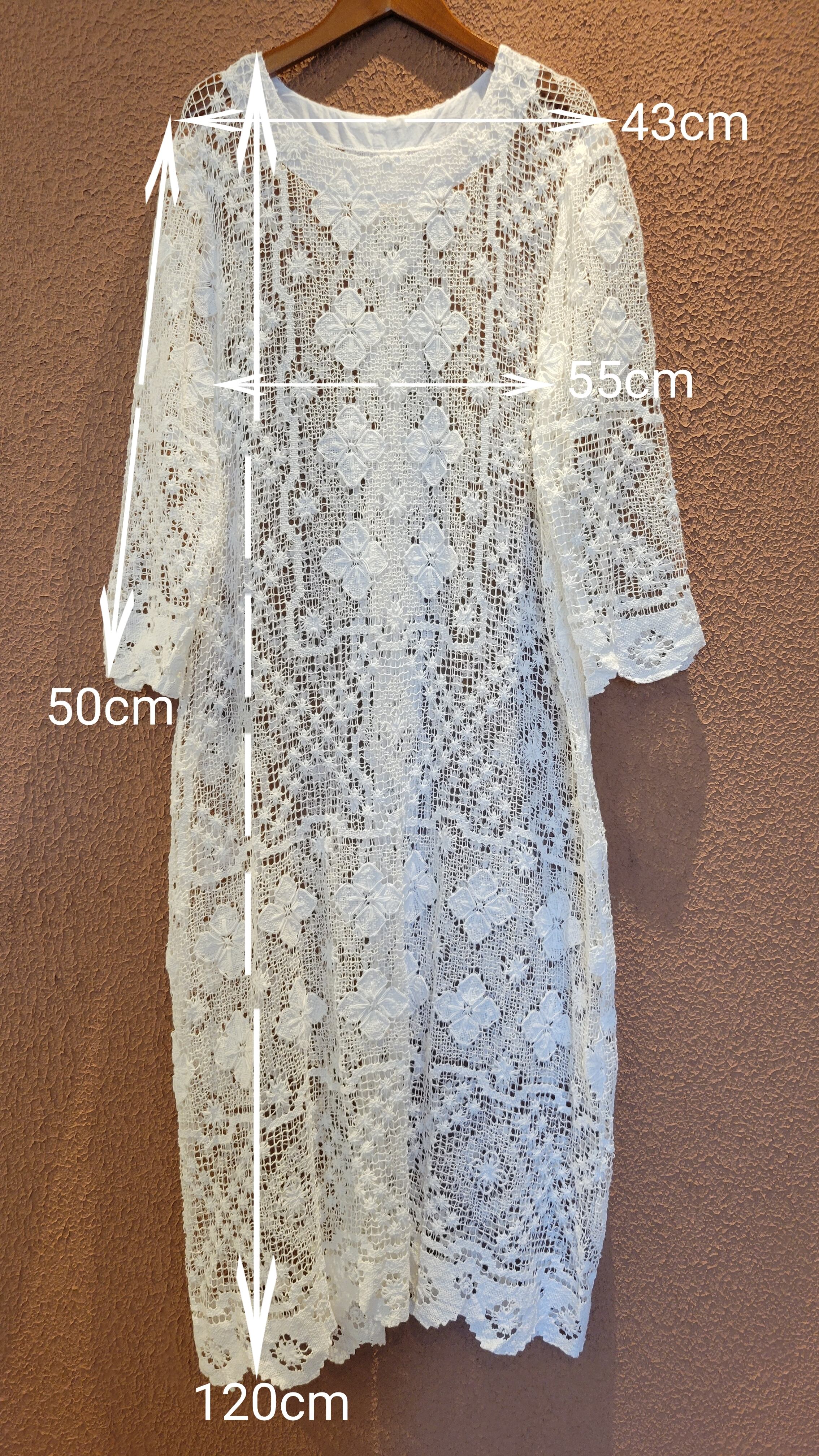 ヴィンテージのコットンレースを使用したリメイクワンピース。裏地は付いていません。袖有りデザインでほどよく肌の露出を押さえつつレースの透け感も楽しめます。レースは涼しく着られるのも嬉しいポイント。インナーに濃いめの色をあわせると繊細なレースの編み模様が美しく際立ちます。Tシャツ&デニムの上に合わせてカジュアルダウンもおすすめです。秋冬にはタートルニットを合わせても素敵です。
