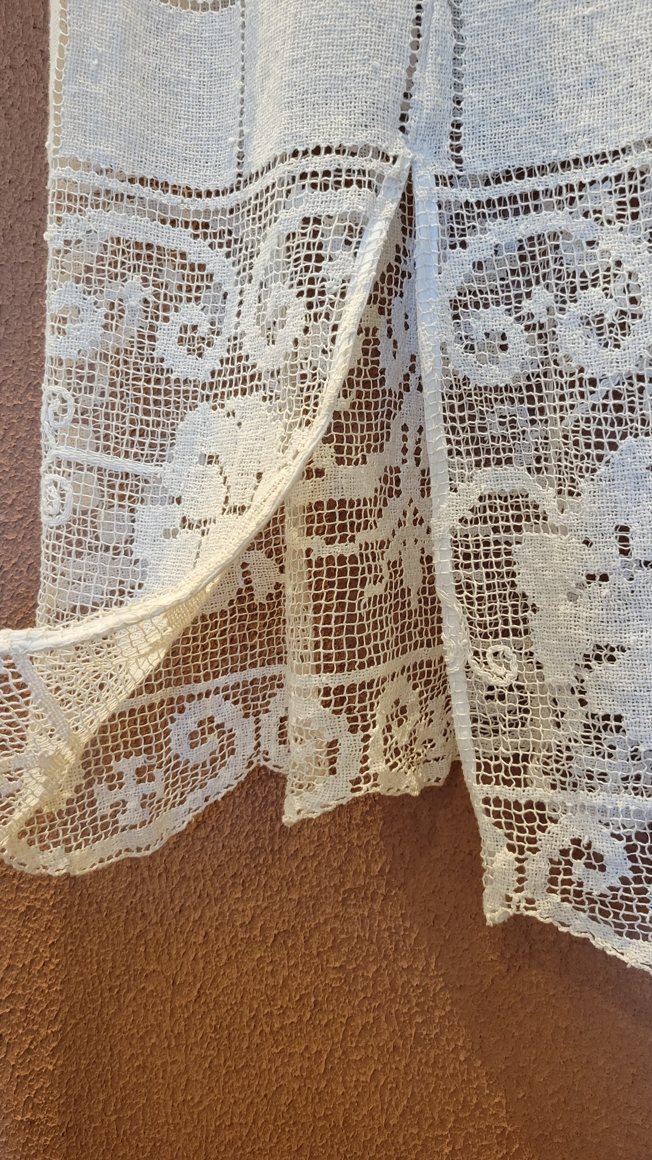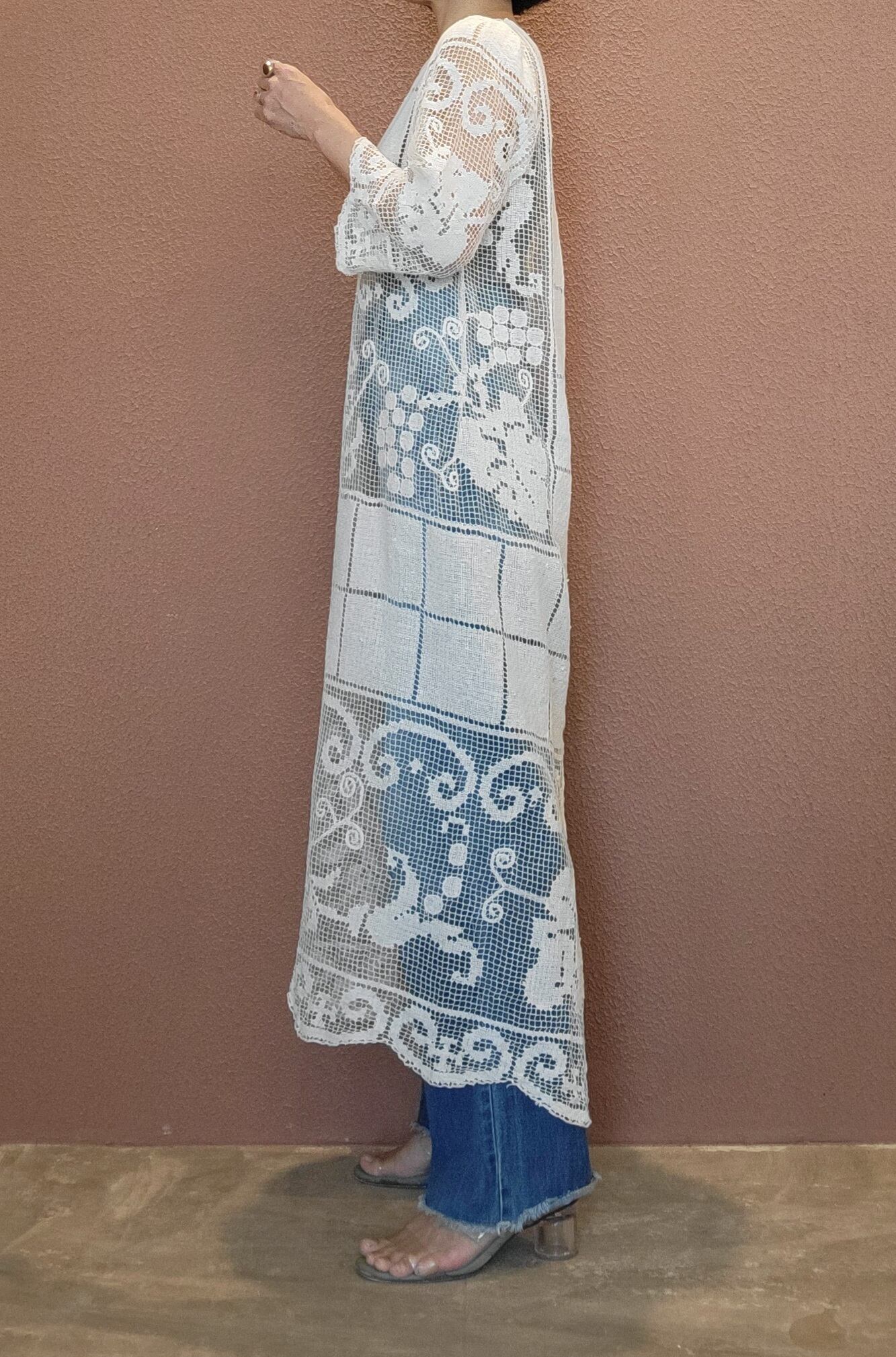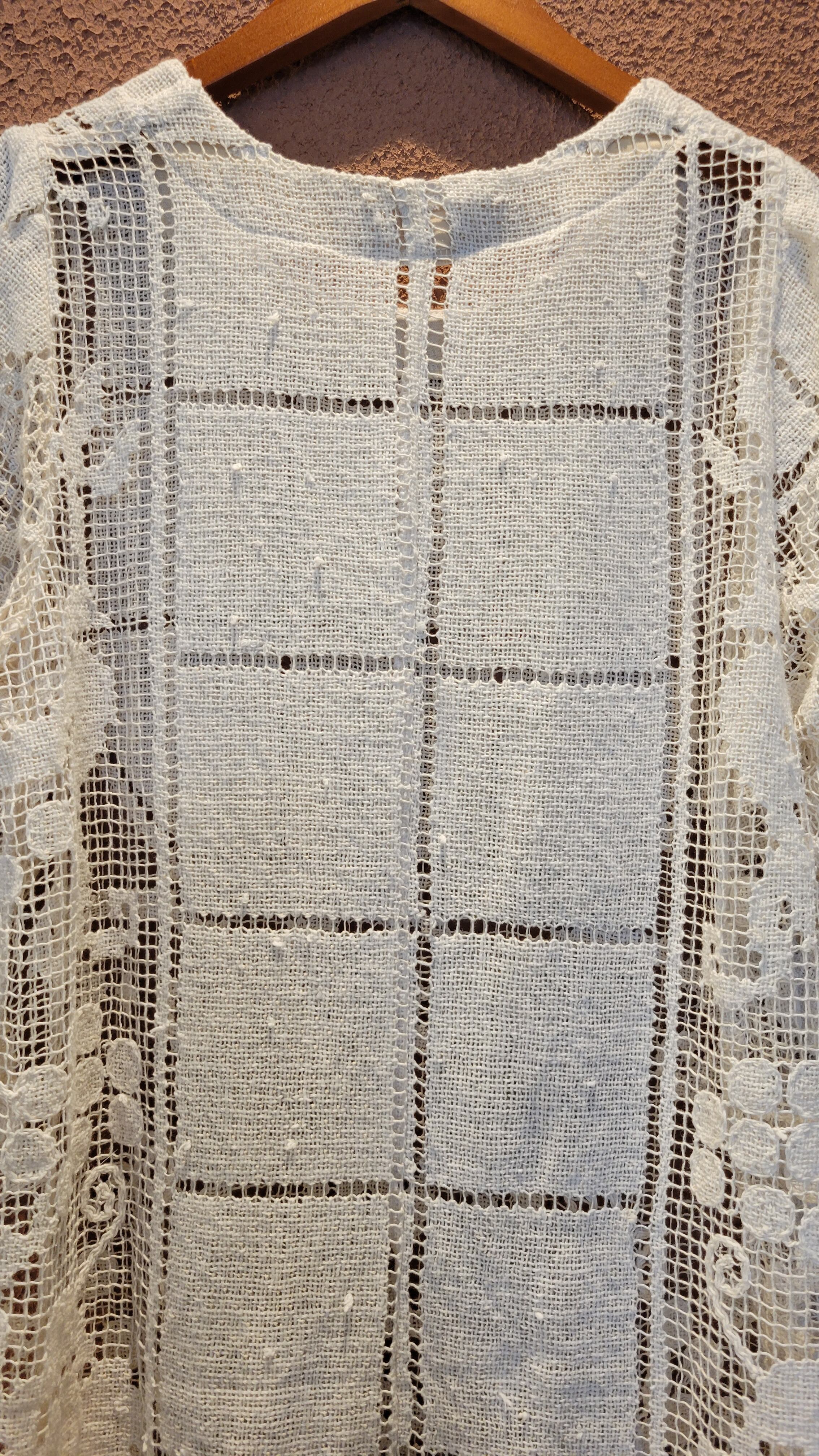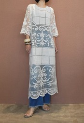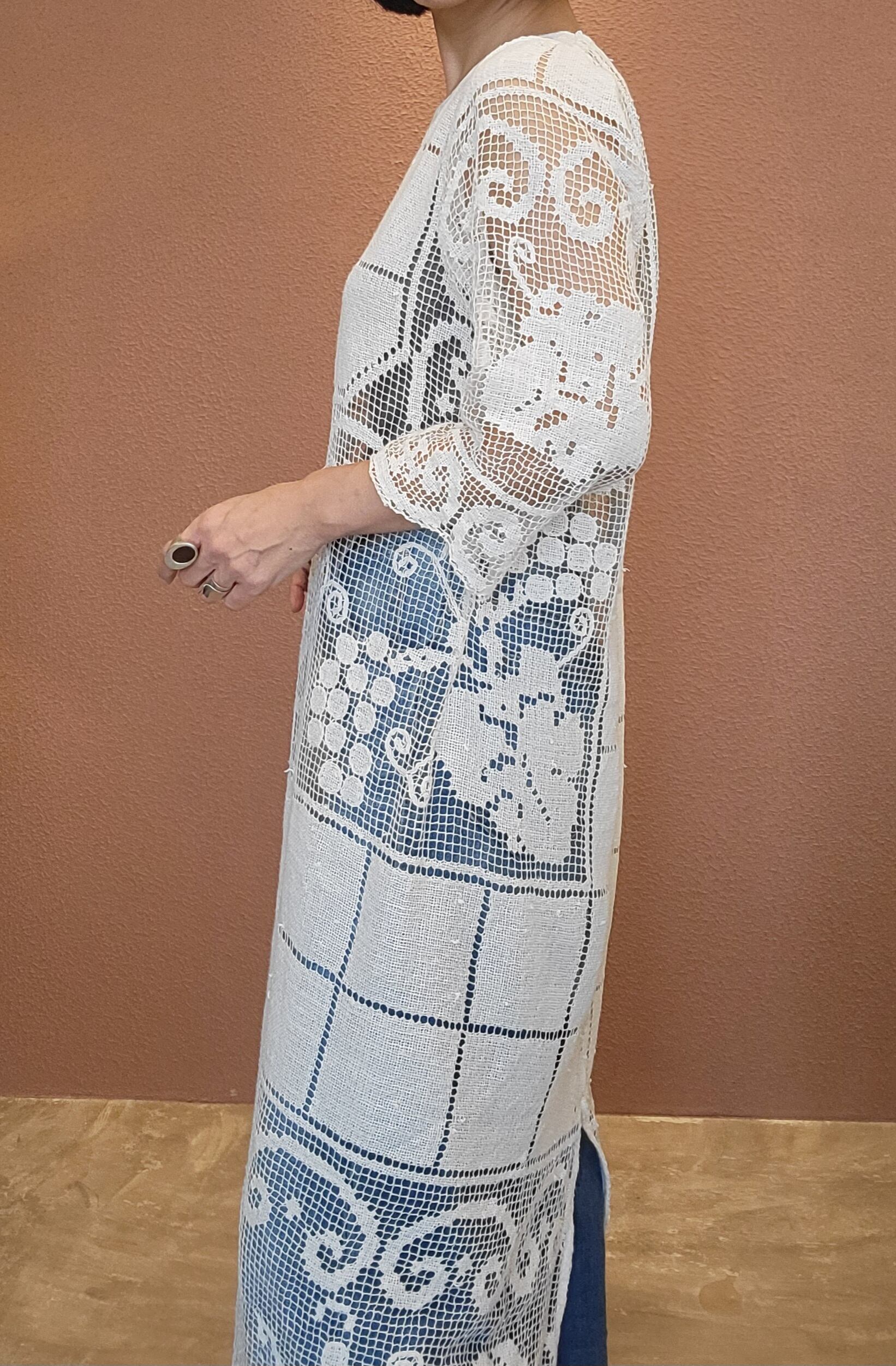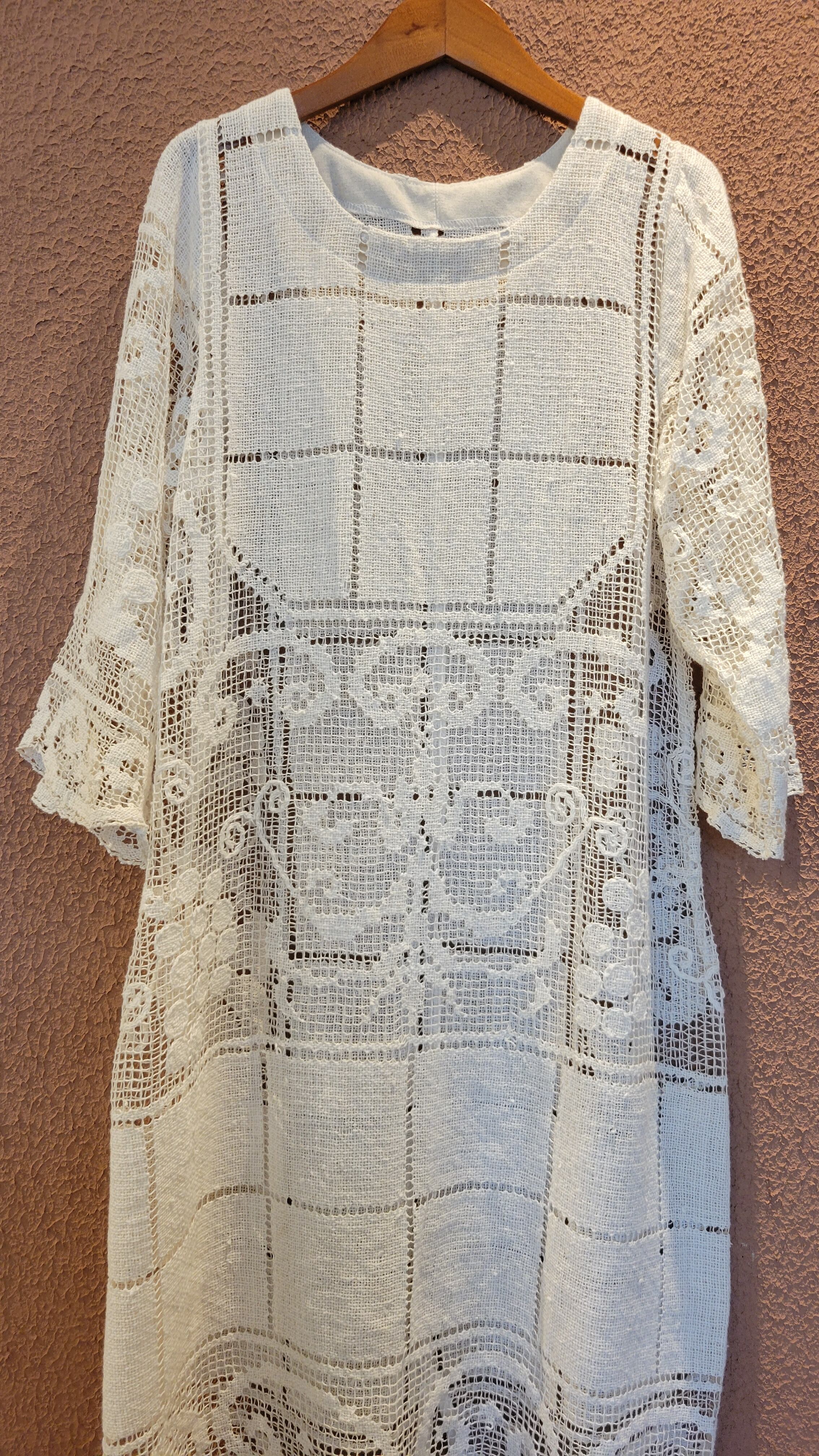 ヴィンテージのコットンレースを使用したリメイクワンピース。裏地は付いていません。袖有りデザインでほどよく肌の露出を押さえつつレースの透け感も楽しめます。レースは涼しく着られるのも嬉しいポイント。インナーに濃いめの色をあわせると繊細なレースの編み模様が美しく際立ちます。Tシャツ&デニムの上に合わせてカジュアルダウンもおすすめです。秋冬にはタートルニットを合わせても素敵です。