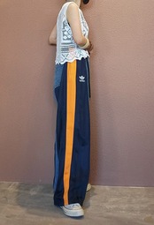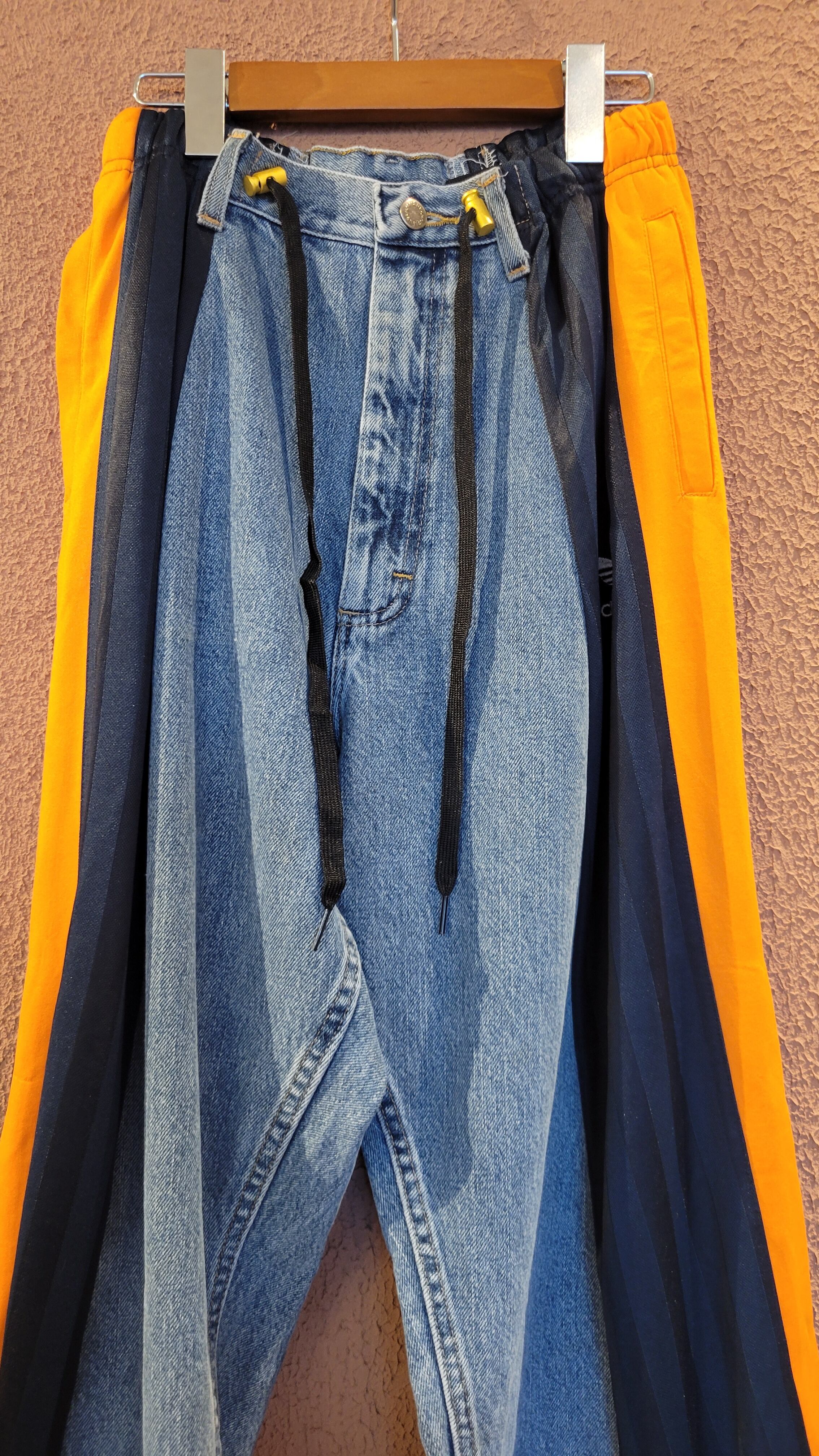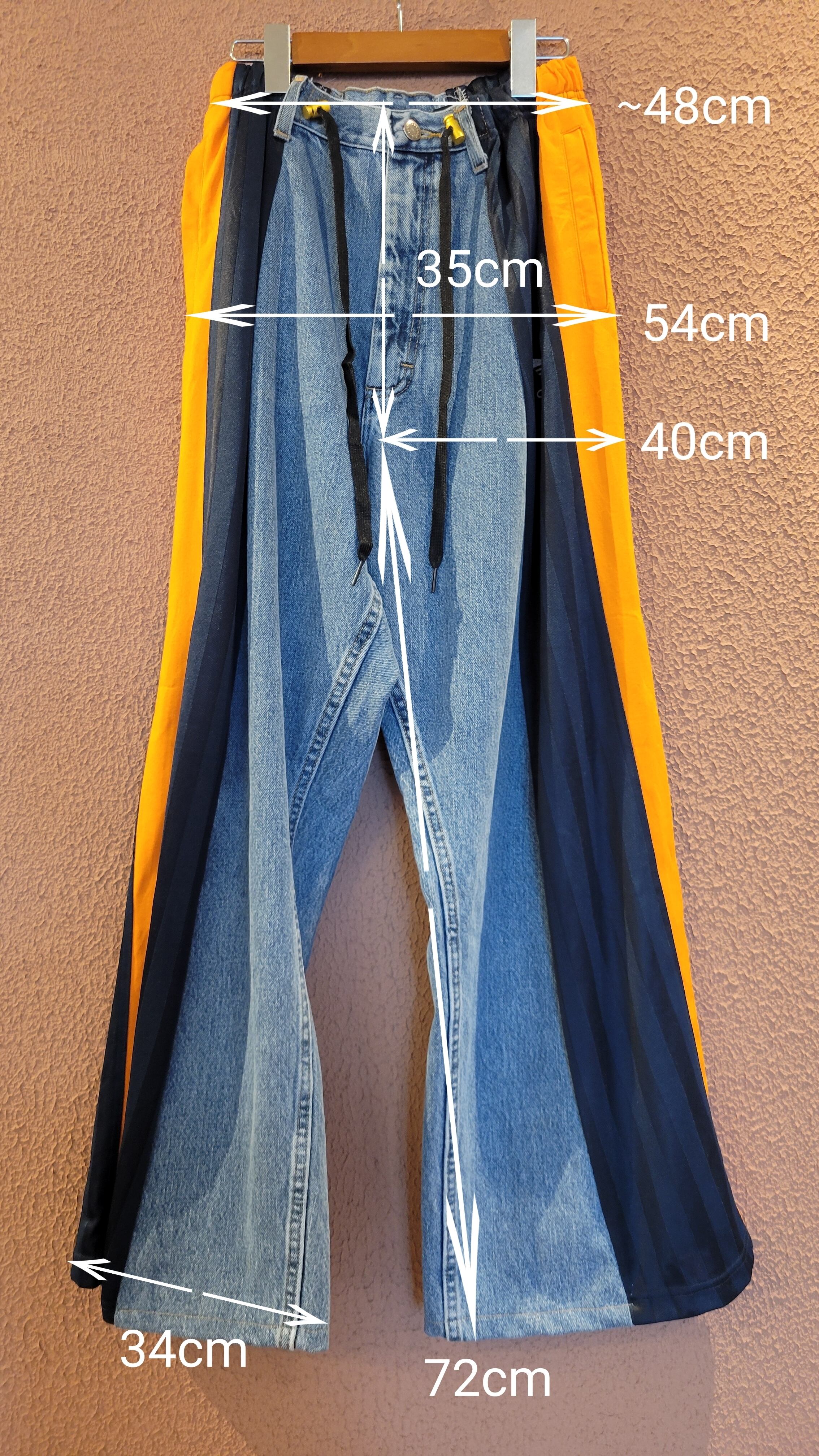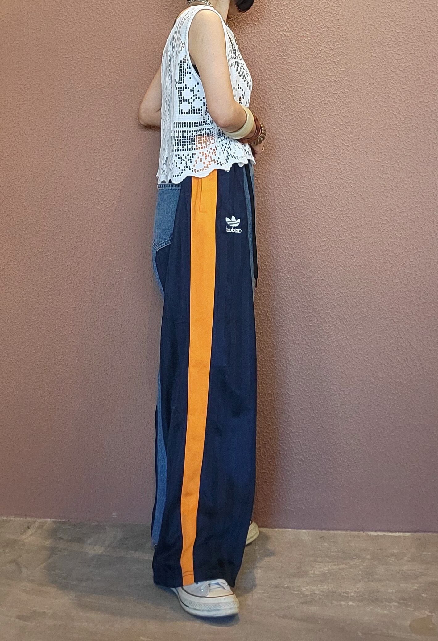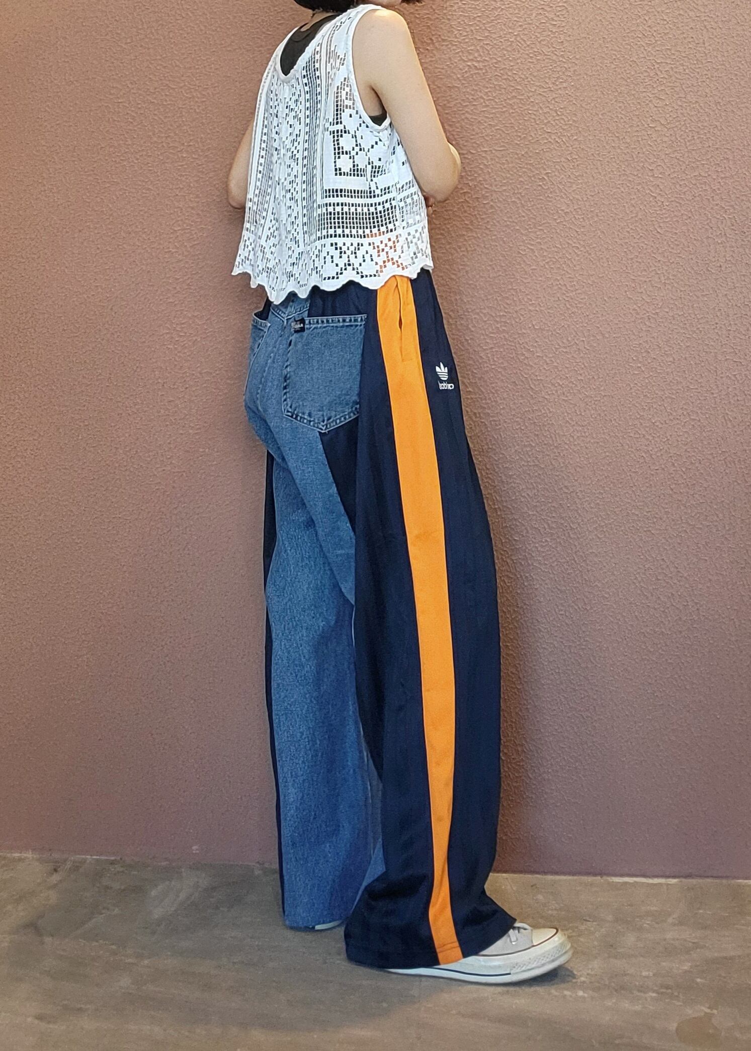 USEDデニムとトラックパンツをドッキングしたリメイクパンツ。ウエストはドローコードでサイズの調整が可能です。左右ポケット付き。太シルエットで男女兼用で着用できます。