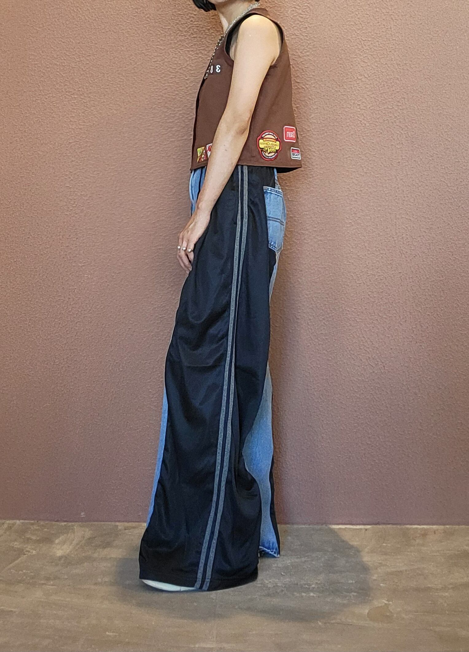 USEDデニムとトラックパンツをドッキングしたリメイクパンツ。ウエストはドローコードでサイズの調整が可能です。左右ポケット付き。太シルエットで男女兼用で着用できます。