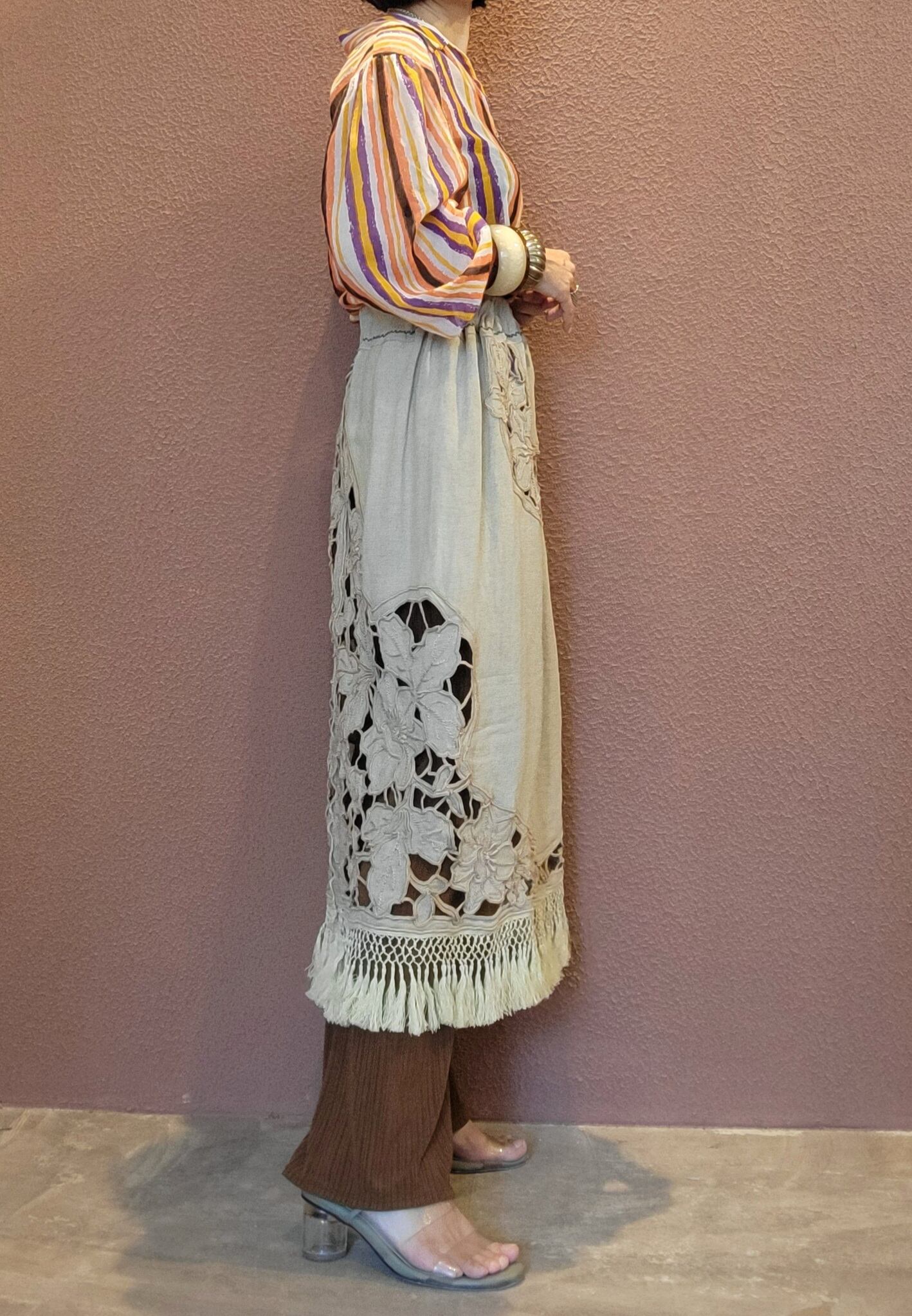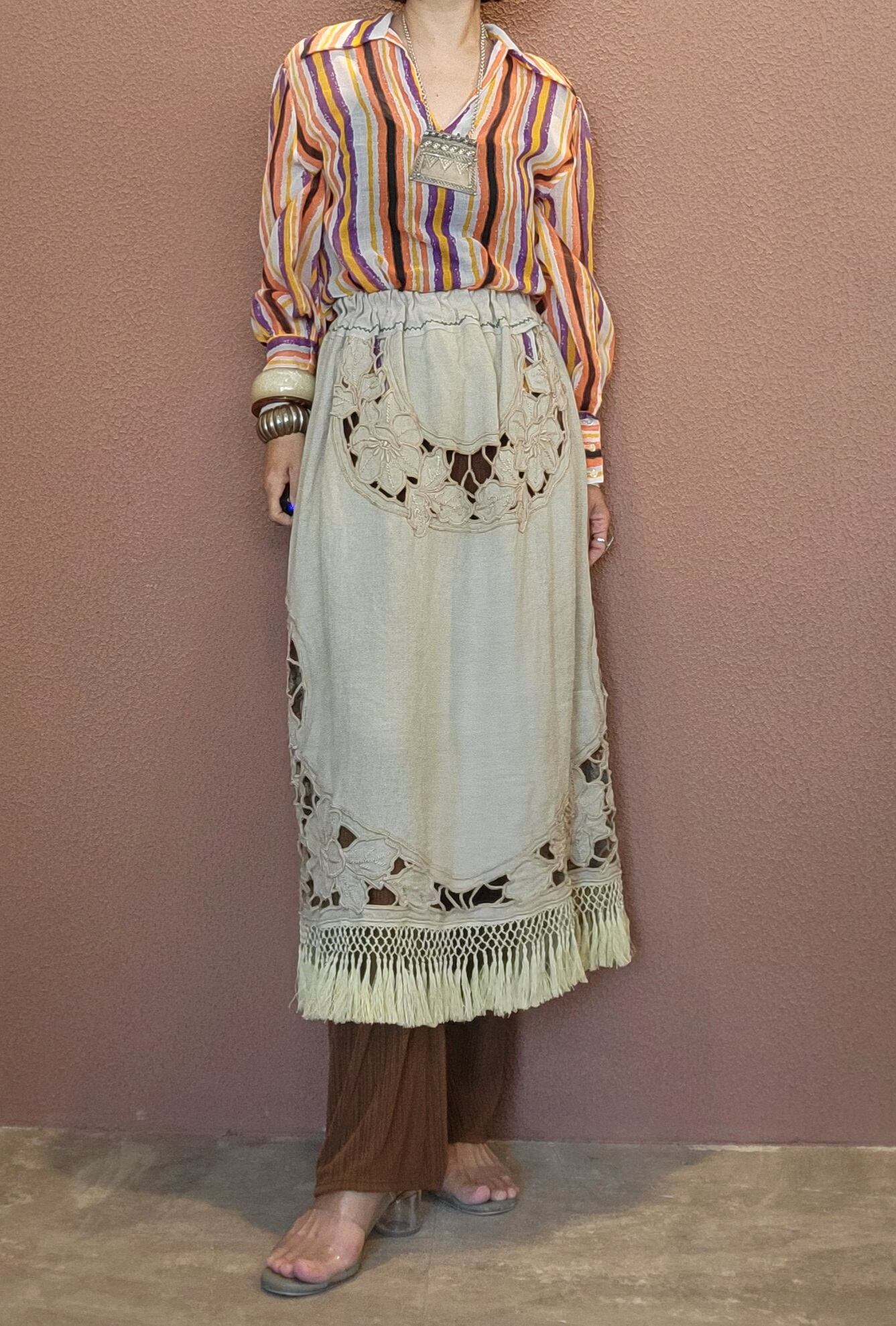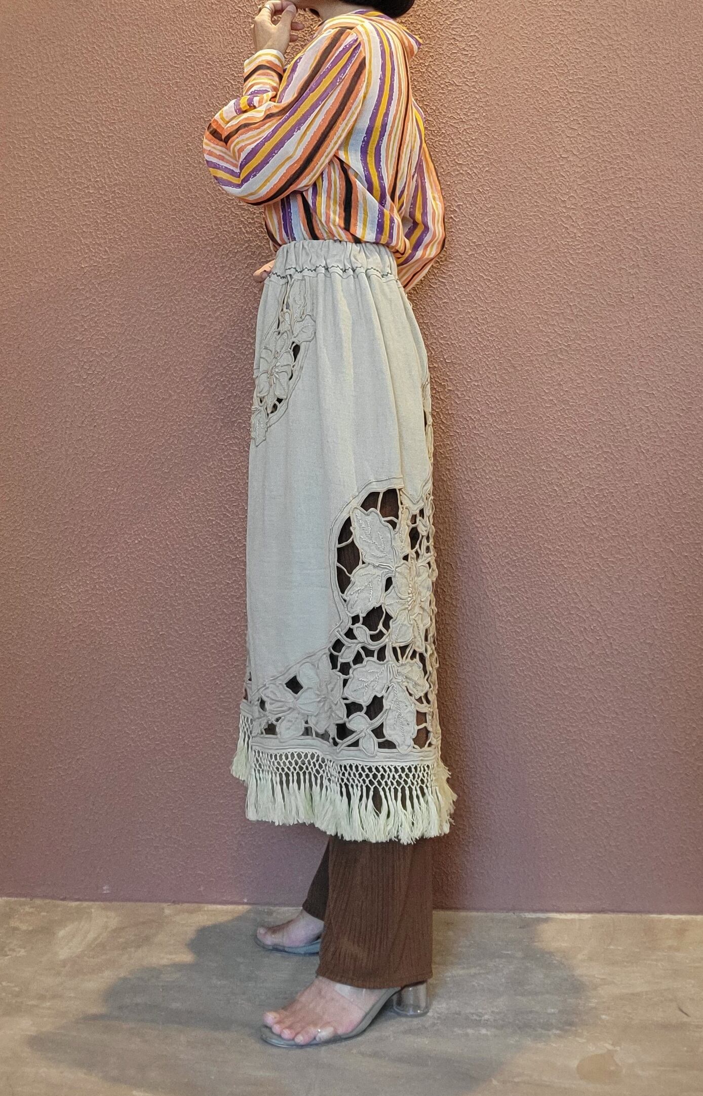 ヴィンテージのカットワーク刺繍クロスを使用したリメイクスカート。ウエストゴムです。前後どちらでも着用可能てす。裏地は付いていません。パンツやマキシスカート、シンプルなワンピース等にレイヤードしてお楽しみいただけます。