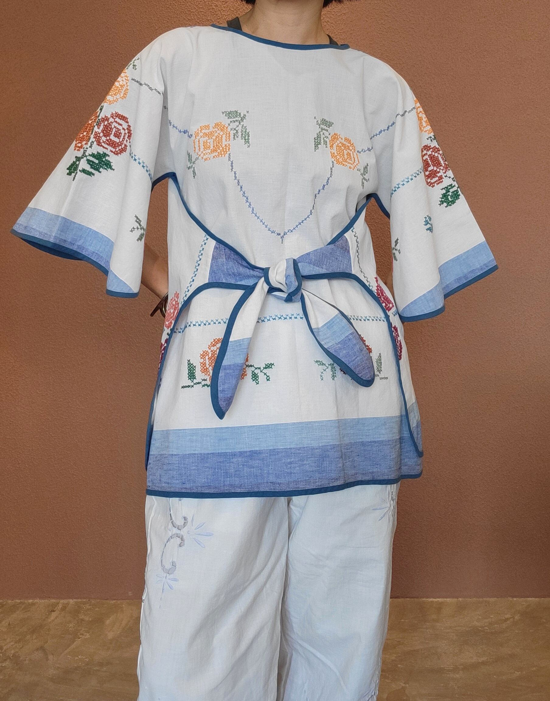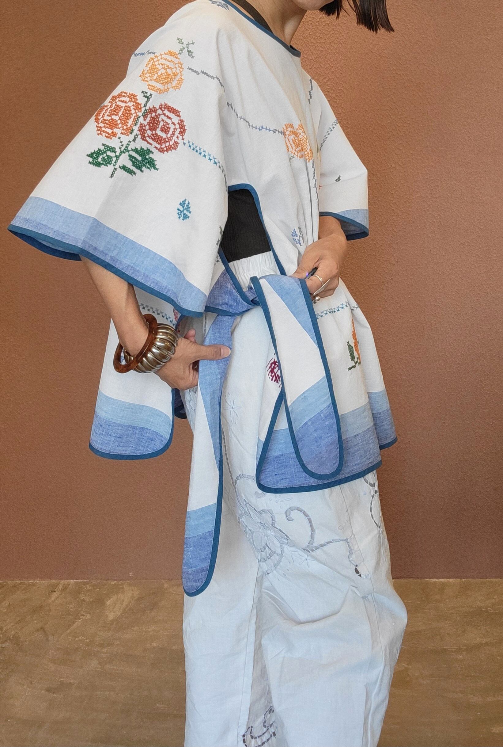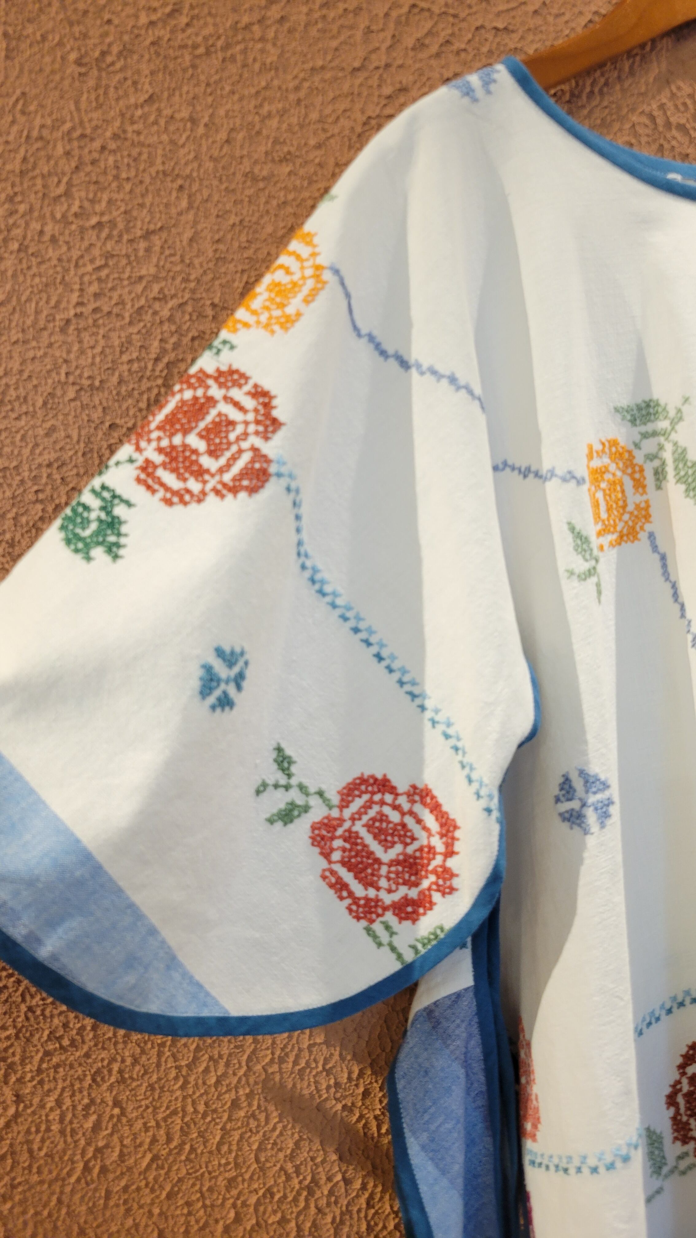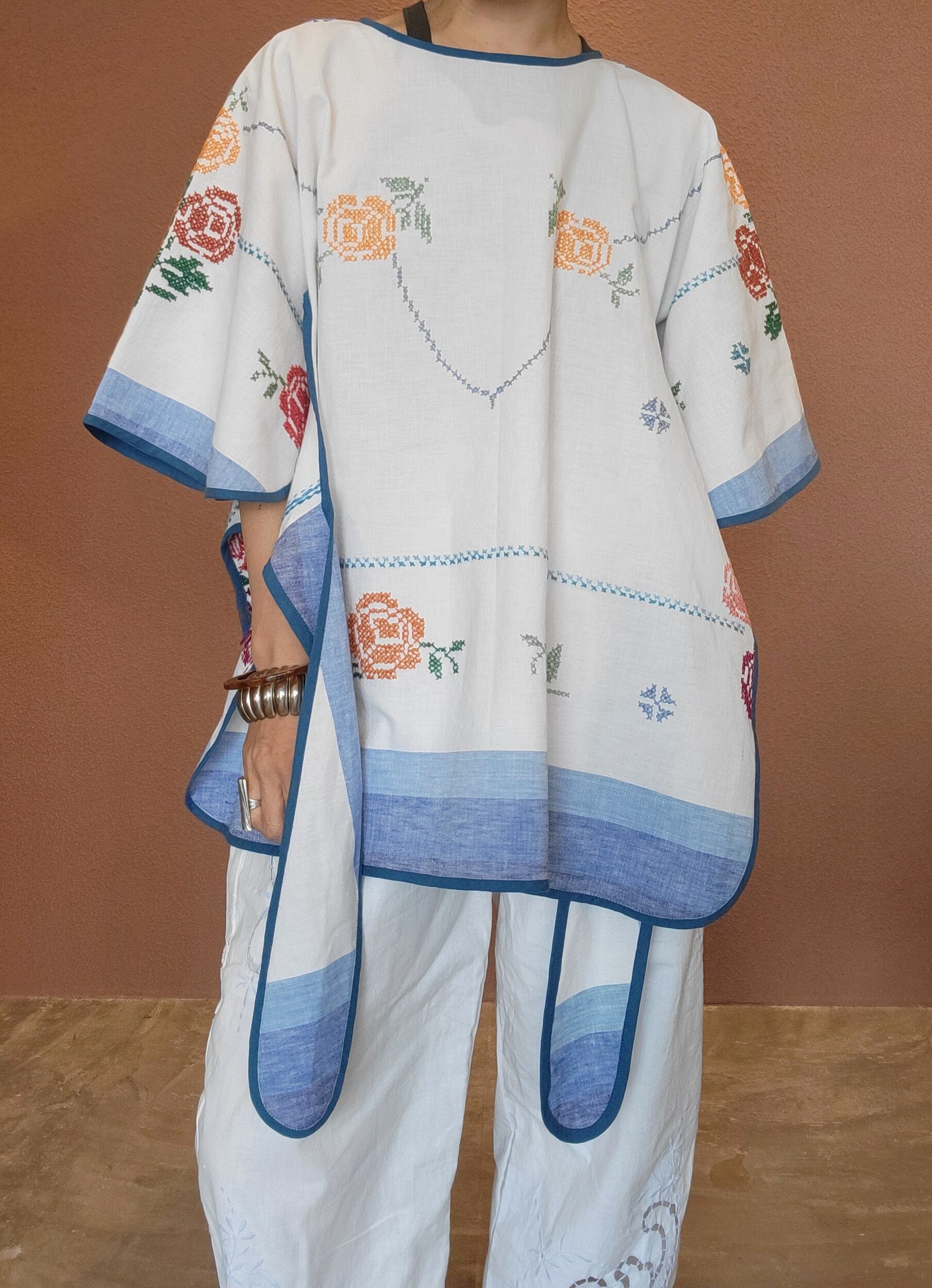 ハンドステッチのヴィンテージ刺繍クロスを使用したリメイクチュニック。素材表記はありませんがコットンです。しっかりめのコットンでさらりと気持ちの良い素材感です。サイドオープンのポンチョタイプ。左右のリボンはそのまま垂らしたり、サイドで結んだり、前後でクロスさせて結んだり、お好みで色々な着方が可能です。レイヤードスタイルでお楽しみいただけます。