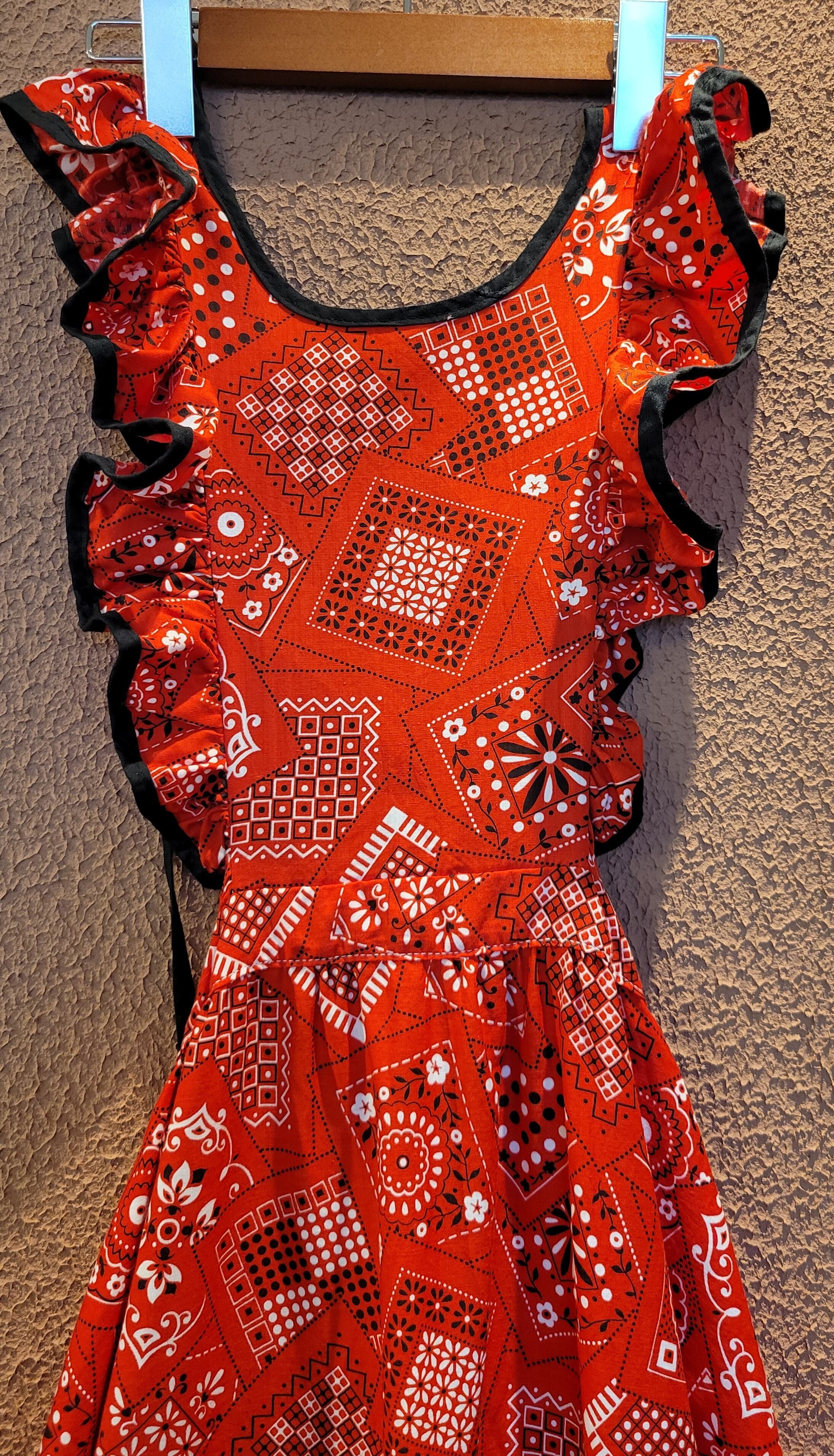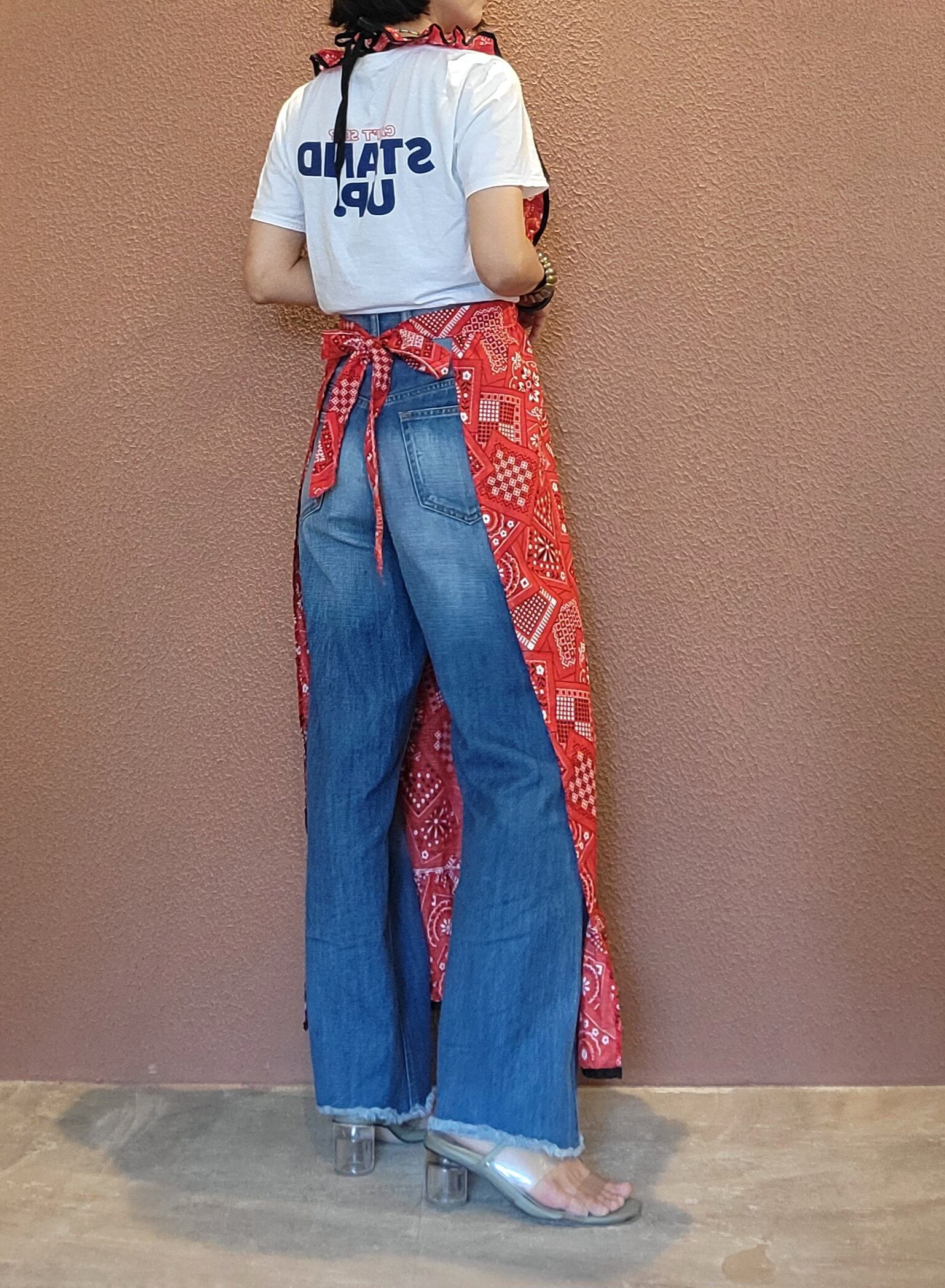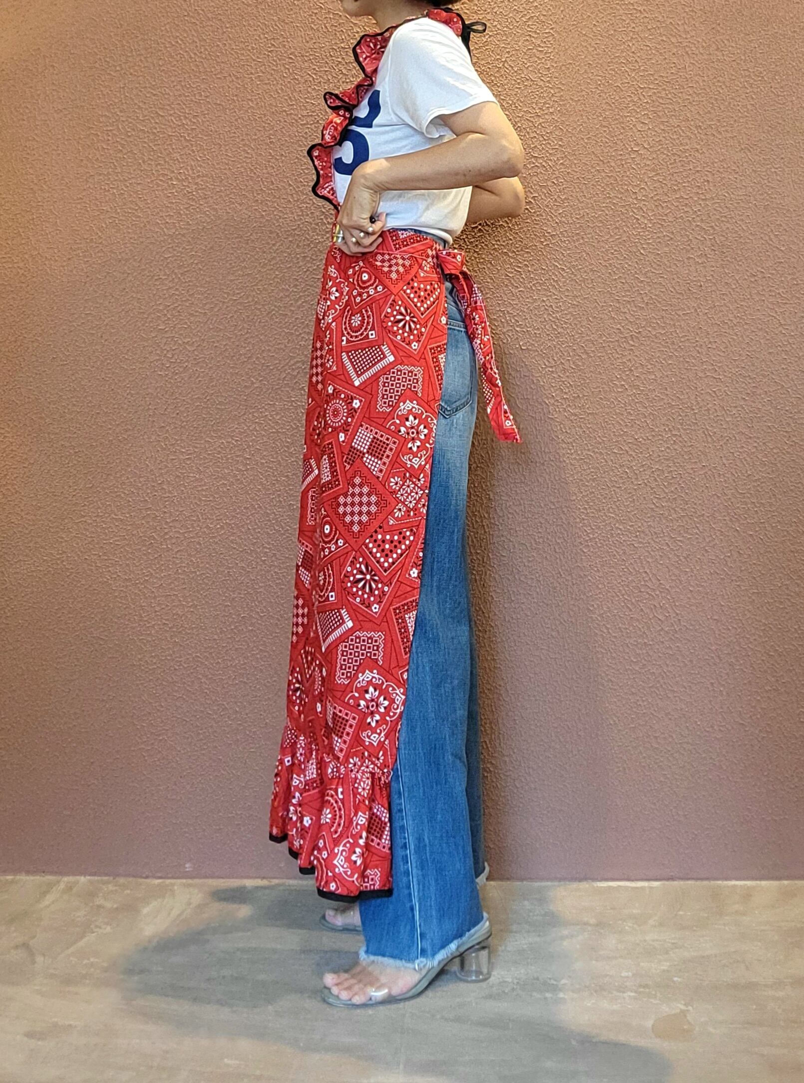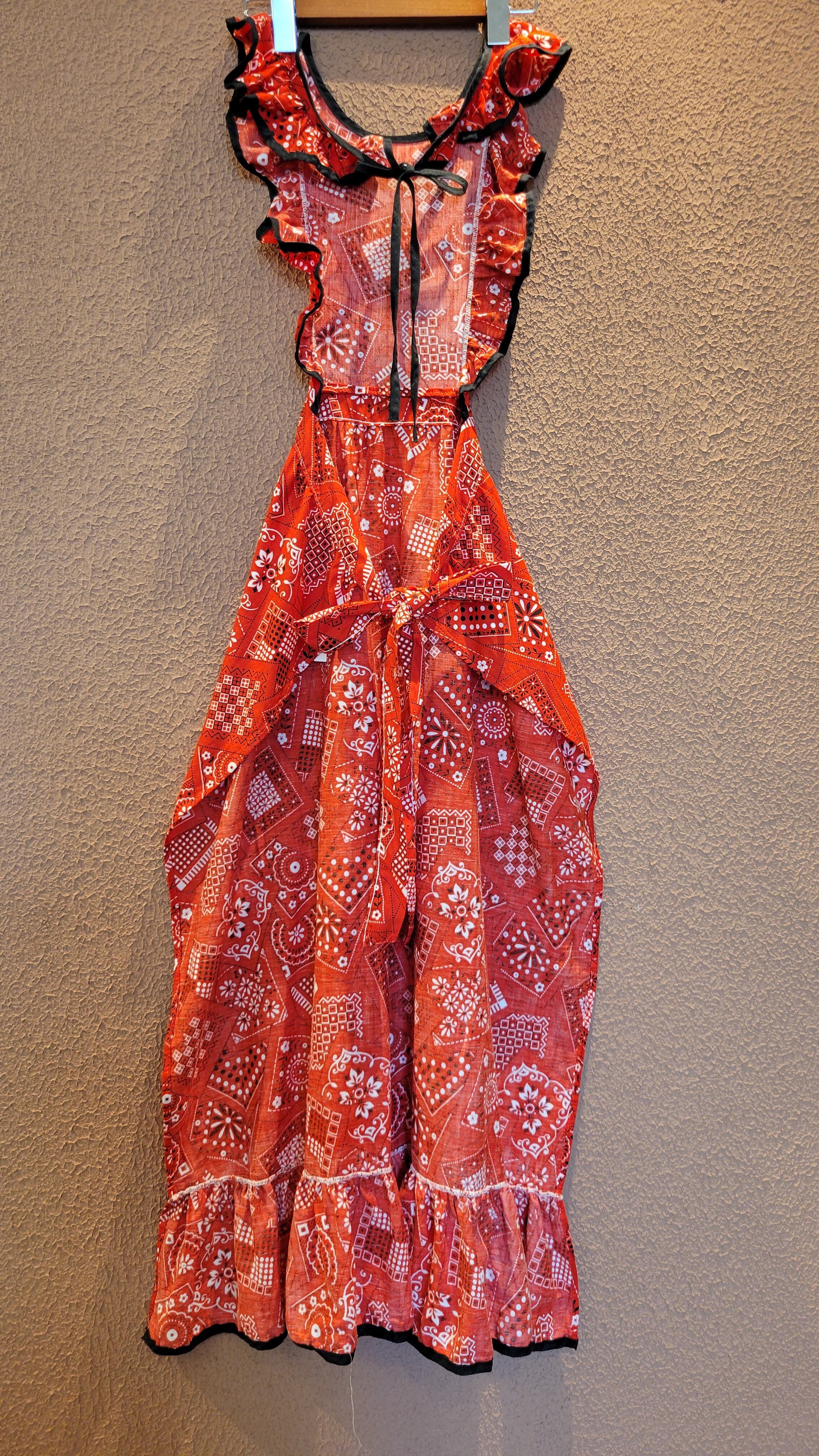 バンダナ柄のヴィンテージエプロンワンピース。素材不明ですがコットンのようです。ホルターネックのように首後ろで紐を結ぶ仕様です。甘くなりがちなフリルを黒のパイピングが程よく引き締めています。デニムやワンピースの上にプラスして楽しめるアイテムです。