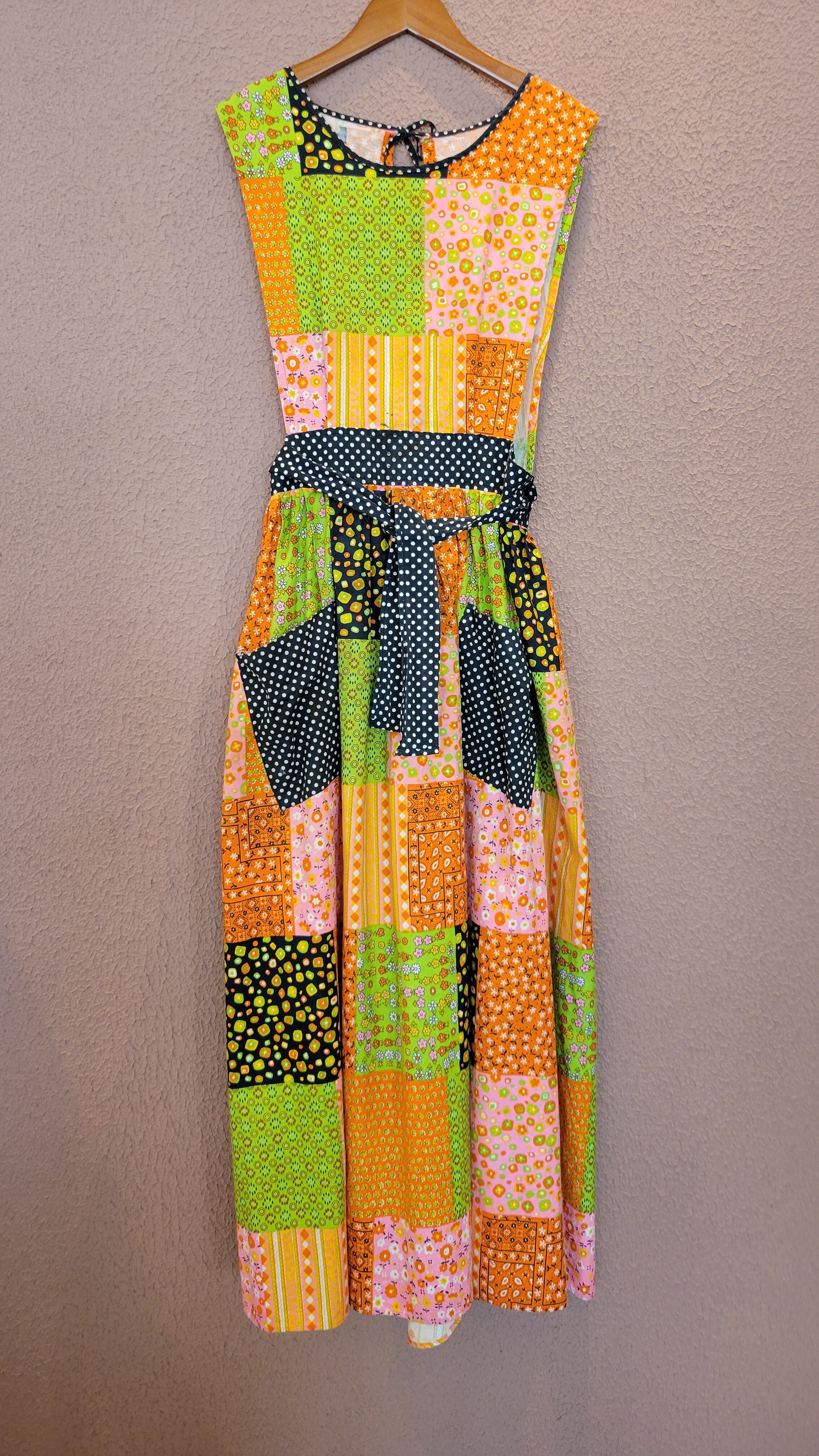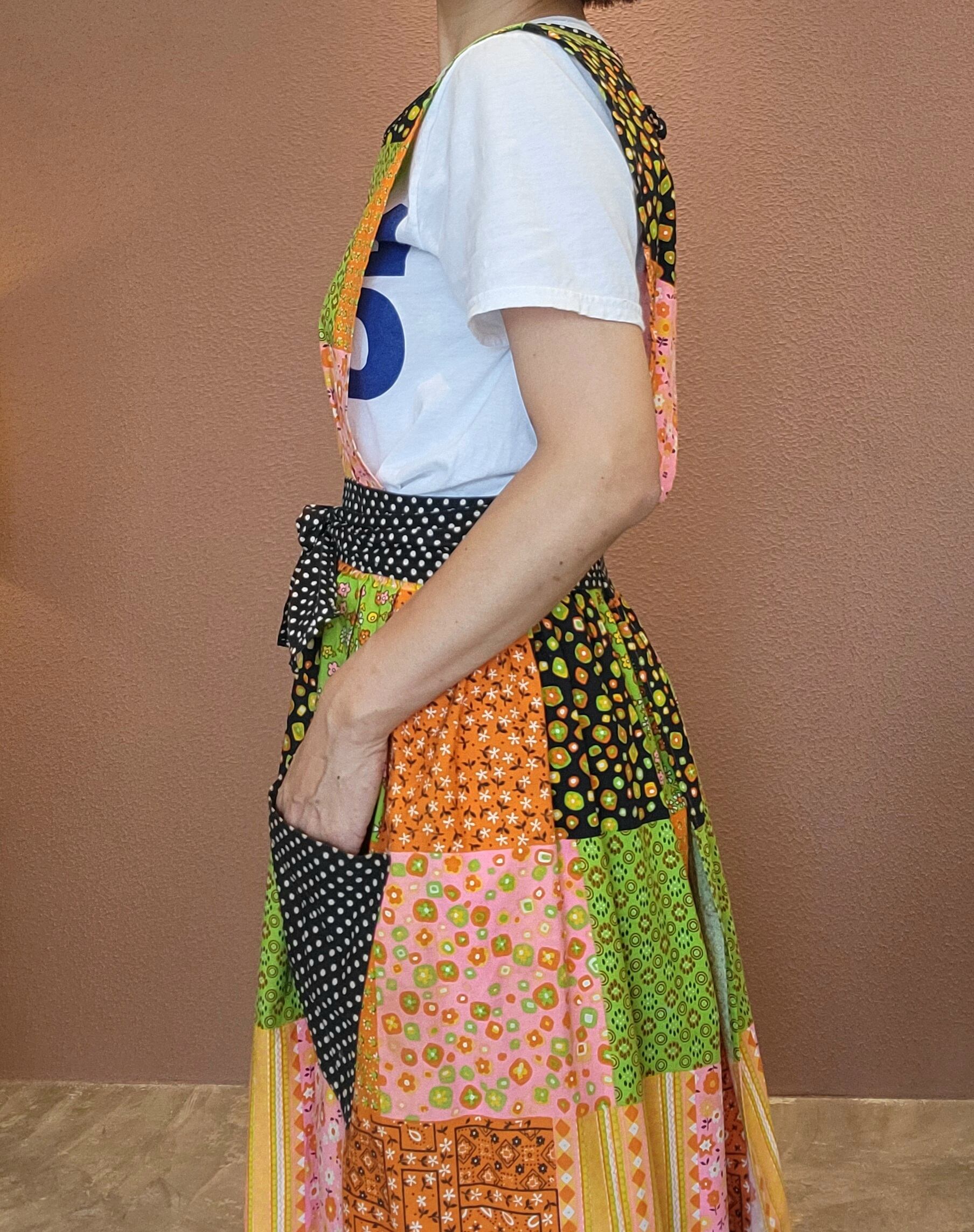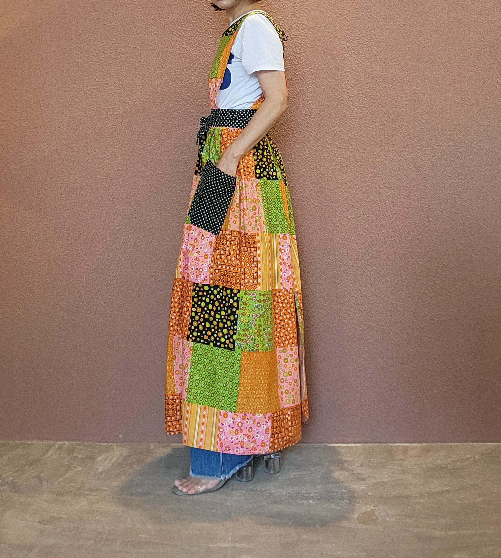70sのエプロンワンピース。素材表記はありませんがコットンのようです。後ろでリボンを交差させ、左サイドの通し穴にリボンを通しフロントで結ぶと画像のような着用になります。斜めに配置された大きなポケットも特徴的。レイヤードスタイルでお楽しみいただけます。*前身ごろウエスト中央辺りに黒っぽいシミ有り。画像でご確認ください。こちらはヴィンテージに慣れている方、ご理解のある方へおすすめいたします。