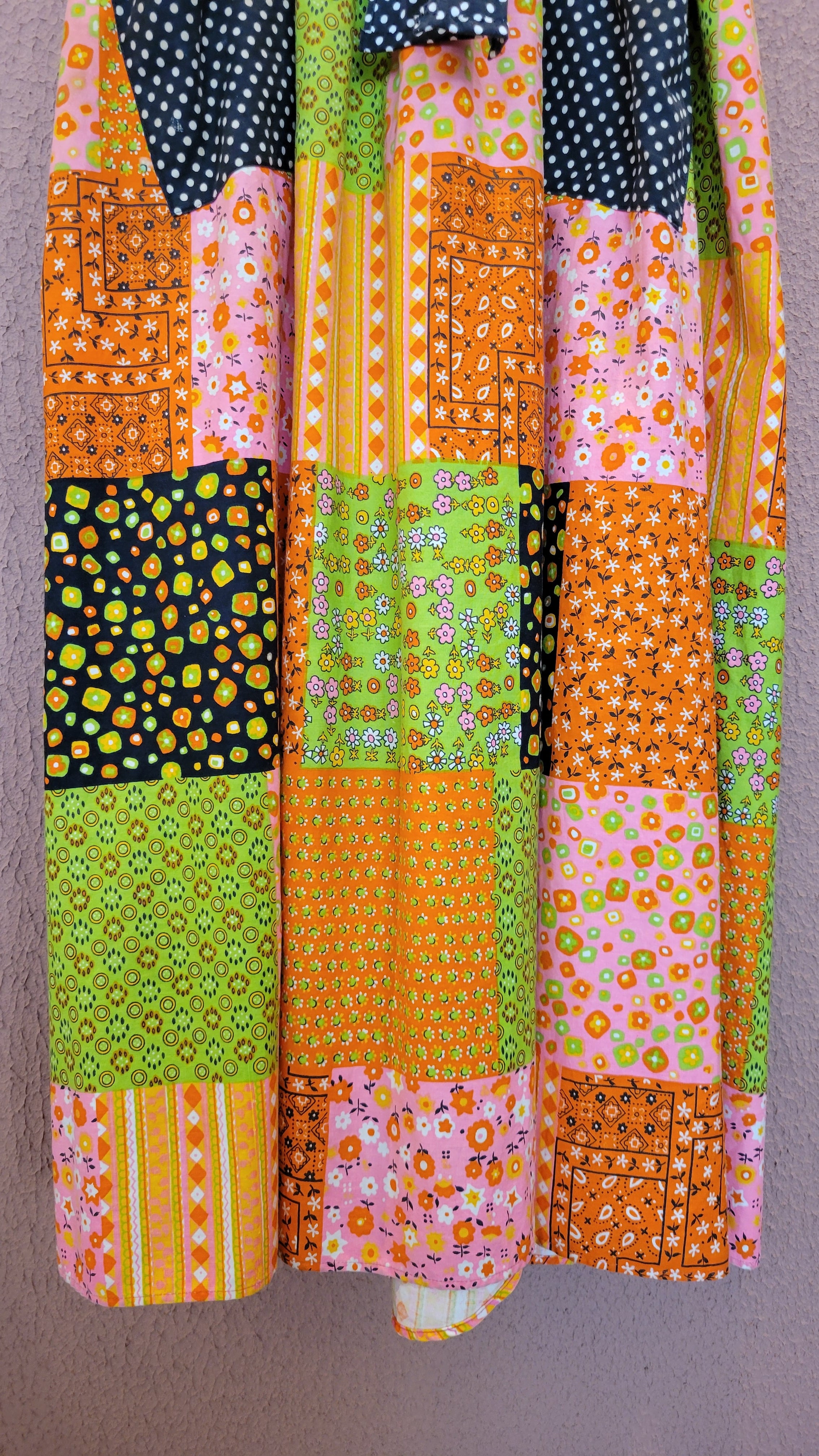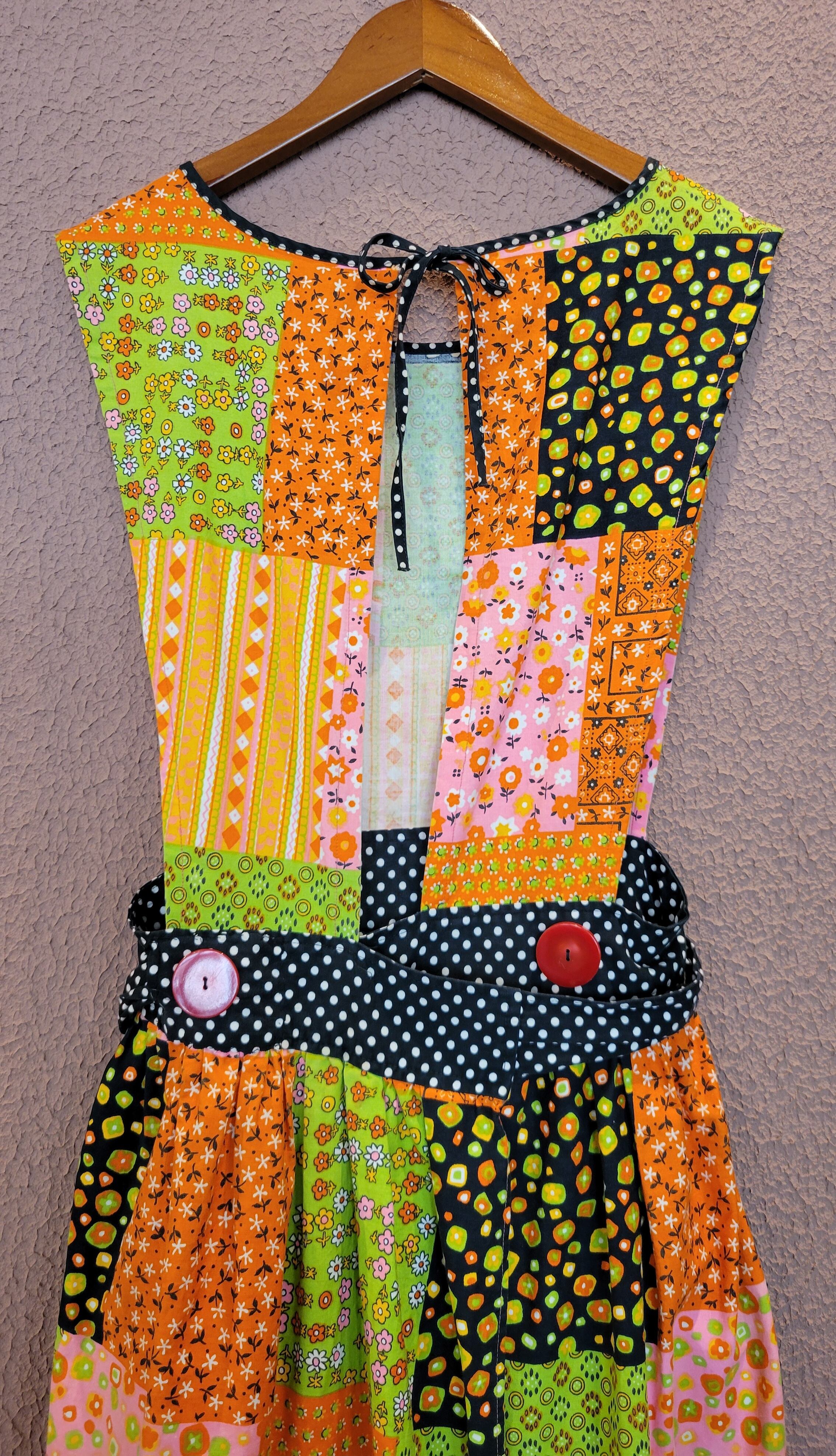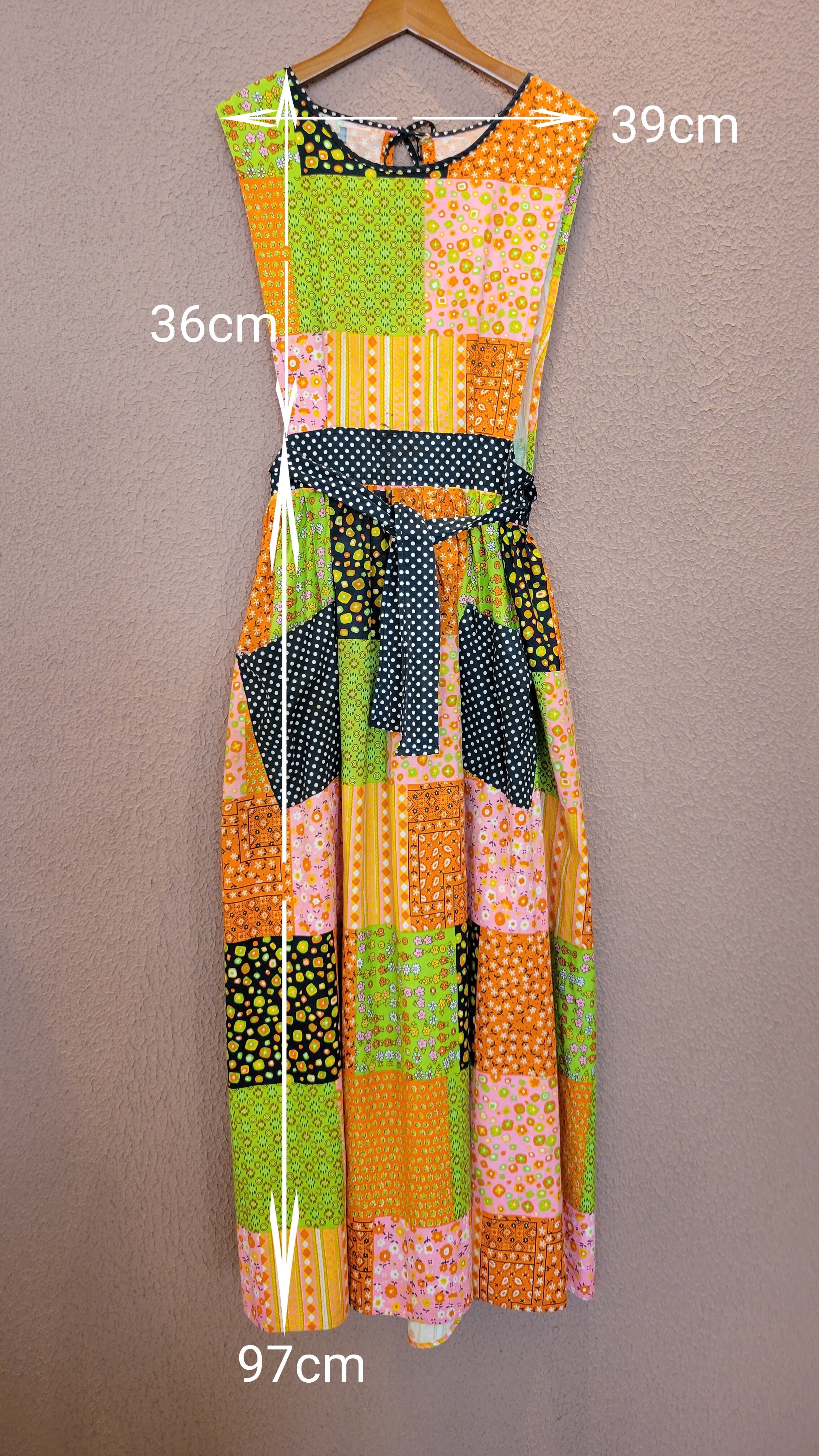 70sのエプロンワンピース。素材表記はありませんがコットンのようです。後ろでリボンを交差させ、左サイドの通し穴にリボンを通しフロントで結ぶと画像のような着用になります。斜めに配置された大きなポケットも特徴的。レイヤードスタイルでお楽しみいただけます。*前身ごろウエスト中央辺りに黒っぽいシミ有り。画像でご確認ください。こちらはヴィンテージに慣れている方、ご理解のある方へおすすめいたします。