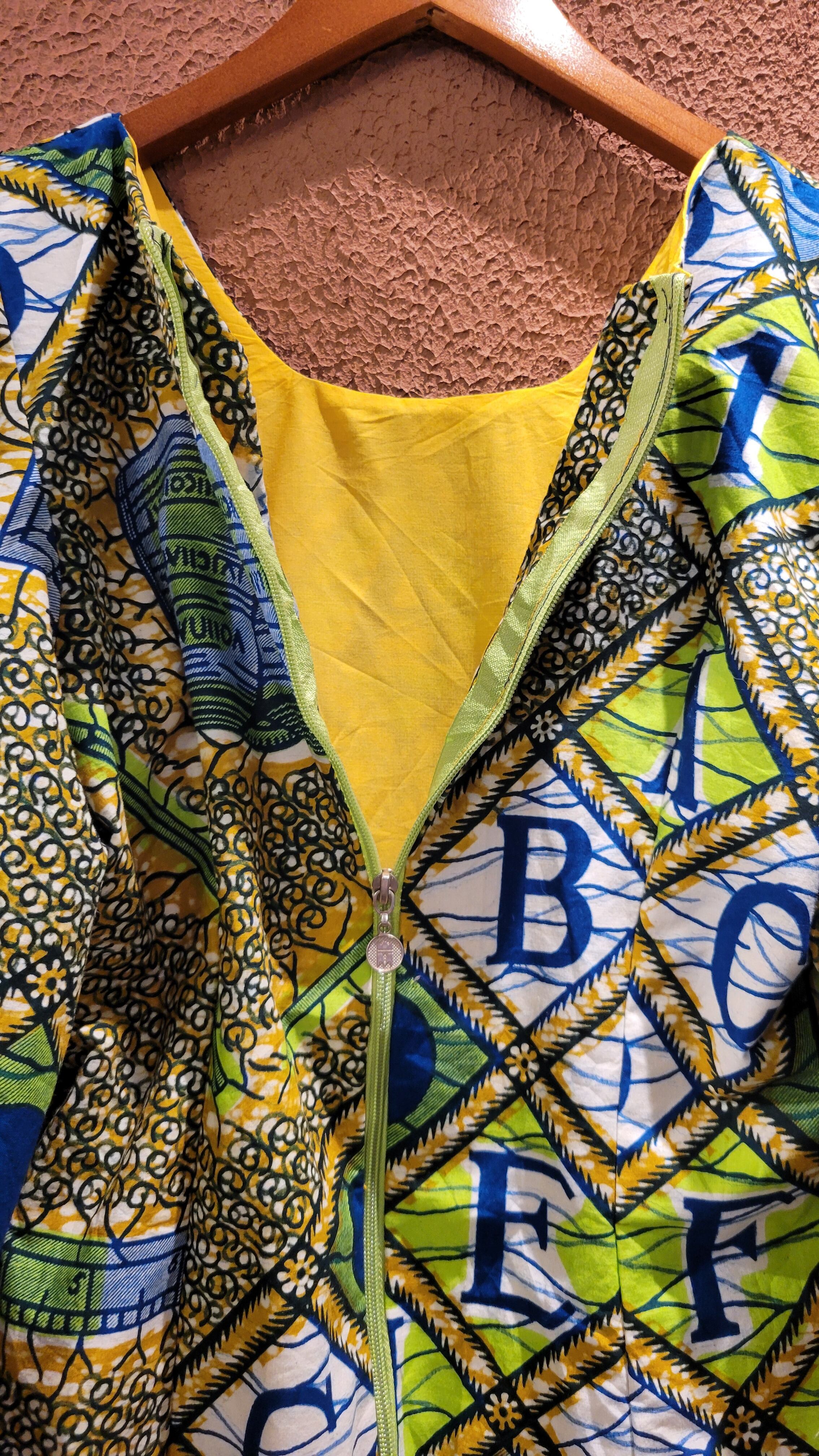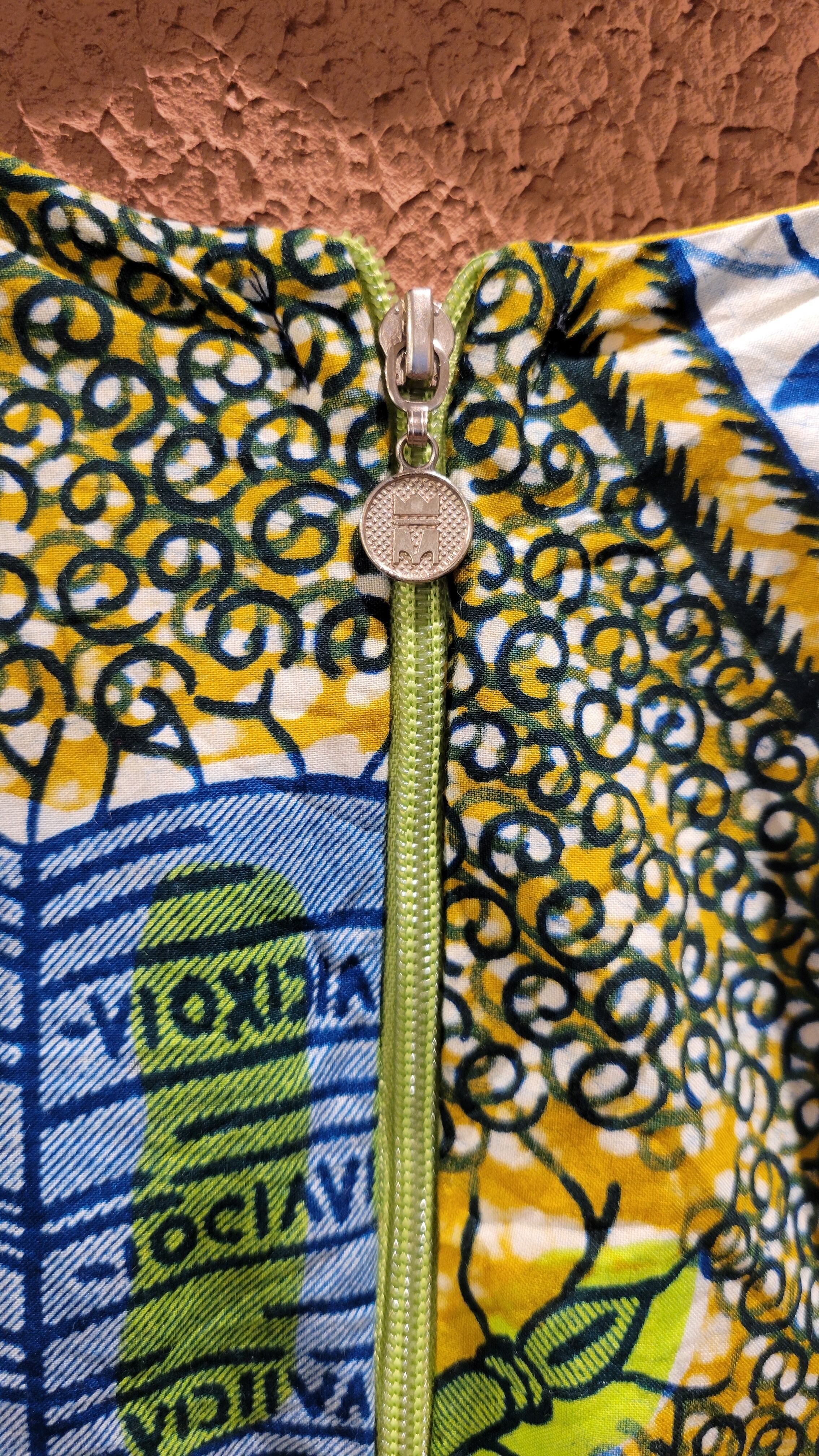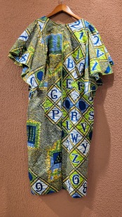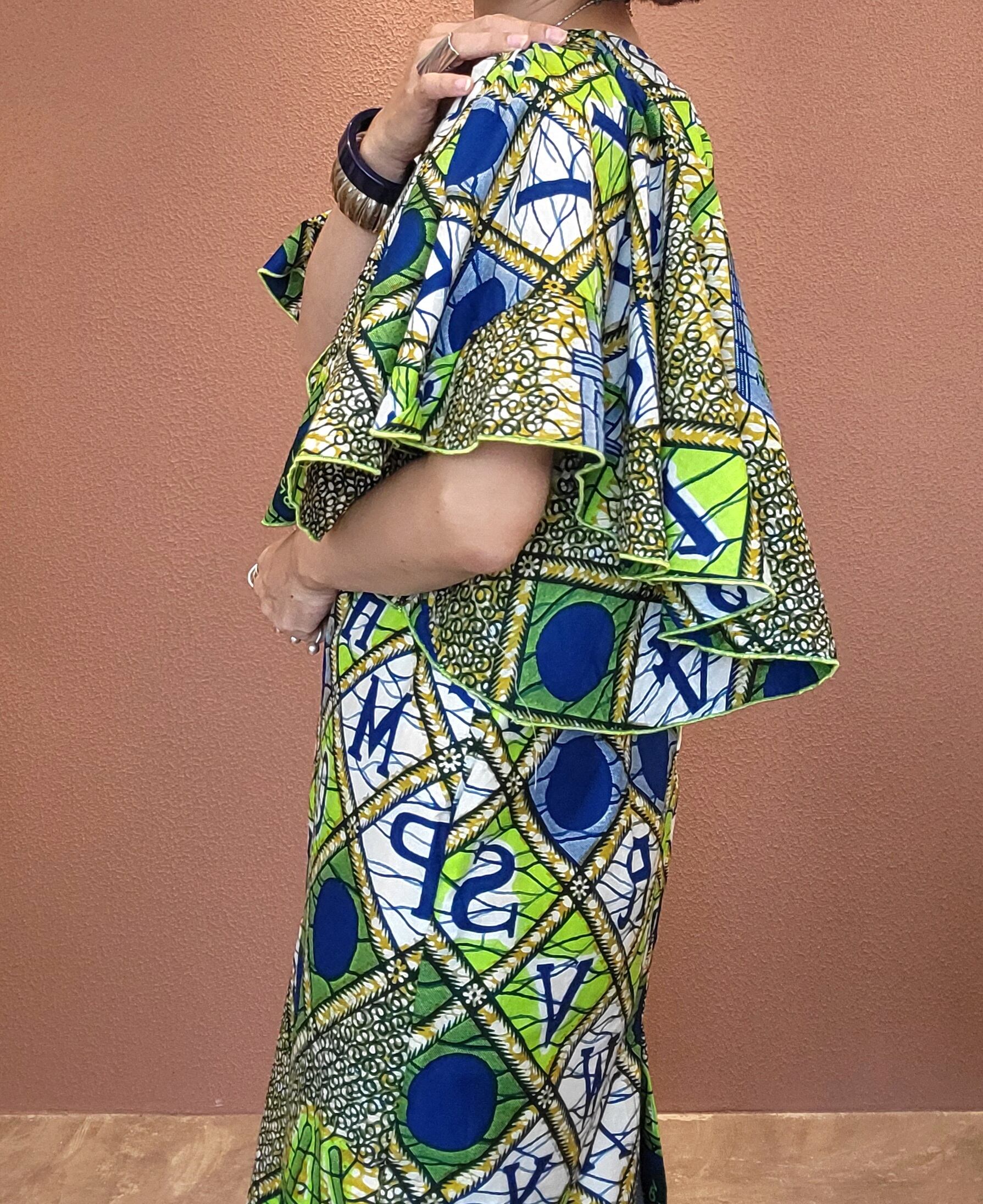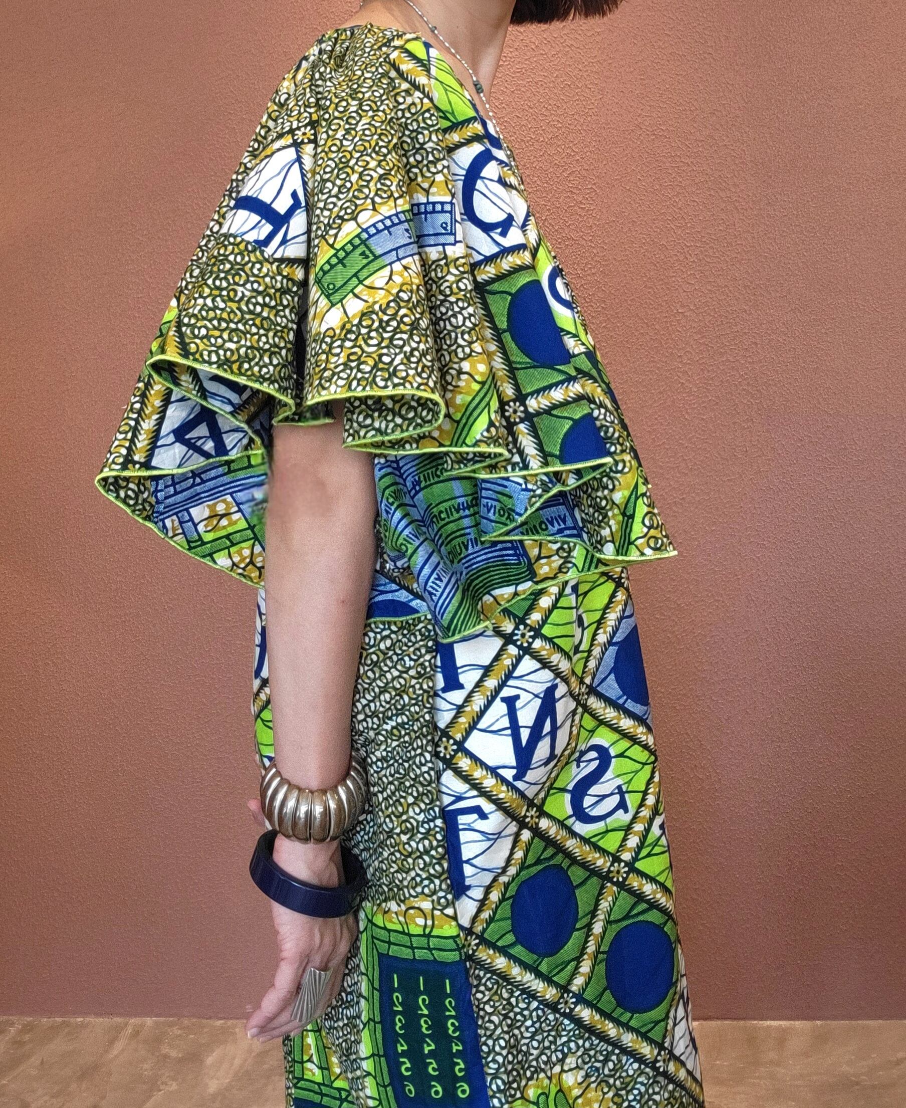 ヴィンテージのアフリカンバティックワンピース。素材は張りのあるコットンです。バックファスナー付き。スリット入りで足さばきも問題ないです。たっぷりのフリル袖が華やかな1枚。ワックスプリントの老舗メーカー VLISCO社製の生地を使用したリアルワックスプリントです。