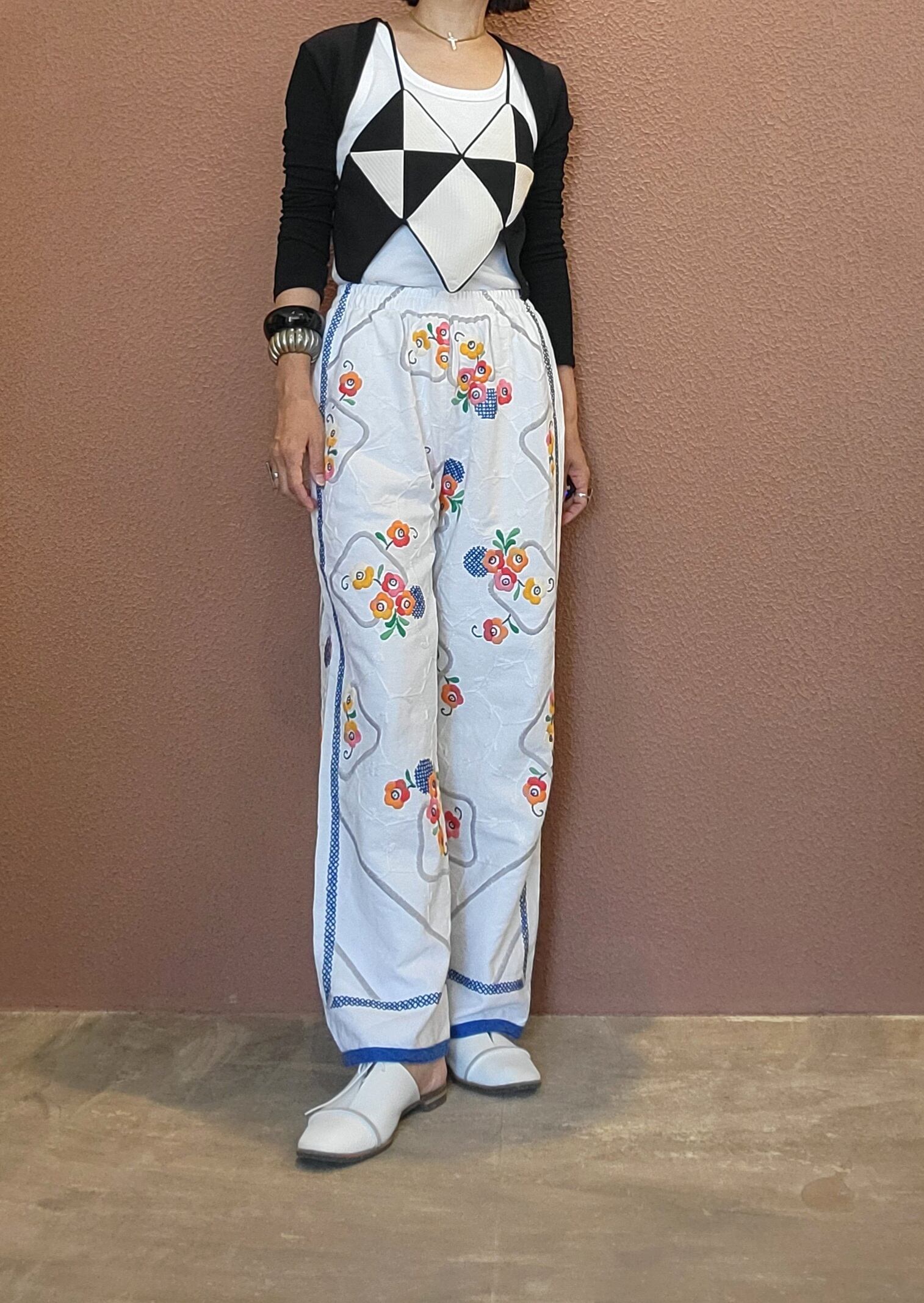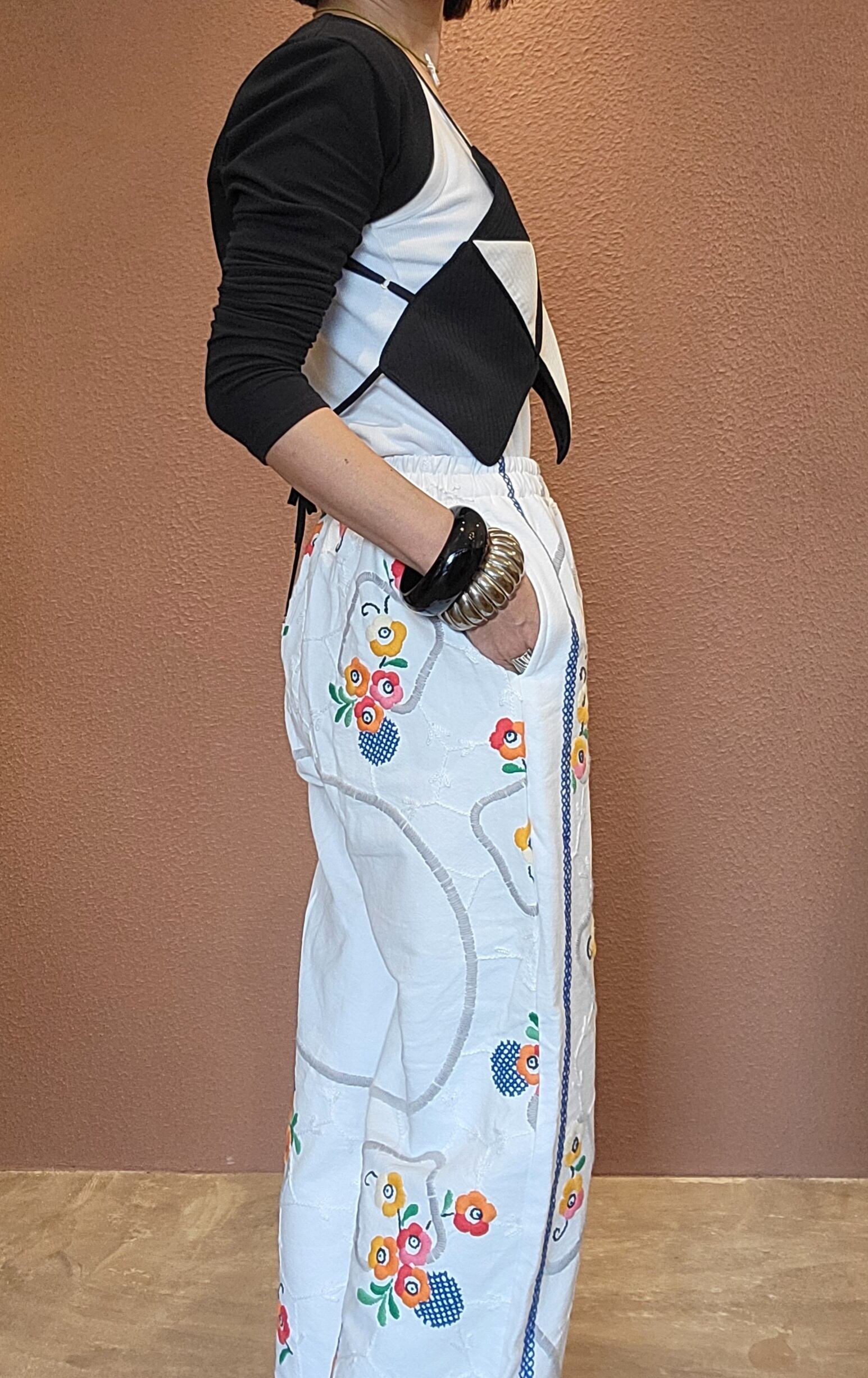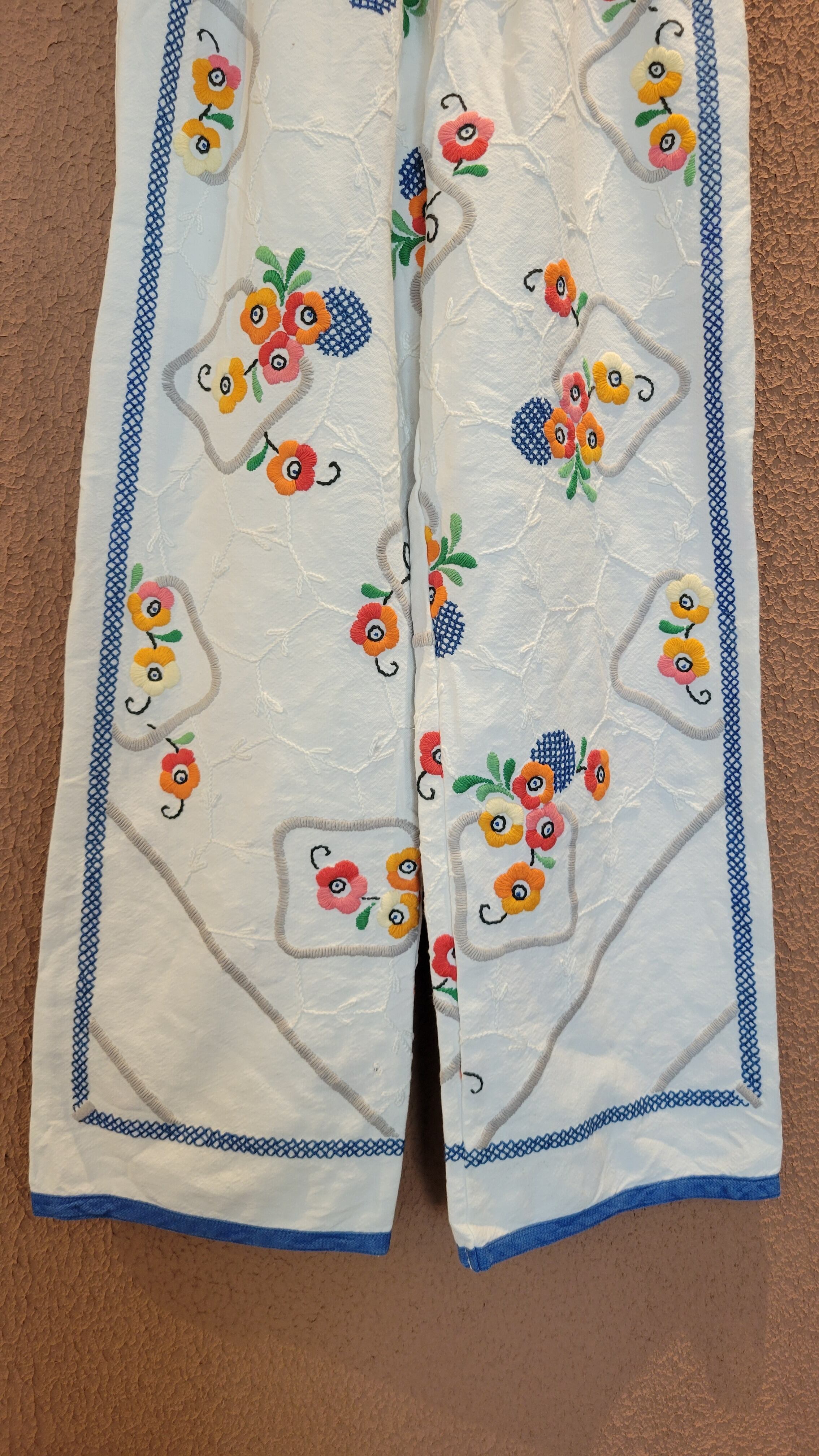 ヴィンテージの刺繍クロスを使用したリメイクイージーパンツ。素材表記はありませんがコットンのようです。ウエストゴム、左右にサイドポケット付き。可愛くて着脱の楽なイージーパンツ、日常使いにぴったりです。*後ろ右もも辺りに薄いシミがあります。画像でご確認ください。