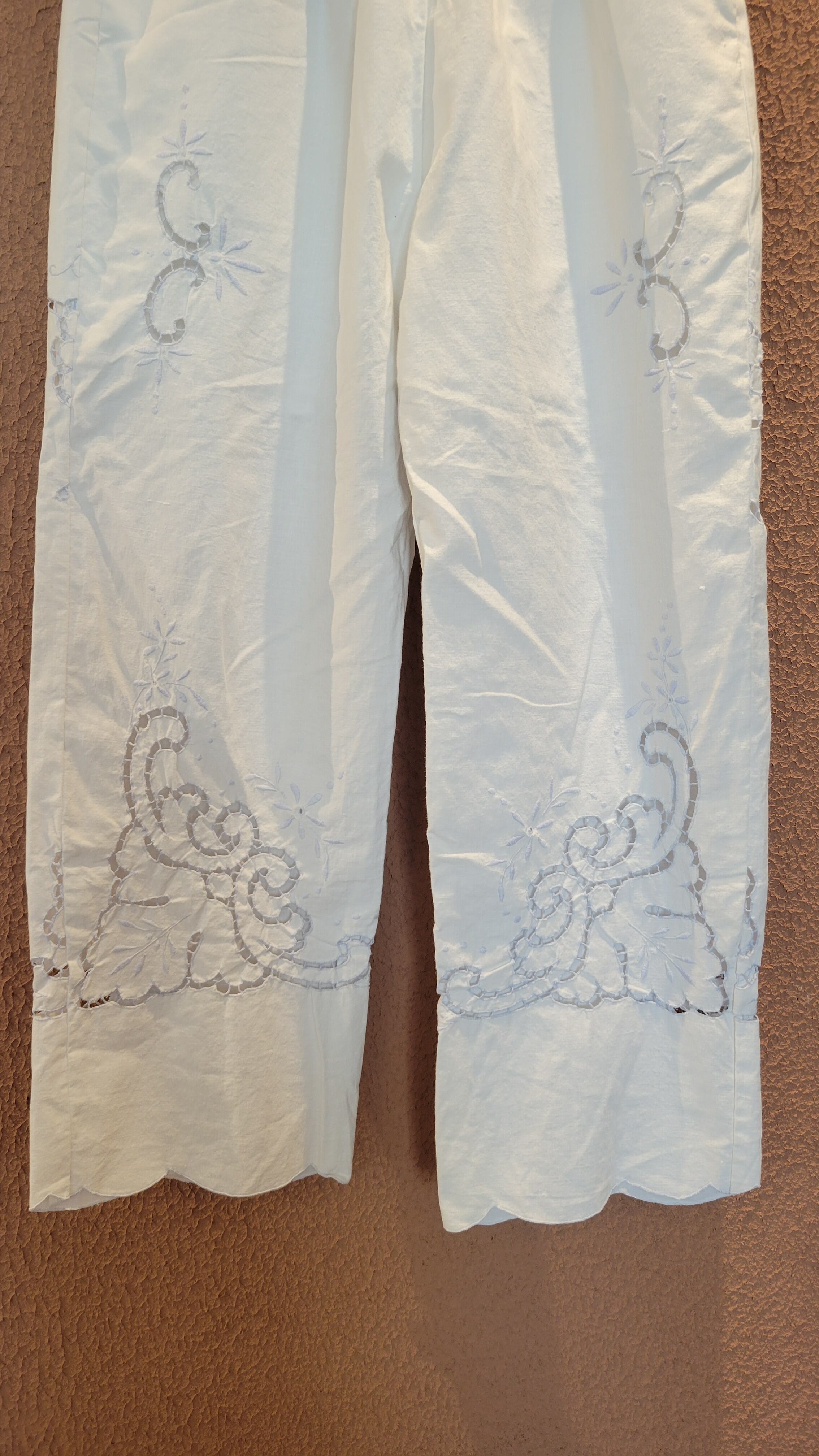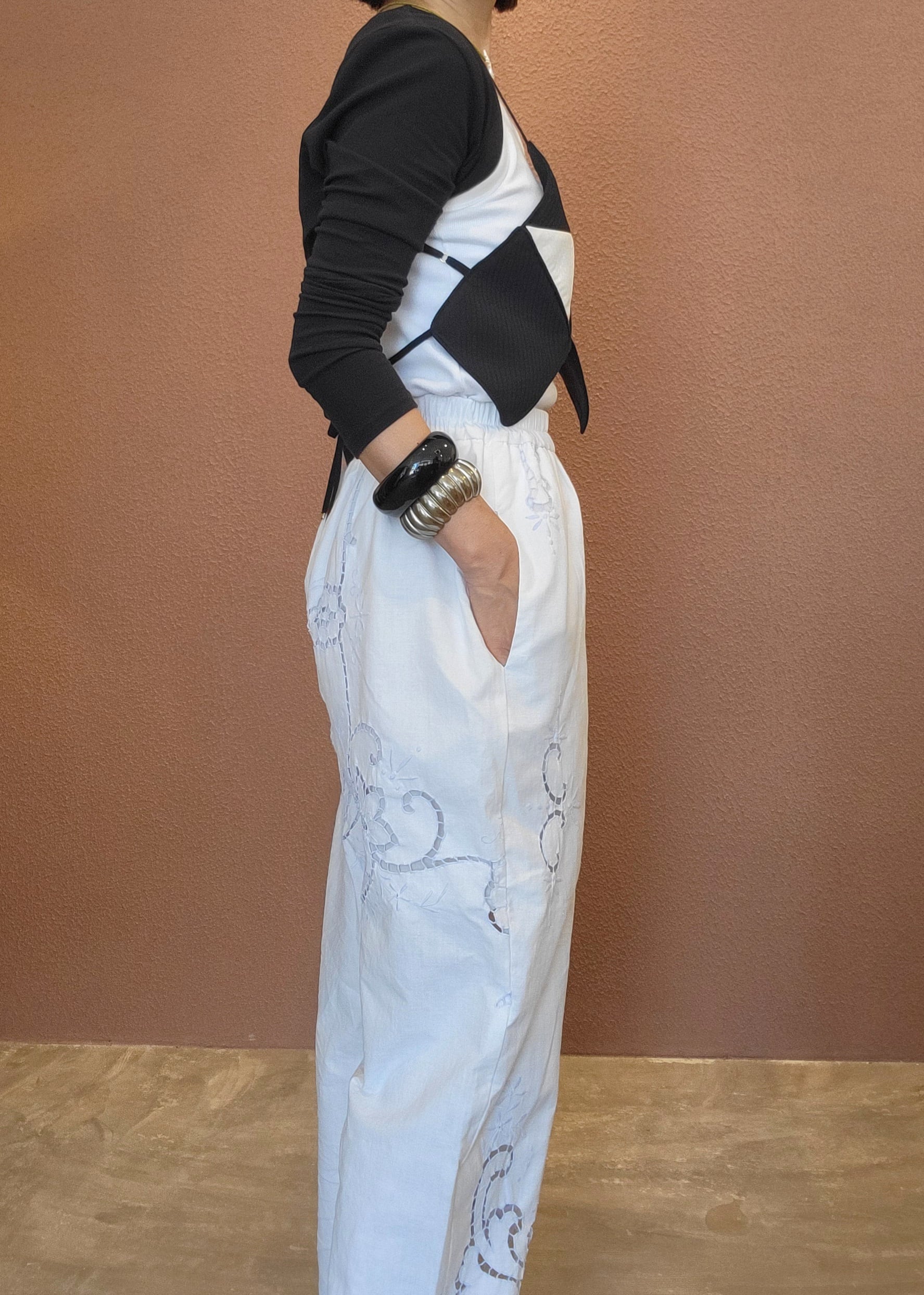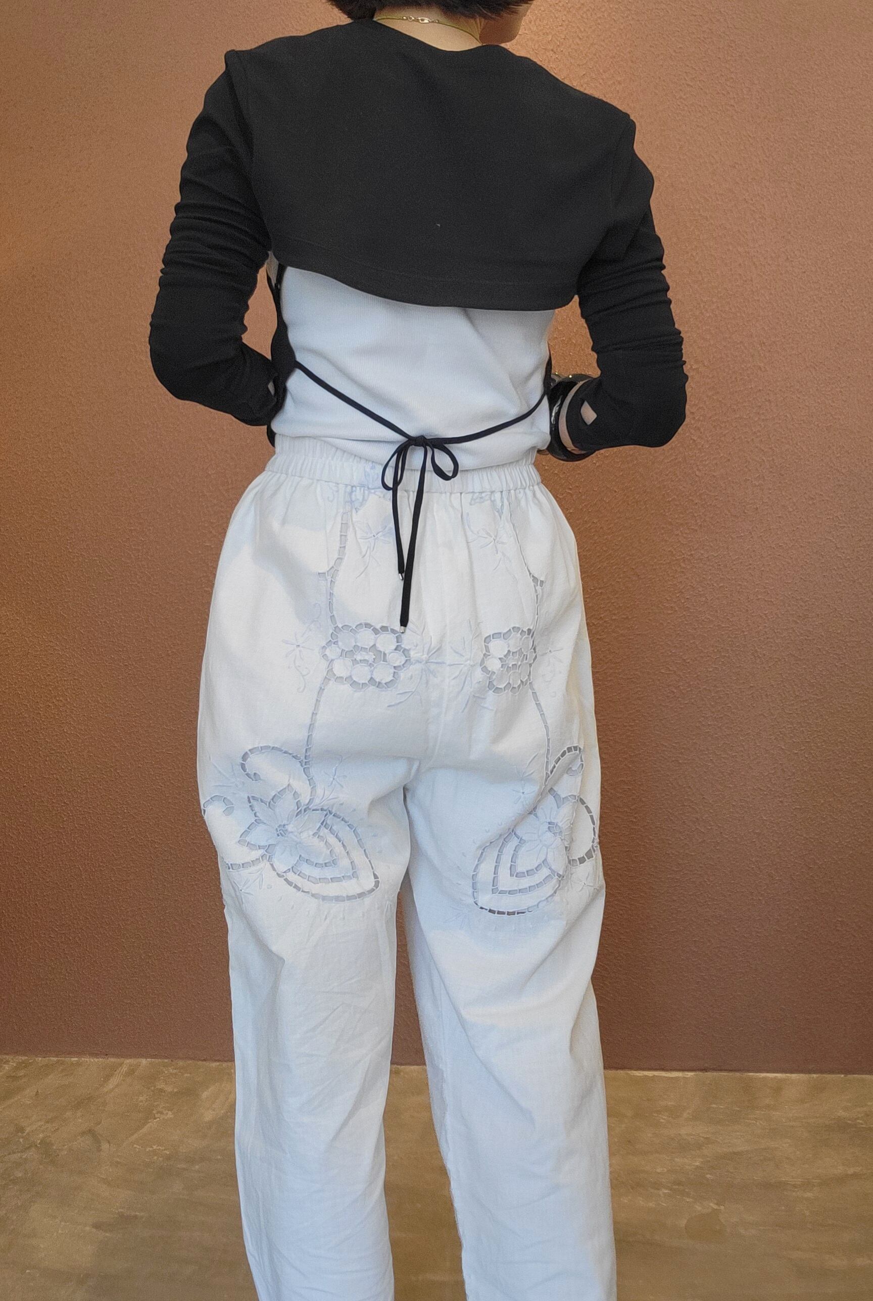 ヴィンテージのカットワークレースクロスを使用したリメイクイージーパンツ。素材表記はありませんがコットンのようです。ウエストゴム、左右にサイドポケット付き。裏地付きなので1枚で着用可能です。可愛くて着脱の楽なイージーパンツ、日常使いにぴったりです。