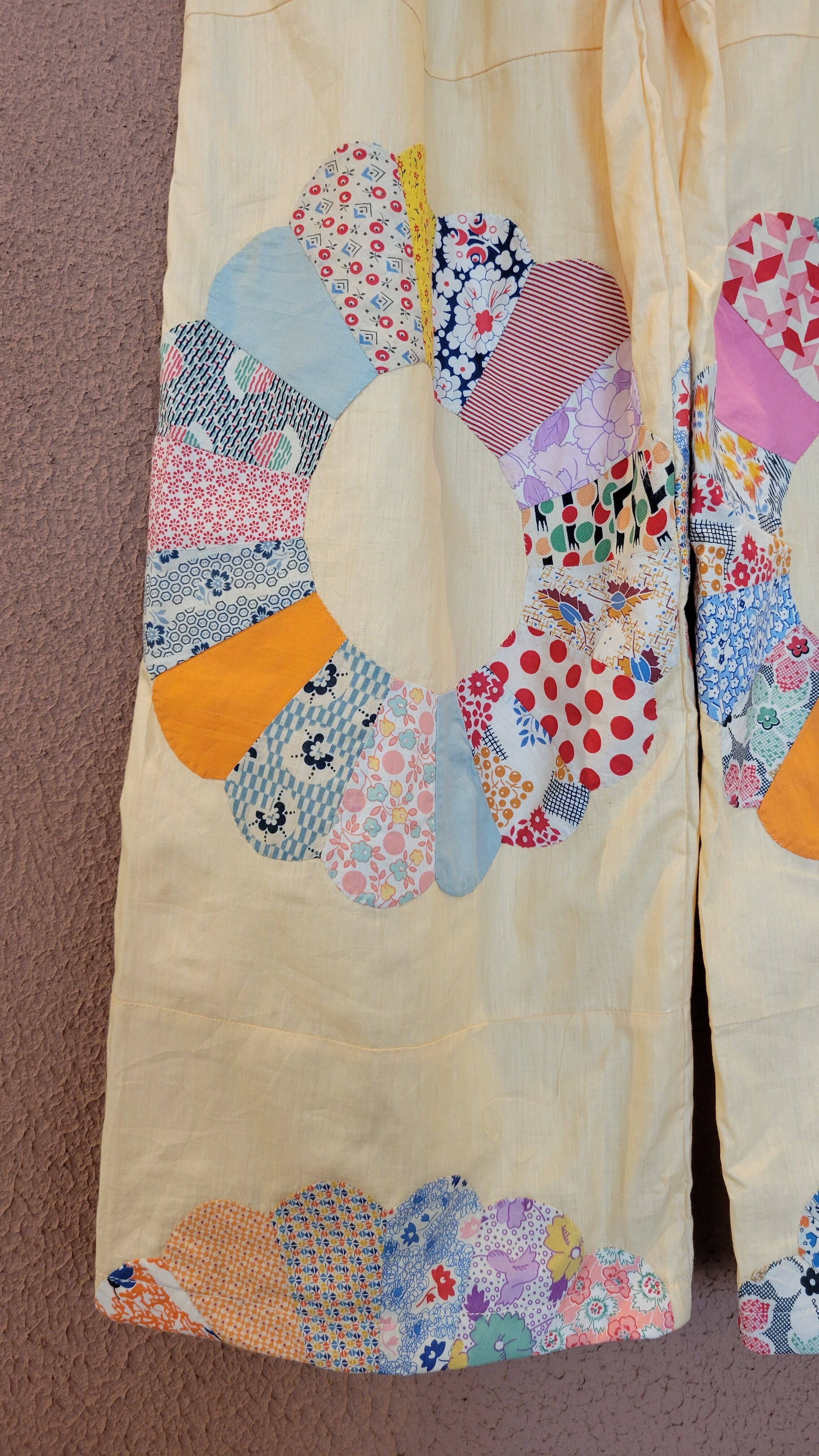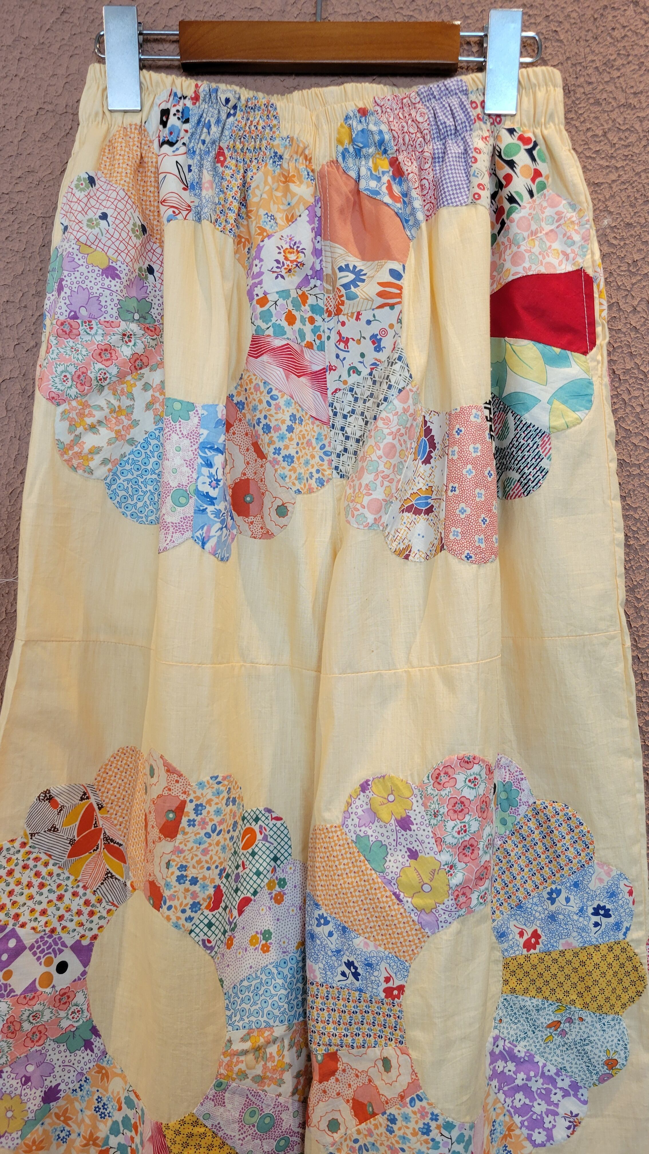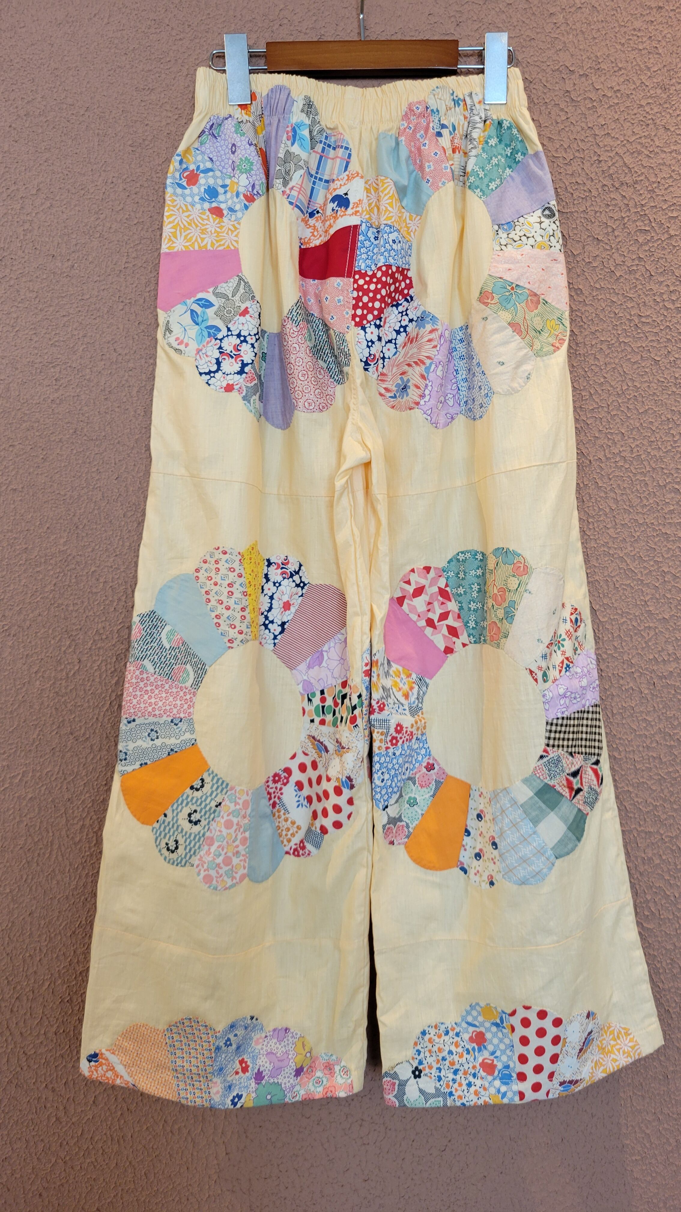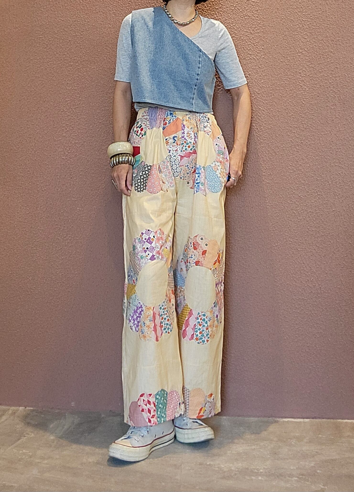 ヴィンテージのパッチワークキルト生地を使用したリメイクパンツ。素材はコットンです。薄手で軽量、涼しく穿ける素材感です。ウエストゴム、左右ポケット付き。