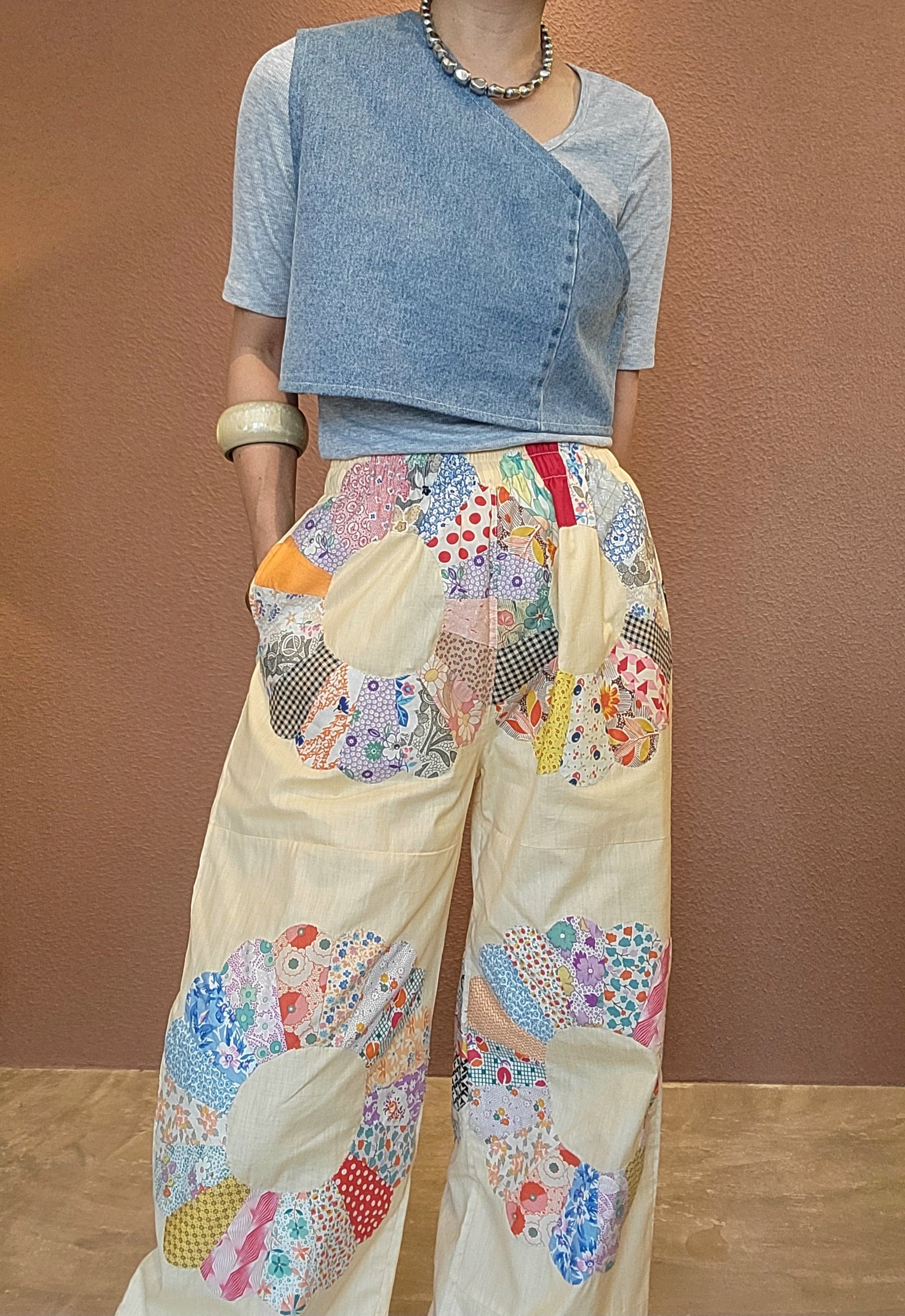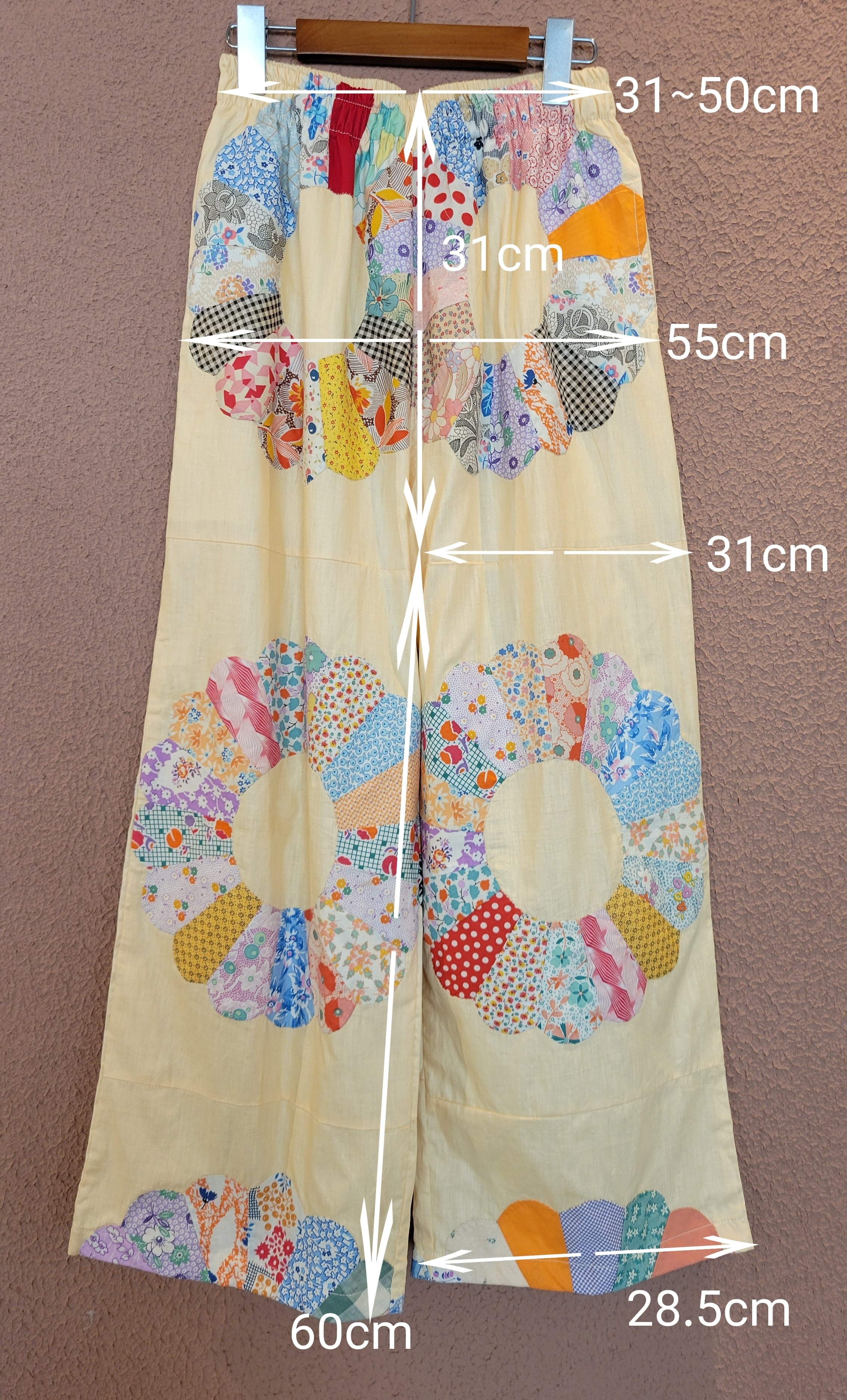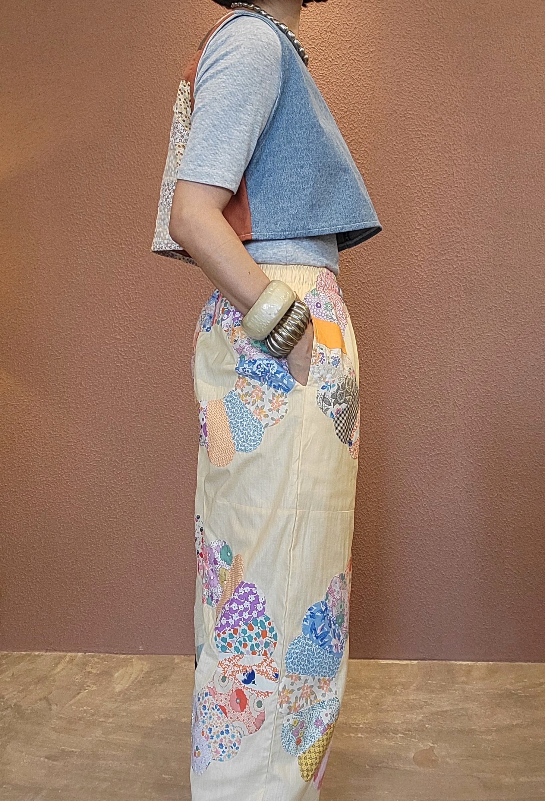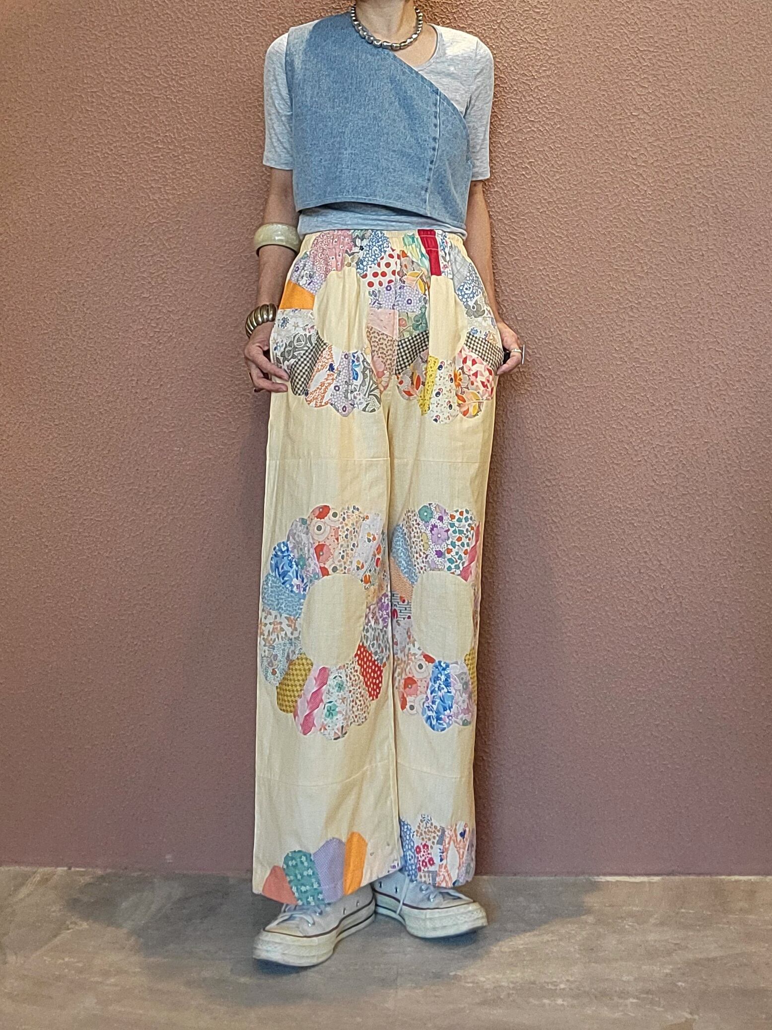 ヴィンテージのパッチワークキルト生地を使用したリメイクパンツ。素材はコットンです。薄手で軽量、涼しく穿ける素材感です。ウエストゴム、左右ポケット付き。