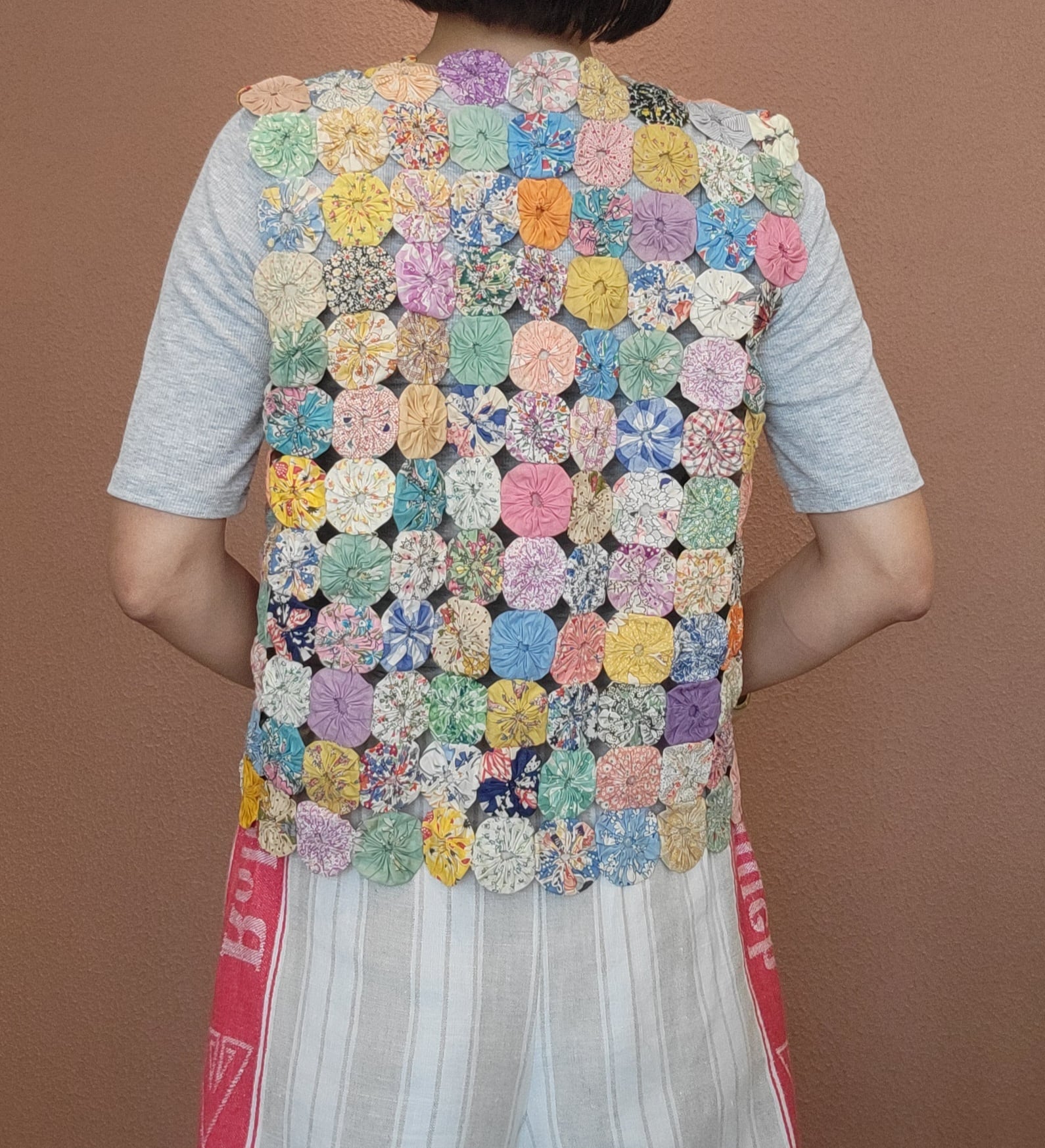 ヴィンテージのヨーヨーキルト生地を使用したリメイクトップス/ ベスト。素材はコットンです。ひとつひとつのパーツに使用されている布片も可愛く、ハンドキルトの緻密さを堪能できるアイテムです。