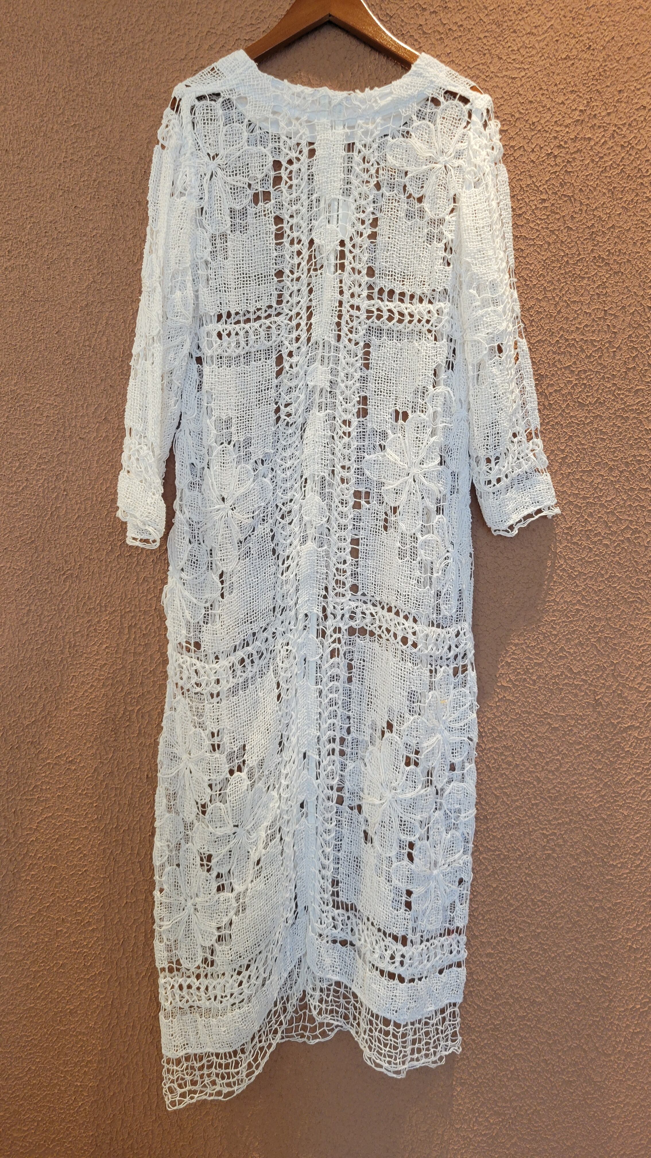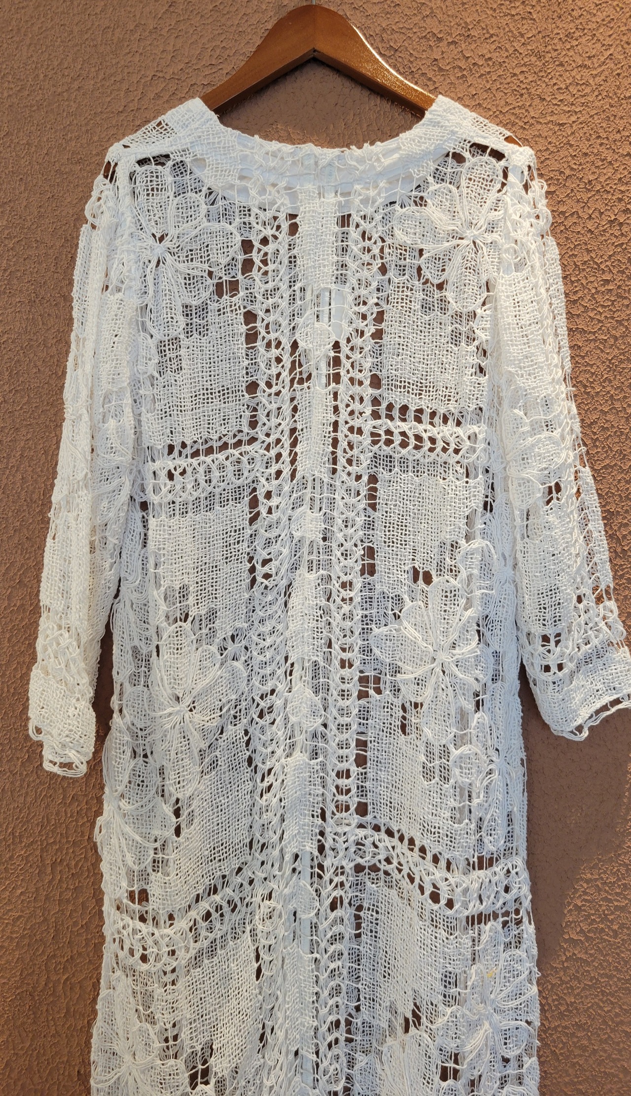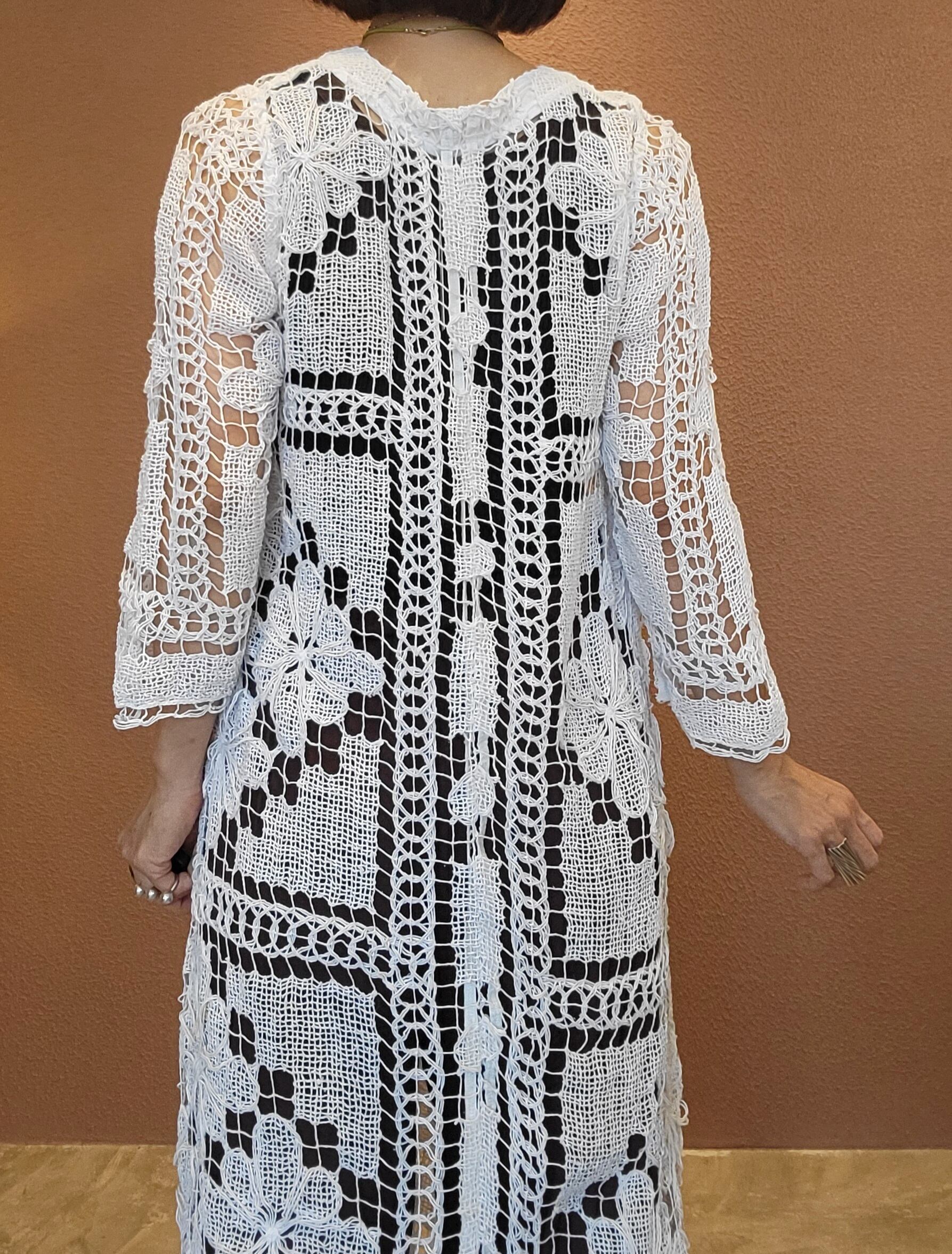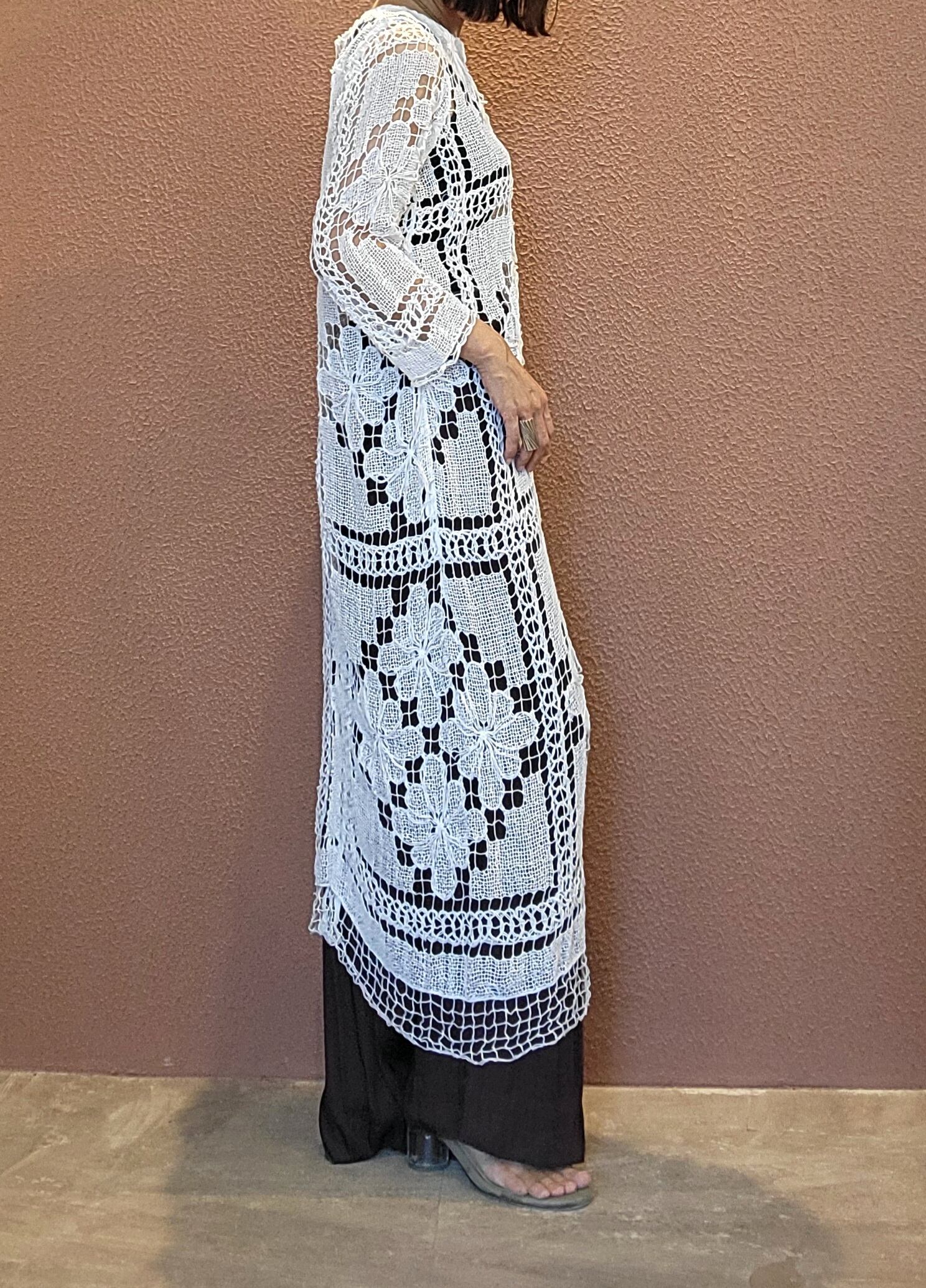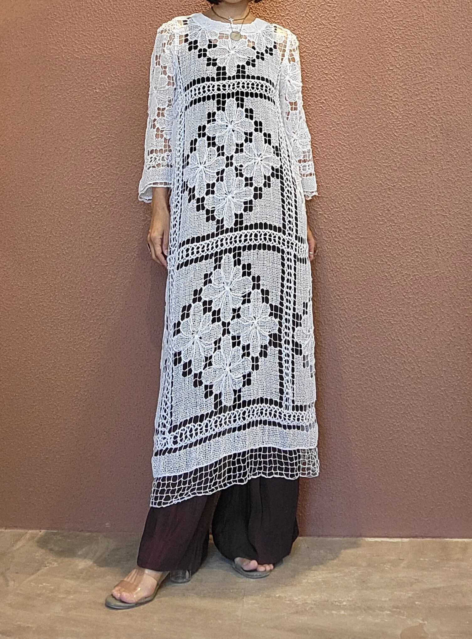 ヴィンテージレースを使用したリメイクワンピース。素材はコットンです。裏地は付いていません。肌の露出を適度に抑えつつ涼しく着られる綺麗めワンピース。春夏はキャミソールやタンクトップの上に、秋冬はタートルニットの上に着ても素敵です。レイヤードスタイルでお楽しみください。