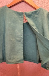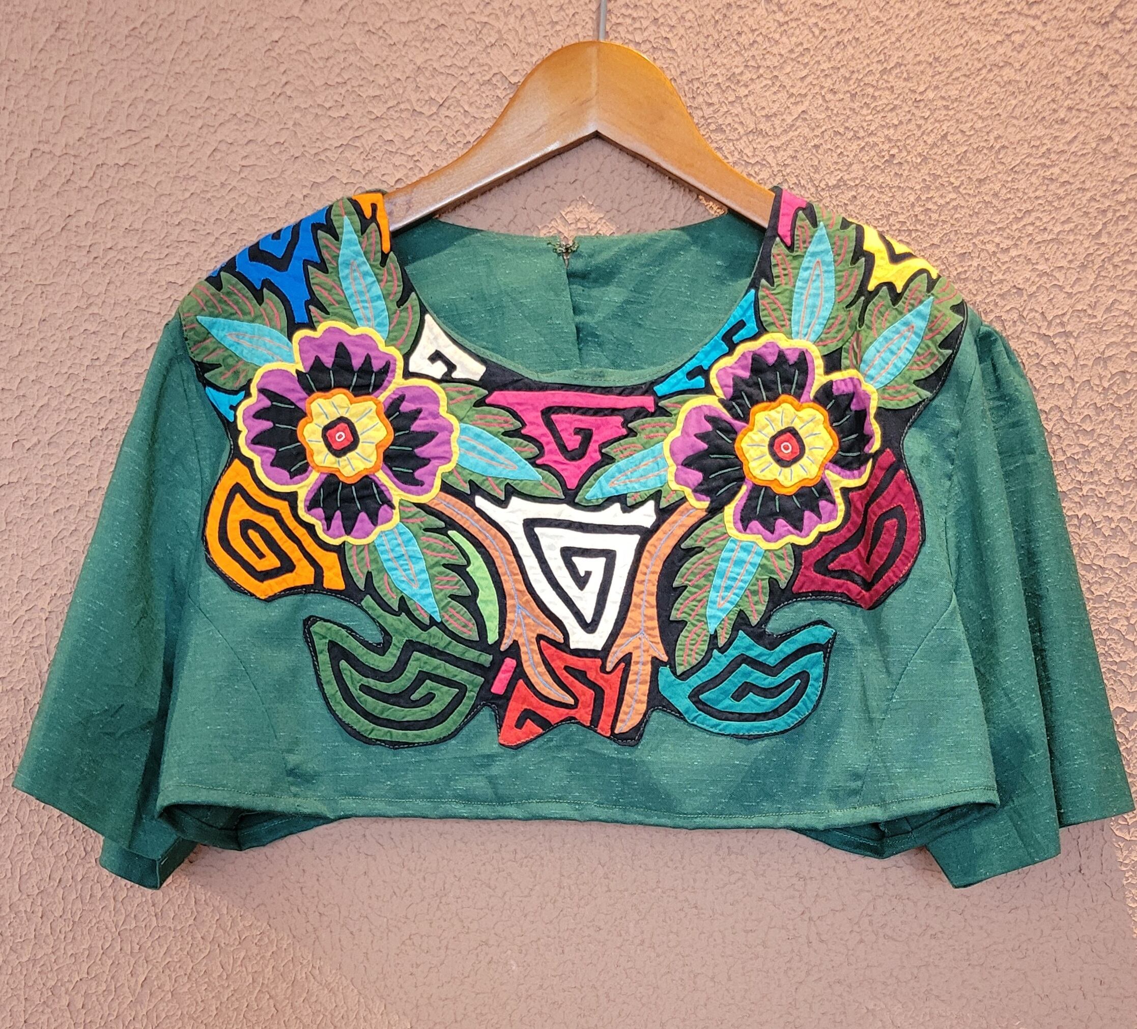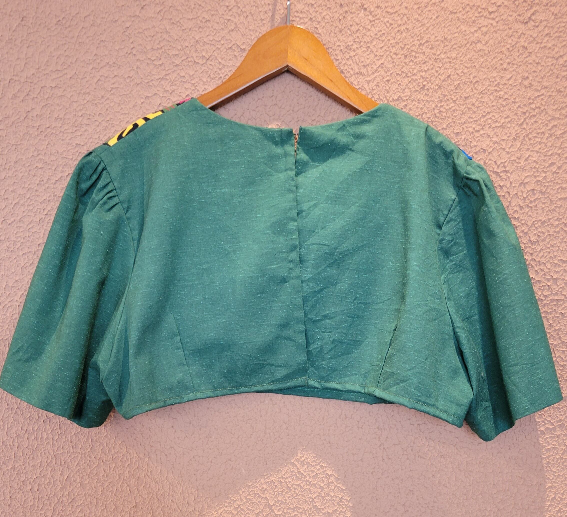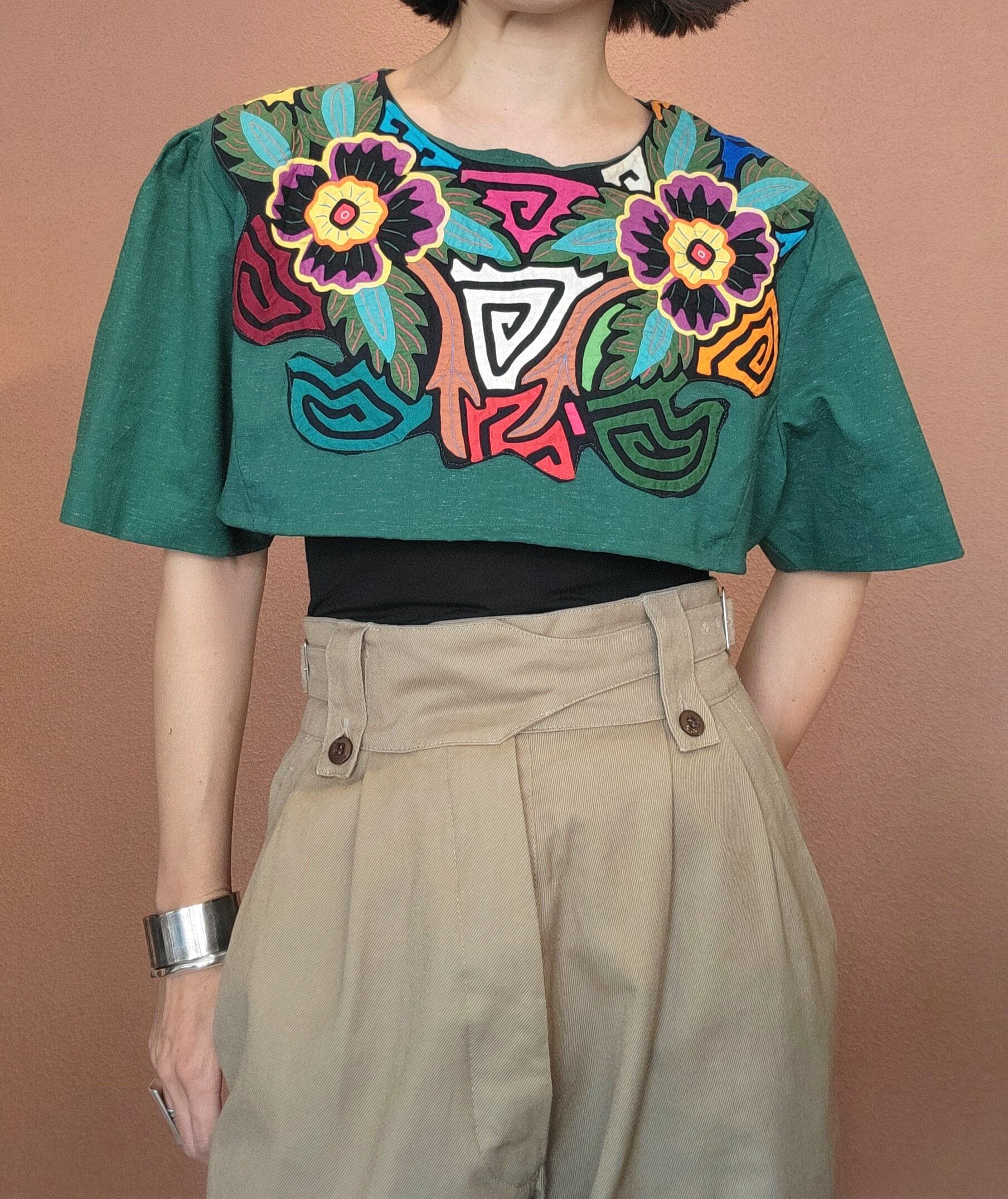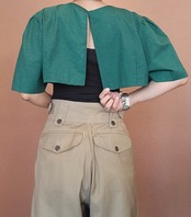 ヴィンテージのショートボレロ。素材表記はありませんがコットンとポリエステルの混紡のようです。軽量、薄手の素材です。胸元のカラフルなパッチワーク刺繍のお花が立体的で印象的。首後ろにホックが1つ付いており、ホックの下はオープン仕様になります。基本的には刺繍が前身ごろになりますが、前後どちらでも着用可能です。ハイウエストボトムに合わせてスタイルアップが叶います。