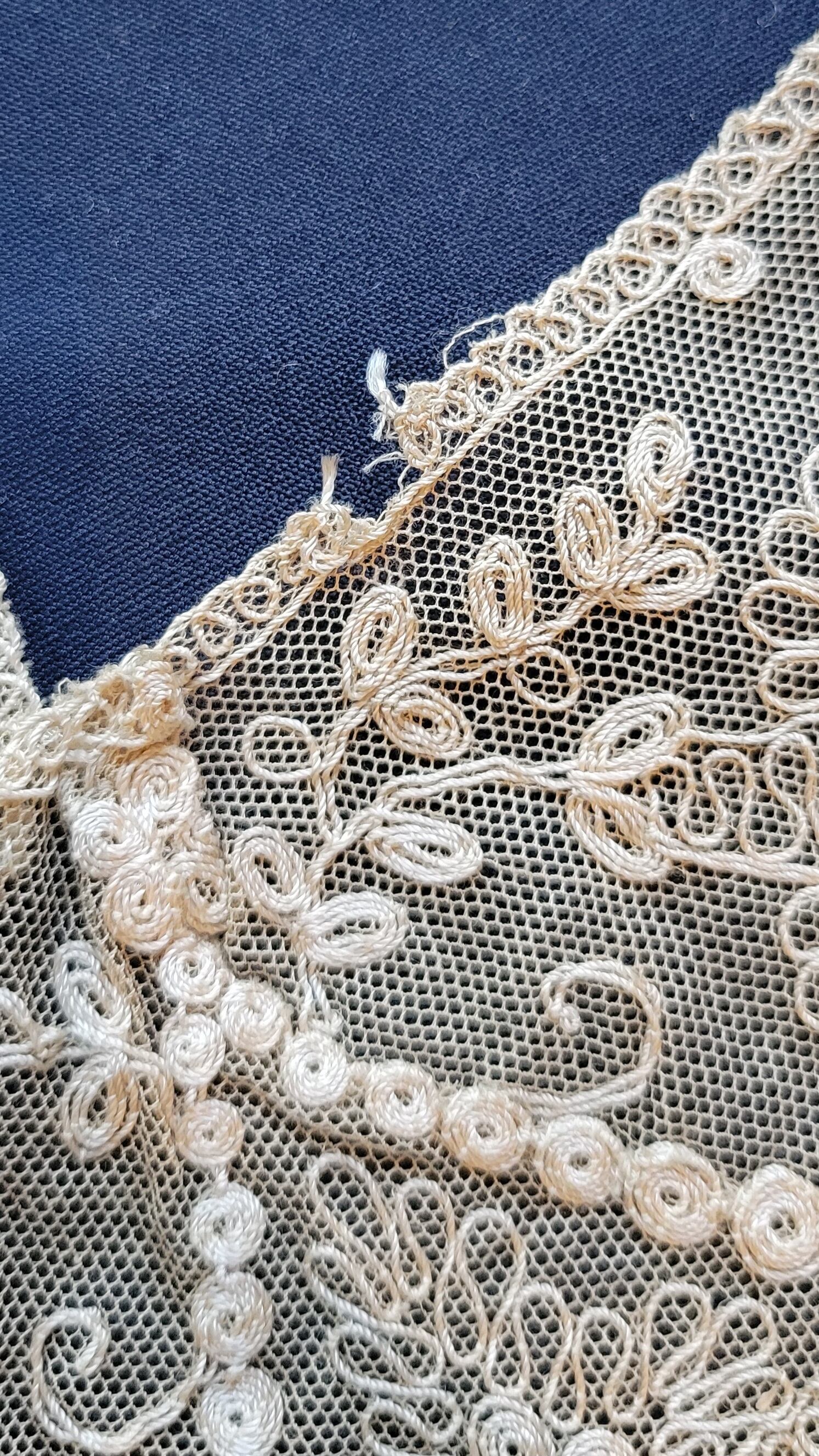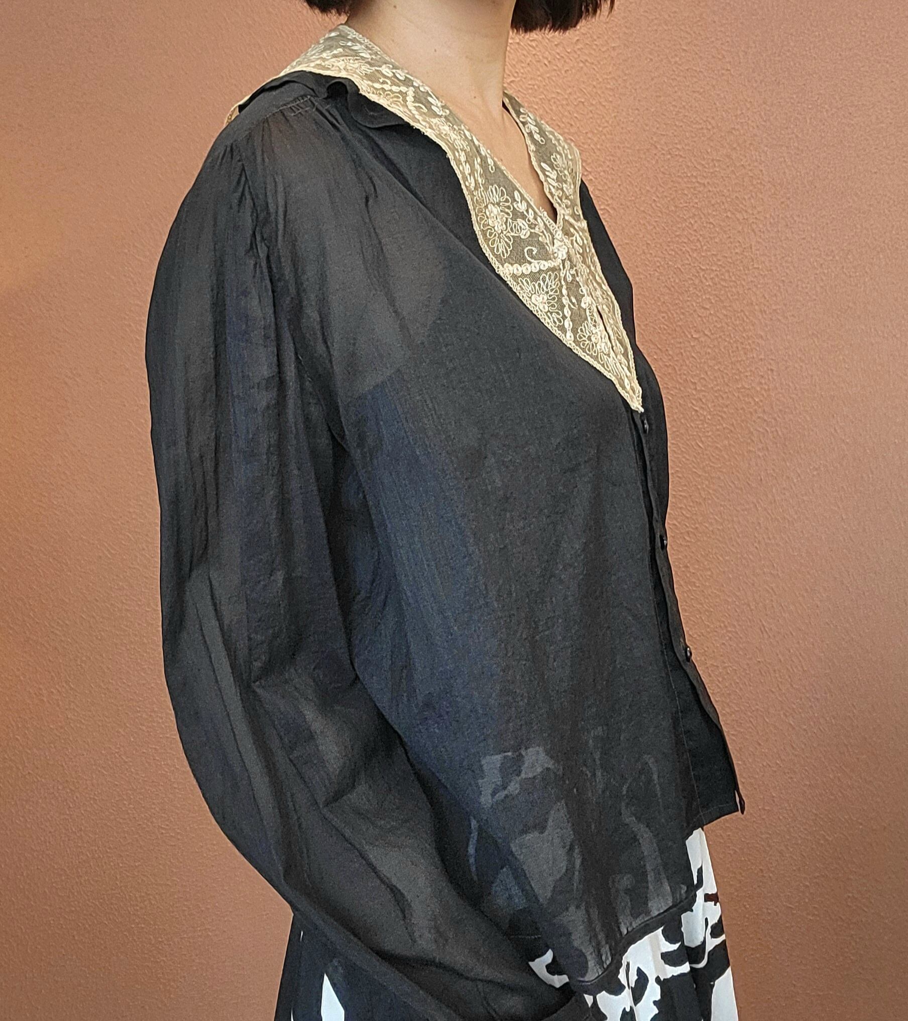 リメイクではなく、とても古いオリジナルのアンティークです。アンティークブラウスとの相性はもちろんのこと、古着のTシャツやシンプルなワンピースやカーディガンにプラスしても素敵です。*前左側にステッチが切れている箇所があります。画像でご確認ください。