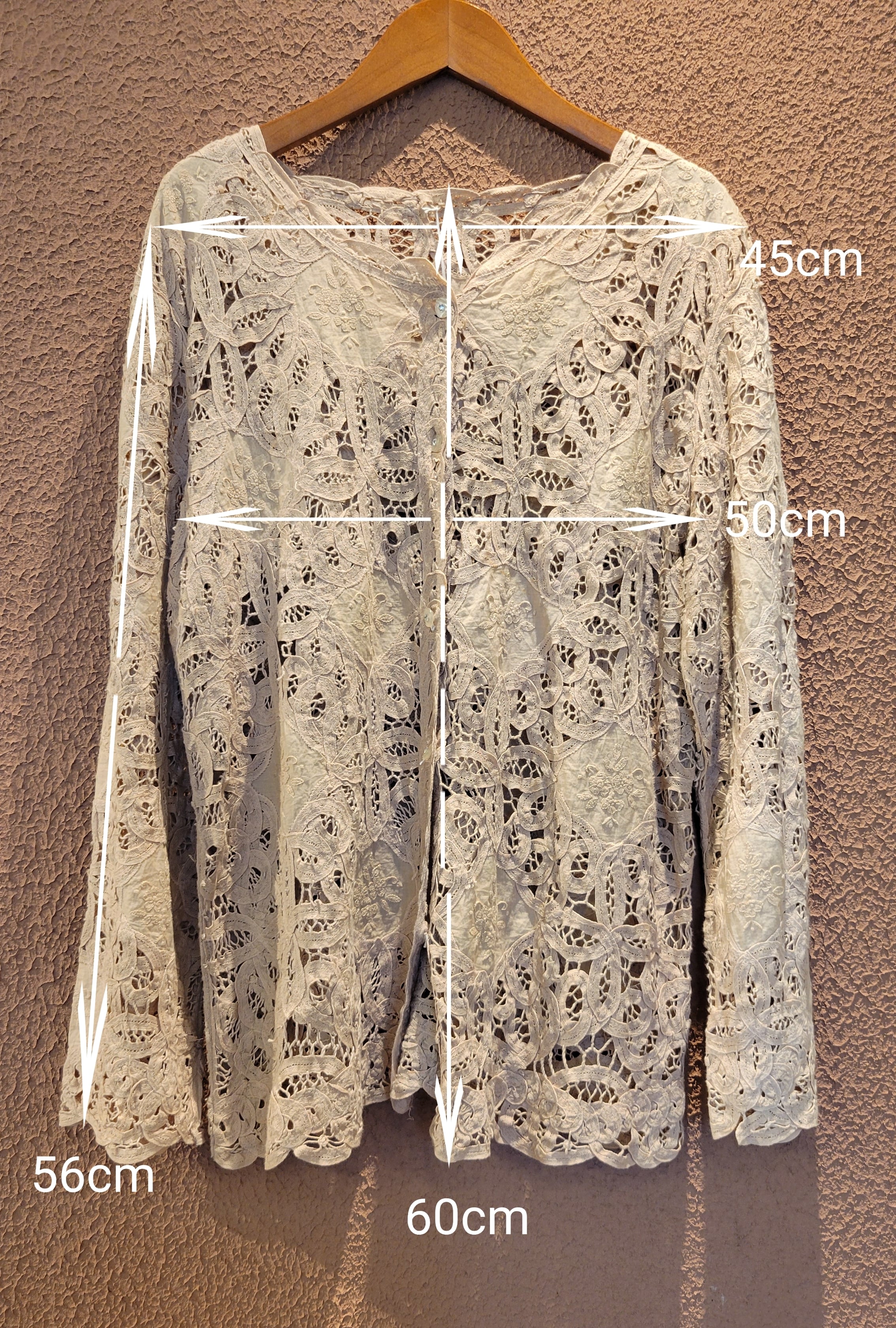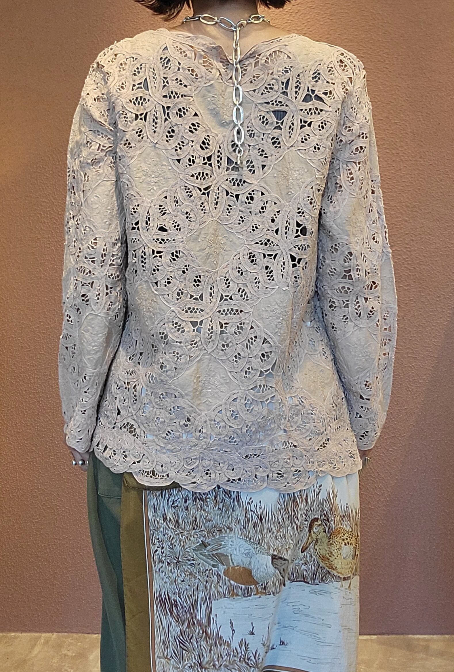ヴィンテージの総バテンレースブラウス。素材表記はありませんがコットンのようです。前ボタンを開けて羽織としても使えます。ラインストーン付きのヴィンテージボタンは全て揃っておりコンディションのとても良い1枚です。夏場は涼しく、秋冬には薄手のニットをインナーに合わせて通年で着られます。前後どちらでも着用できるのも嬉しいポイント。