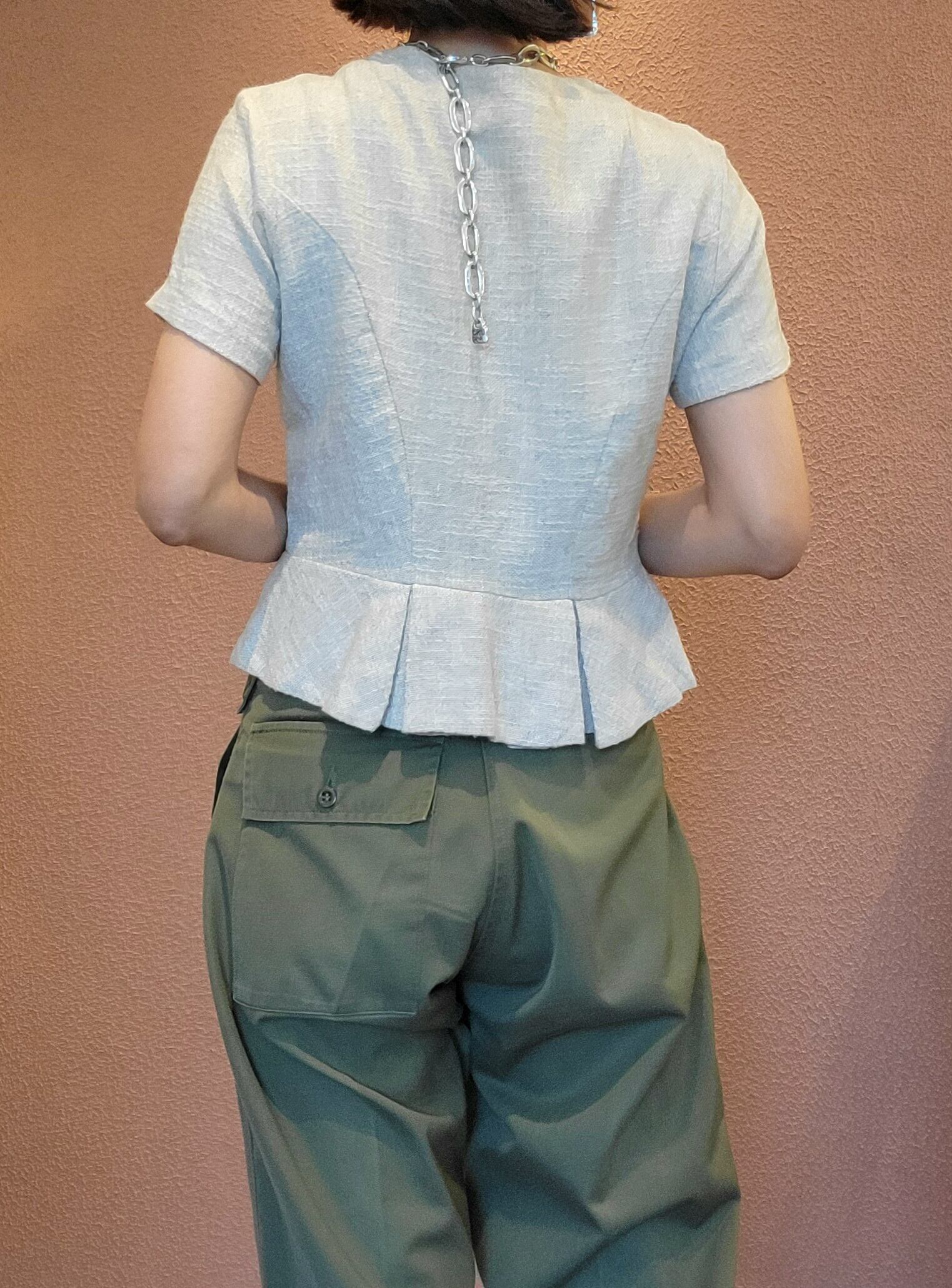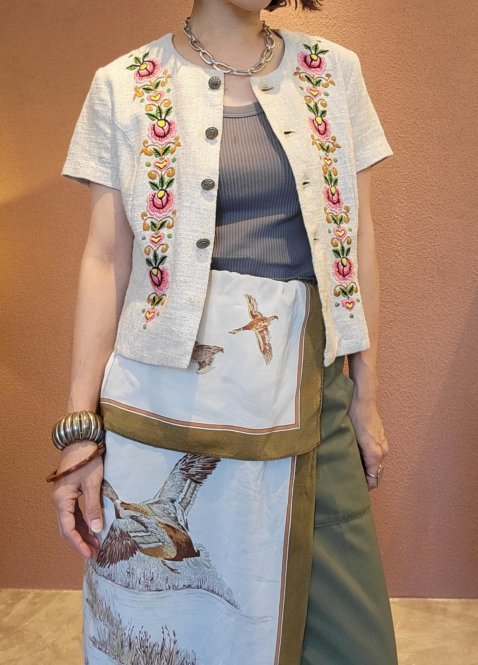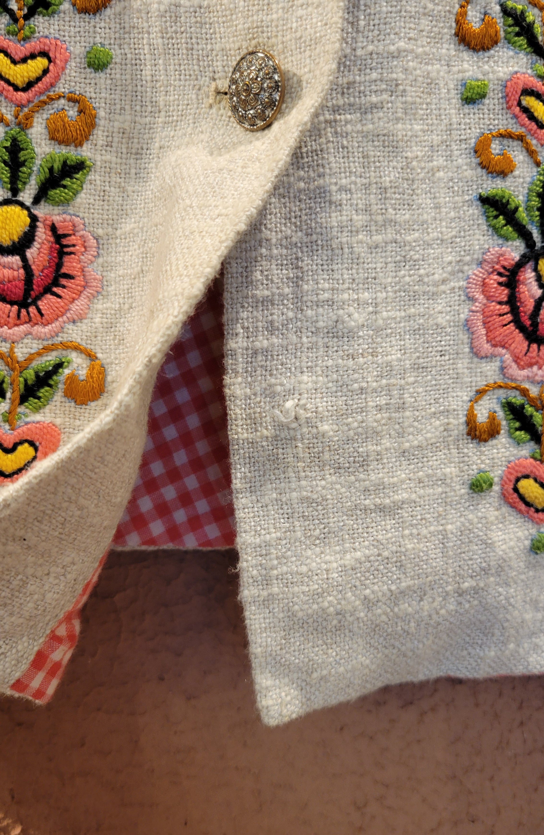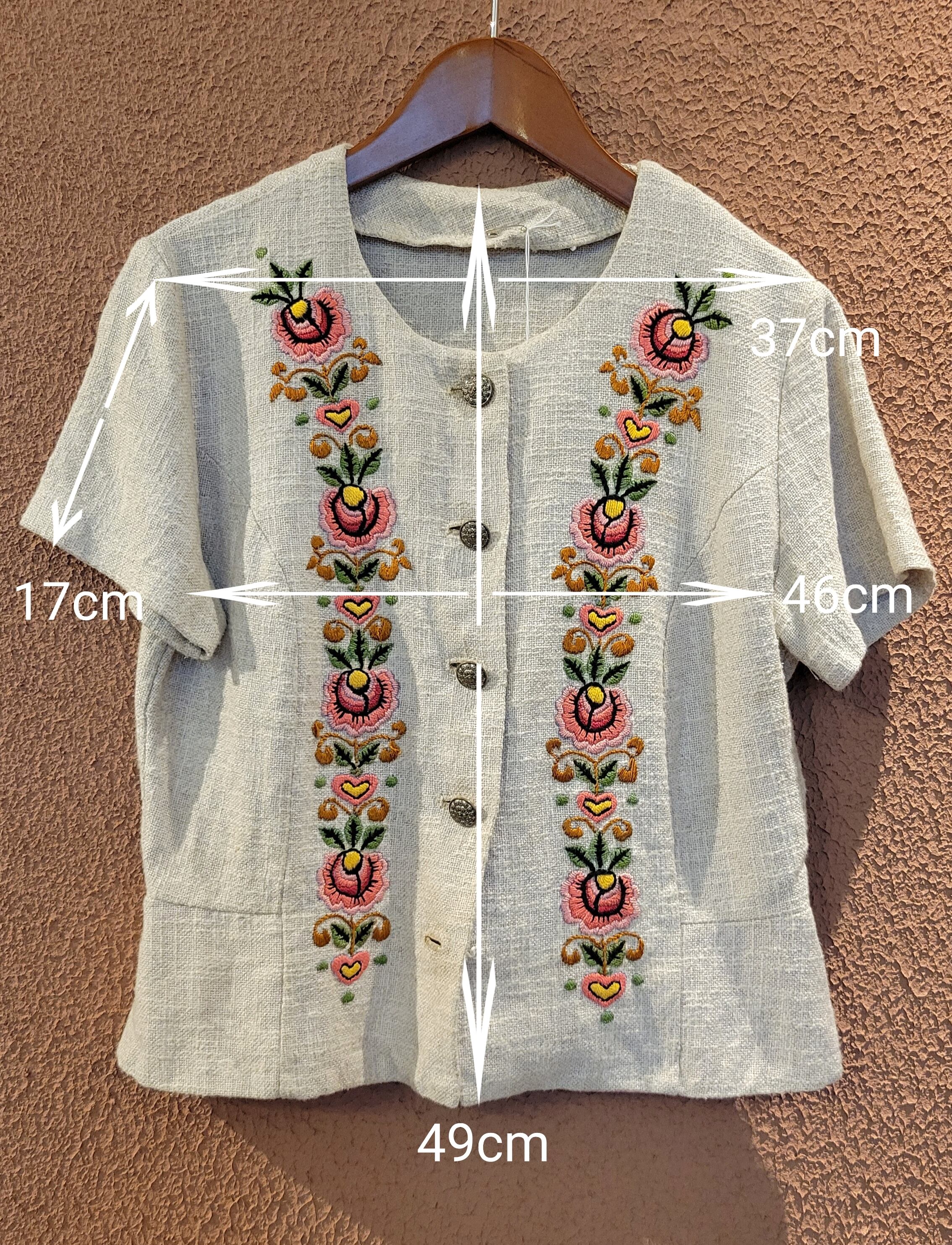 ヴィンテージの刺繍入り半袖チロルショートジャケット。素材表記はありませんがリネンのようです。くたっと馴染んだ柔らかい素材感です。きれいなシルエット、コンパクトサイズできれいめにもカジュアルにも幅広いスタイリングに使えます。*一番下のボタンが付いていません。*後ろ身ごろ左脇横あたりにシミがあります。画像でご確認ください。