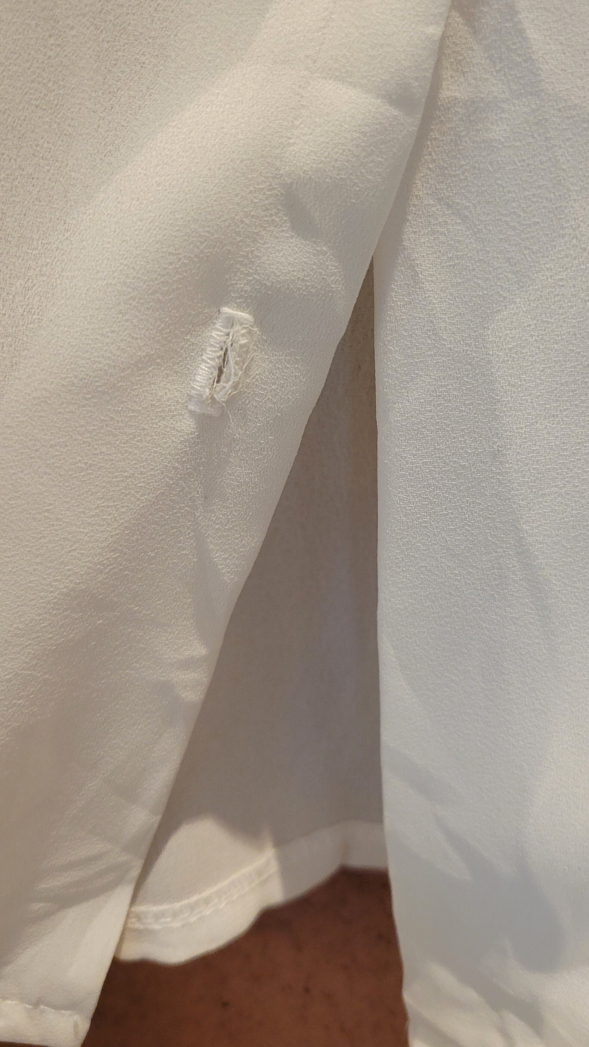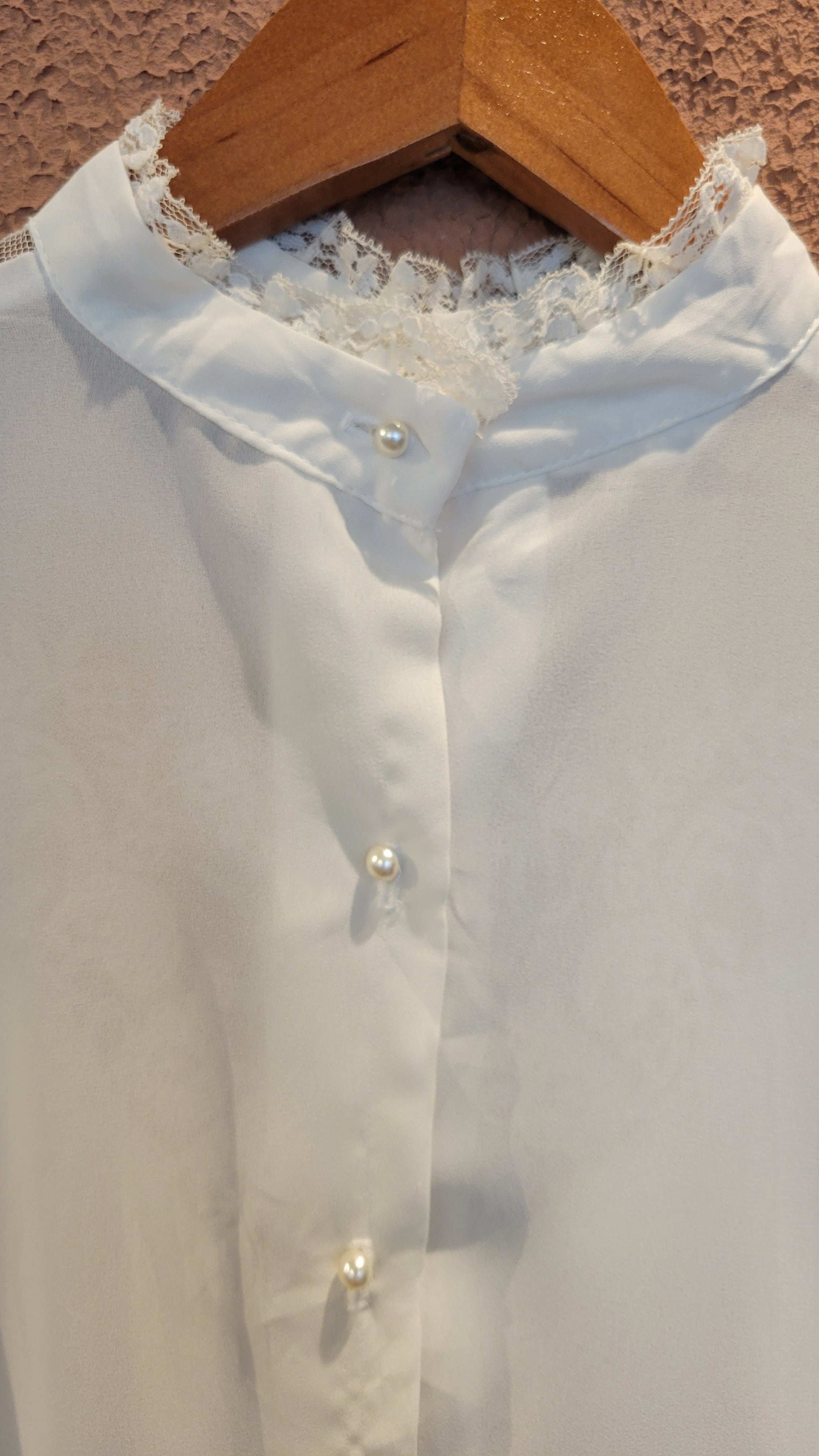 ヴィンテージのレースブラウス。素材表記はありませんがポリエステルのようで透け感があります。レースのハイネックが品良くクラシカルな雰囲気。バックボタンです。*1 番下のボタンがありません。画像でご確認ください。