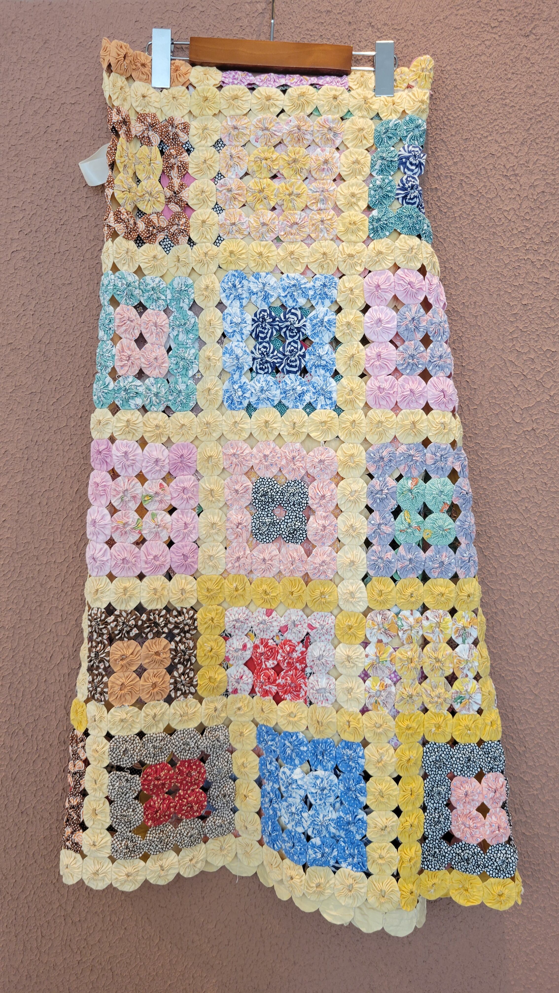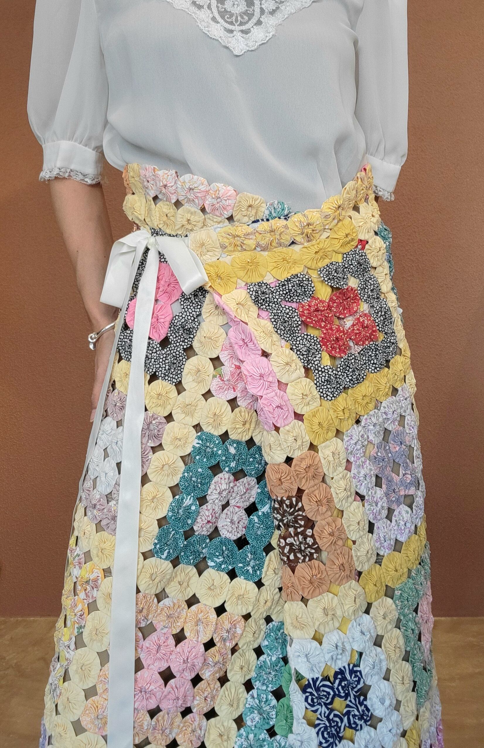 ヴィンテージのハンドステッチによるヨーヨーキルトをたっぷり贅沢に使用した巻きスカート。素材表記はありませんがコットンのようです。ウエストのリボンをほどくと袋状の筒のような形のスカートになります。穿いていただき、ウエスト右側の余る生地を左側に折るような感じで左右のリボンを結んで着用します。背中側がややハイウエストになります。仕様上、ヒップのサイズがが入ればどなたでも着用できます。たくさんの小さなヨーヨーキルトがスクエアモチーフを織り成すスペシャルな1枚になっています。