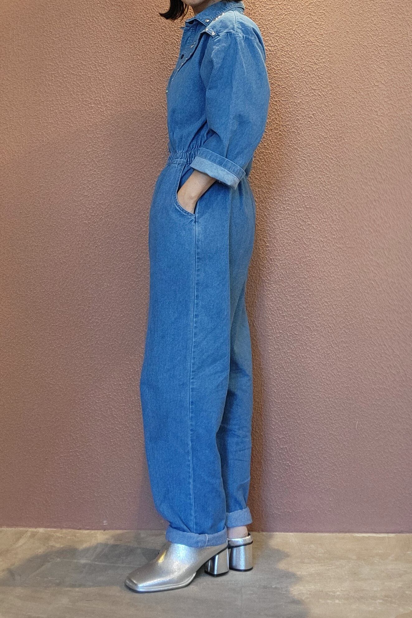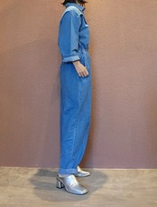 やや薄手のデニム生地で動きやすく、ドルマンスリーブのためアームホールもゆったりです。とても楽な着心地で1枚でかっこよく仕上がります。ハイウエスト、腰回りゆったり、裾テーパードでスタイルアップが叶うシルエットとなっています。