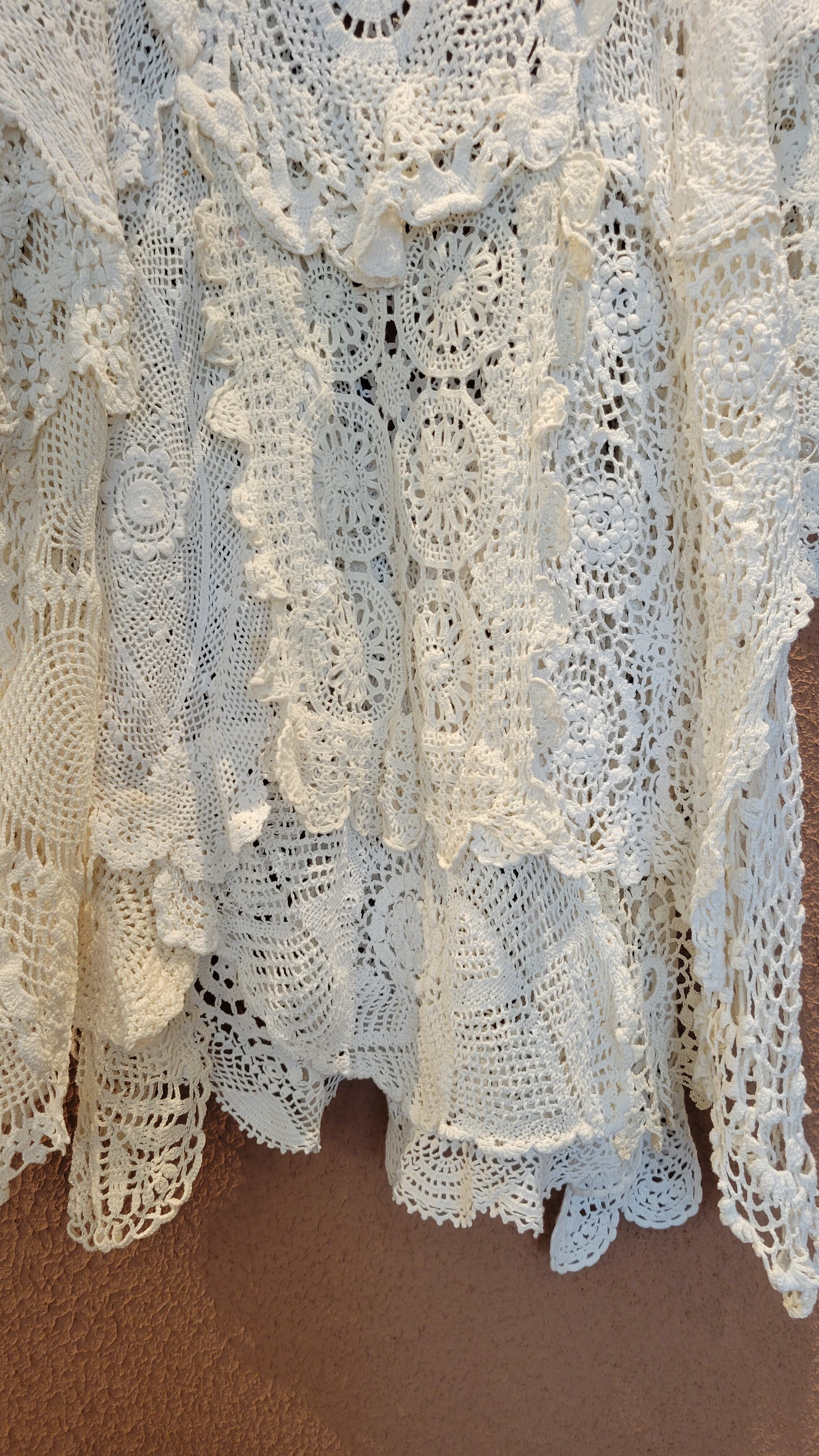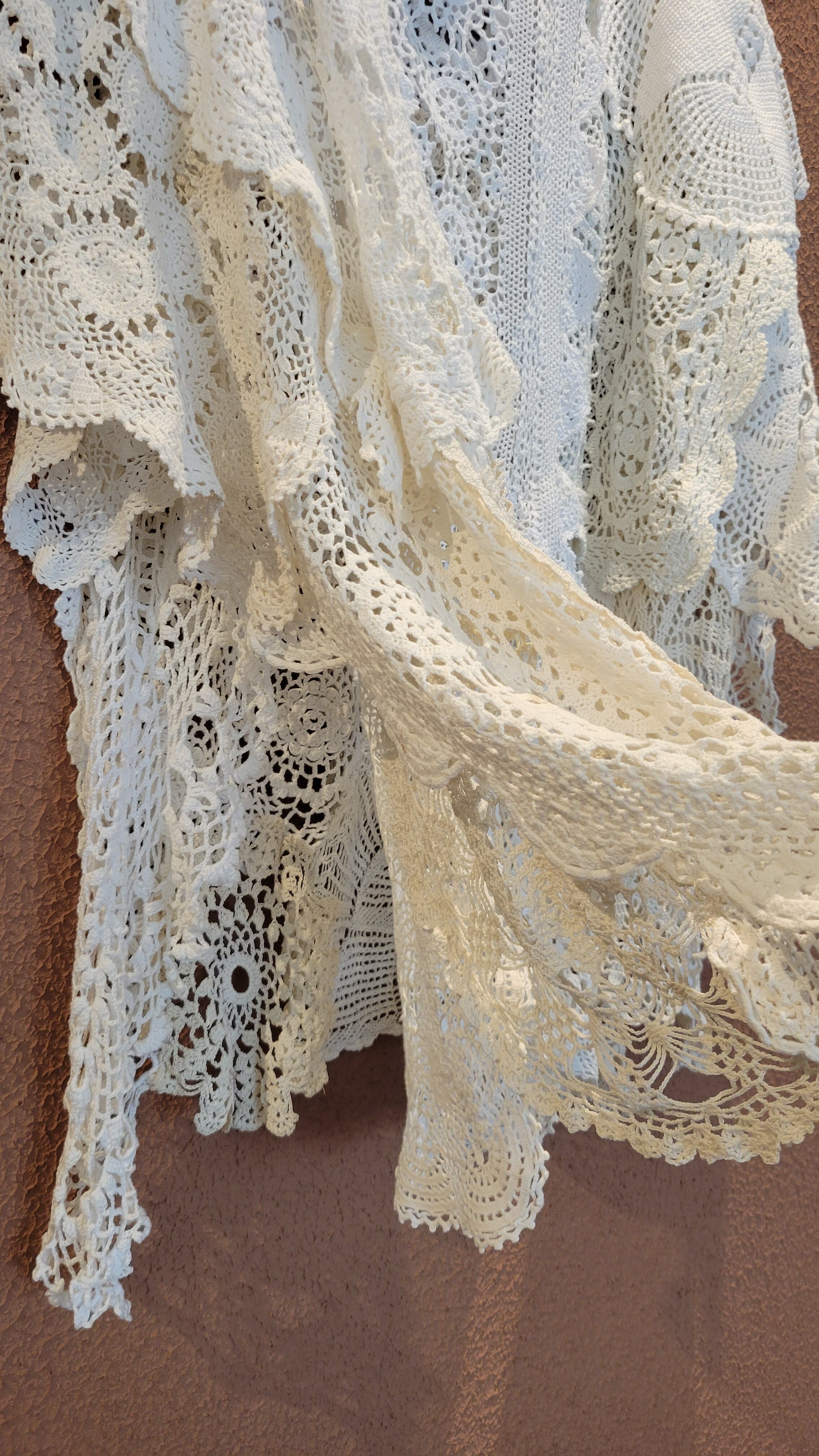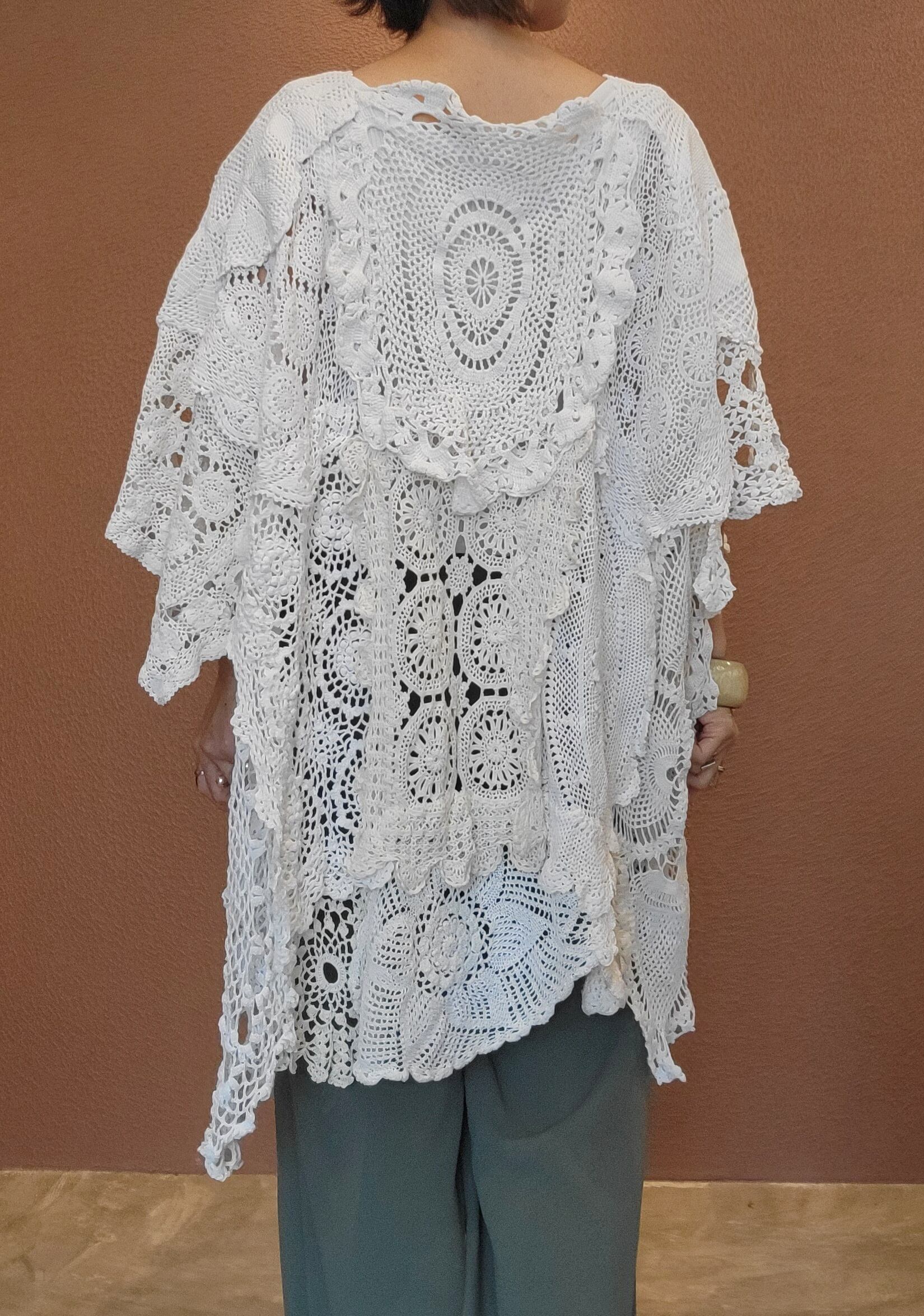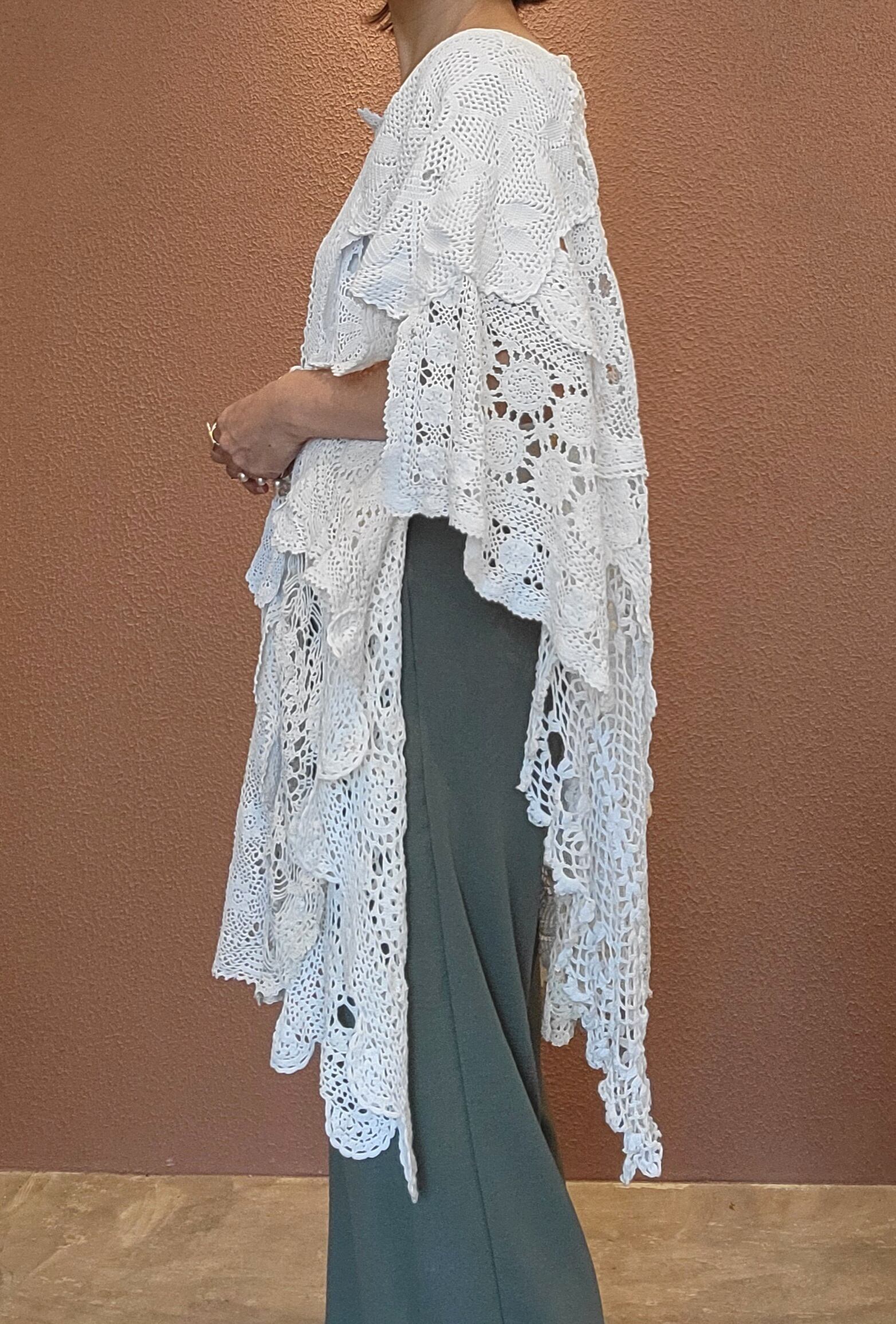 ヴィンテージのクロシェを何枚も繋げたリメイクワンピース。素材表記はありませんがコットンのようです。サイドオープンのポンチョタイプでサイズフリーです。ホワイト単色ながらもクロシェの編み柄がとても華やか。デニムに合わせてカジュアルに、ワンピースに合わせて華やかに、幅広くスタイリングできます。