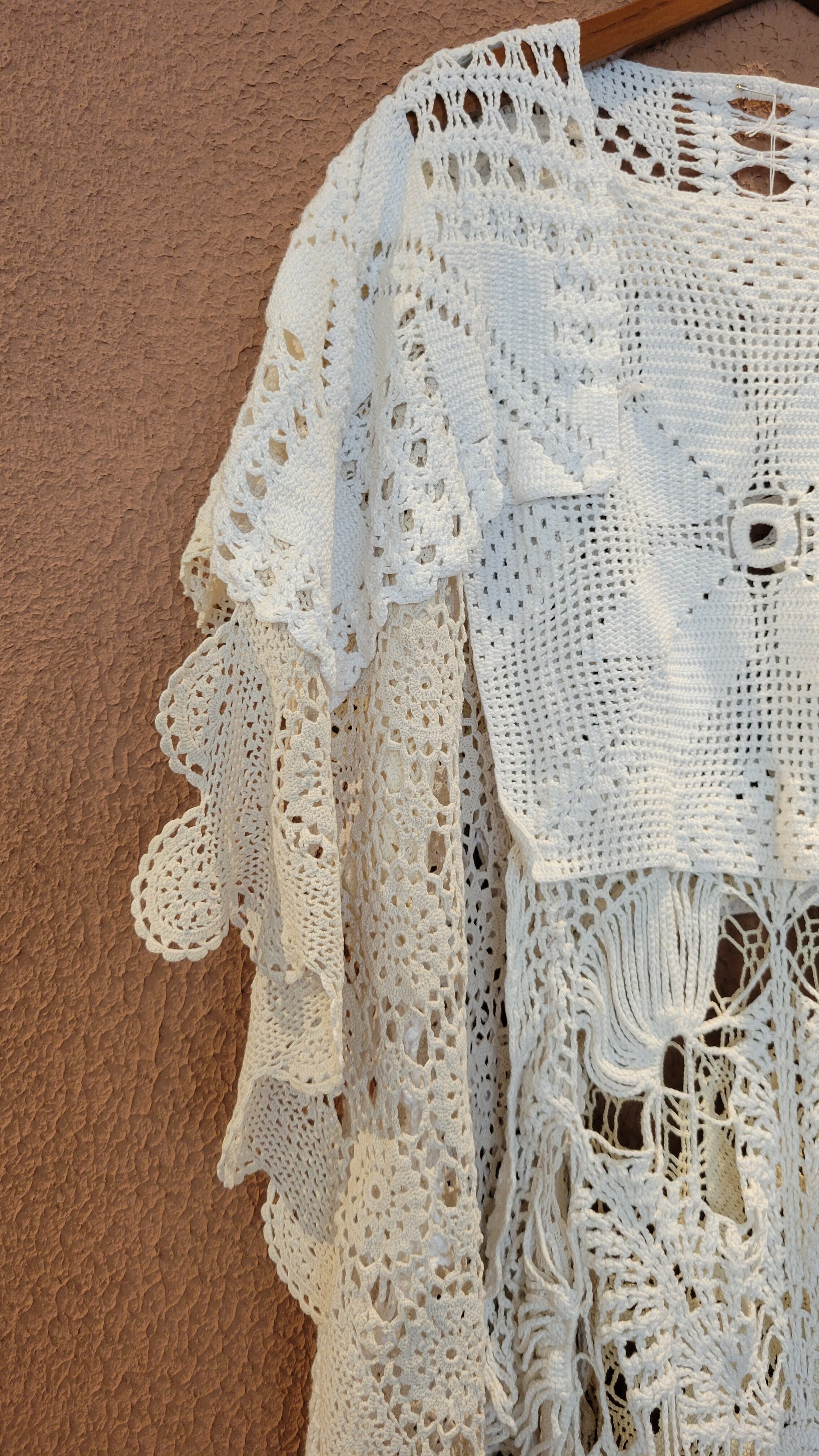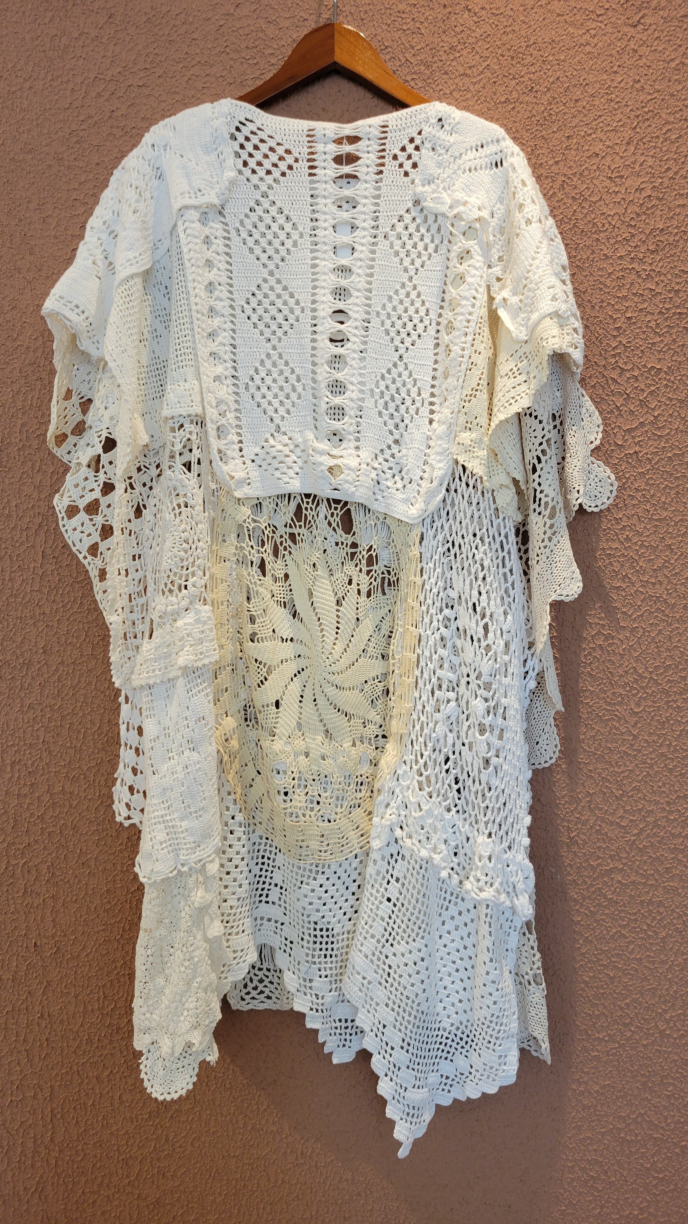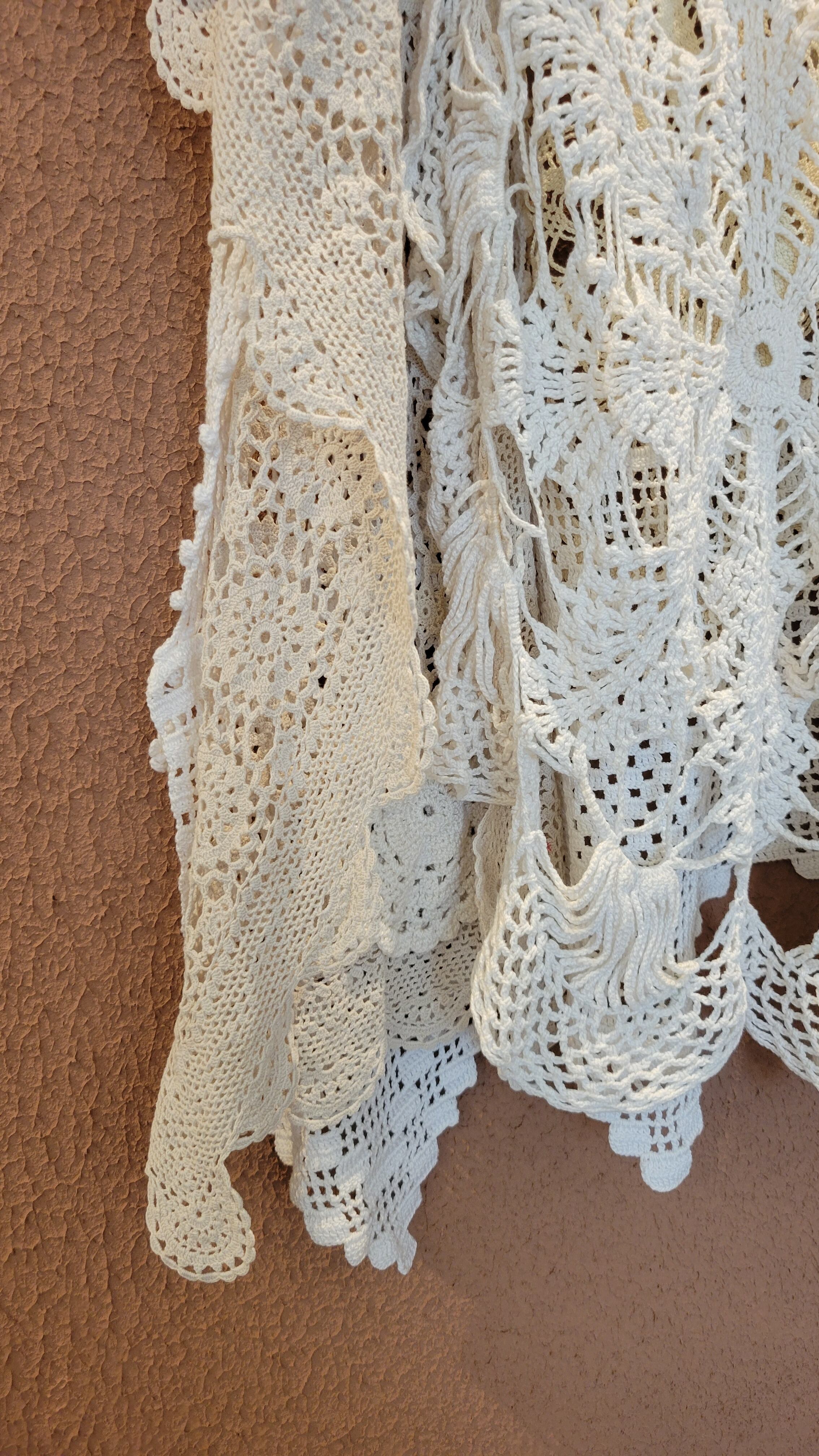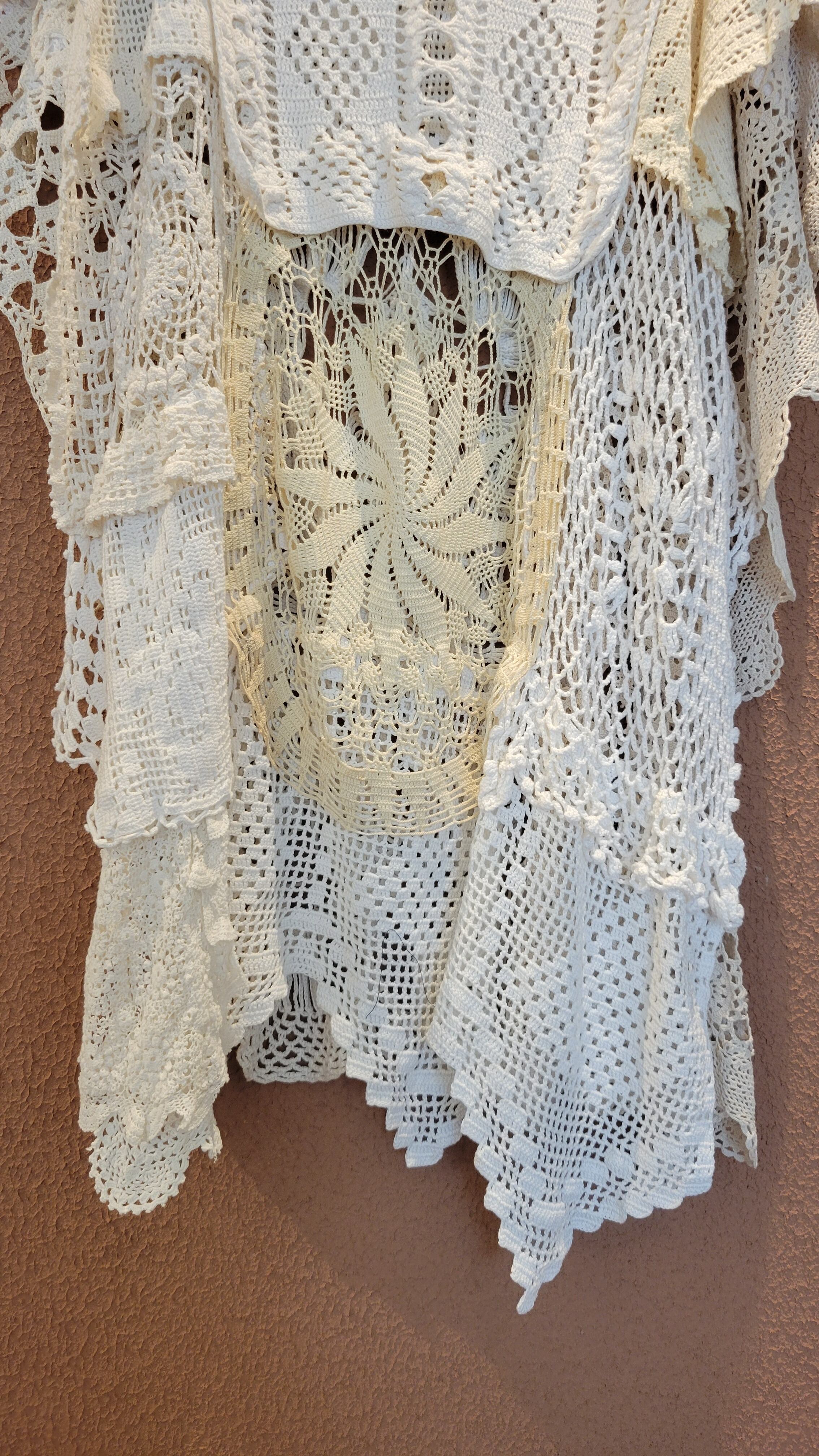 ヴィンテージのクロシェを何枚も繋げたリメイクワンピース。素材表記はありませんがコットンのようです。サイドオープンのポンチョタイプでサイズフリーです。ホワイト単色ながらもクロシェの編み柄がとても華やか。デニムに合わせてカジュアルに、ワンピースに合わせて華やかに、幅広くスタイリングできます。